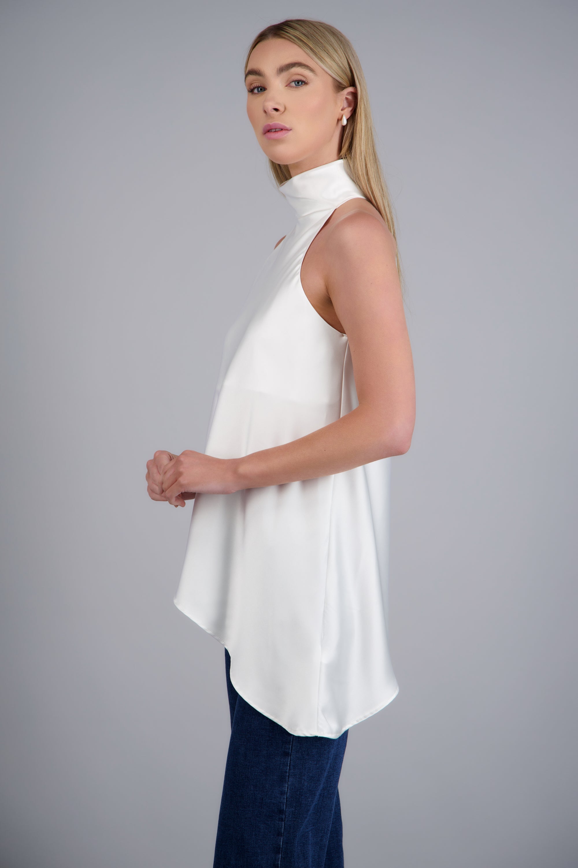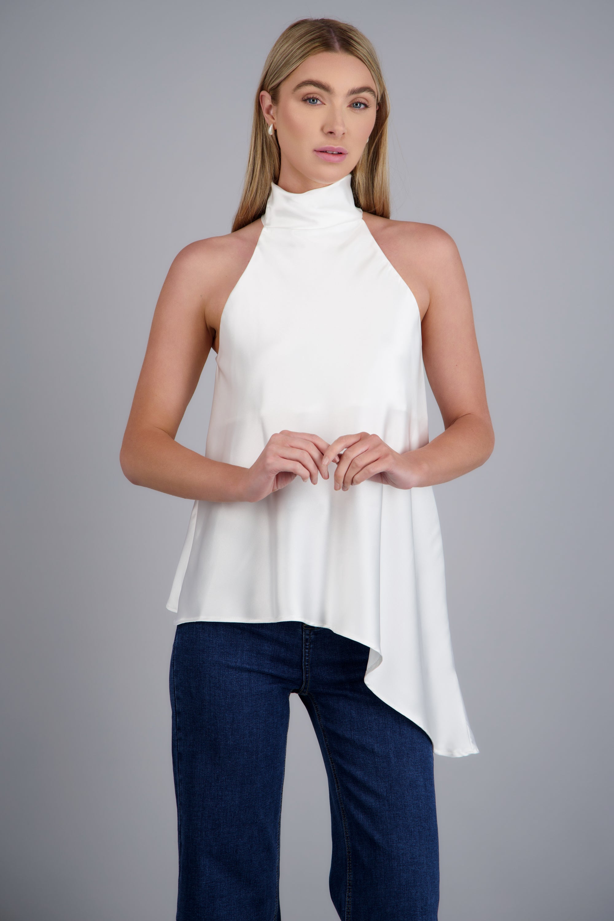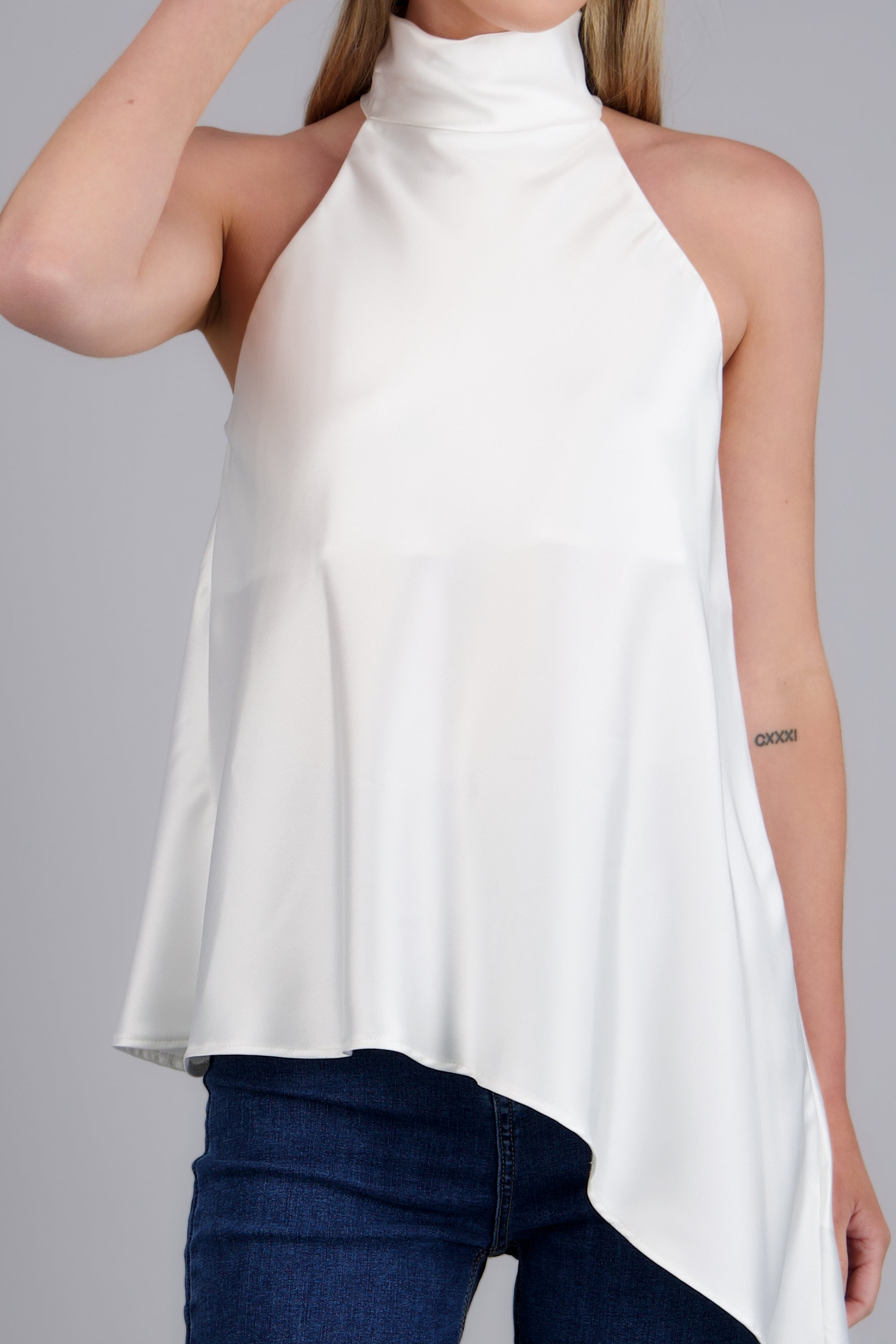 Blusa de satín con cuello alto y caída asimétrica. Corte fluido y cierre de botones en la parte posterior.