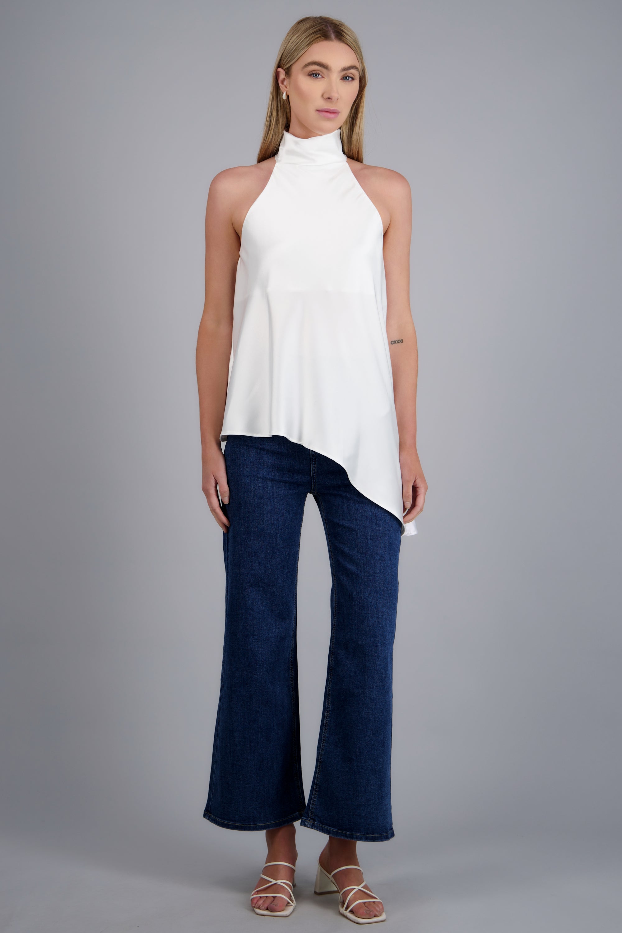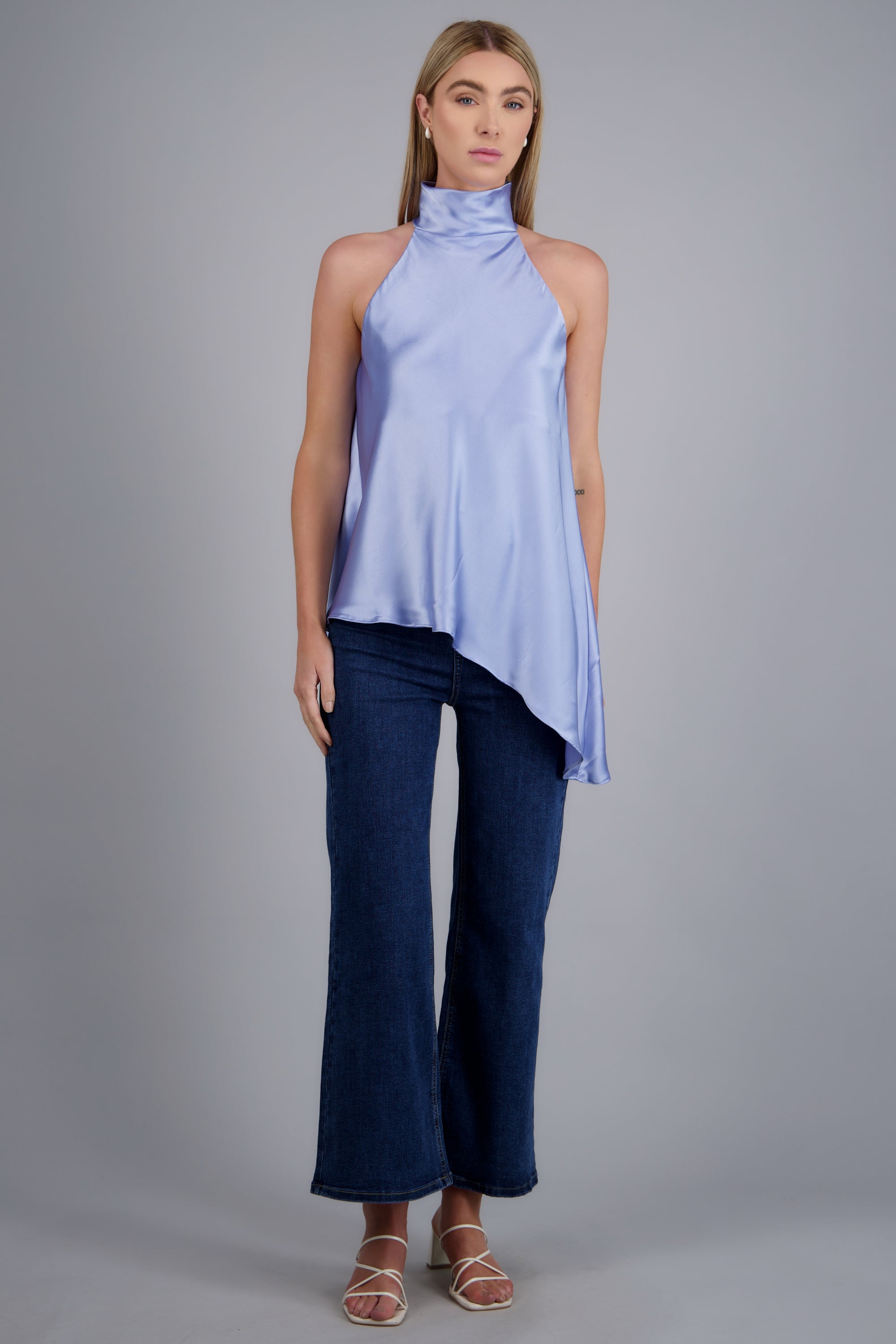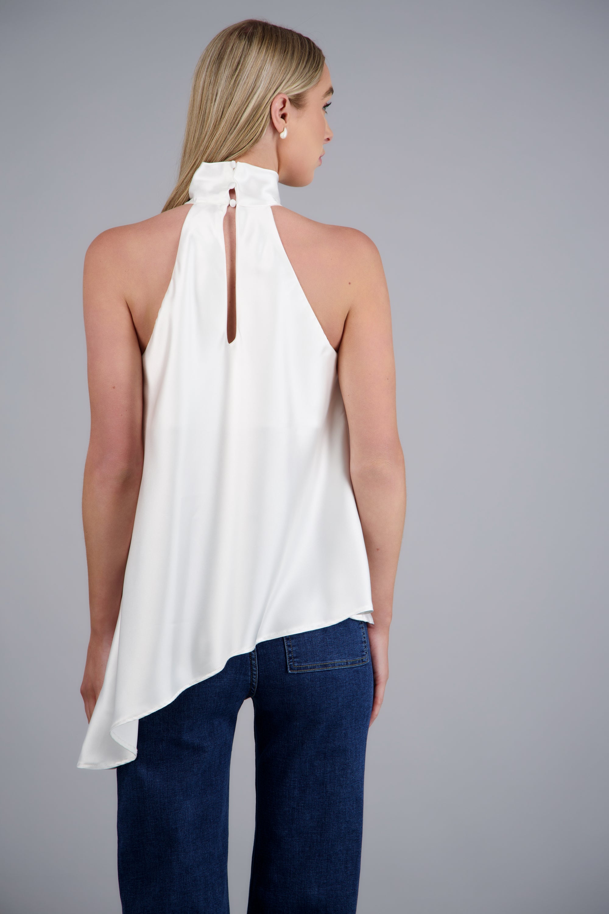 Blusa de satín con cuello alto y caída asimétrica. Corte fluido y cierre de botones en la parte posterior.