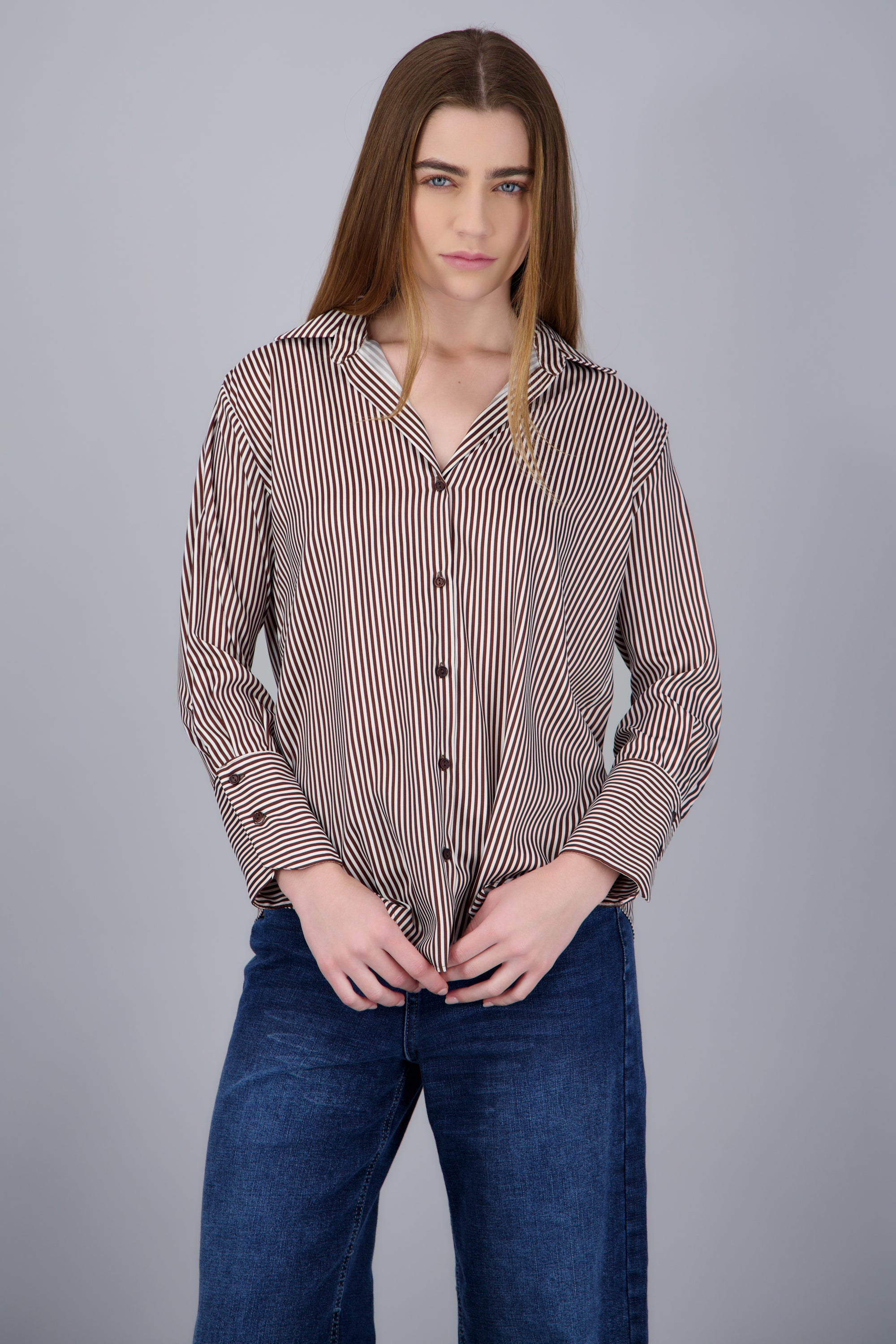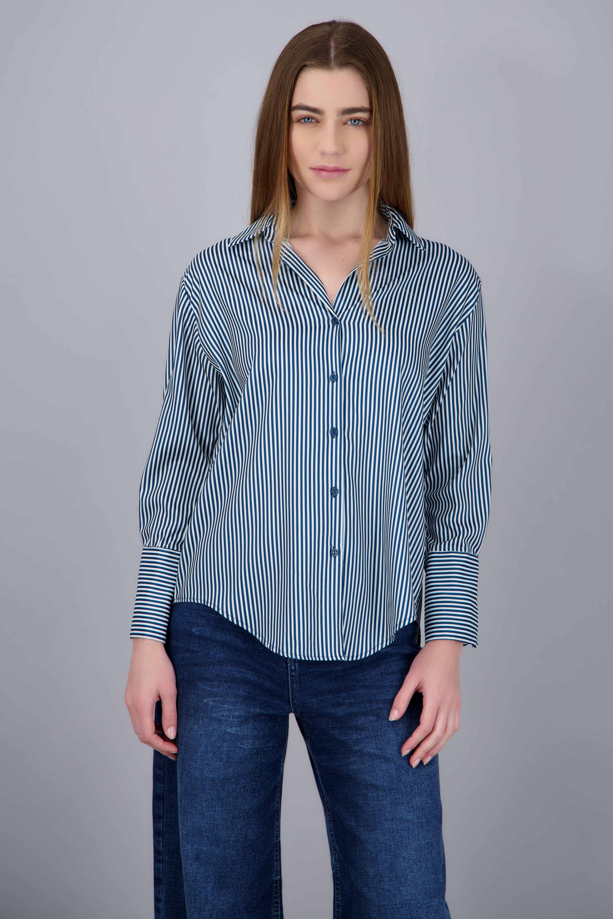 Elevate your style with our oversized satin striped shirt, perfect for adding a unique touch to your wardrobe. This shirt combines comfort with elegance, ideal for any casual or semi-formal occasion. Crafted from a satin fabric that offers a soft feel and striped details that add a contemporary style. Pair it with skinny jeans or dress pants for a versatile and modern look.