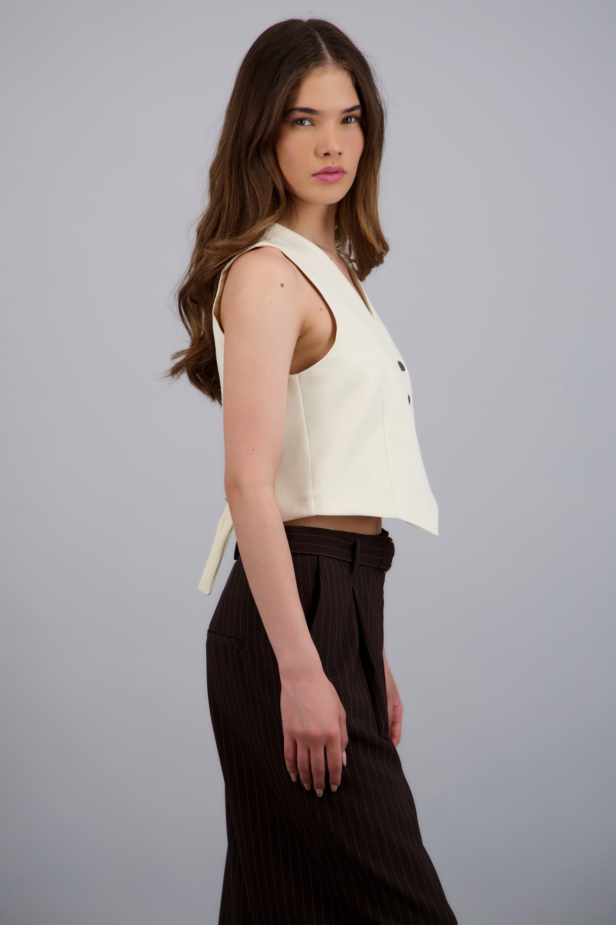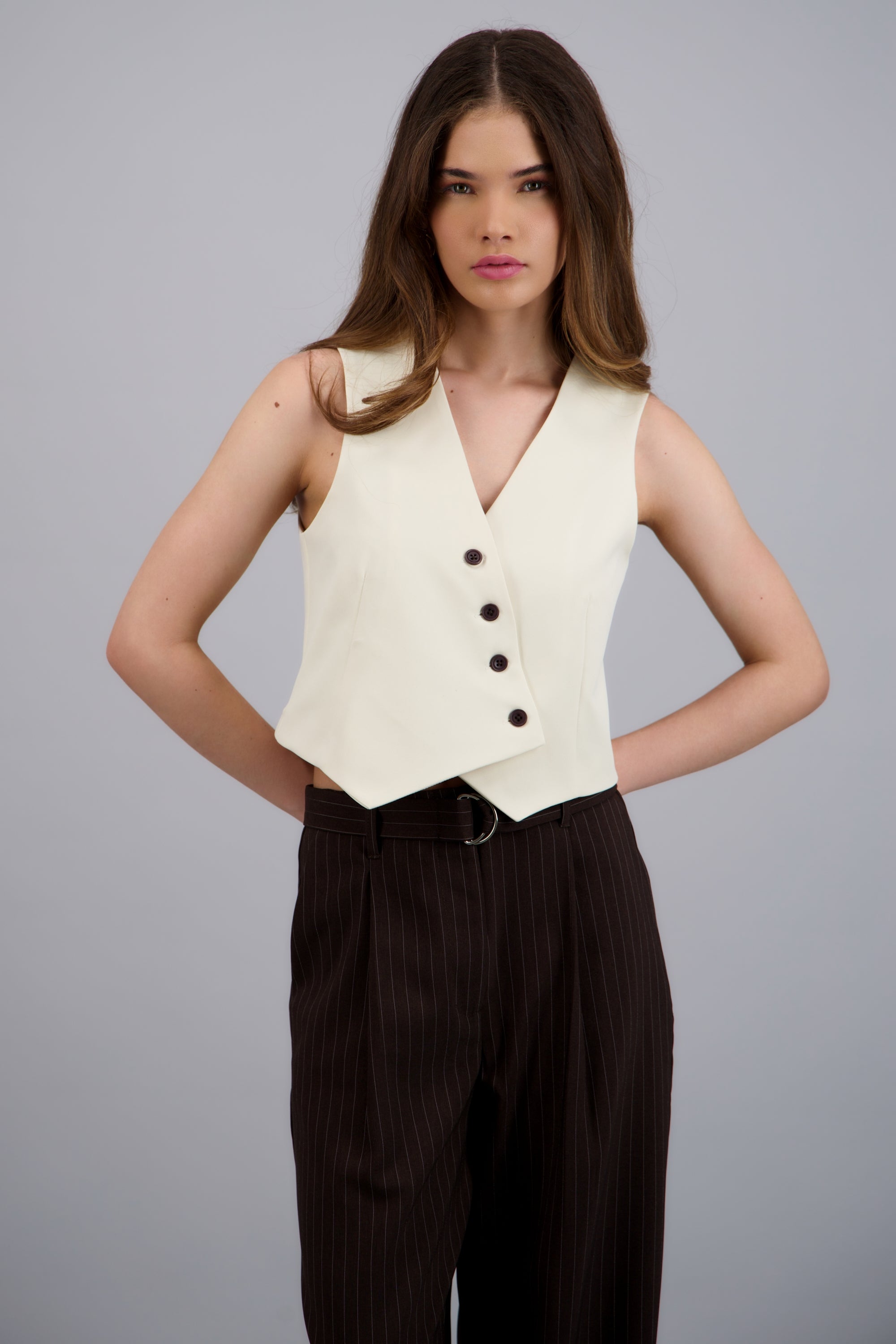 Chaleco asimétrico con botonadura frontal, corte ajustado y detalles de costura.