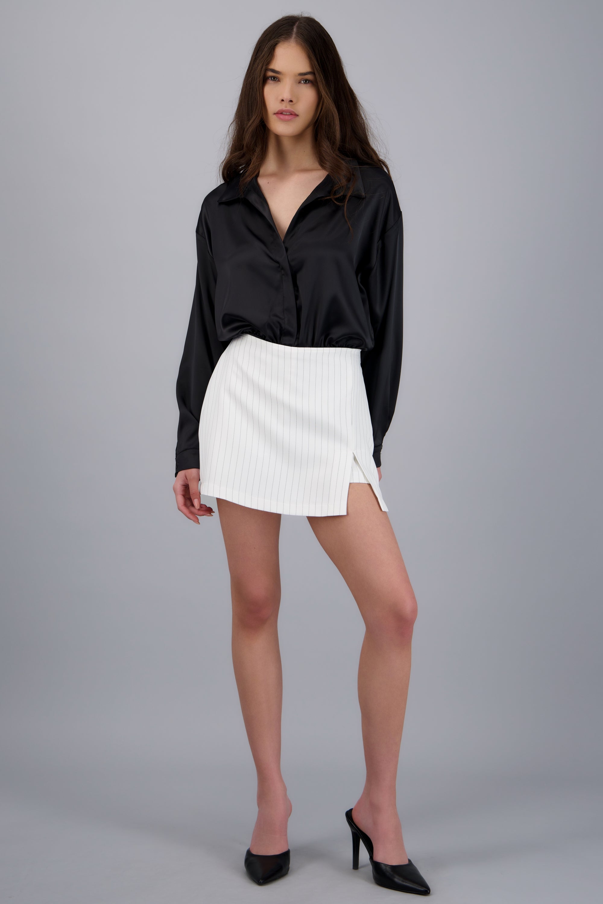 Falda corta con estampado de rayas, corte recto y cintura ajustada.