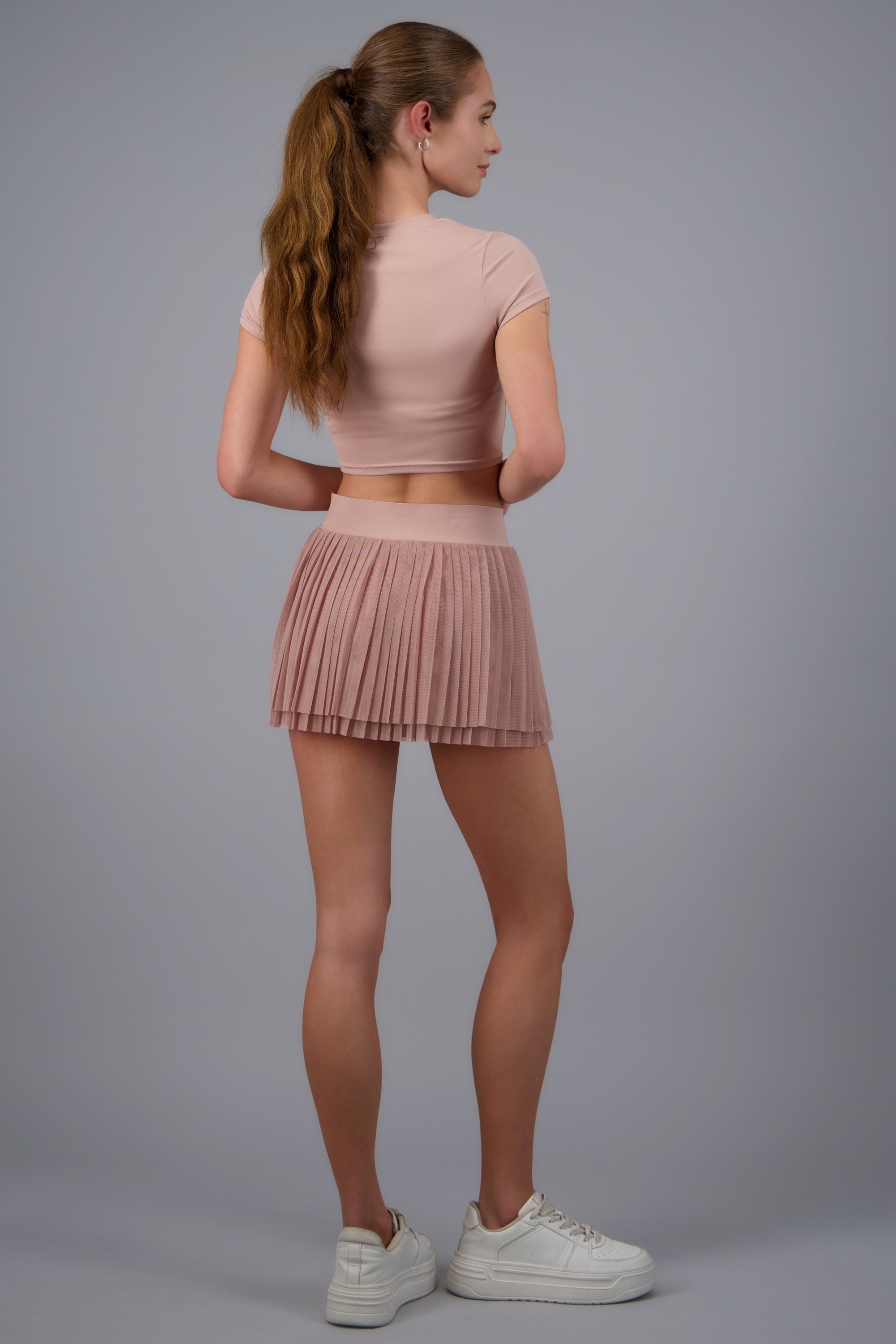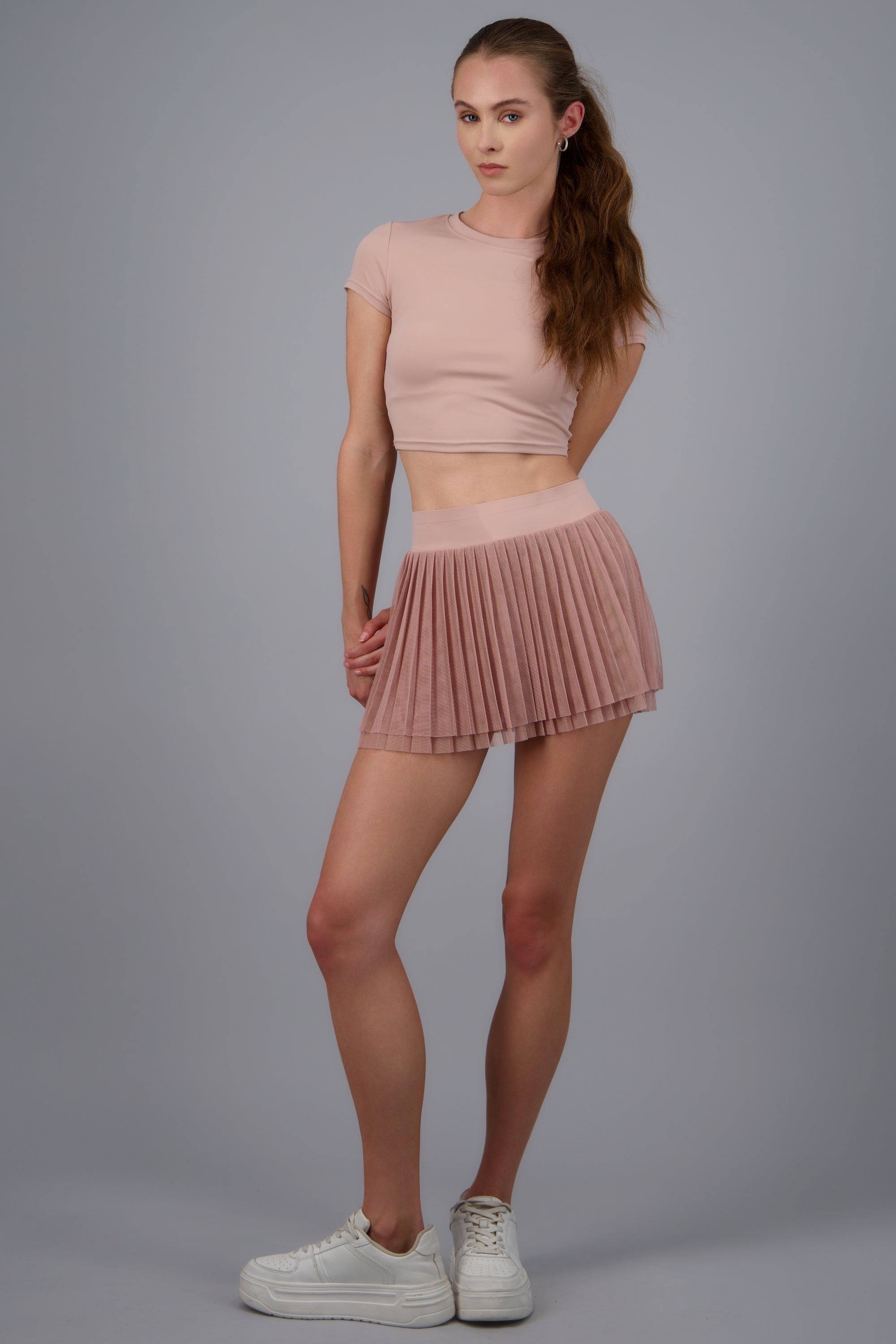 Falda corta tableada de tul, corte mini, diseño de capas y cintura elástica.