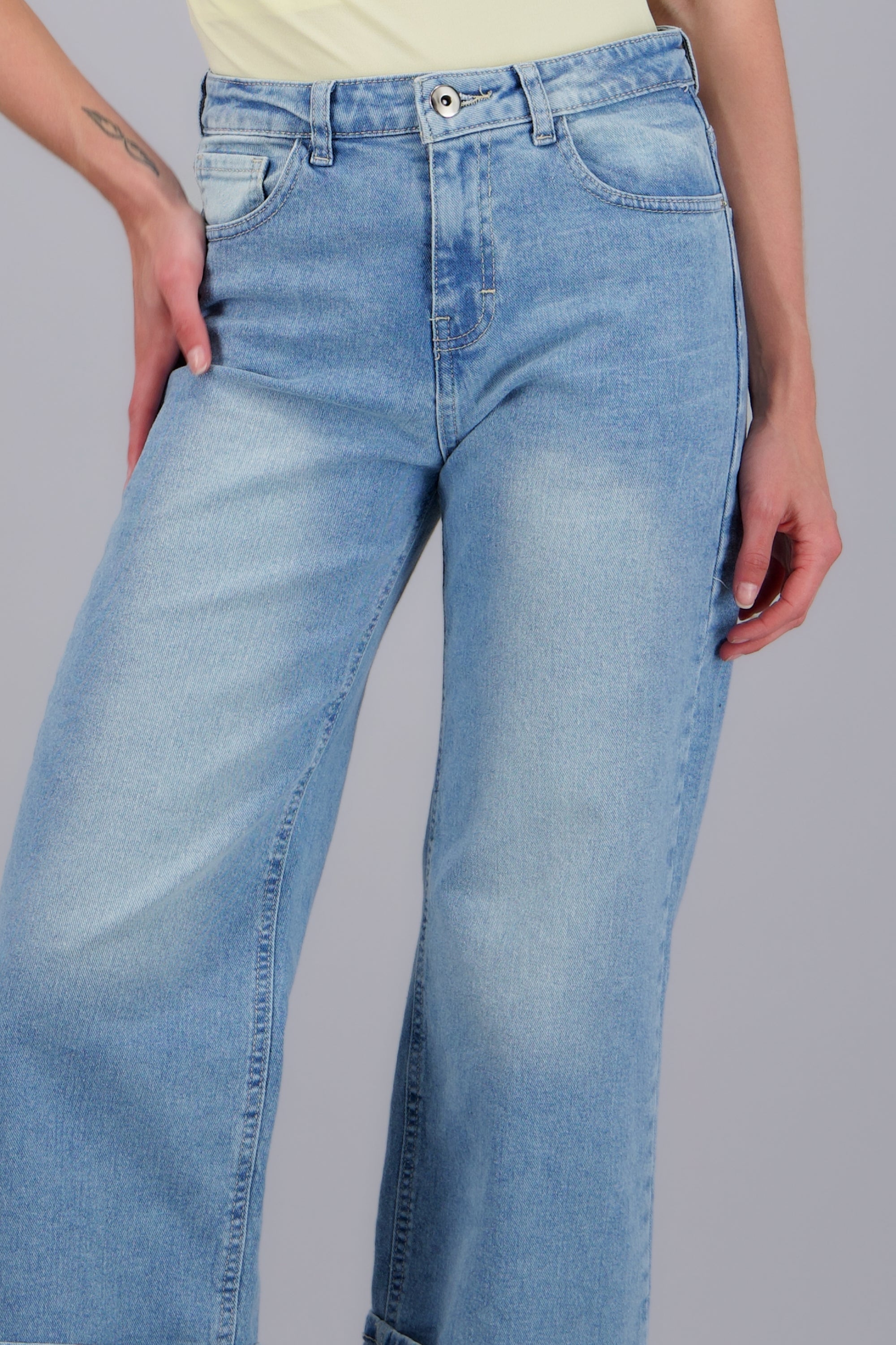 Jeans baggy de tiro medio, corte amplio, bolsas laterales y traseros. Cierre de botón y cremallera.