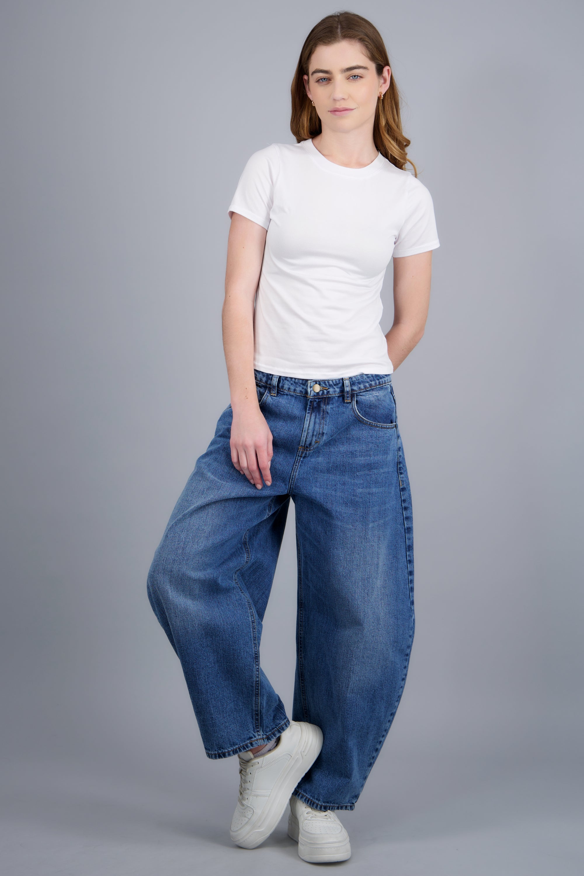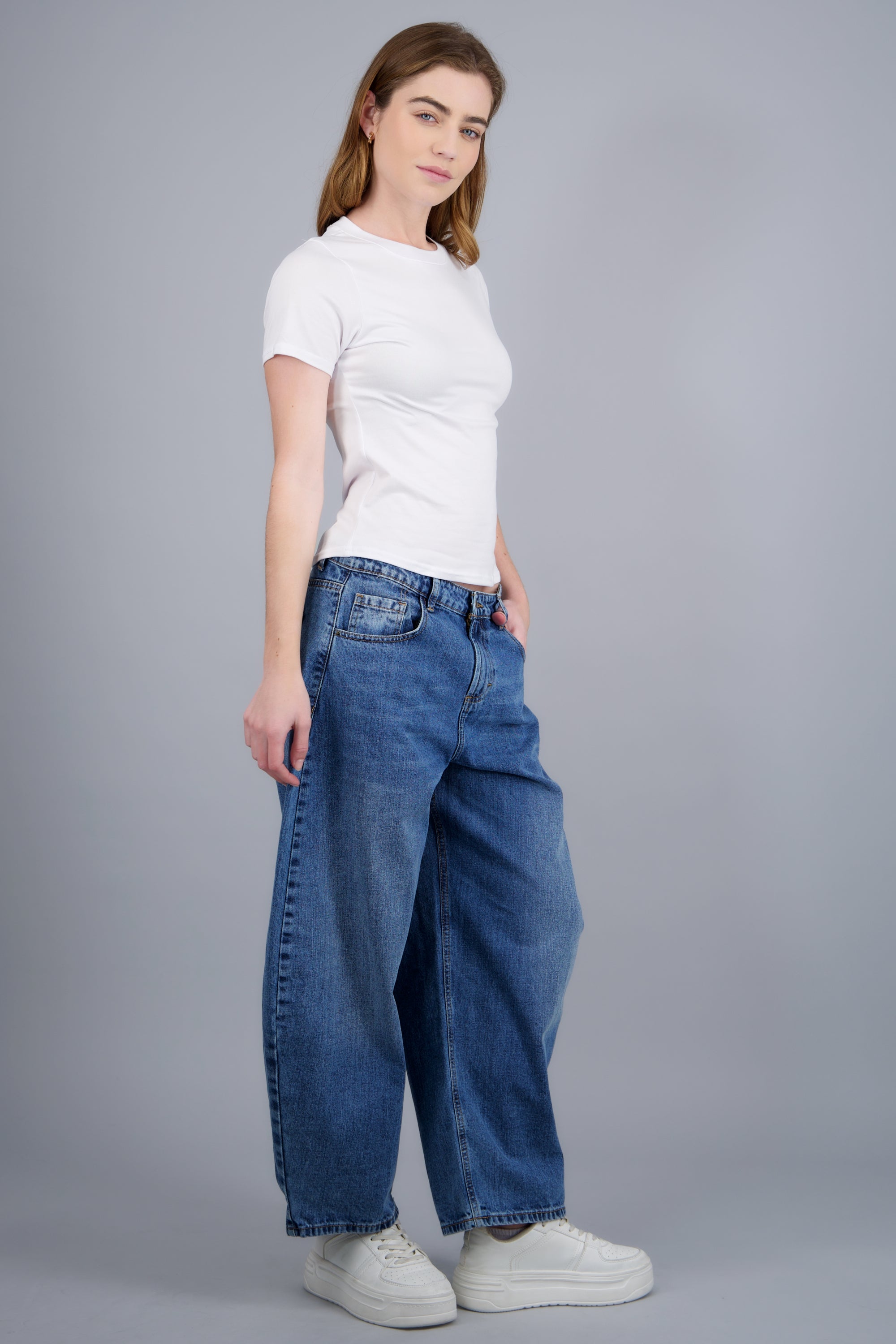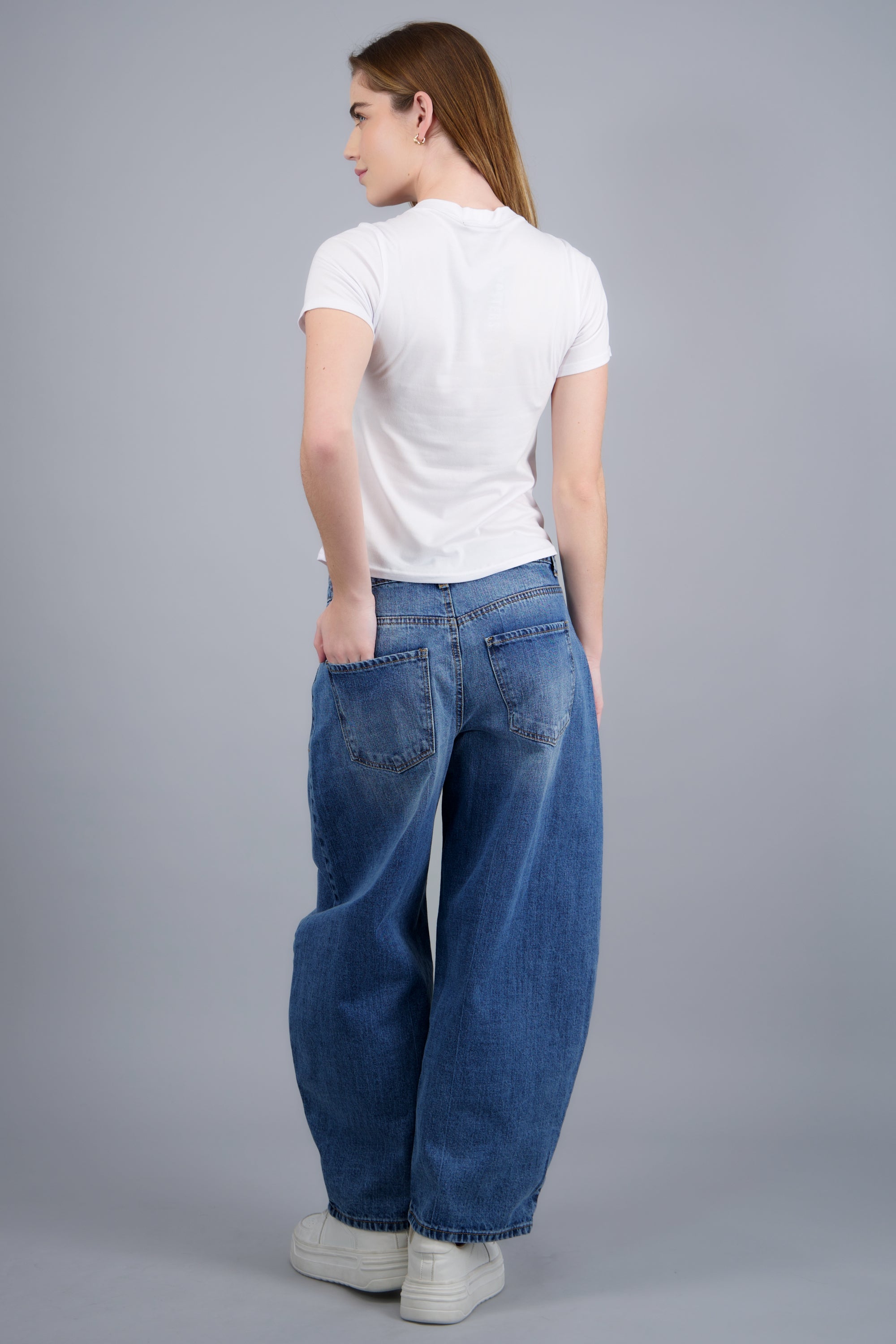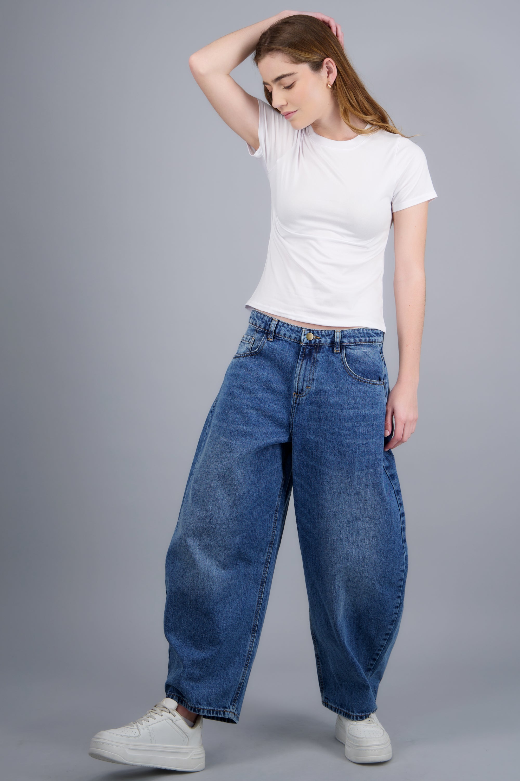 Jeans de corte balloon con tiro medio, diseño holgado, cierre de cremallera y botón en la parte frontal. Detalles de costura visibles.