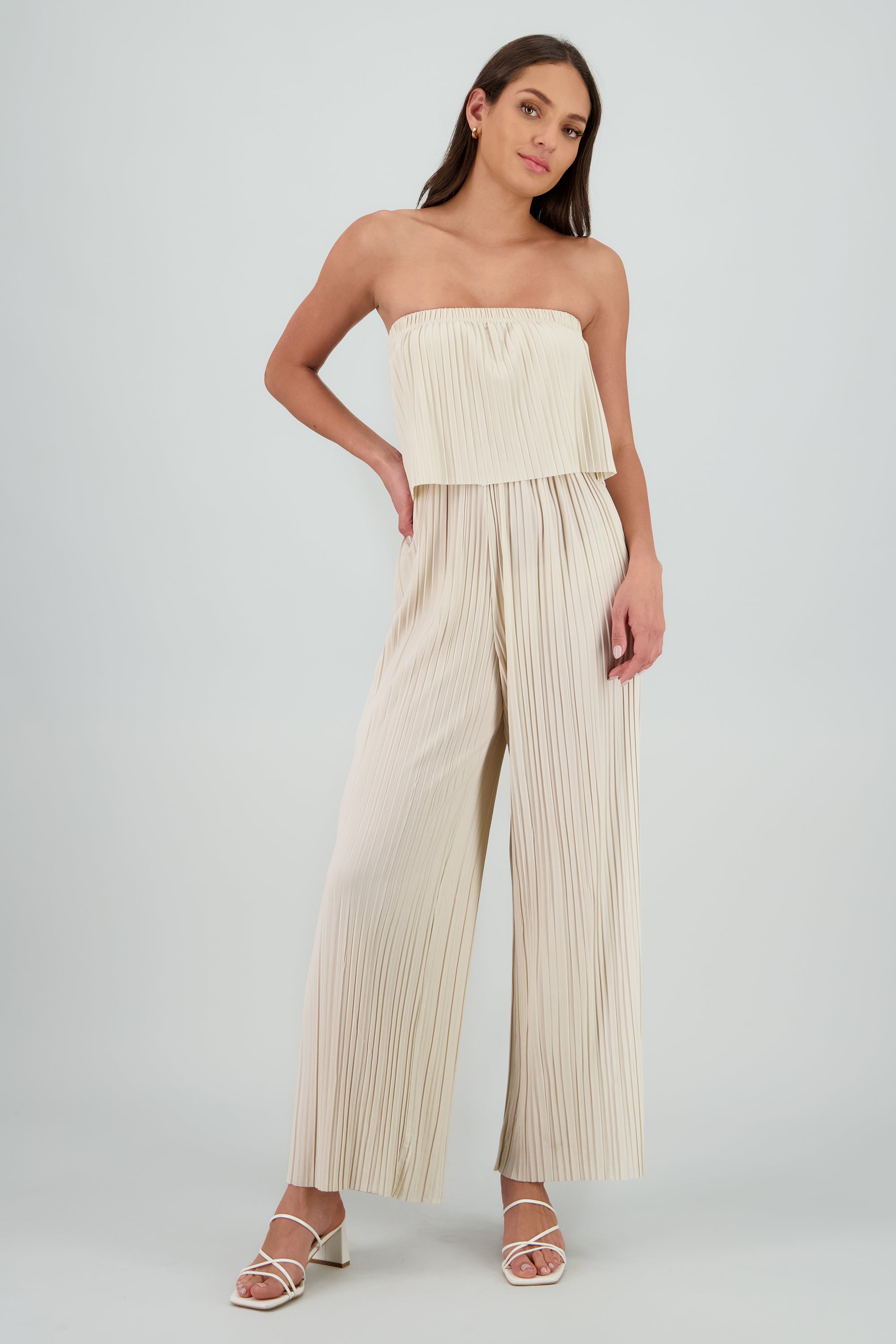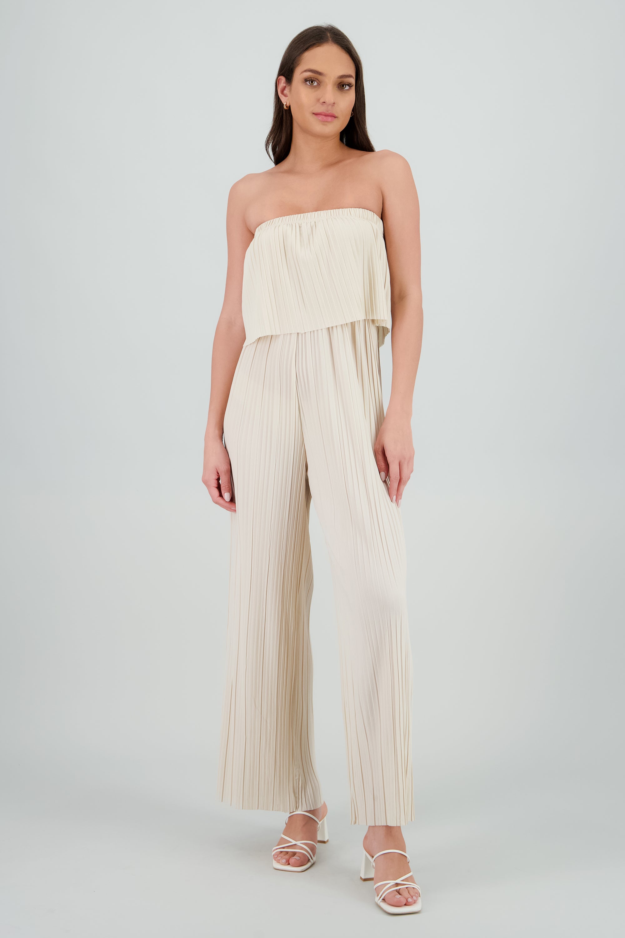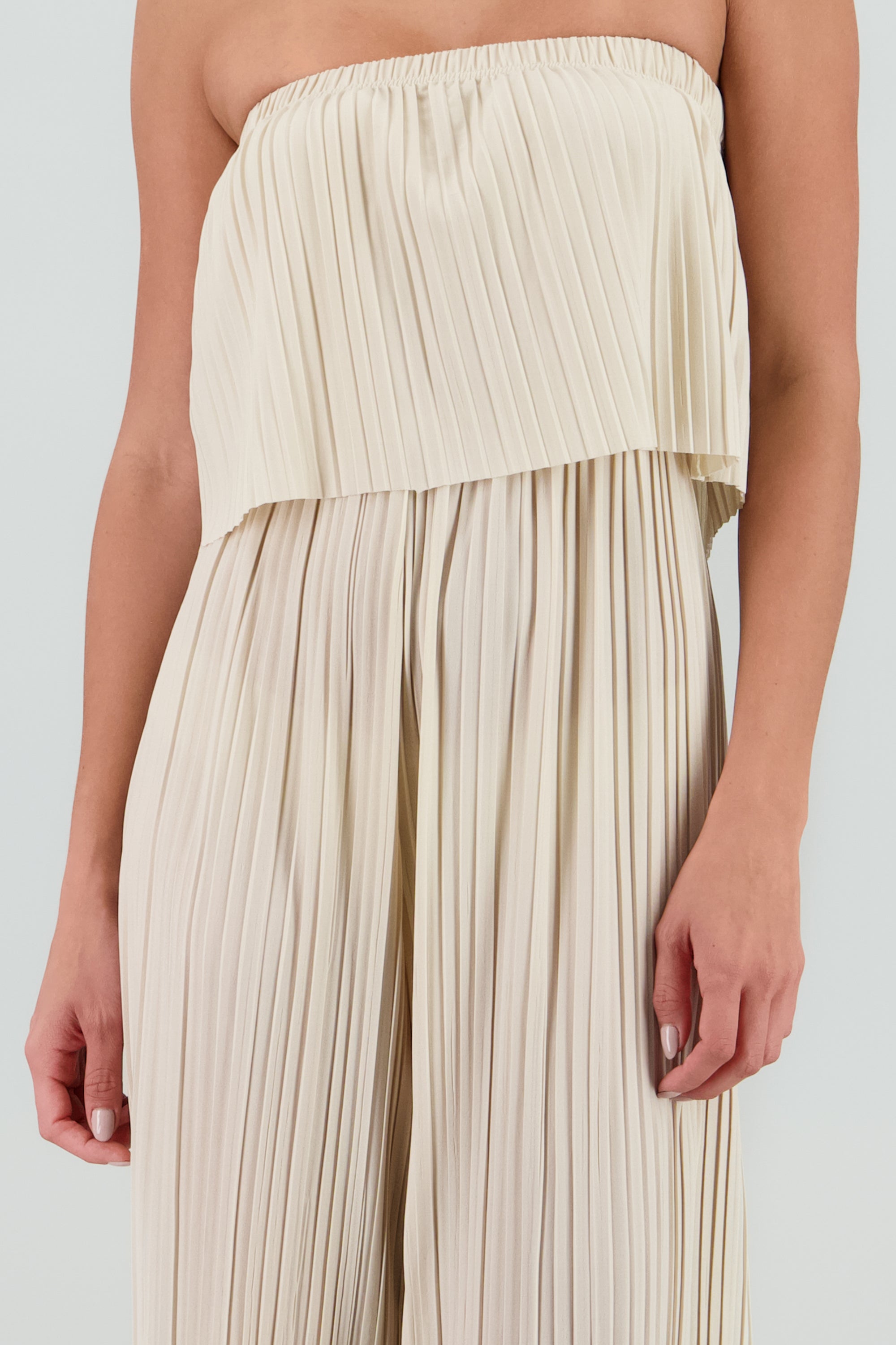 Jumpsuit strapless con detalle plisado de corte recto y escote recto.