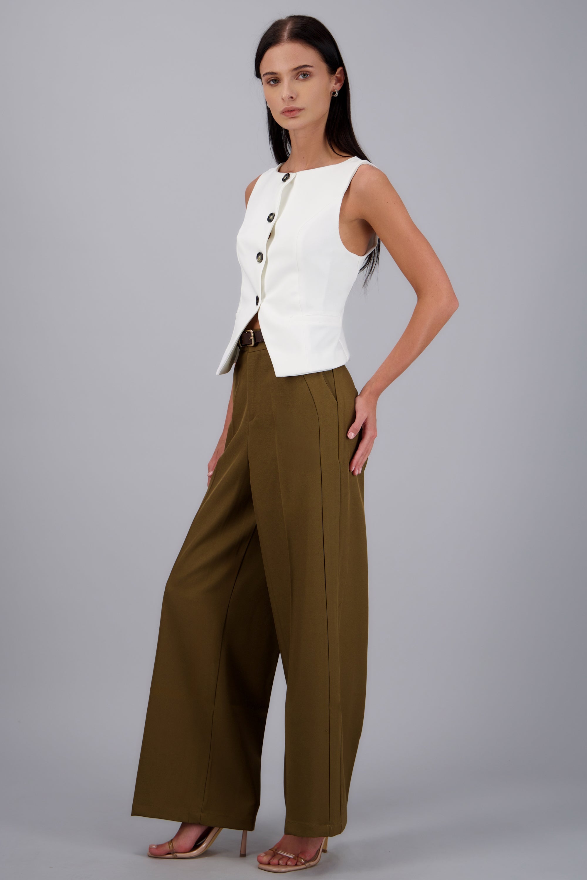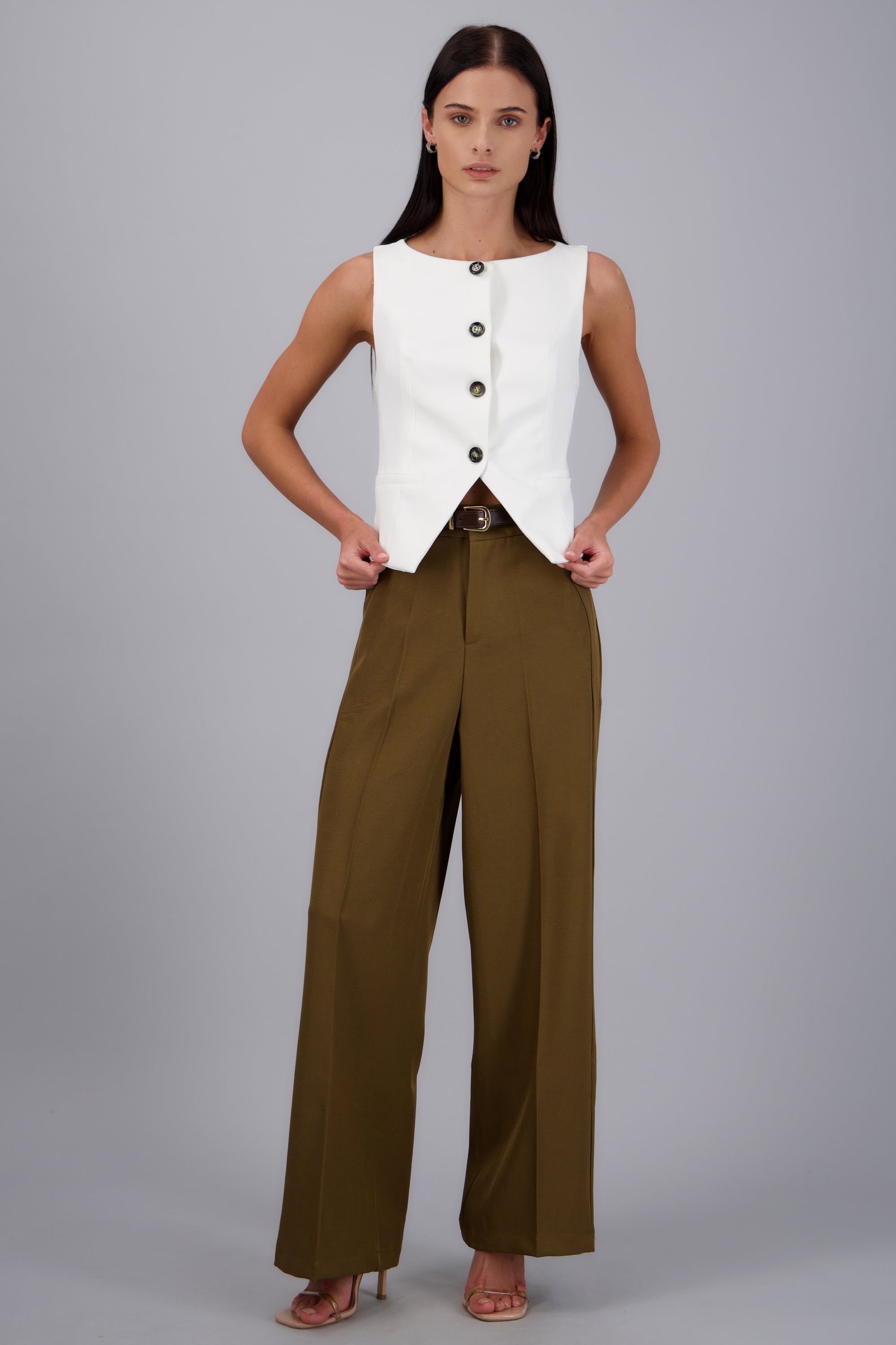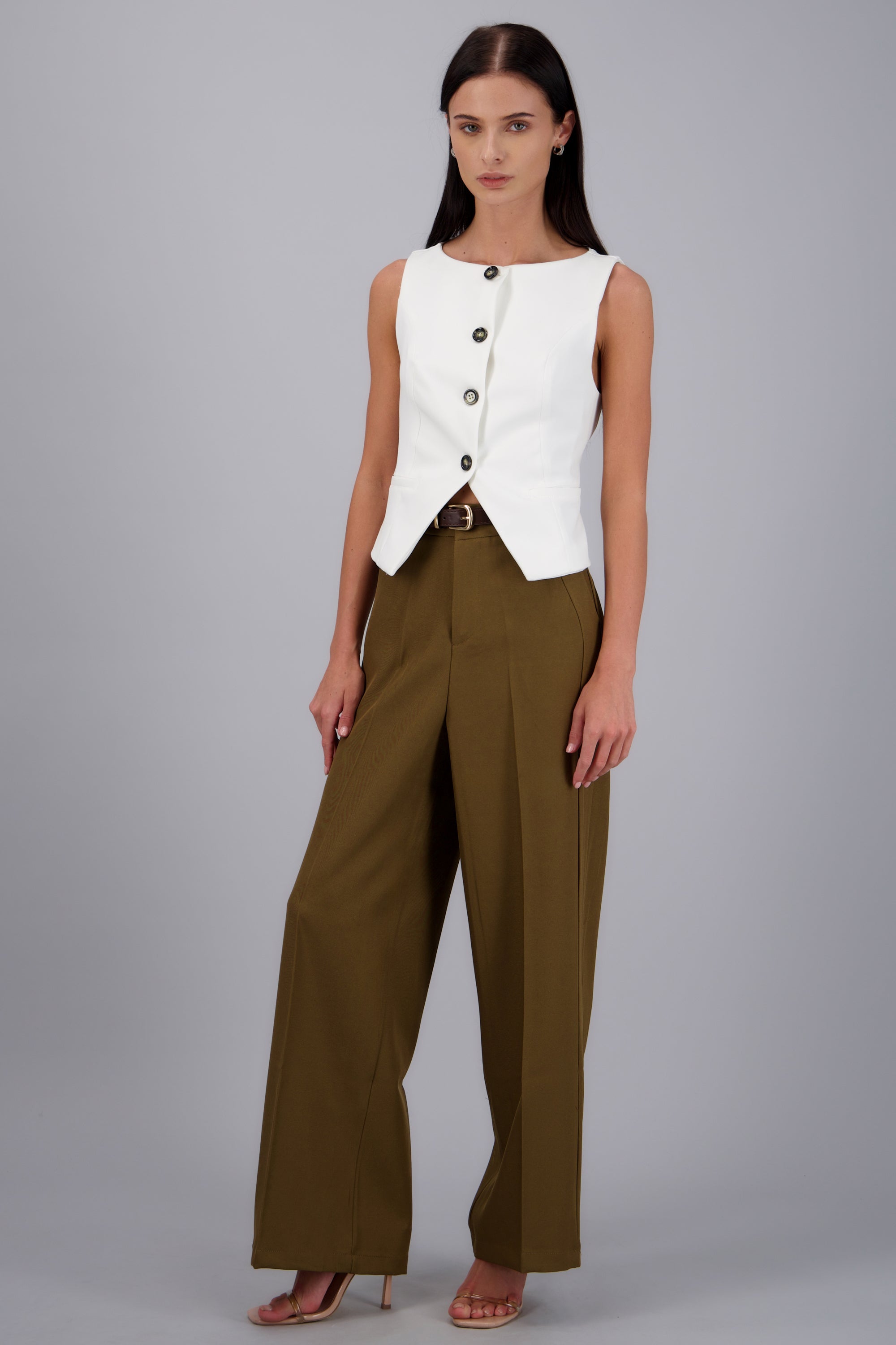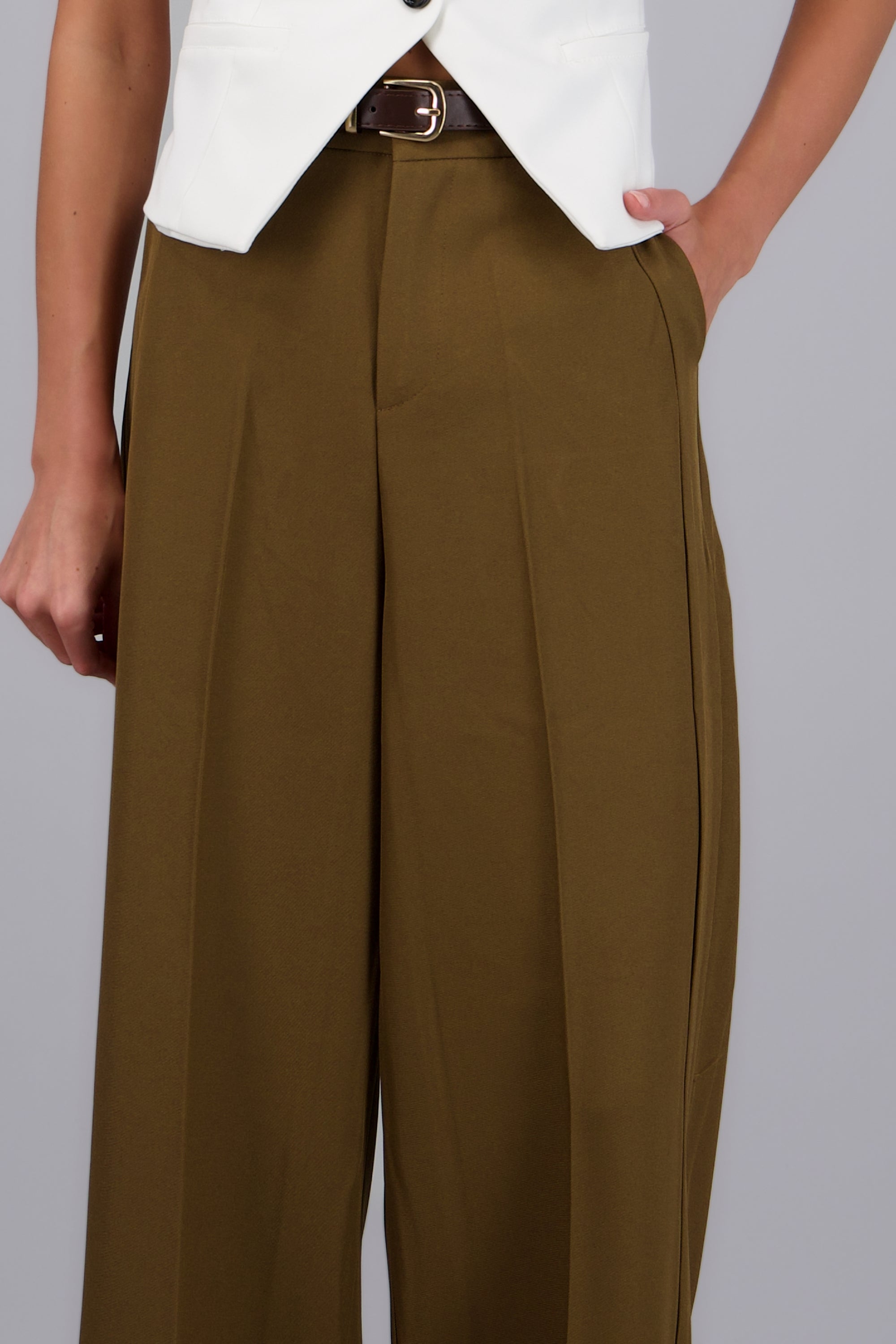 Pantalón recto sastreado con cinturón, corte clásico, bolsas laterales y cierre de cremallera.