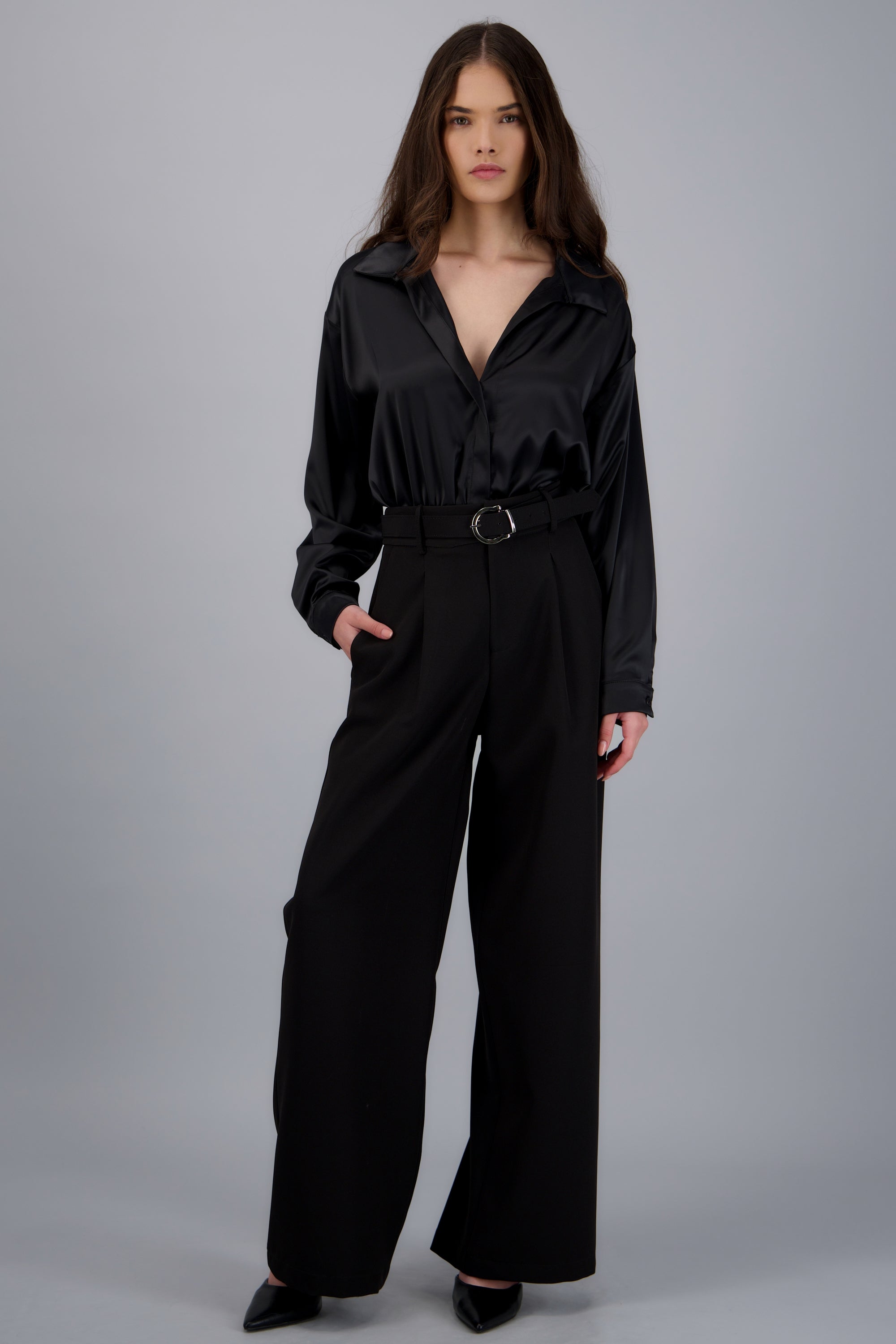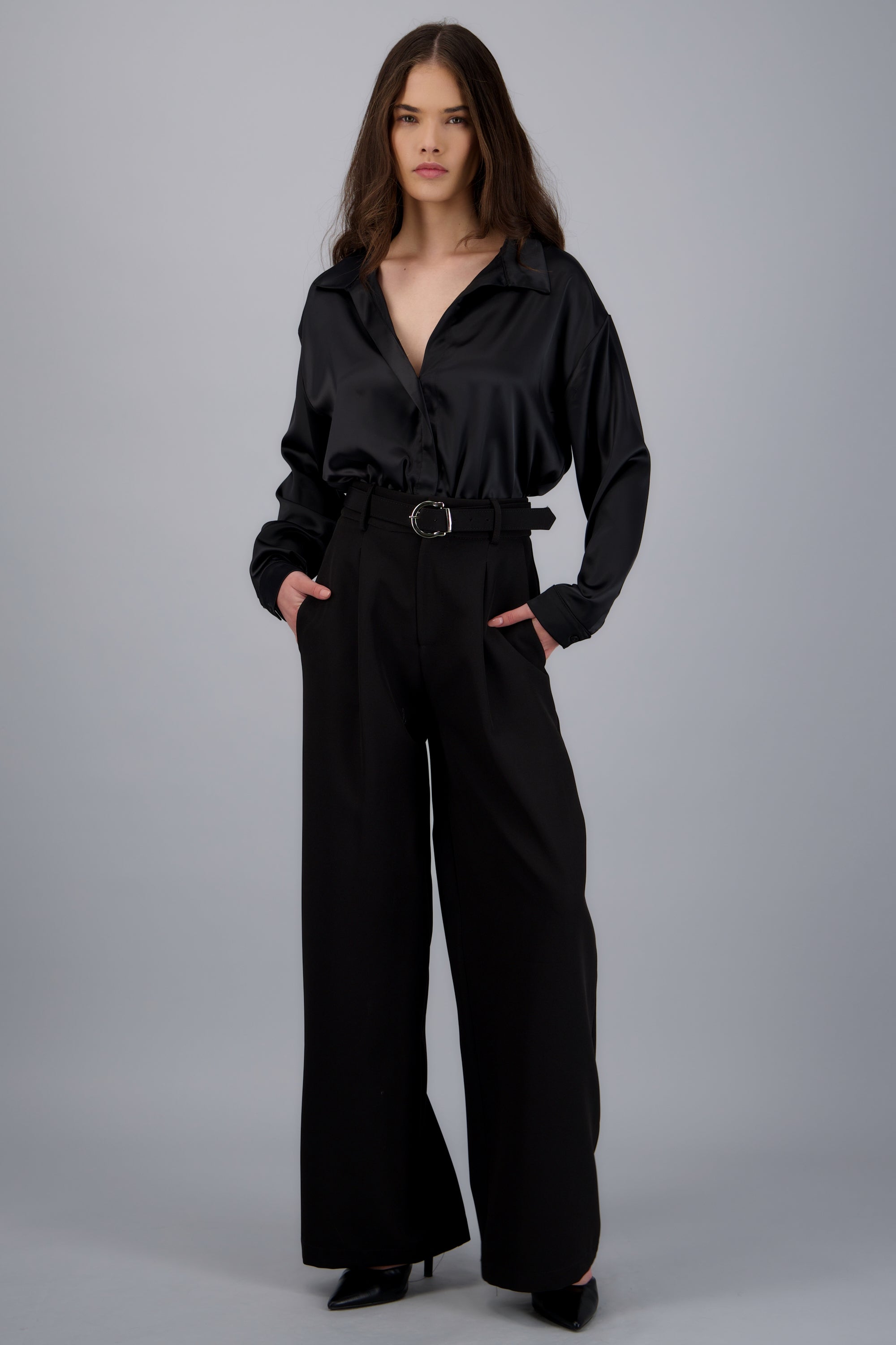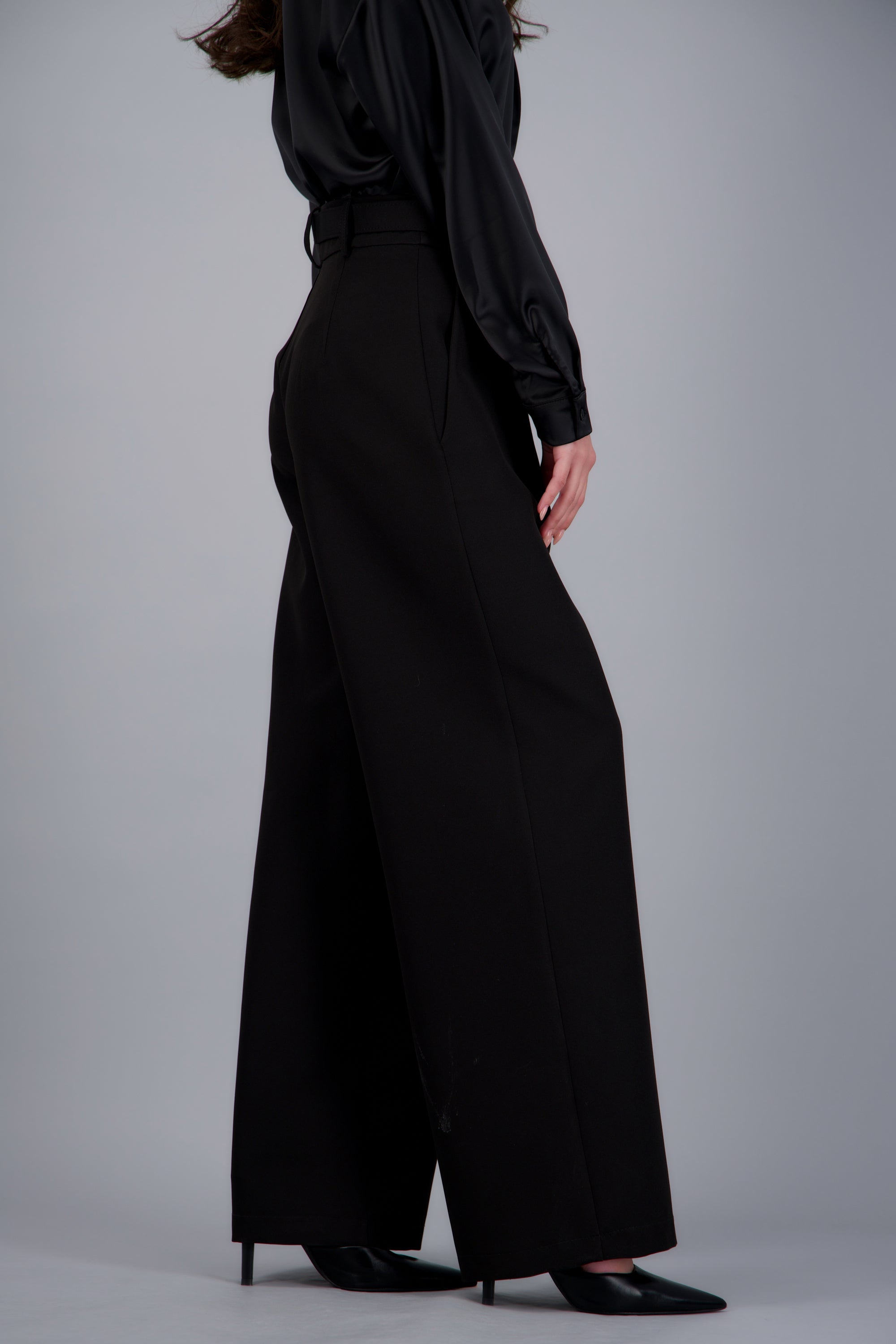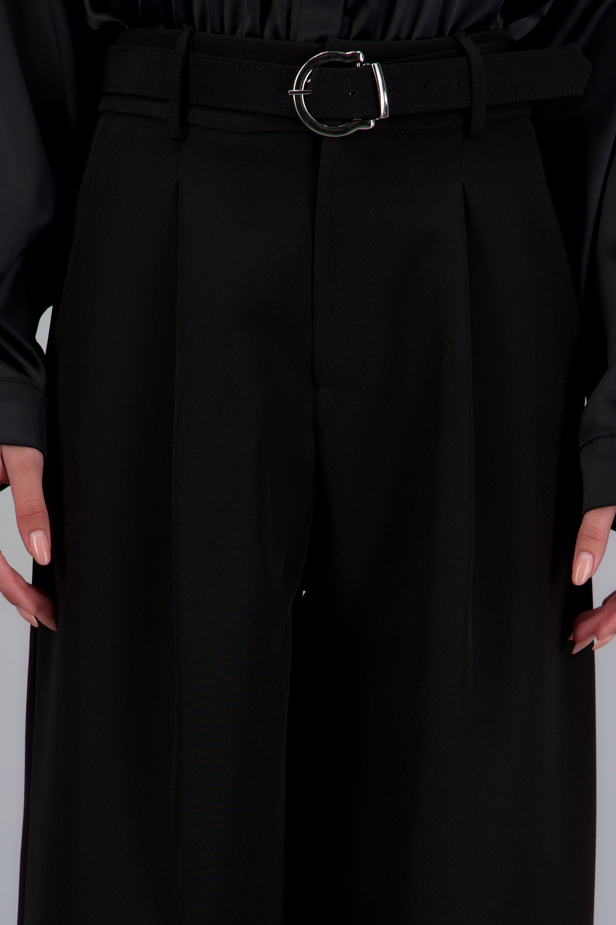 Straight-cut tailored trousers with adjustable belt, side pockets and front darts.