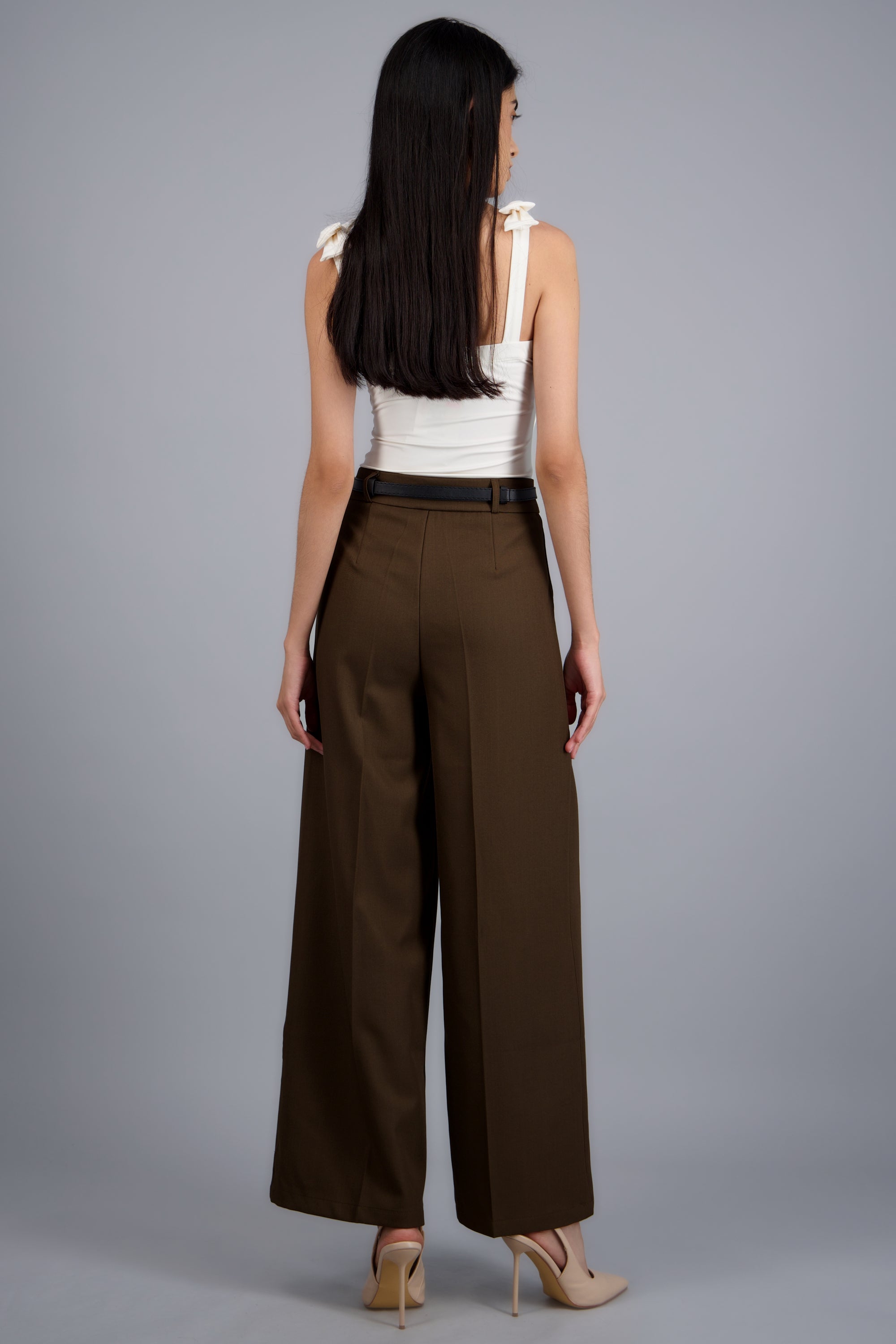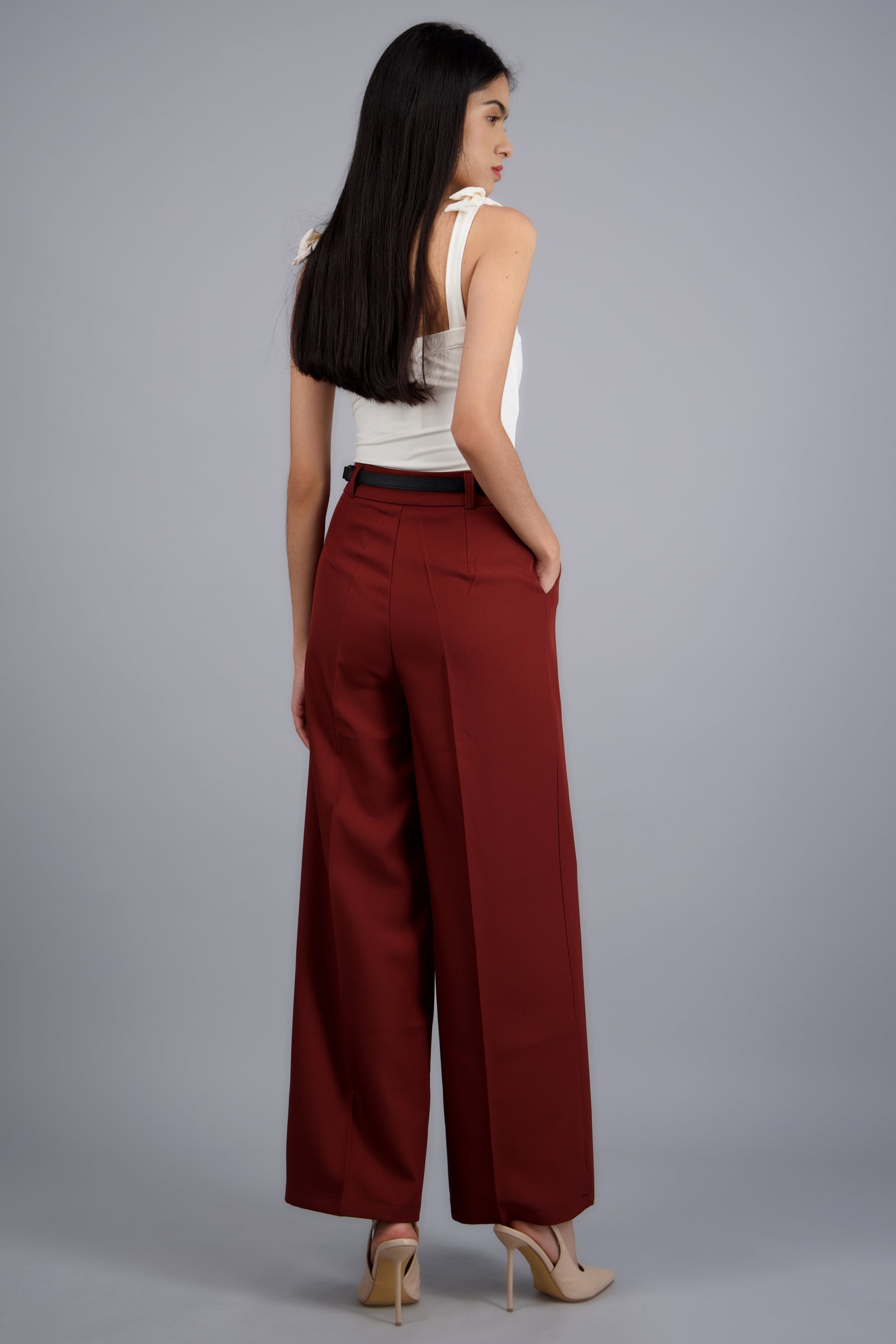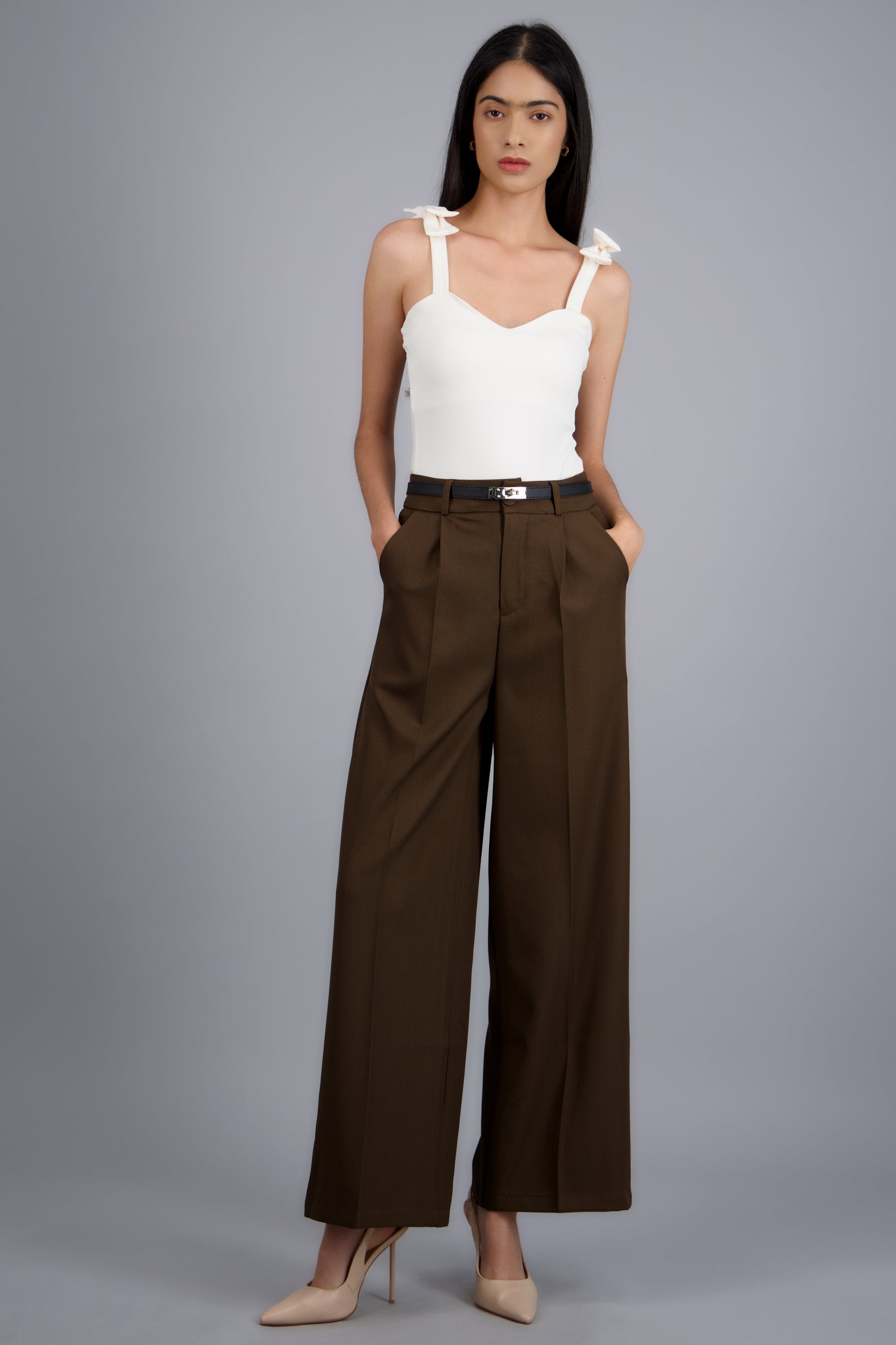 Pantalón sastre con cinturon ajustable, corte recto, diseño de tiro medio, bolsas laterales y cierre con cremallera y botón.