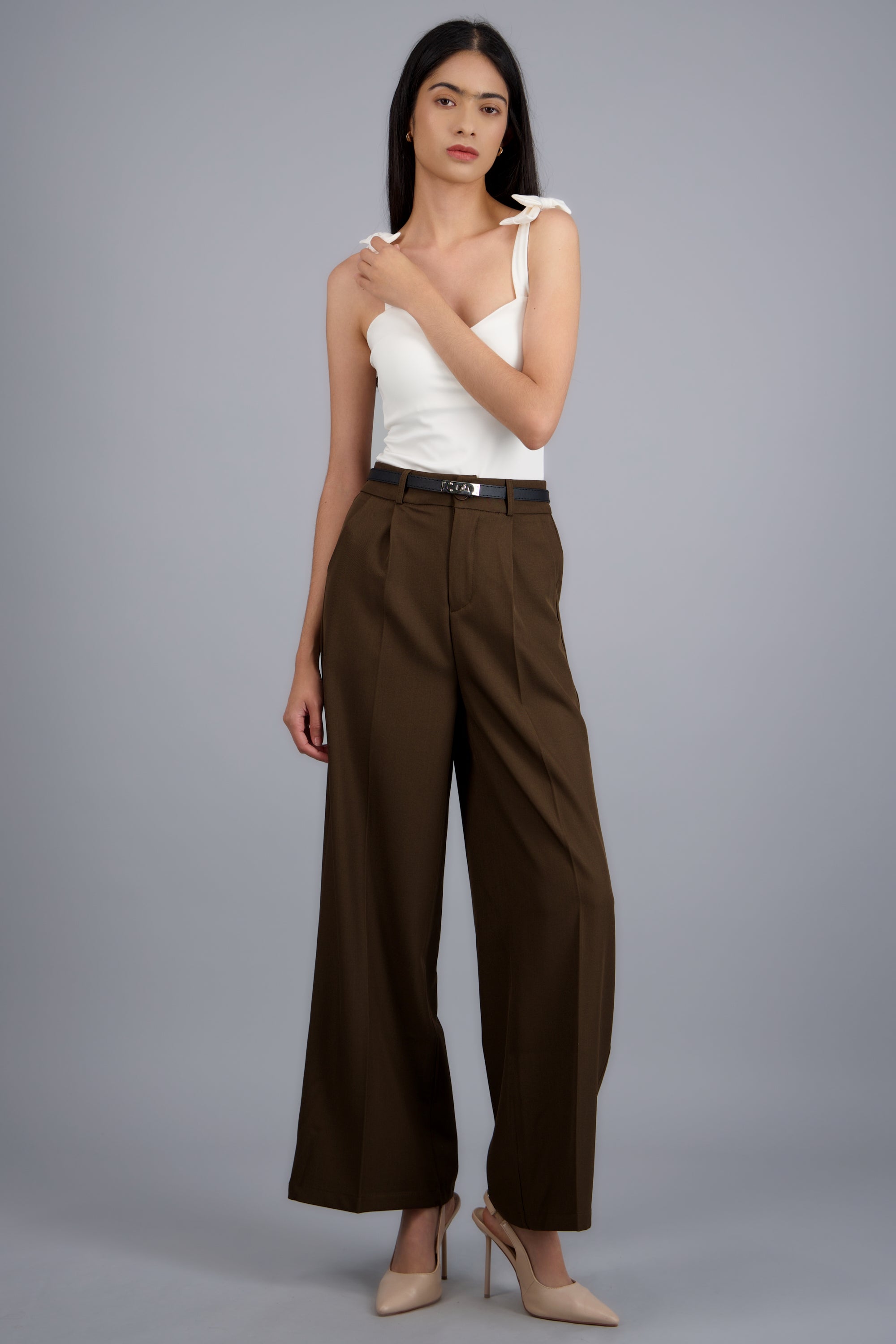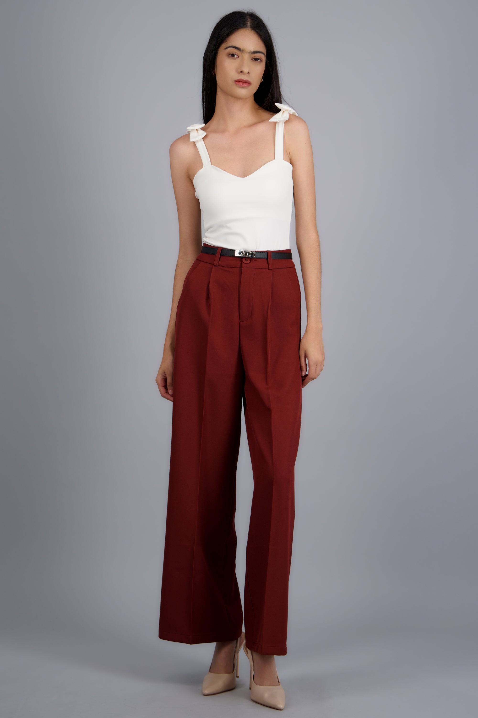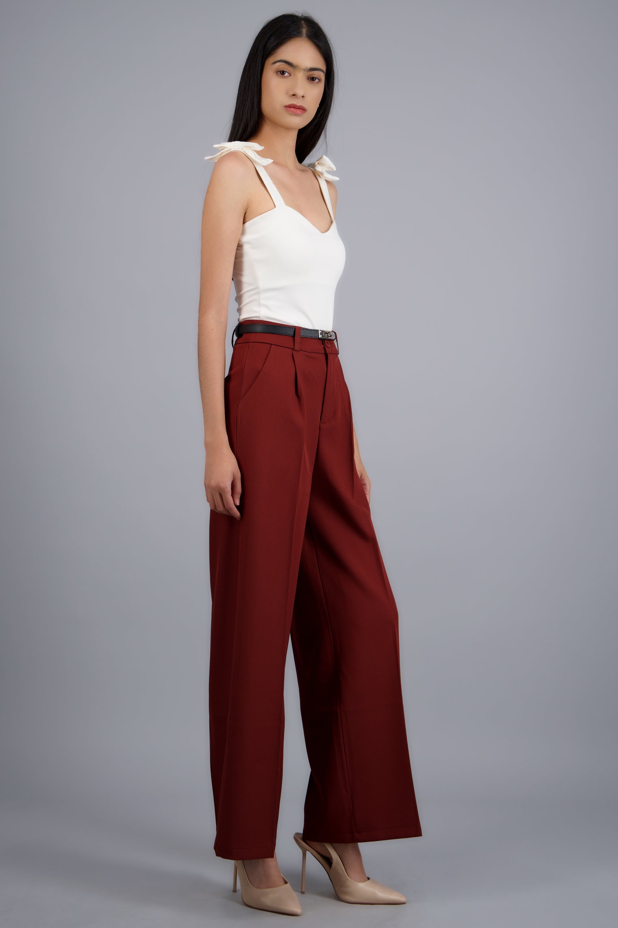 Pantalón sastre con cinturon ajustable, corte recto, diseño de tiro medio, bolsas laterales y cierre con cremallera y botón.