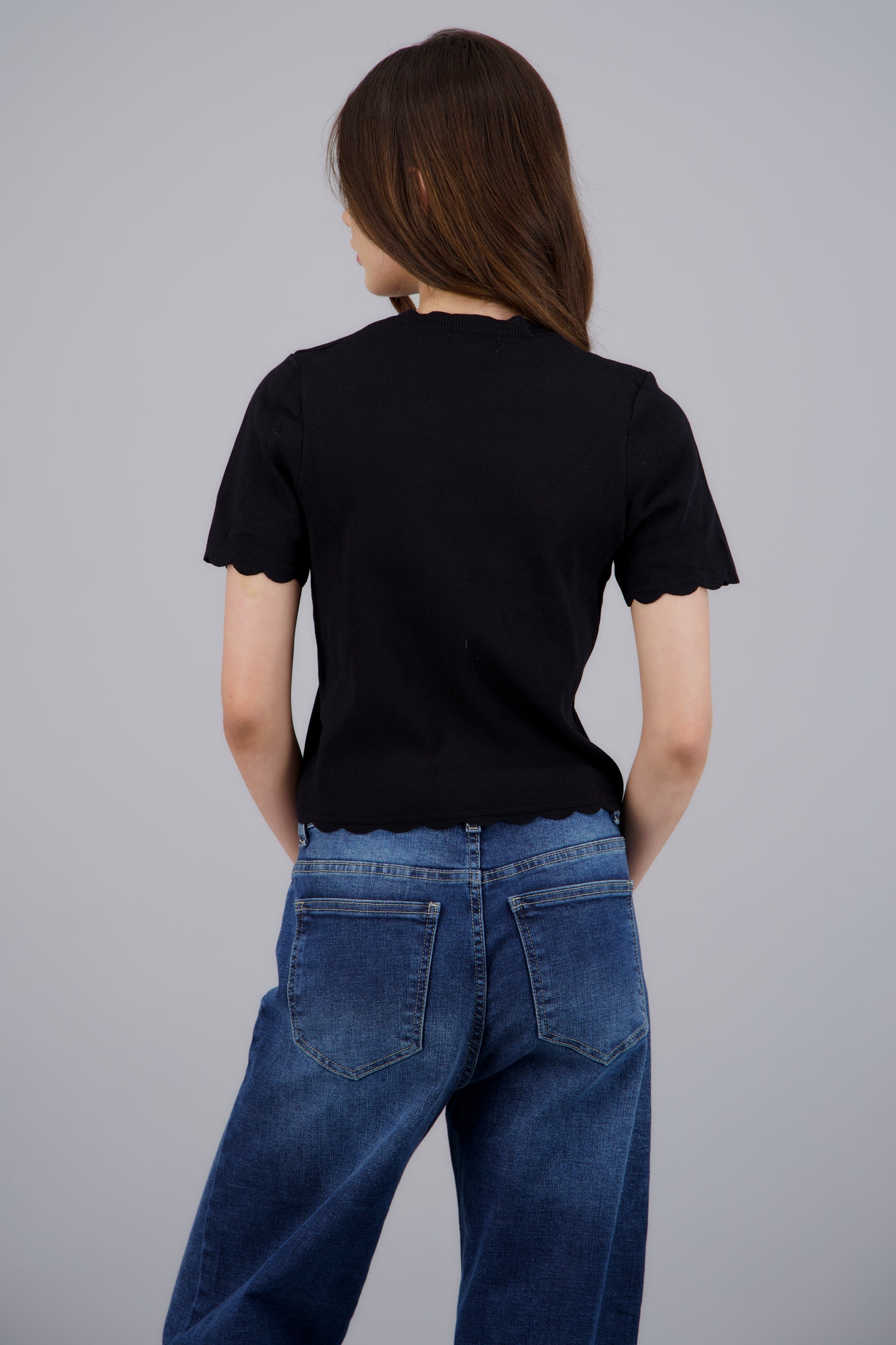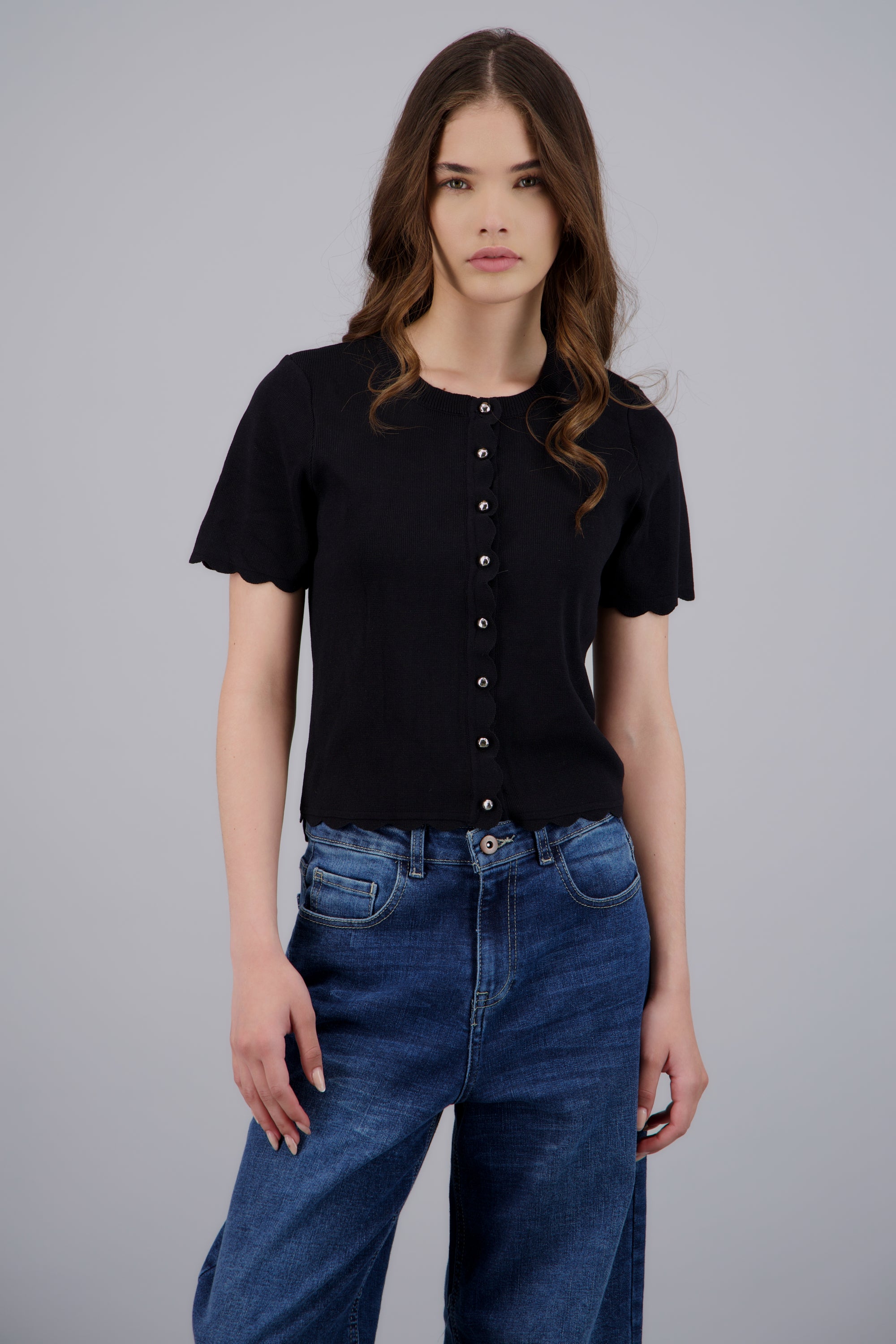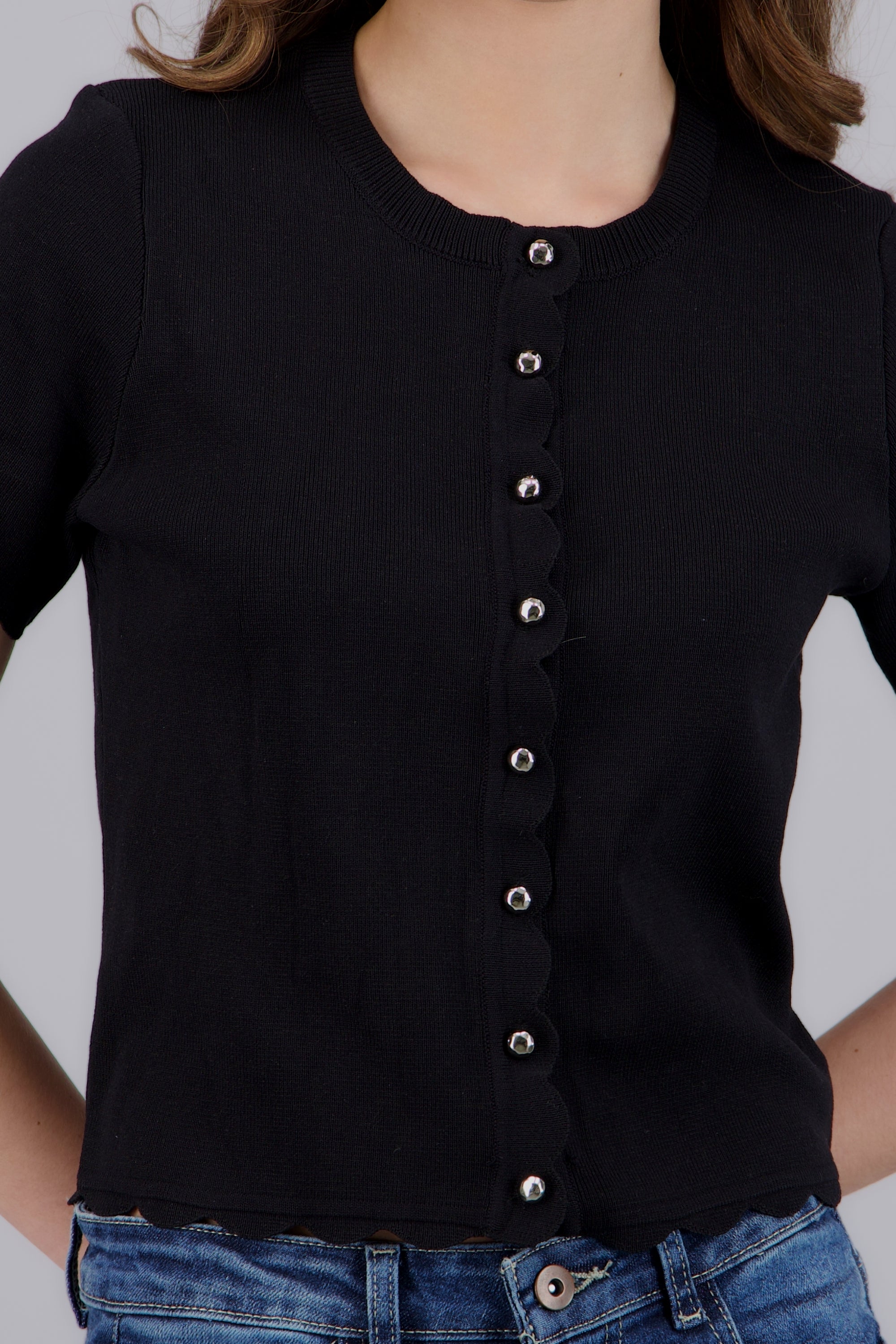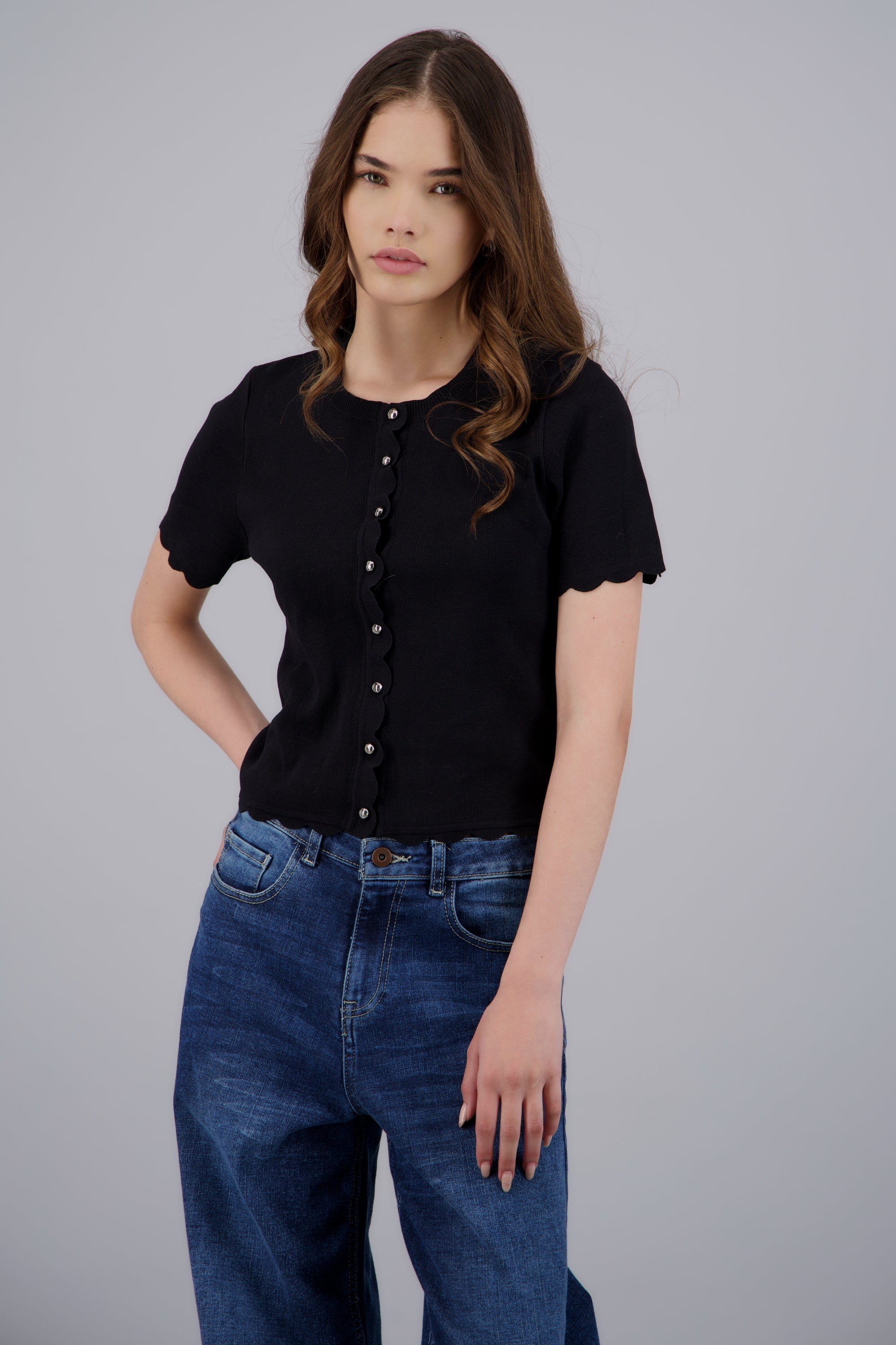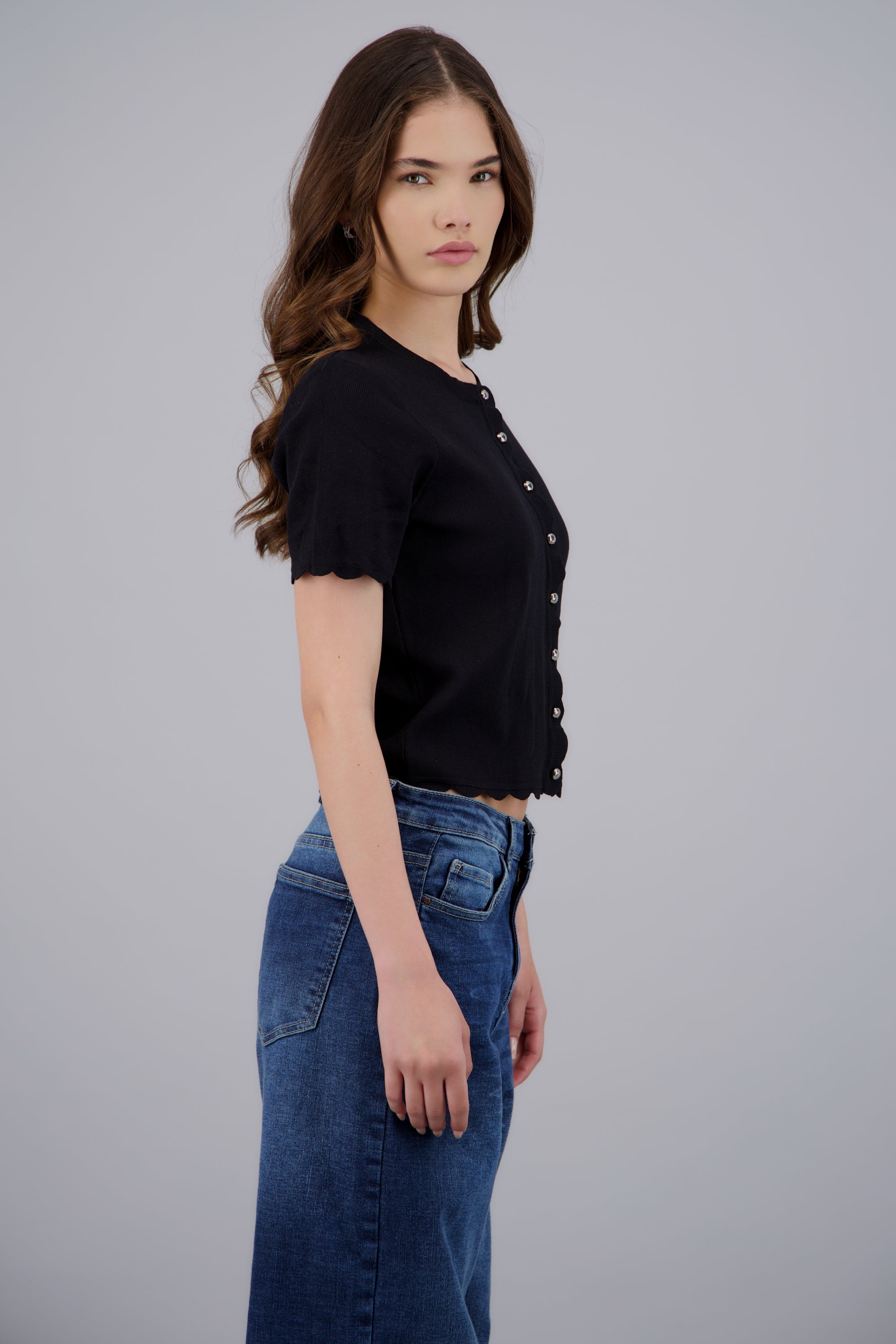 Top de canalé con botones en el frente, manga corta y corte ajustado.