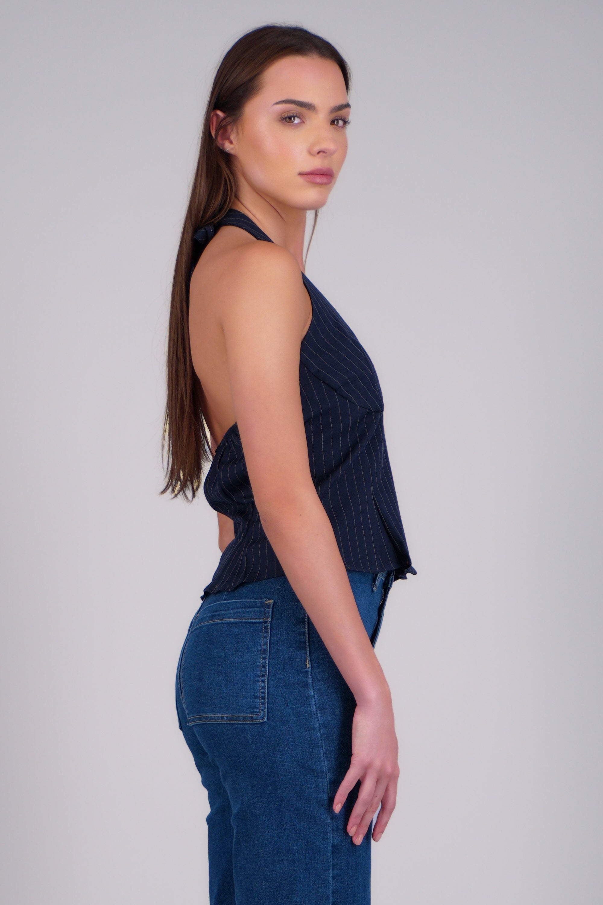 Halter top with back tie, contrasting striped print. Fitted cut and front buttons.