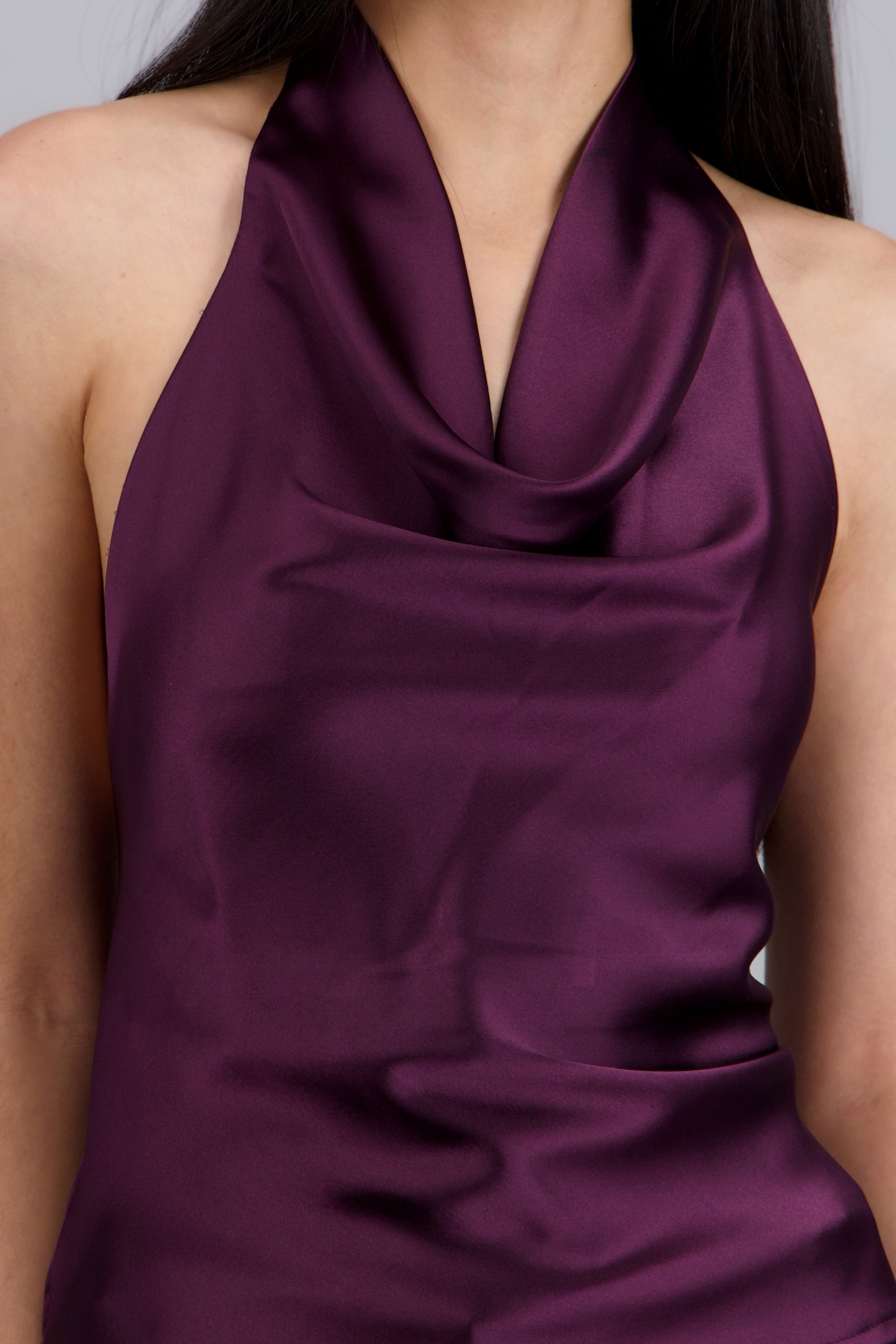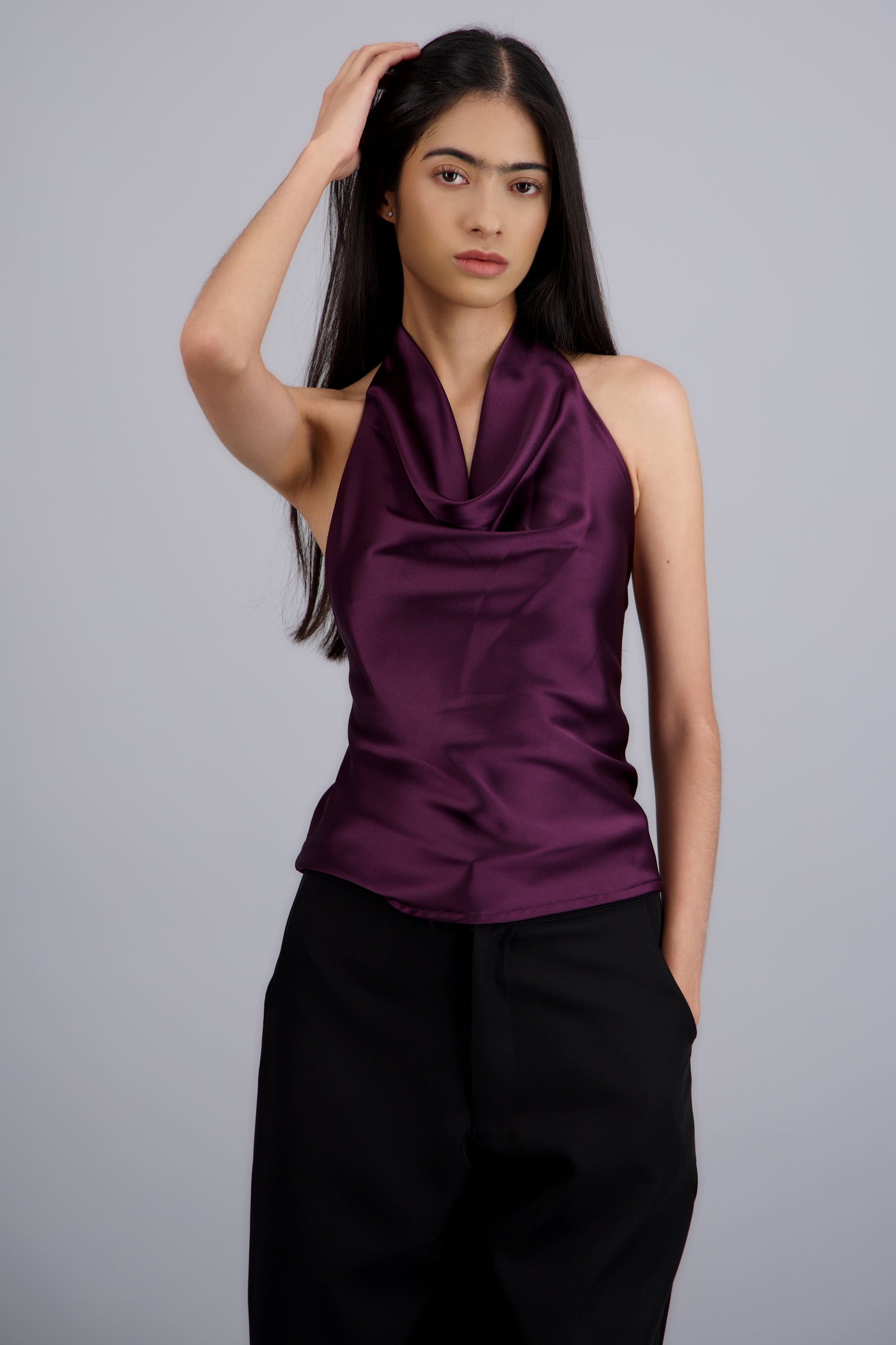 Top halter con diseño de cuello cascada. Corte ajustado, sin mangas. Cierre en la parte trasera con botón.