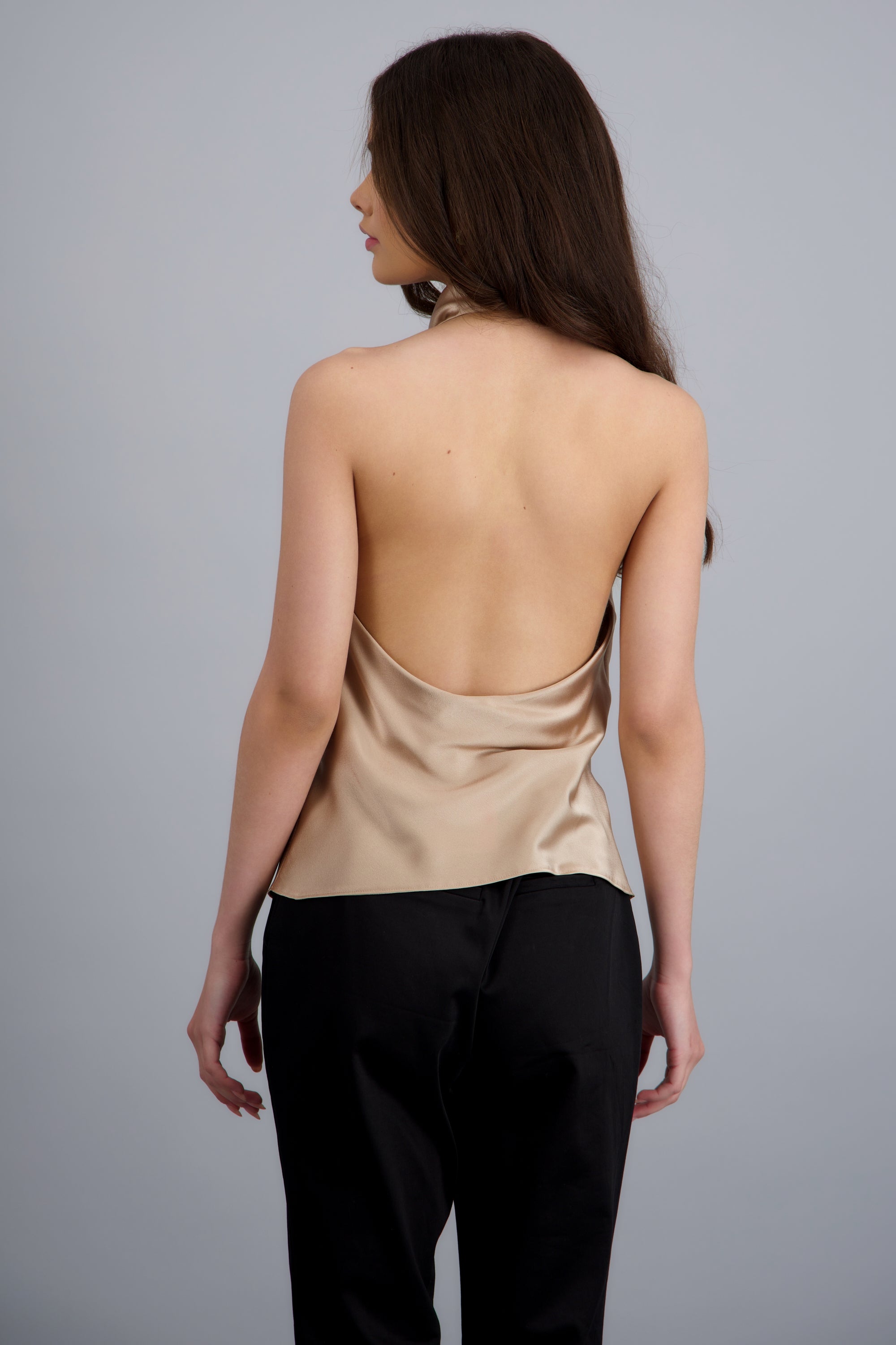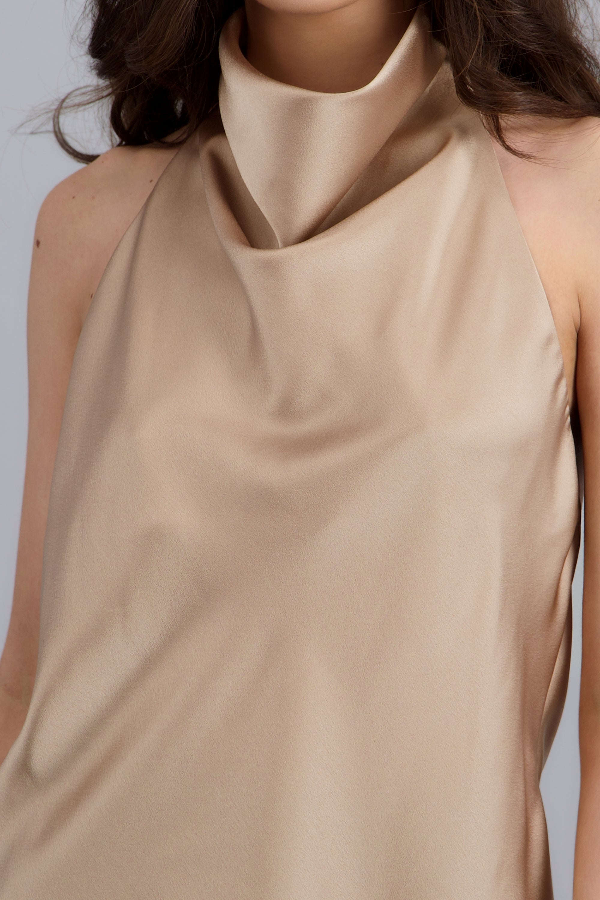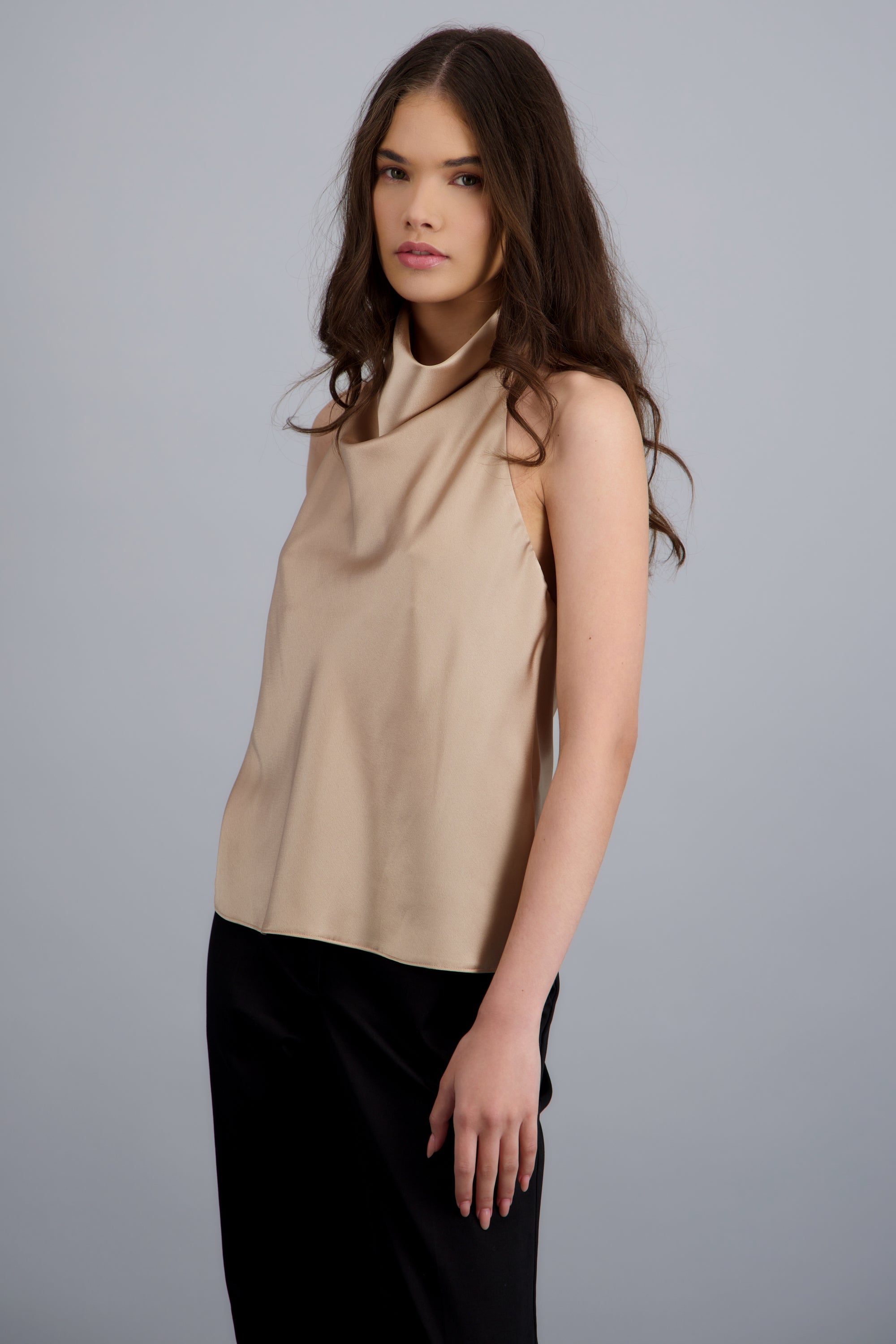 Satin top with a high waterfall neckline, fitted cut, and asymmetrical design. Button closure at the back.