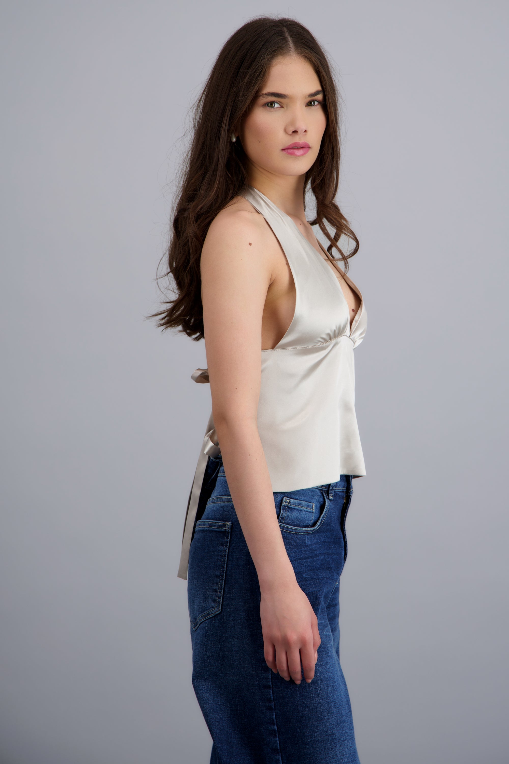 Sleeveless satin top with a V-neck and halter neck. Open back with adjustable ties.