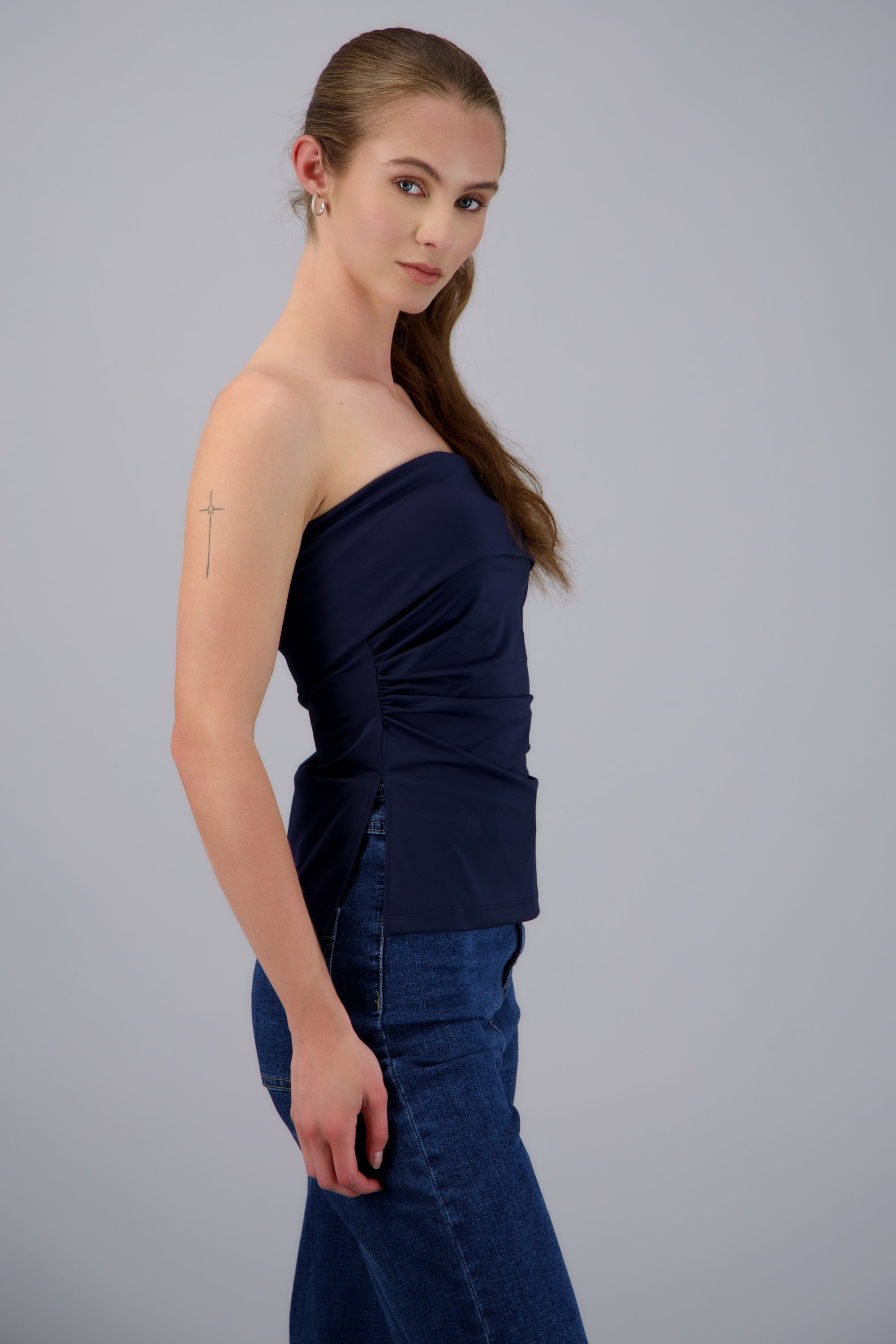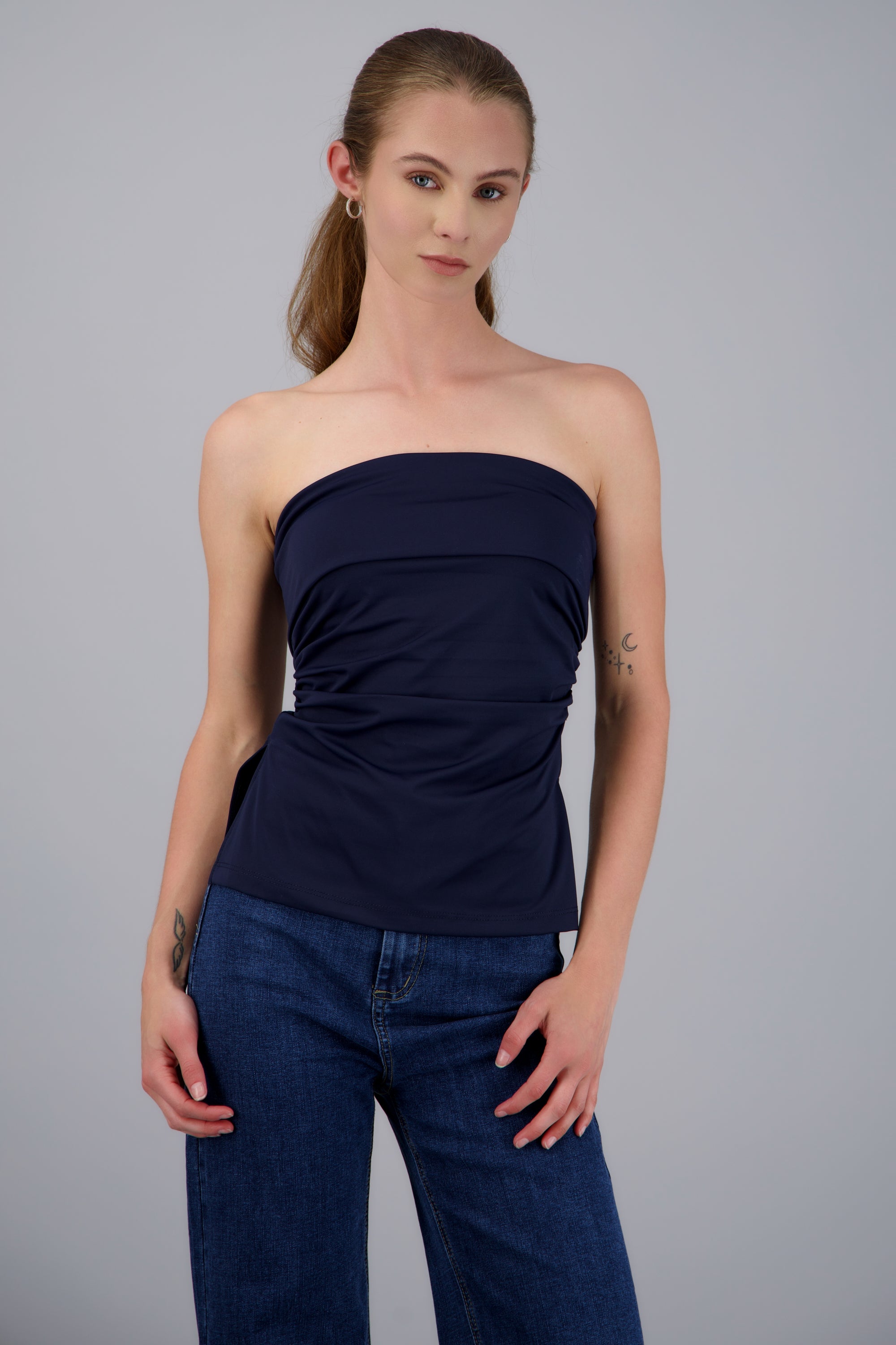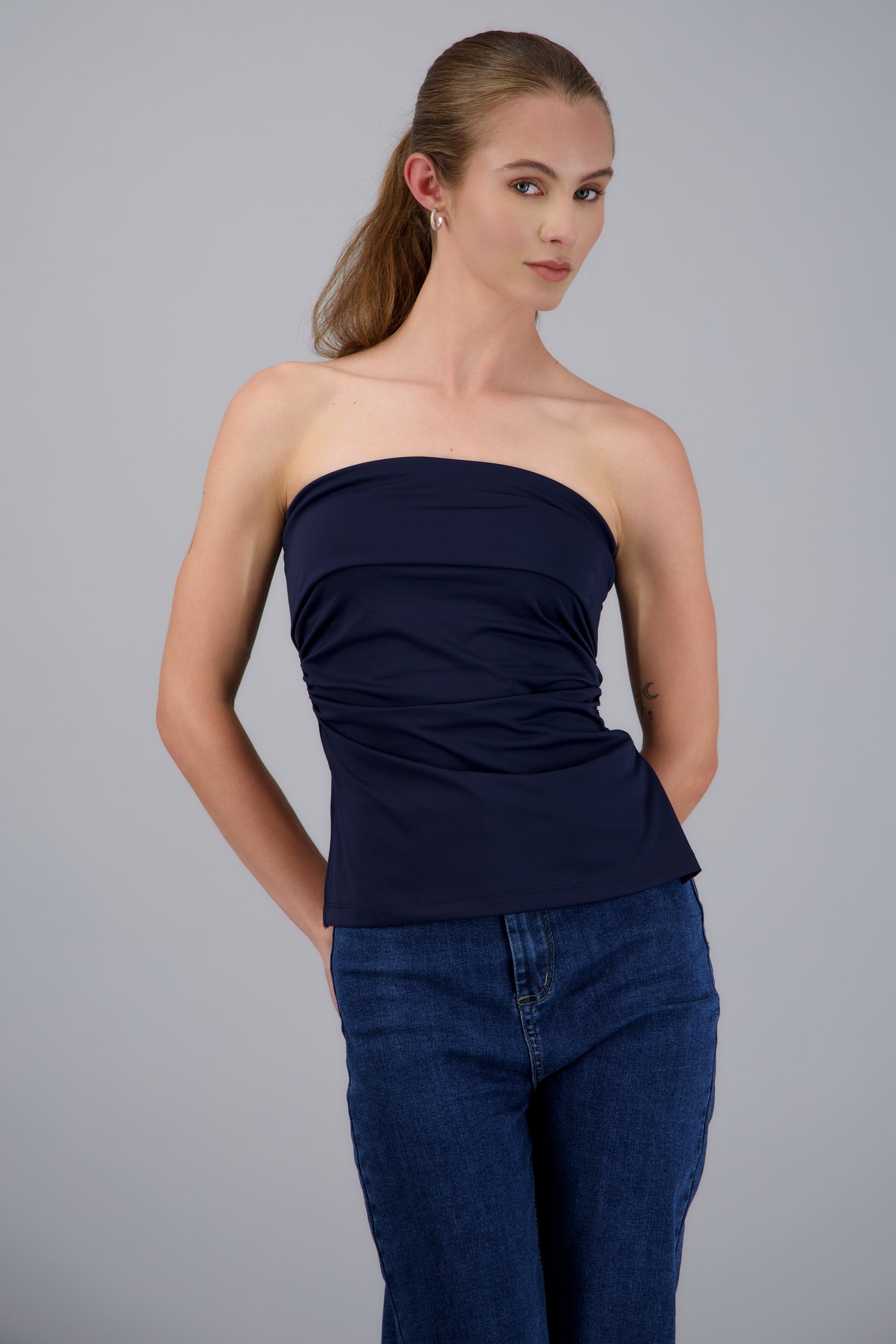 Strapless fitted top with straight neckline and double detail.