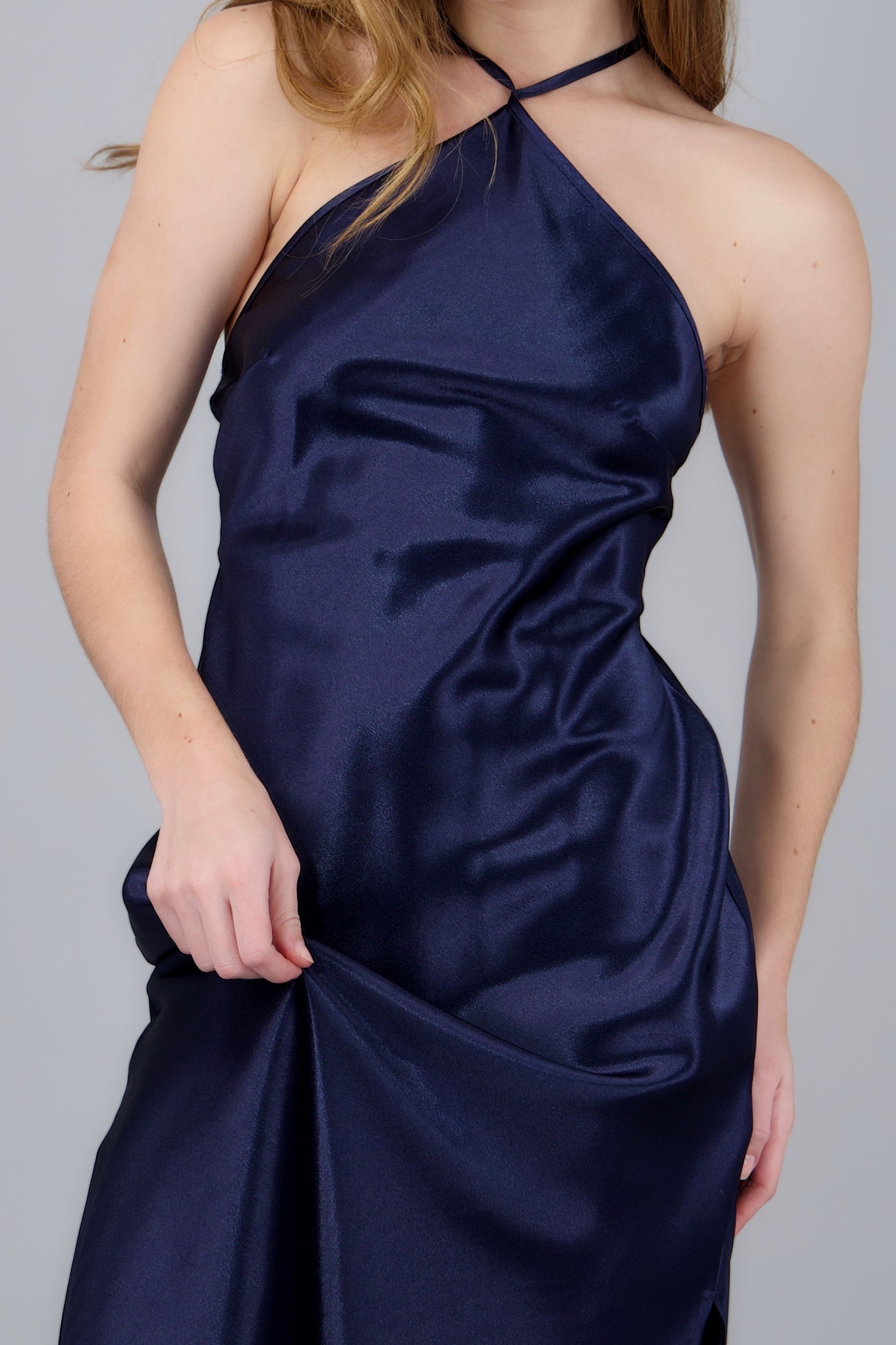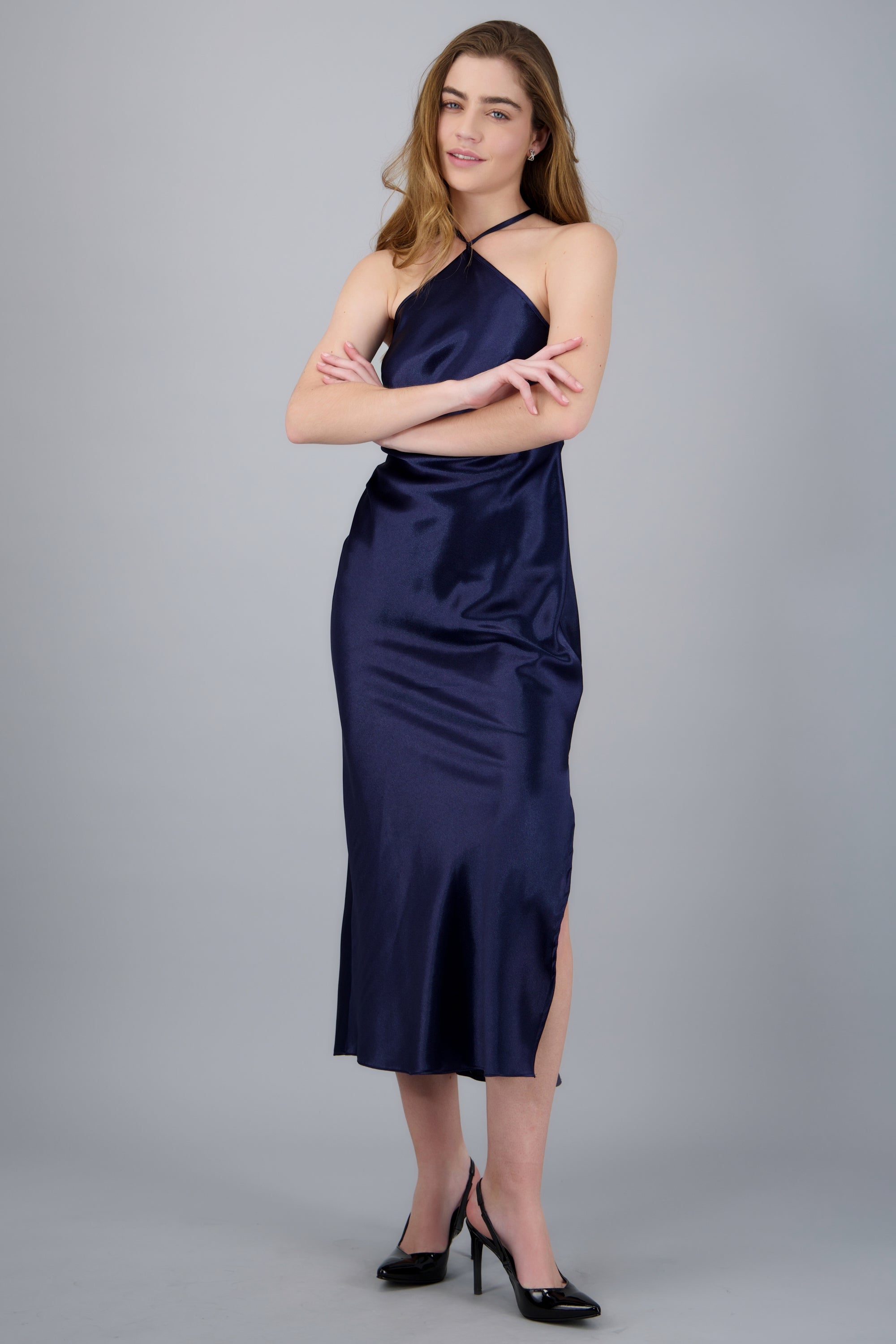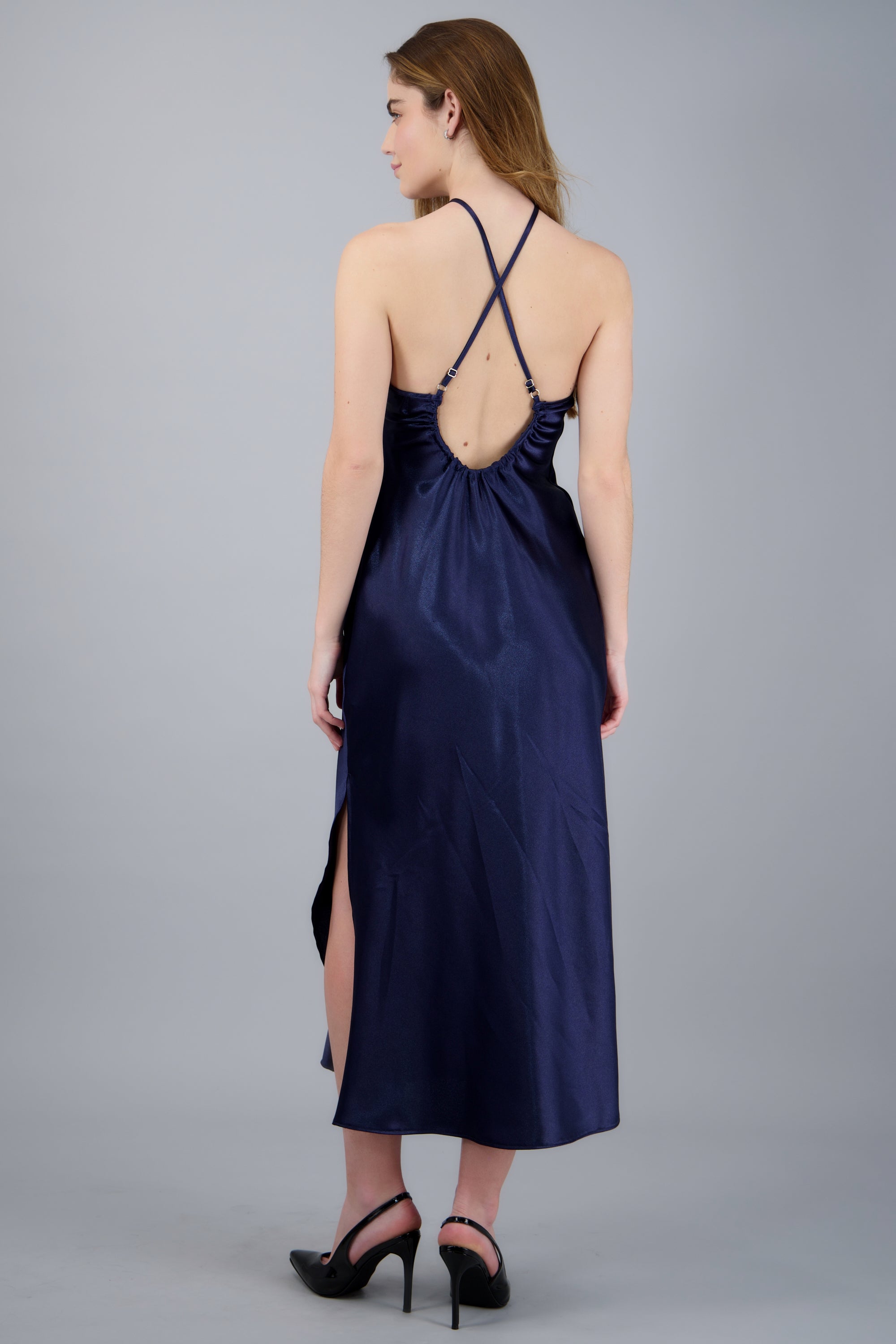 satin halter midi dress with crisscross back