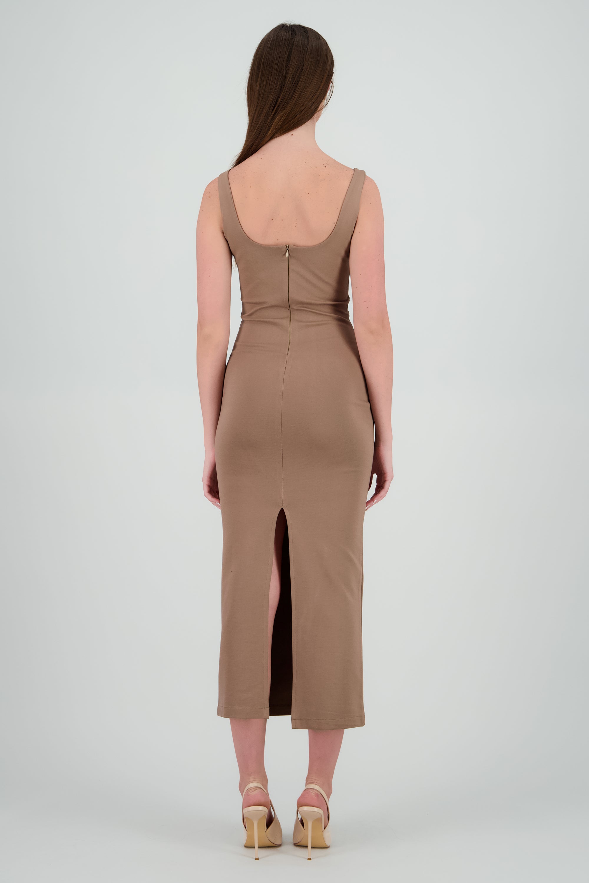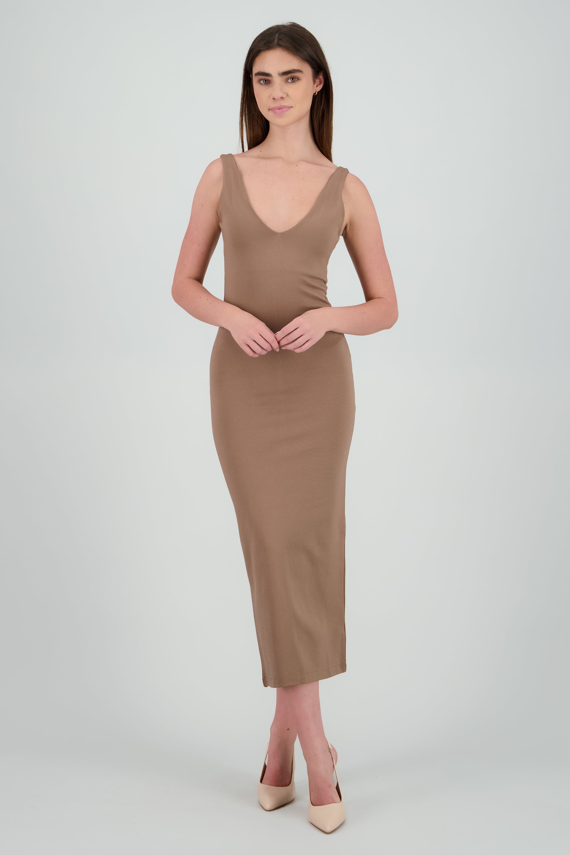 Maxi bodycon dress, V-neck, fitted cut, chic and minimalist design.
