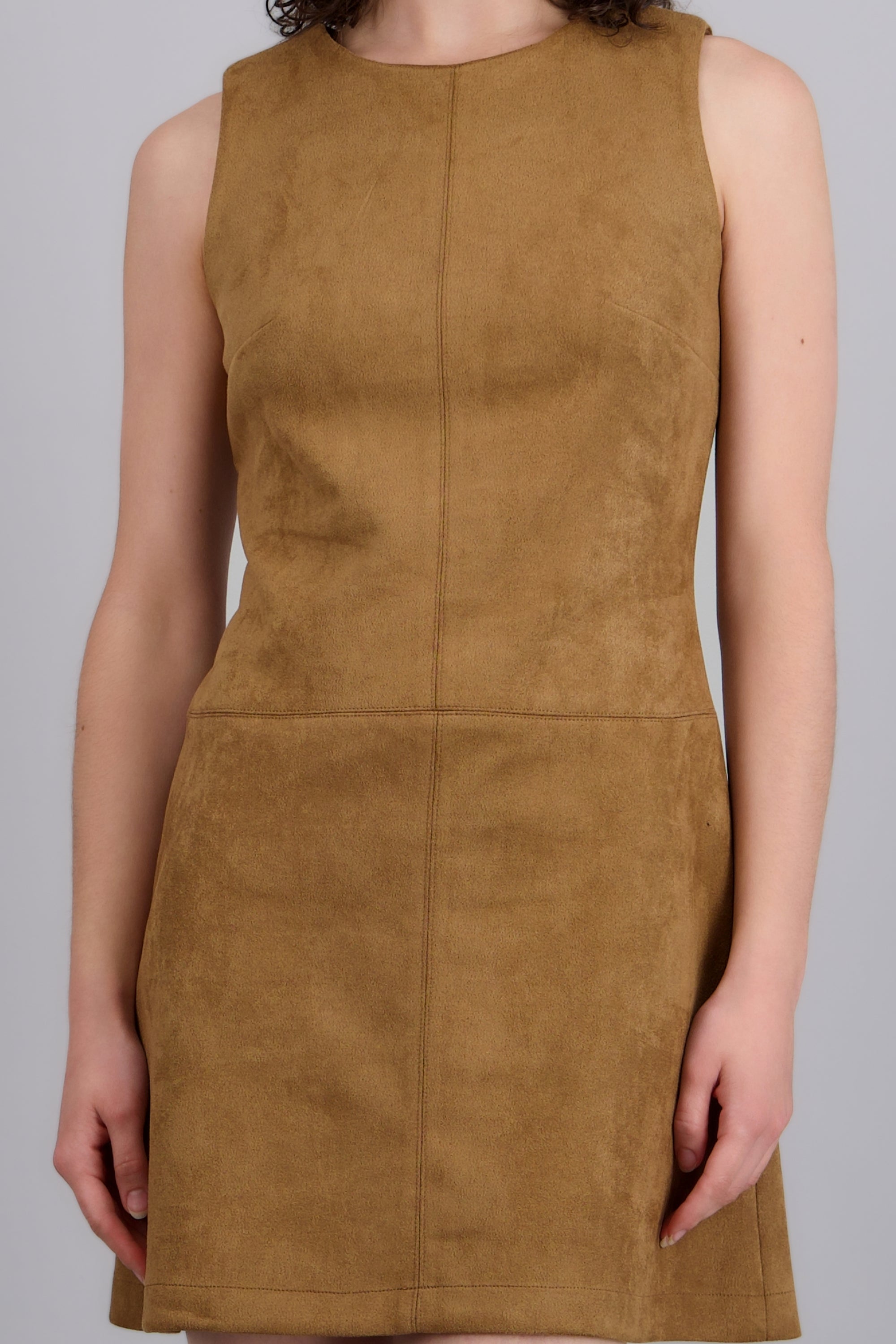 Vestido mini en suede con cortes decorativos, corte ajustado y acabado suave.