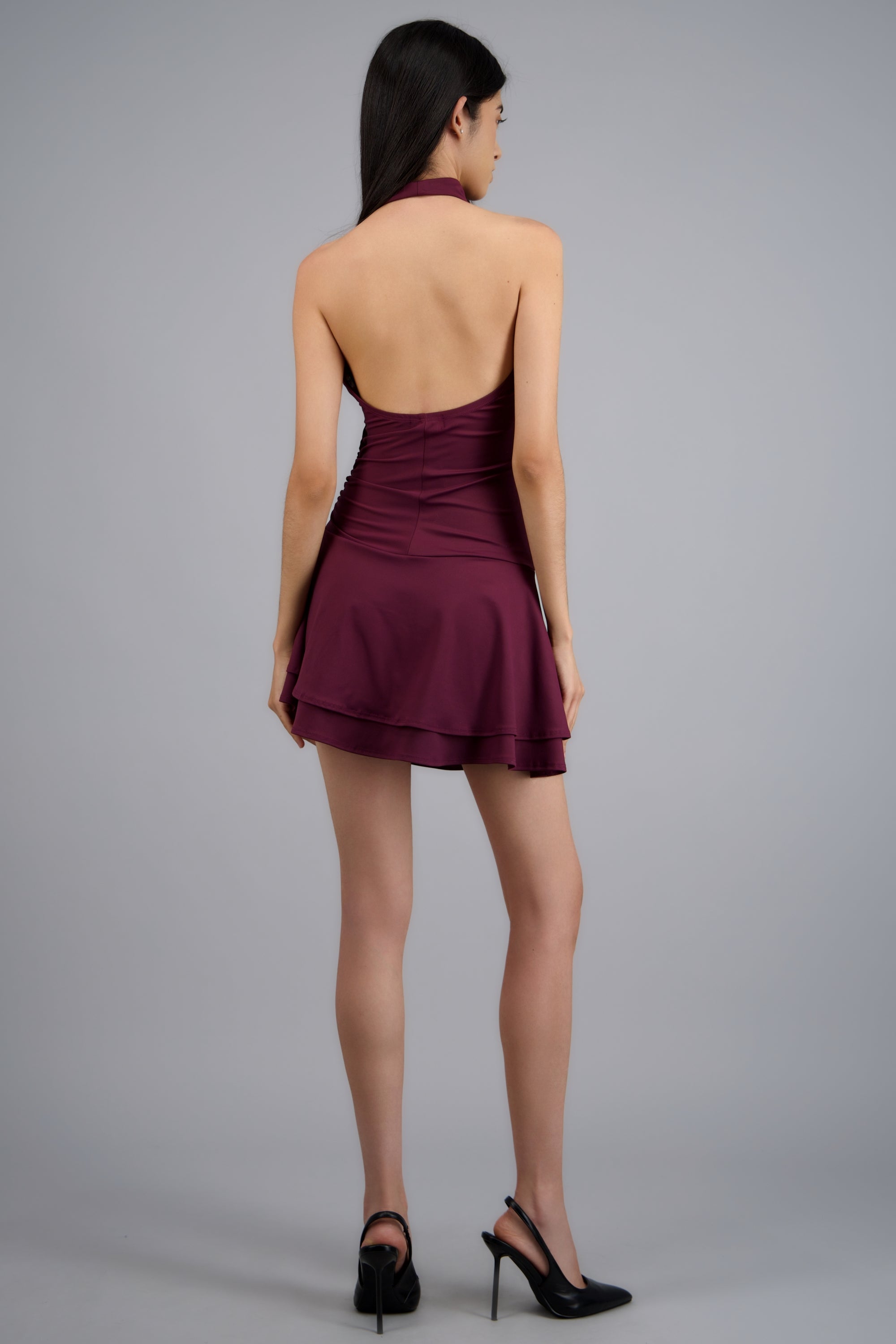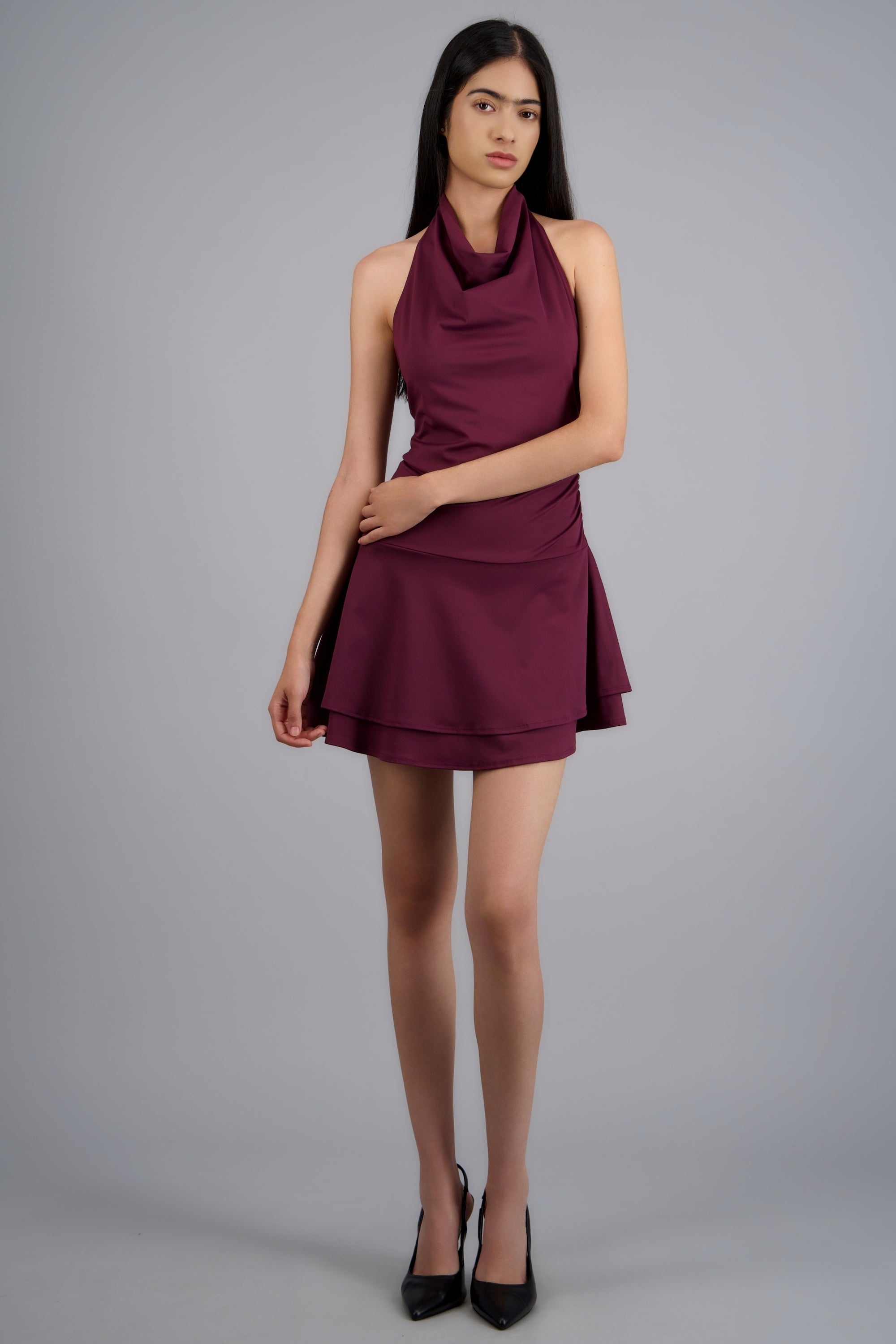 Mini vestido sin mangas con escote en cascada y corte ajustado.