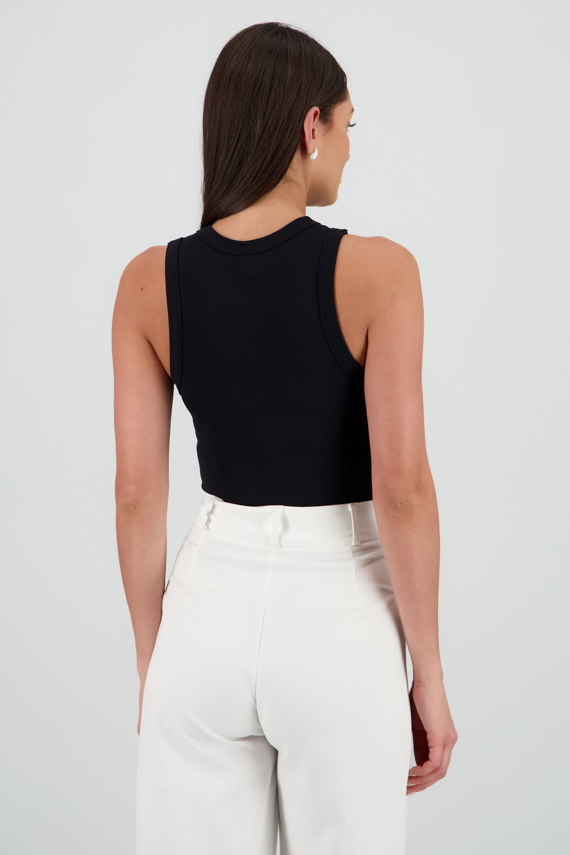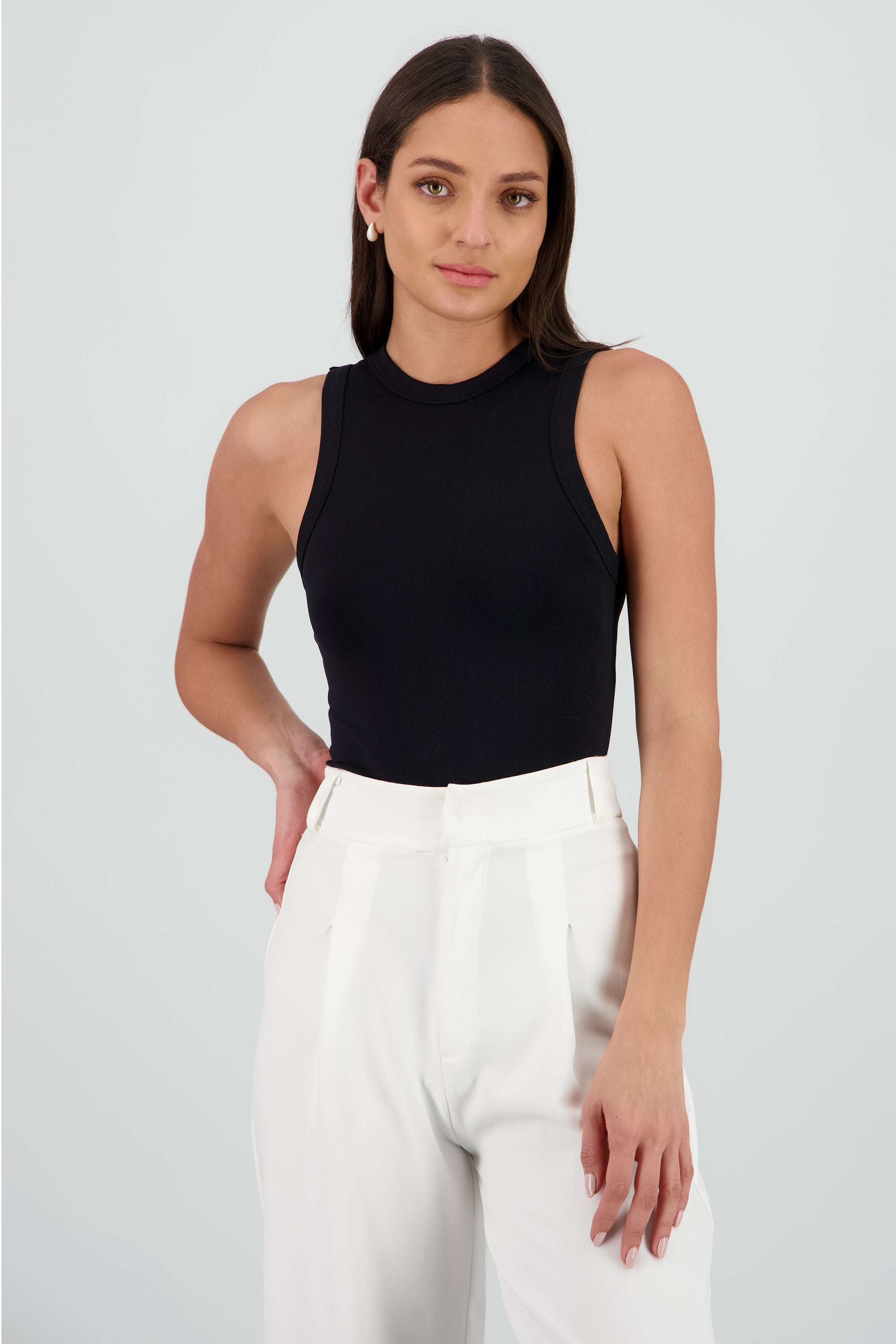 Bodysuit sin mangas, cuello redondo, corte ajustado. Se cierra con broches en la parte inferior.