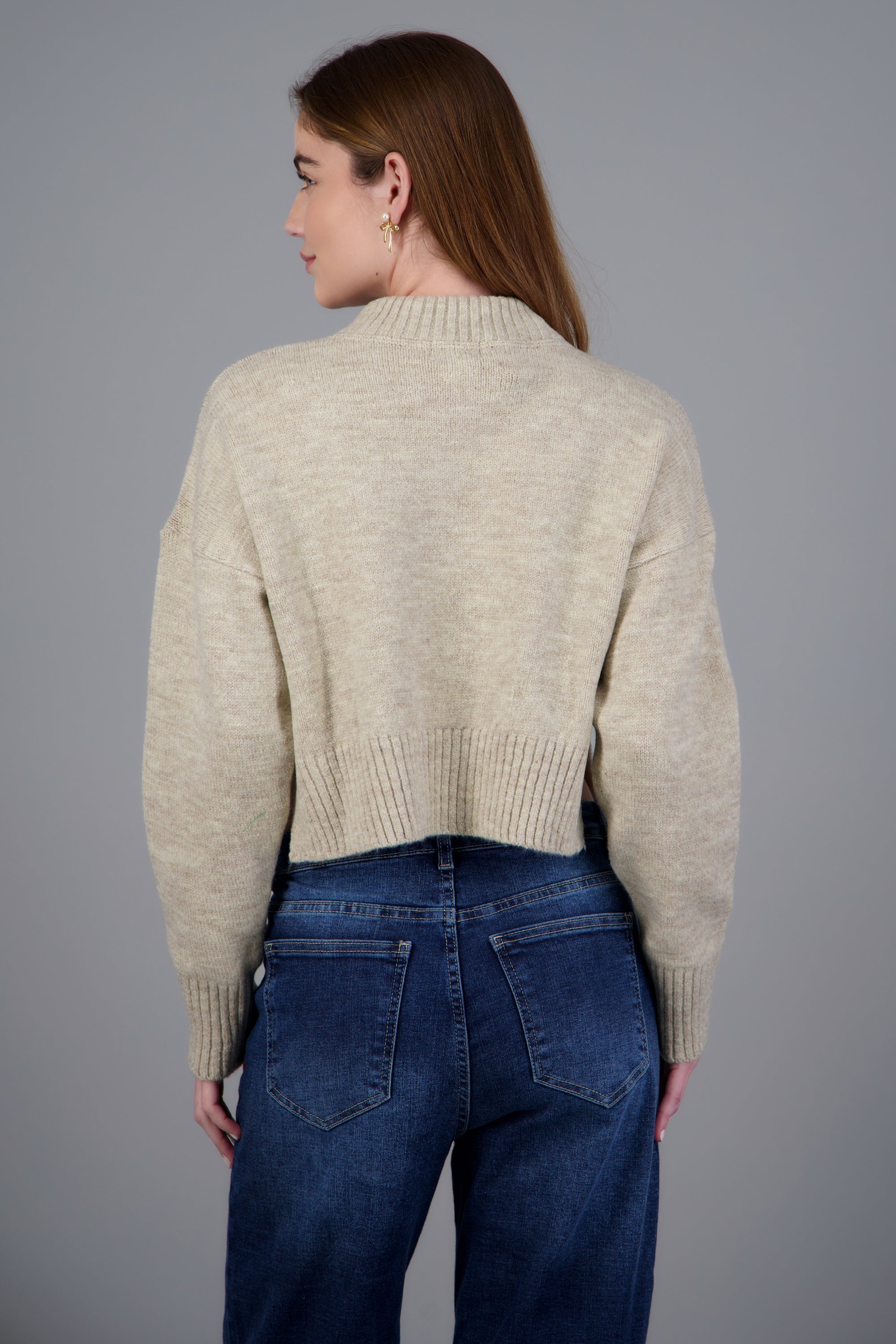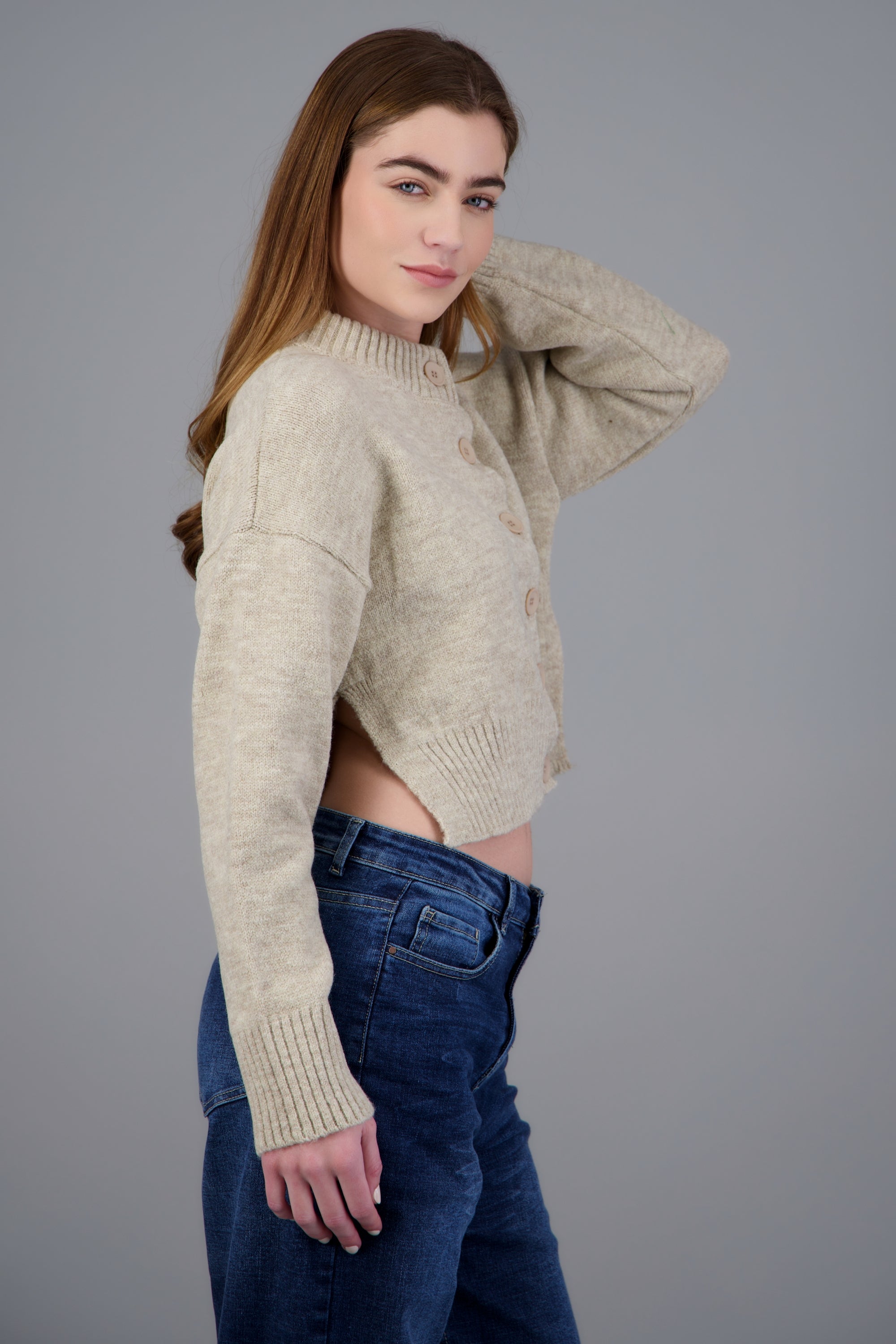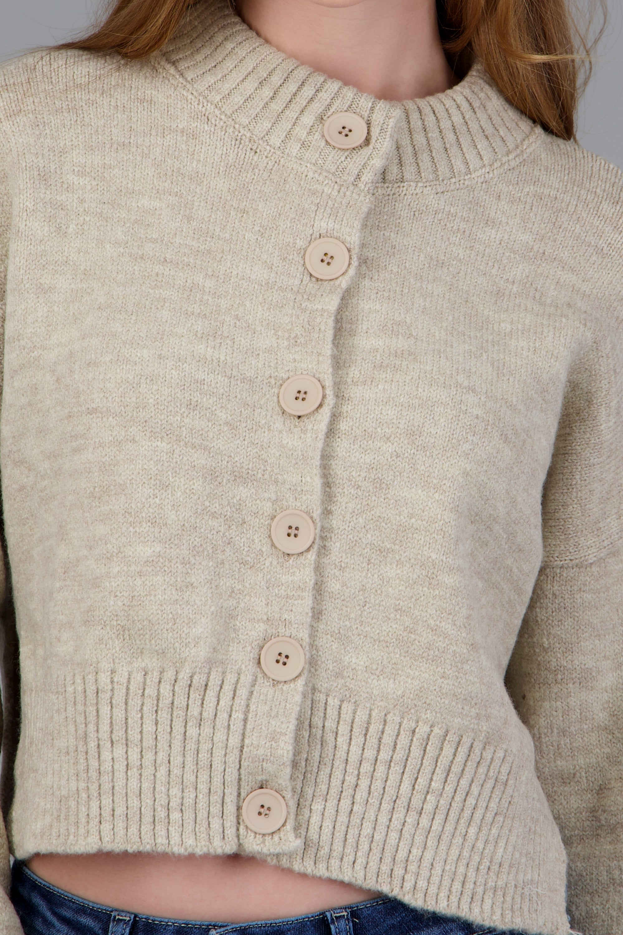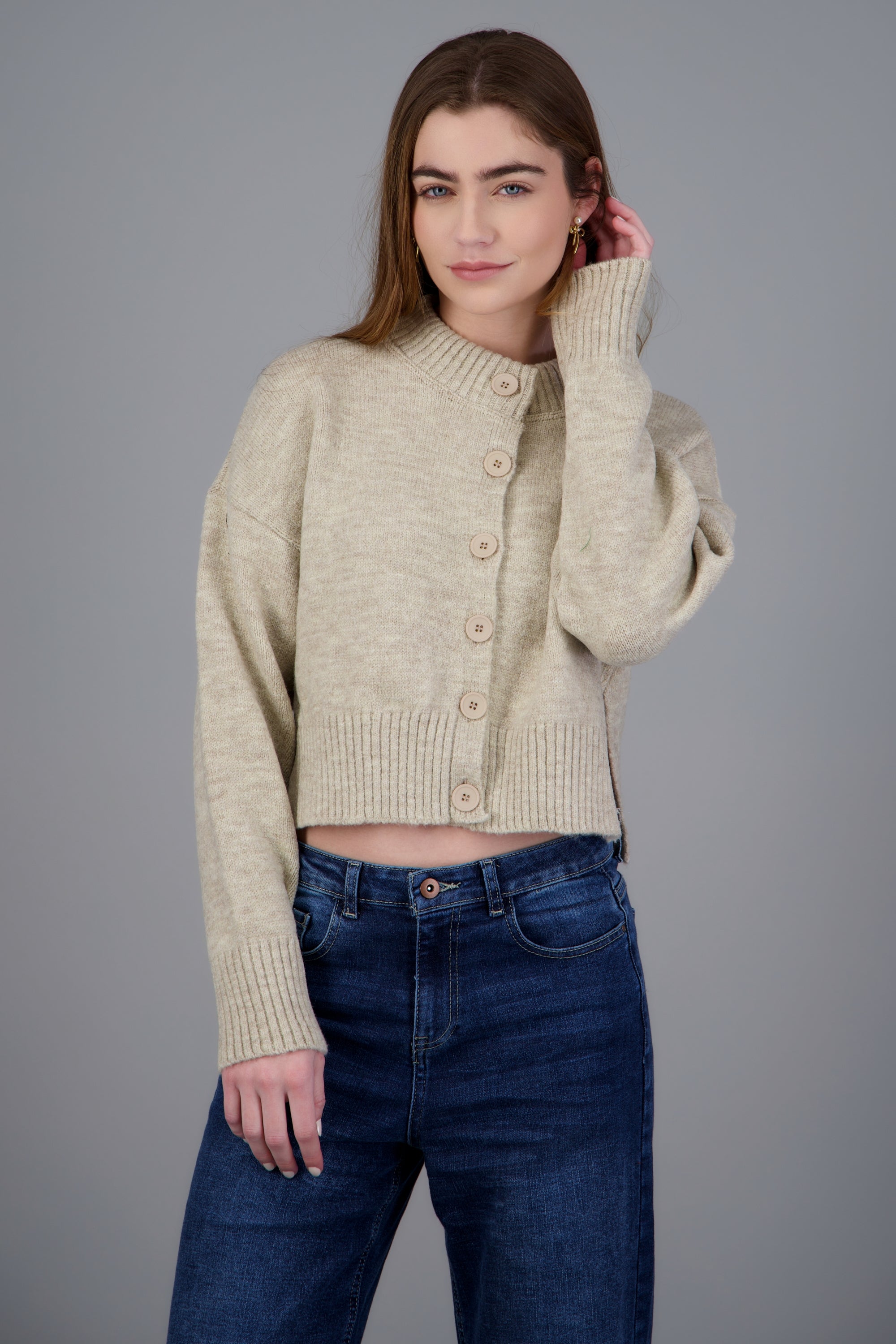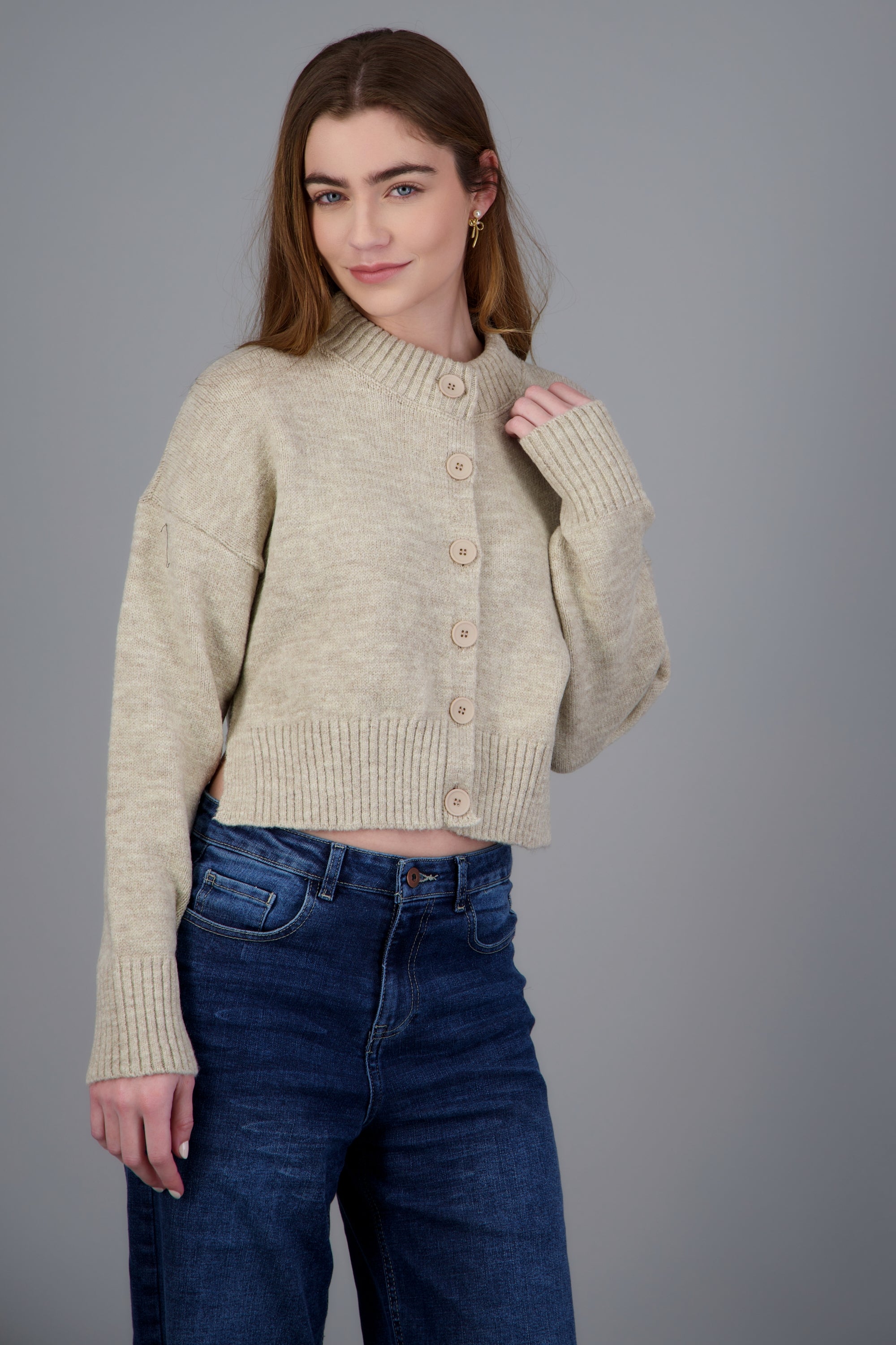 Cardigan de punto, corte recto. Cierre frontal de botones, manga larga y detalles de costura visibles.