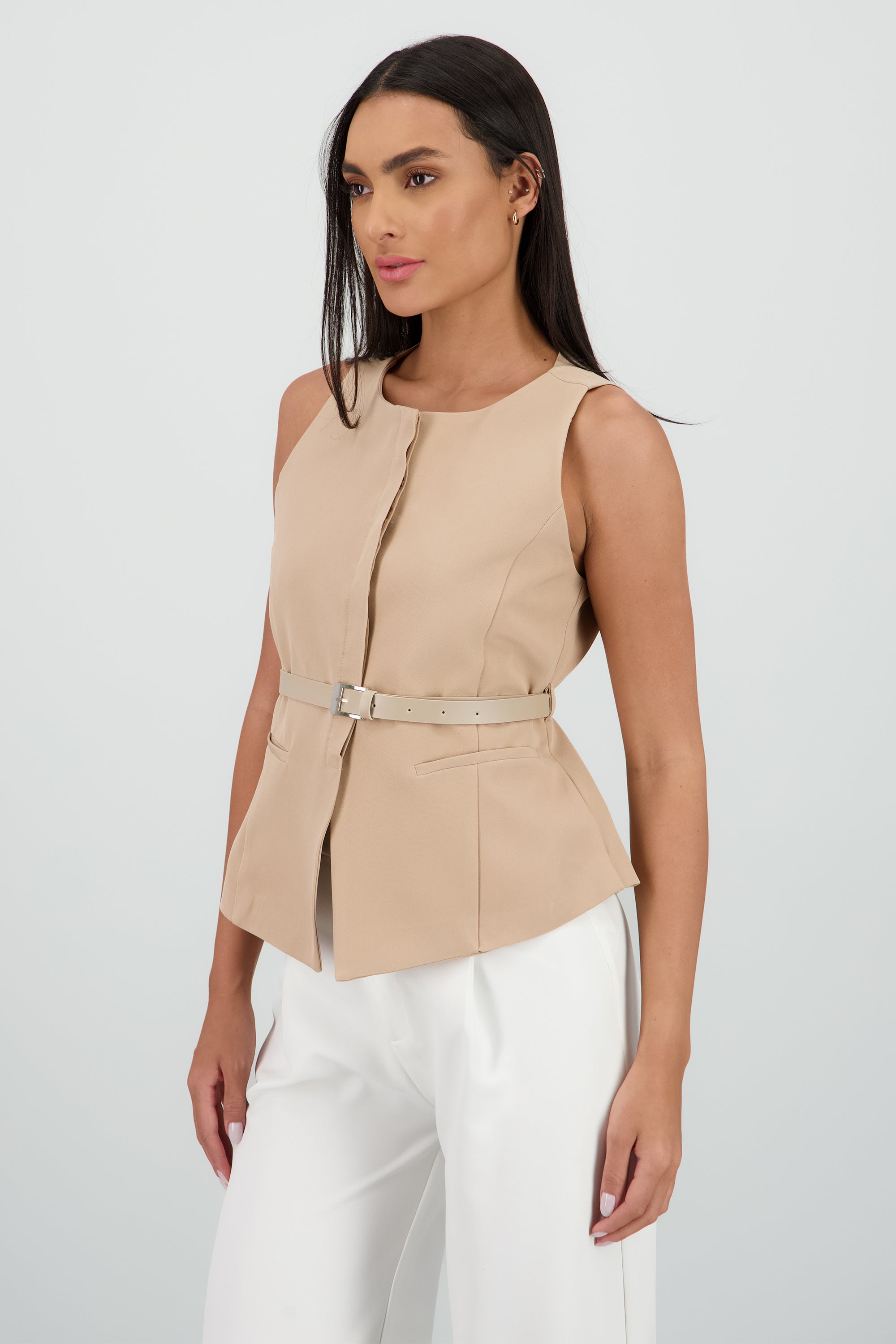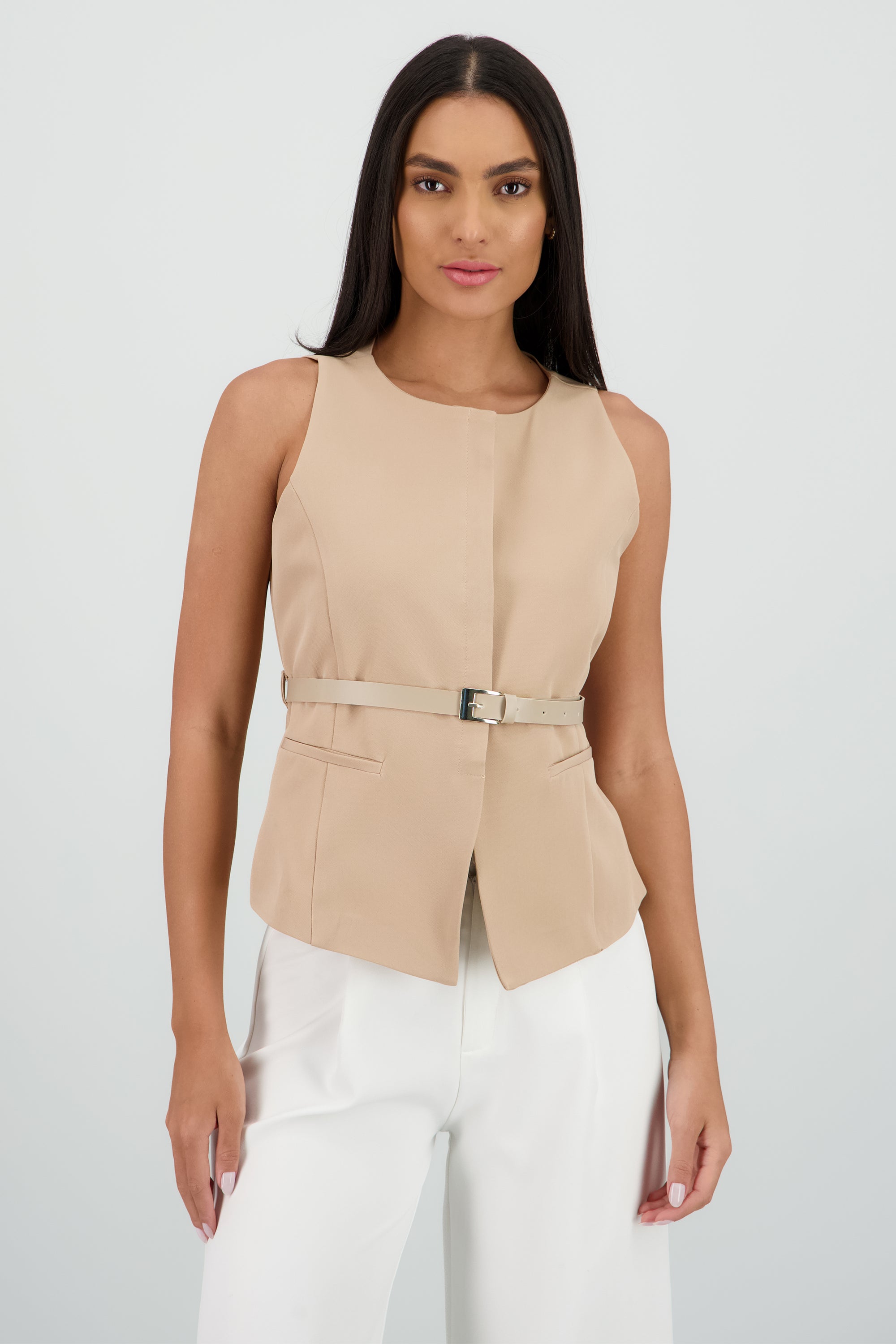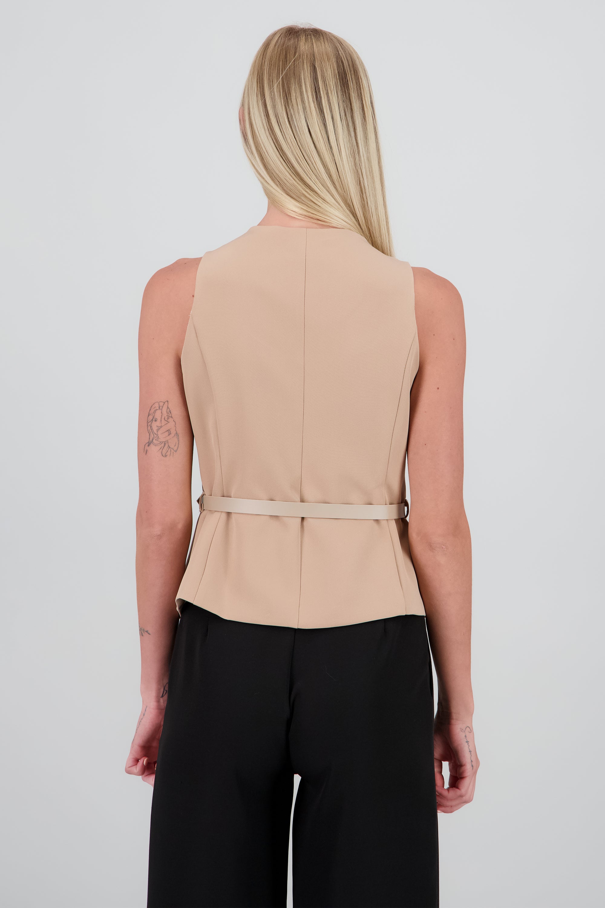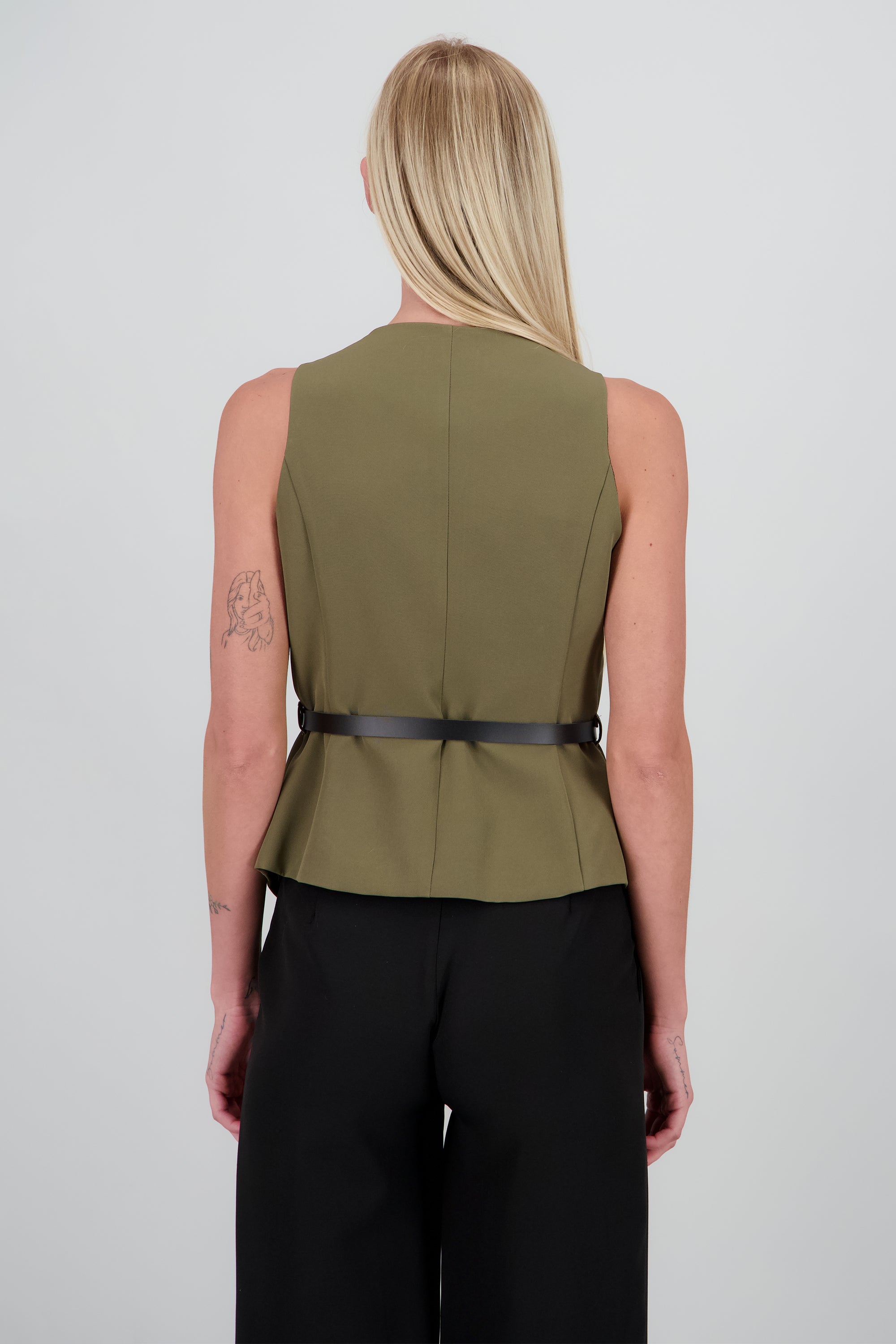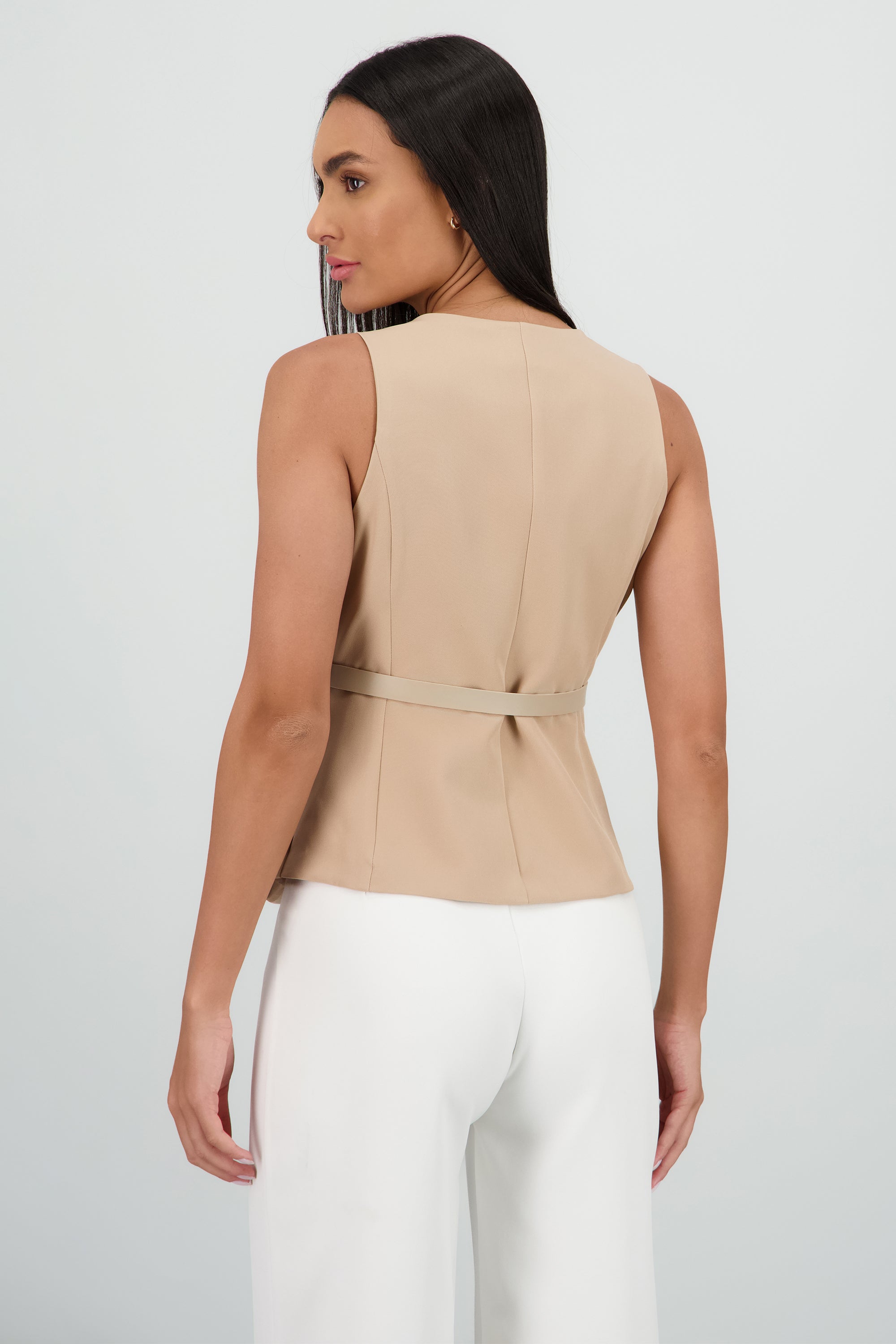 Chaleco con cinturón ajustable, corte entallado y detalles de costura.