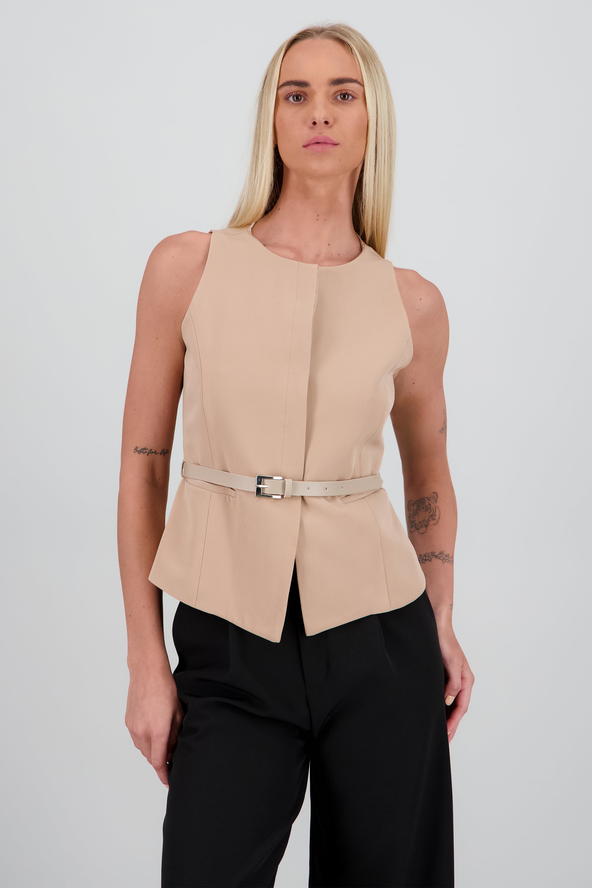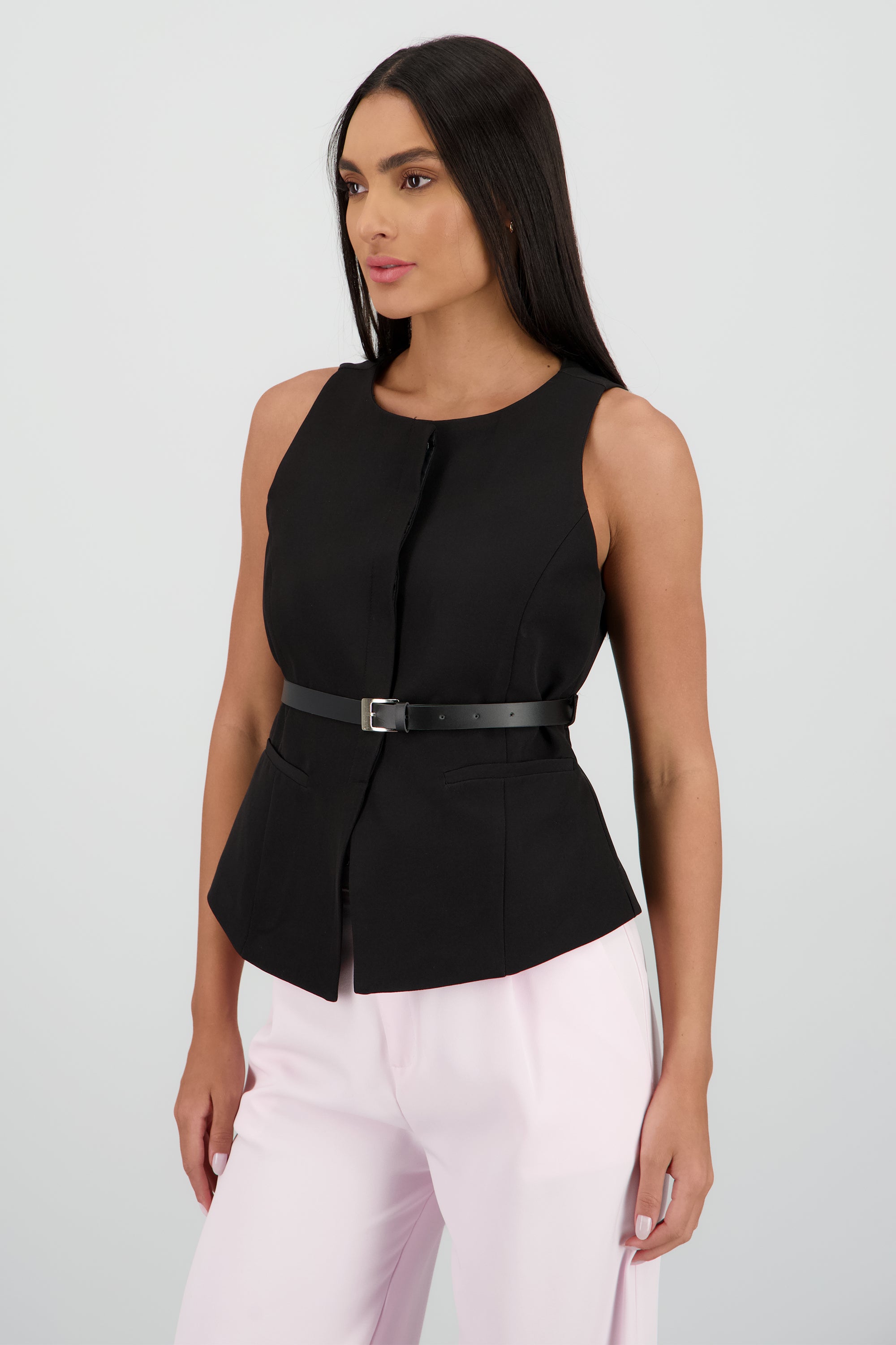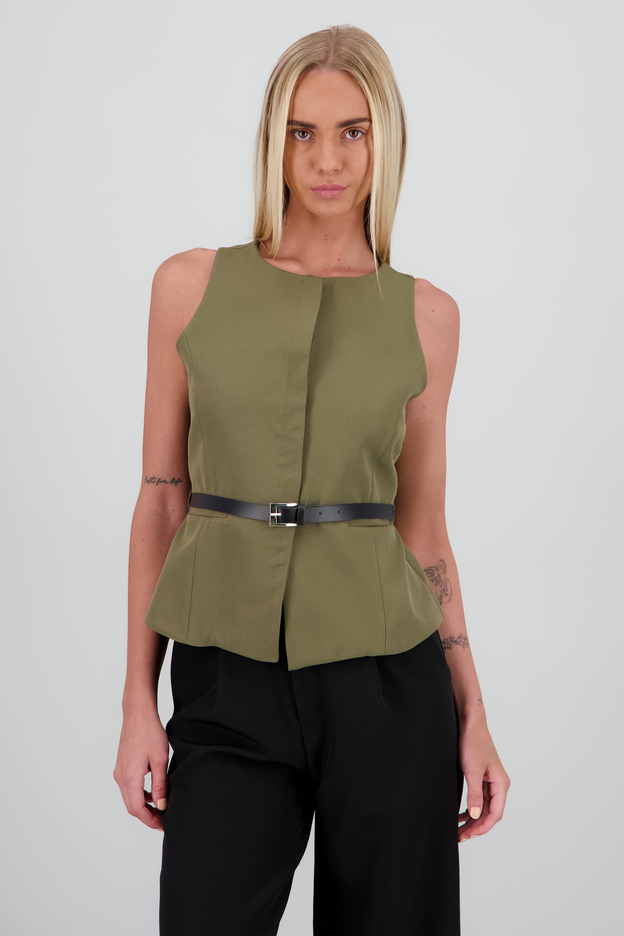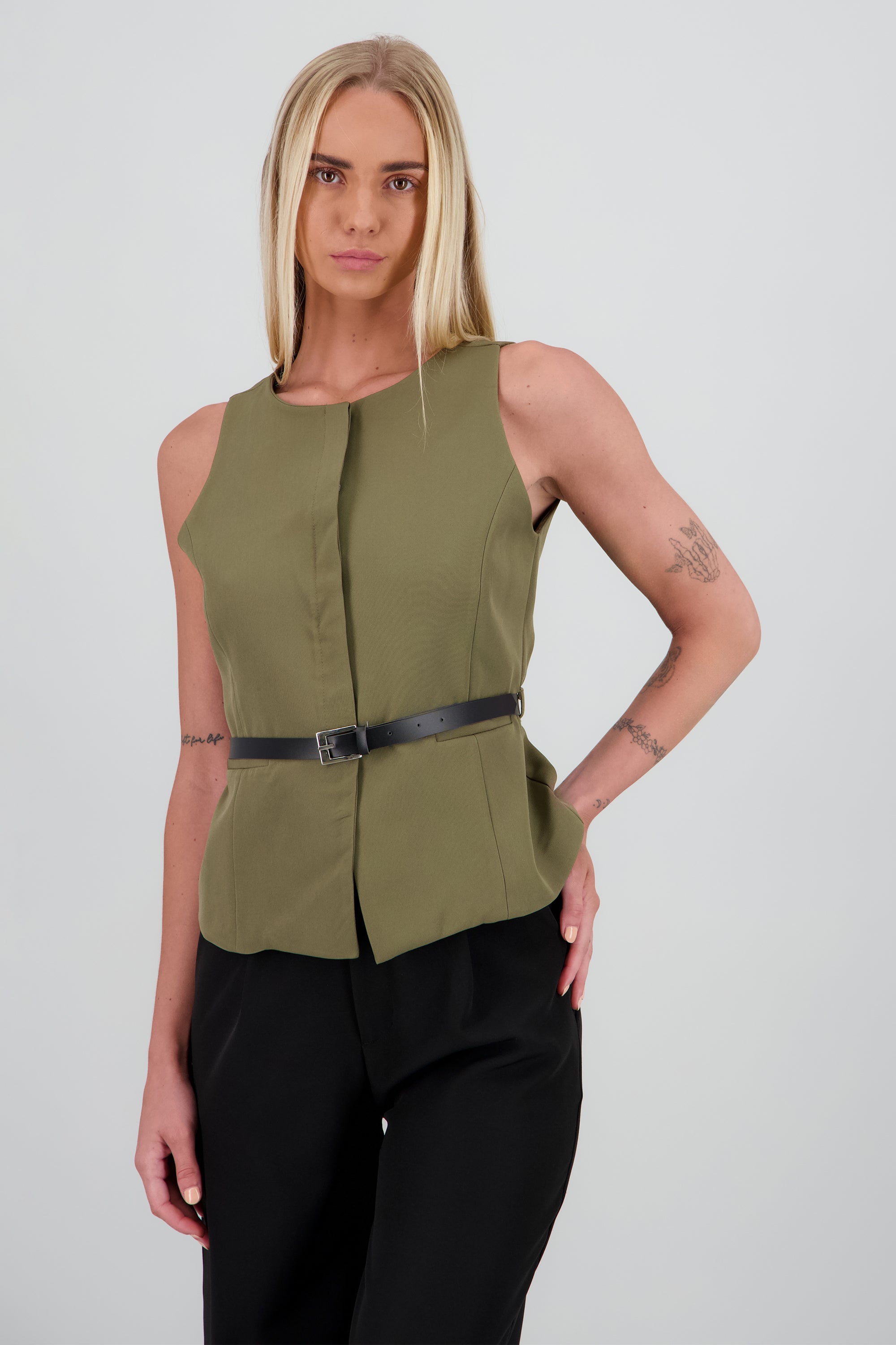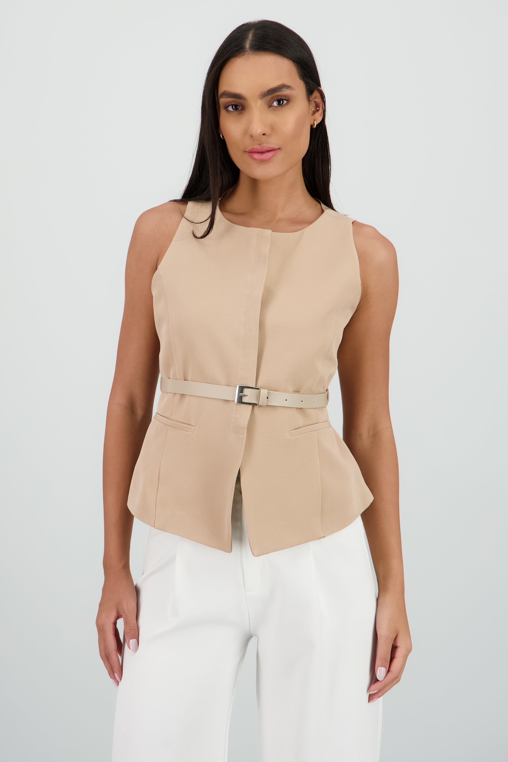 Chaleco con cinturón ajustable, corte entallado y detalles de costura.