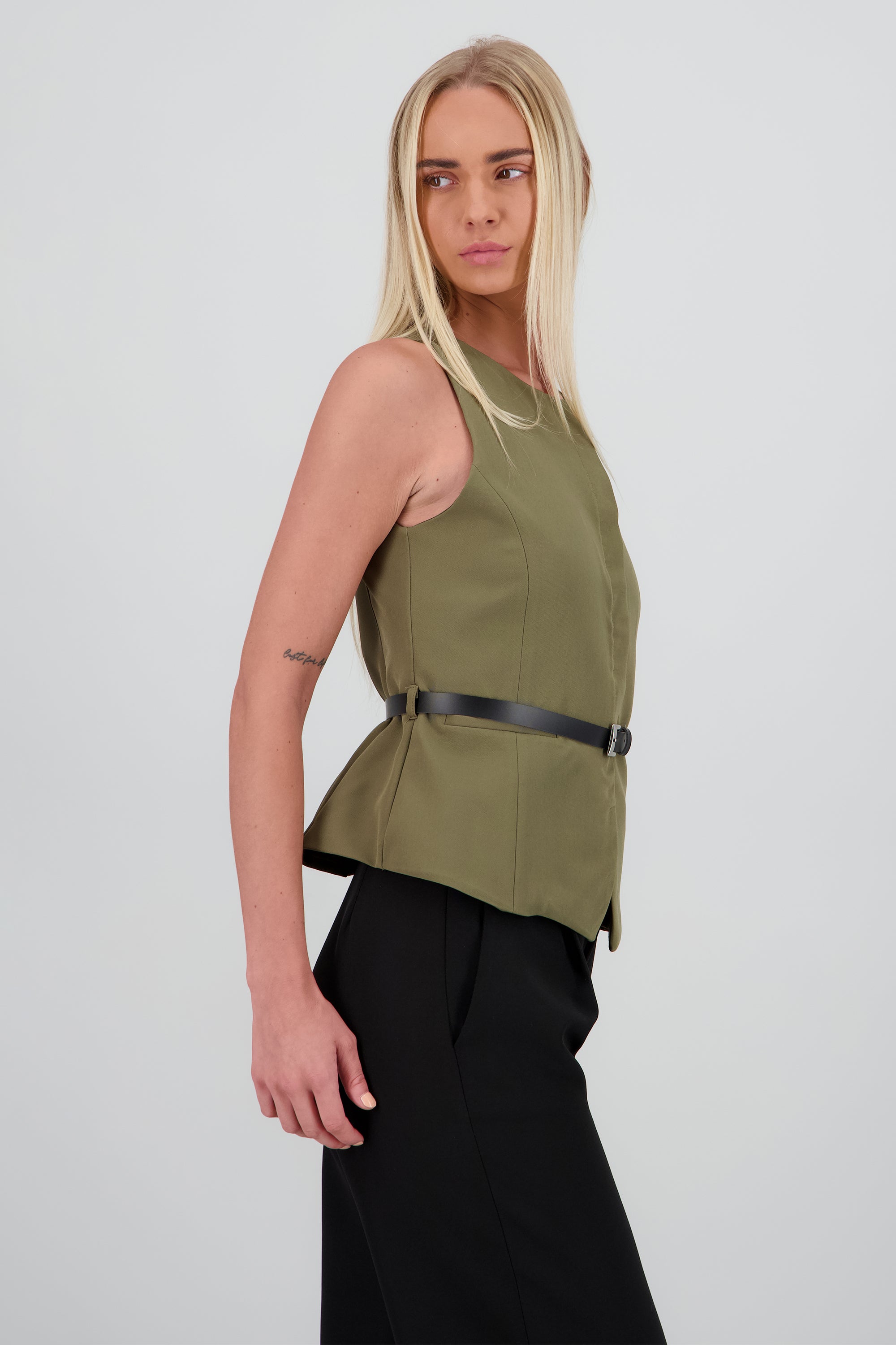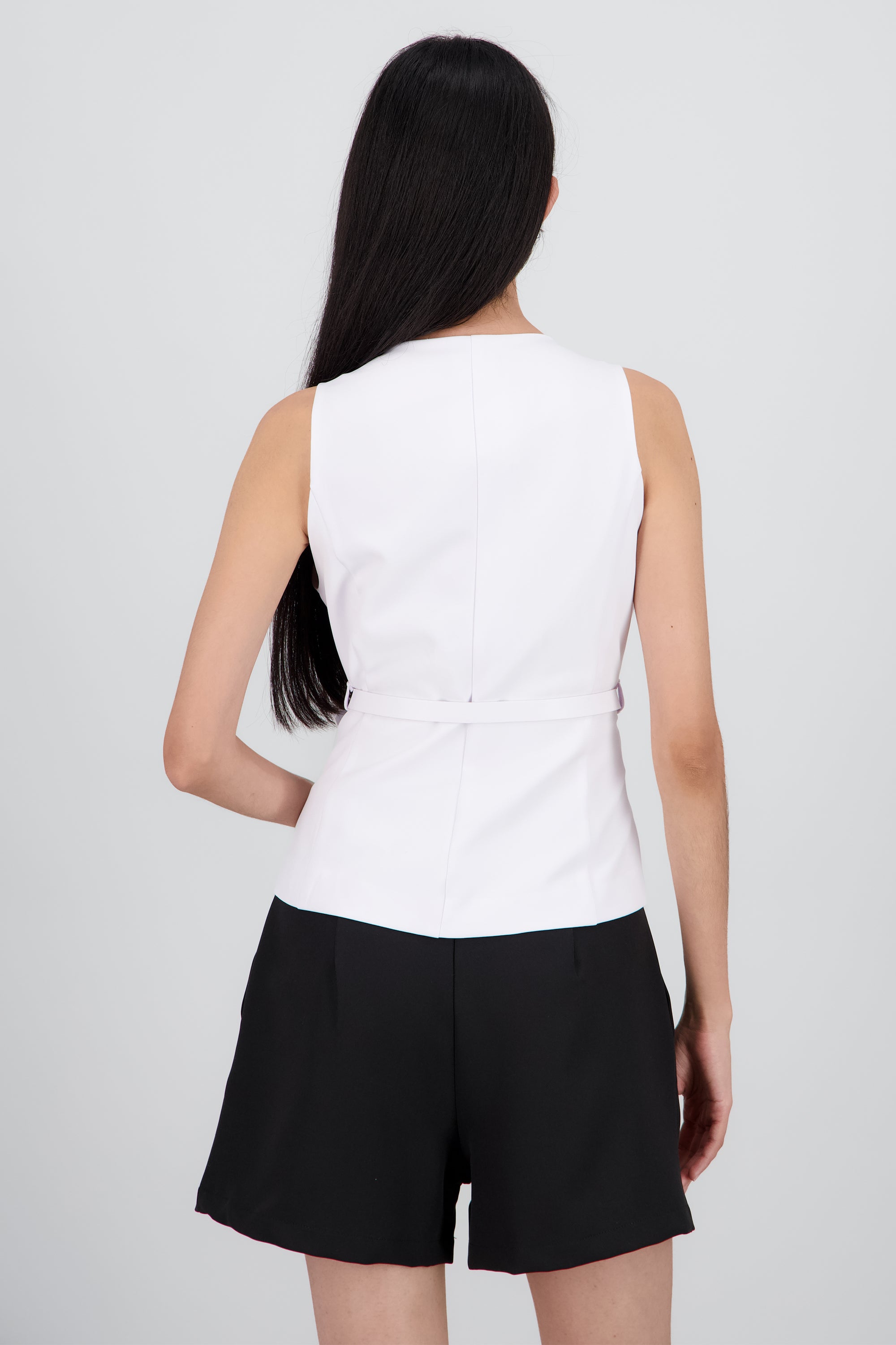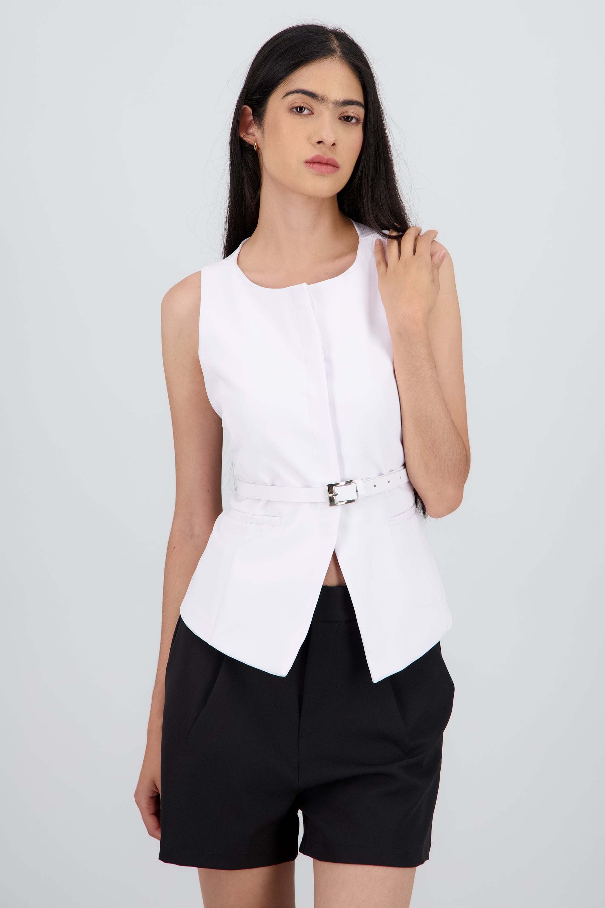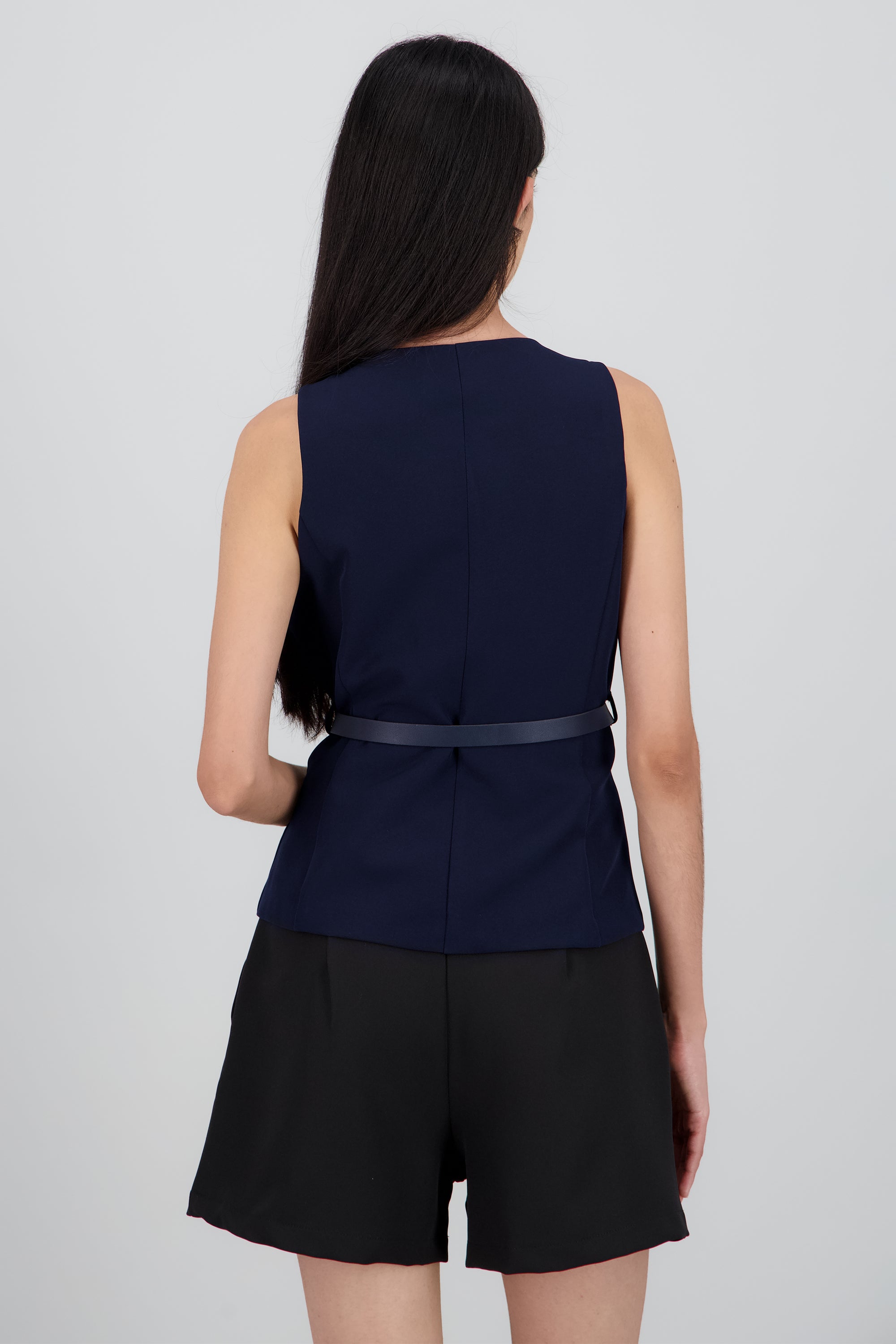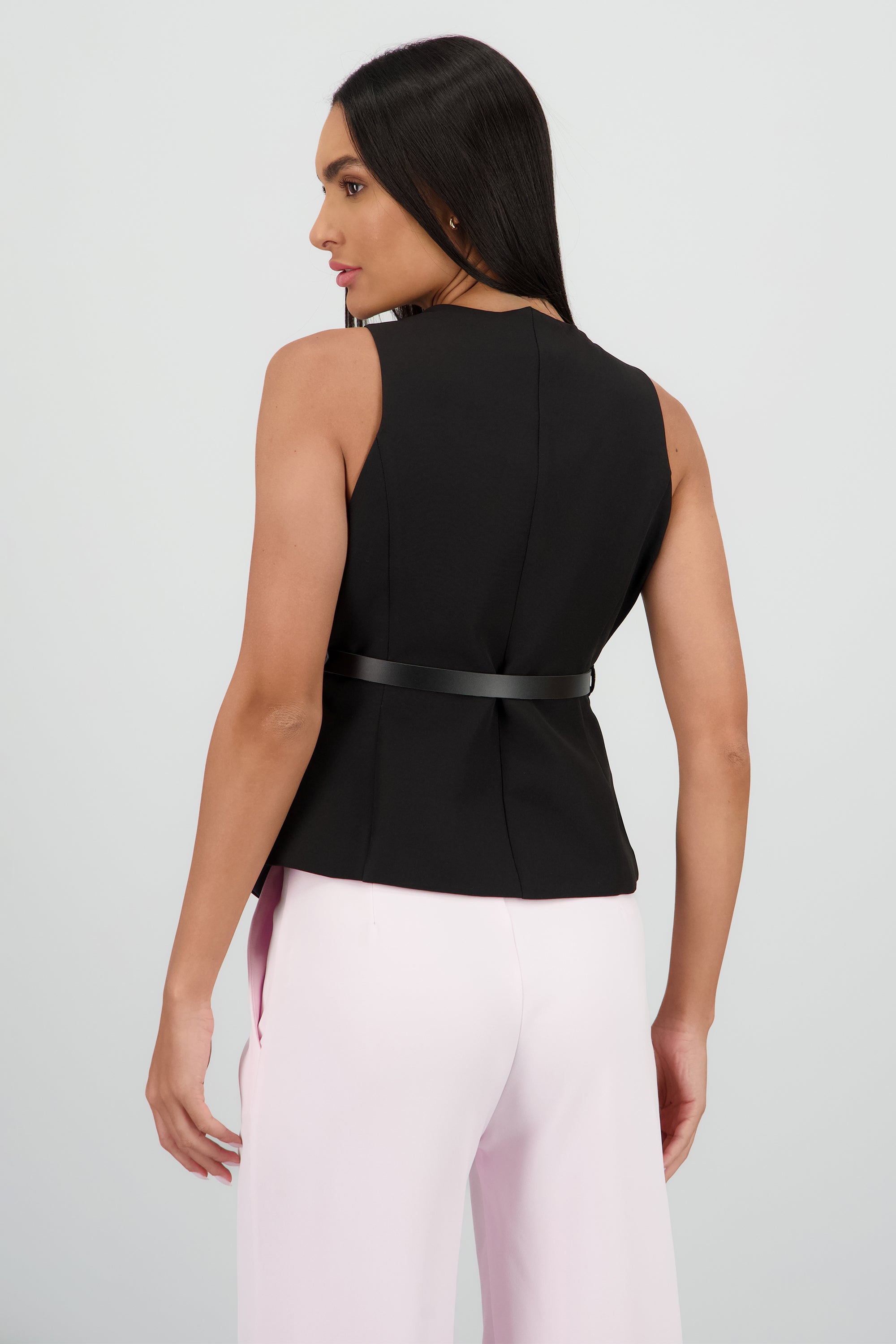 Chaleco con cinturón ajustable, corte entallado y detalles de costura.