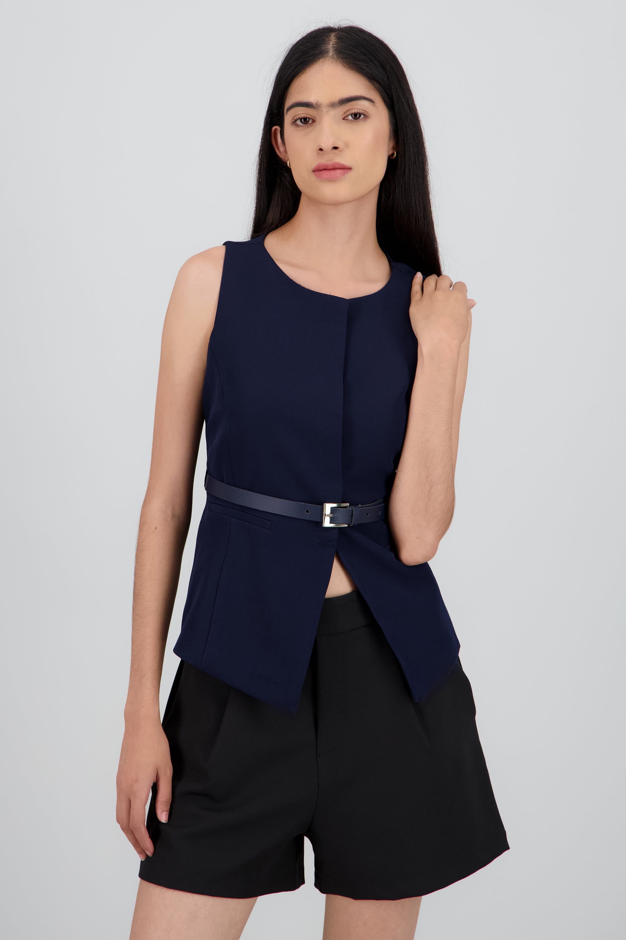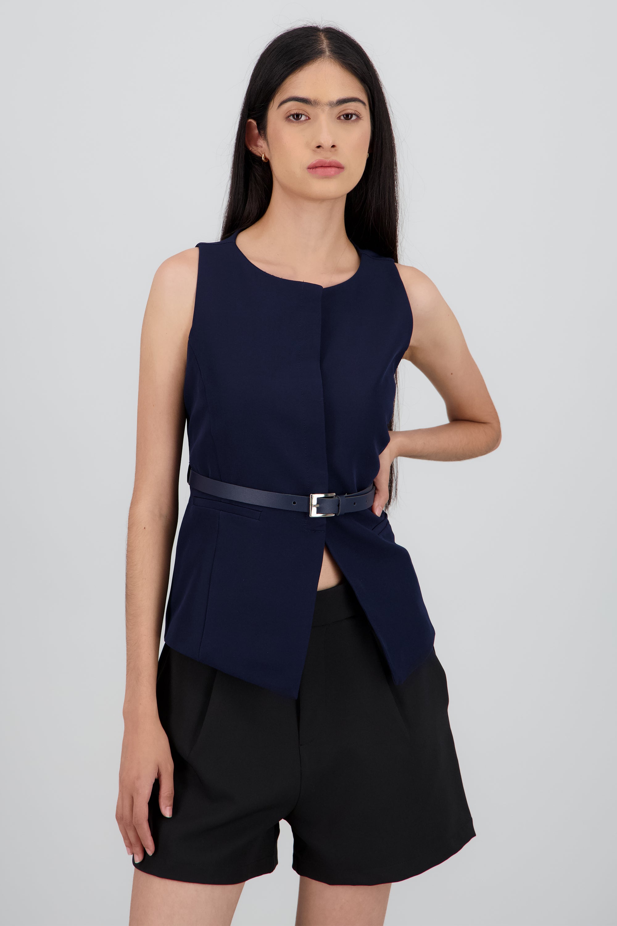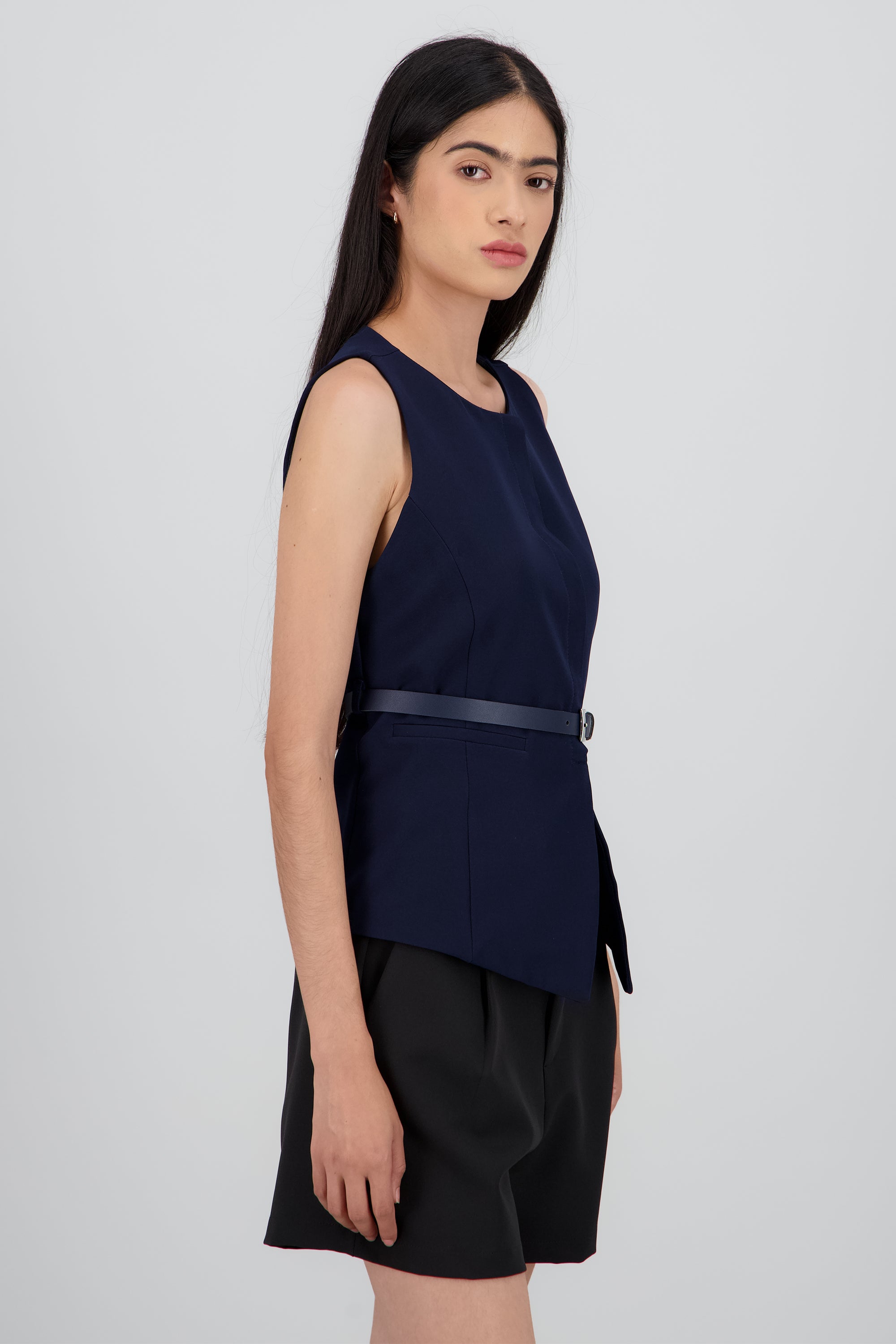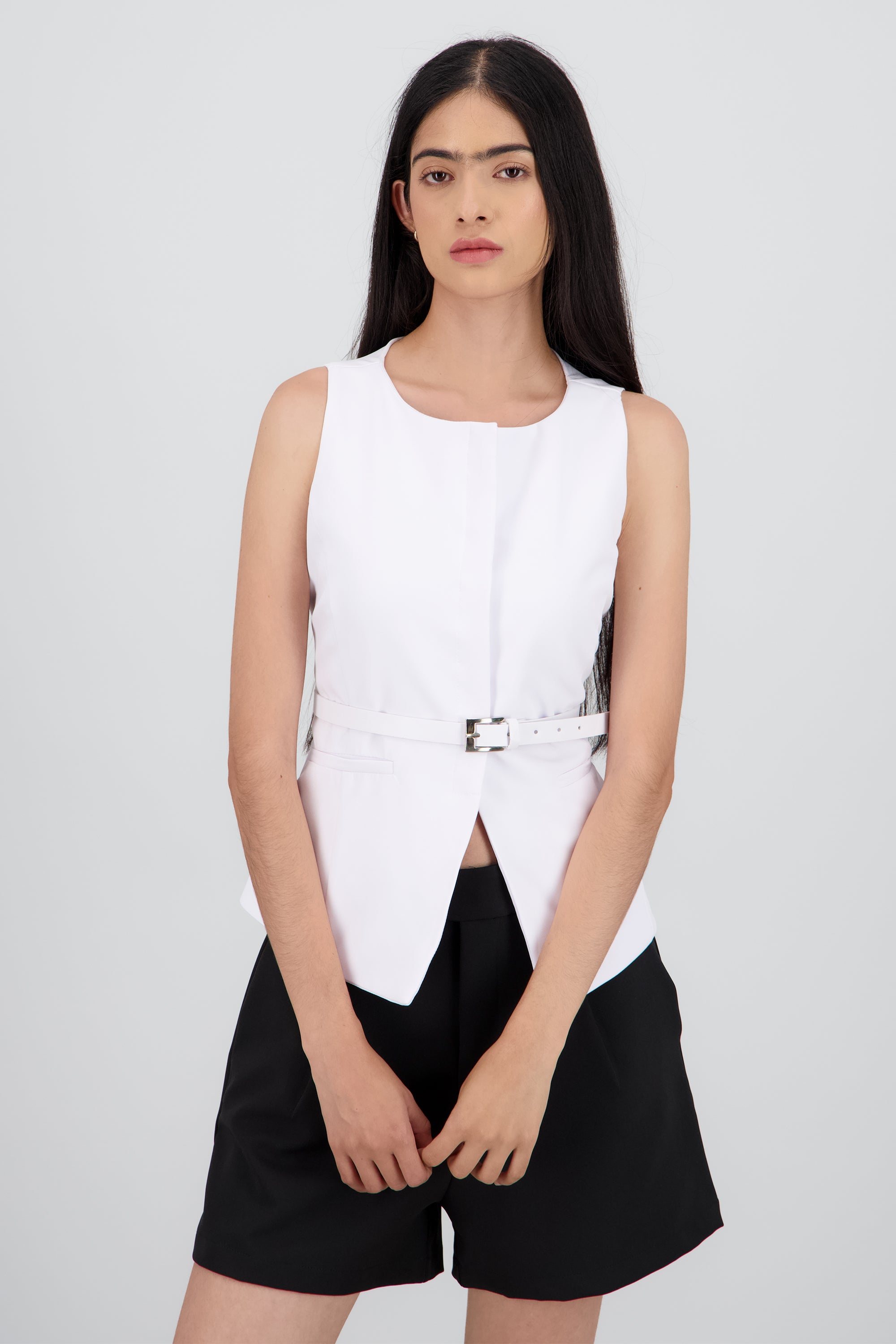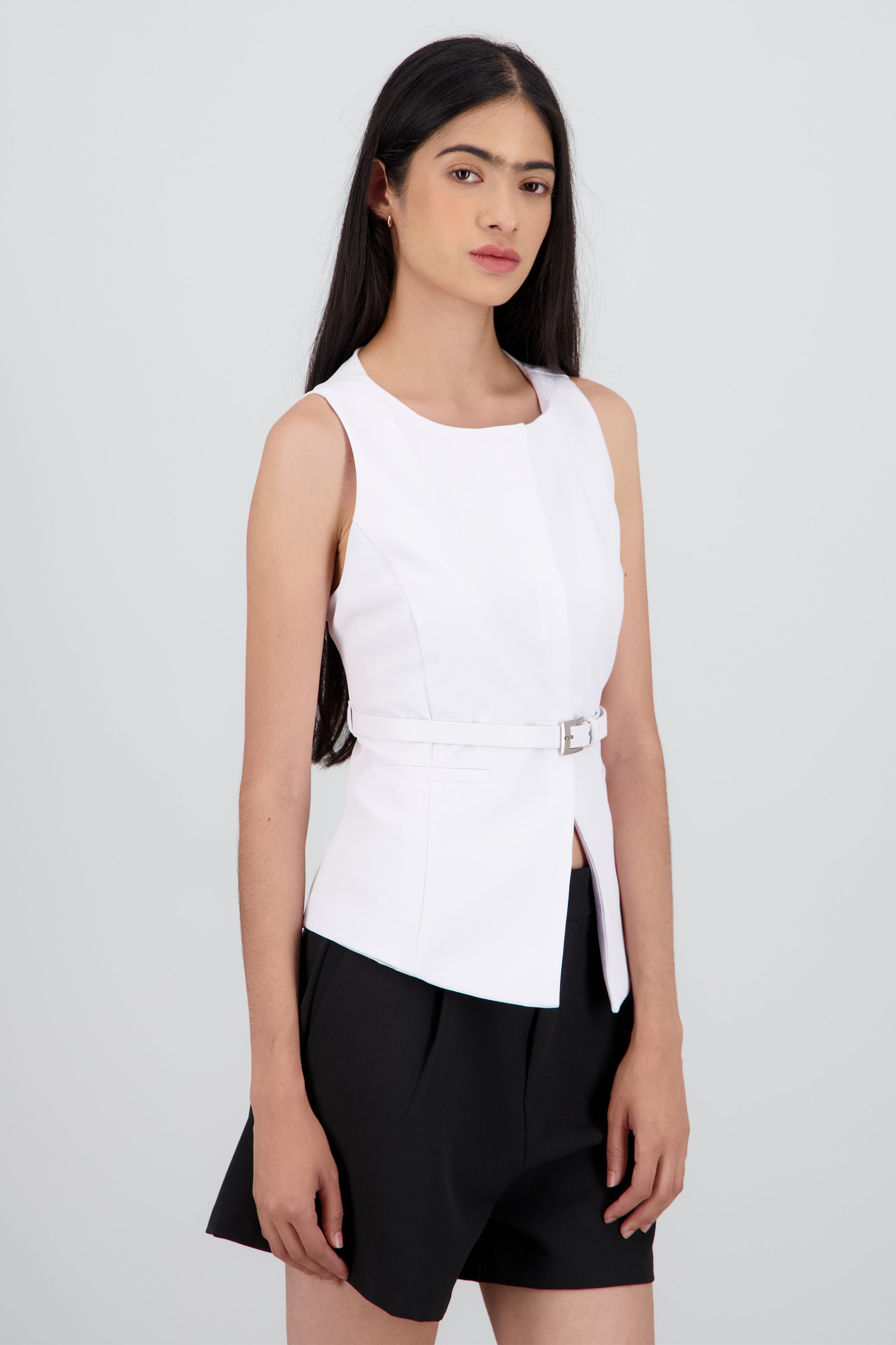 Chaleco con cinturón ajustable, corte entallado y detalles de costura.