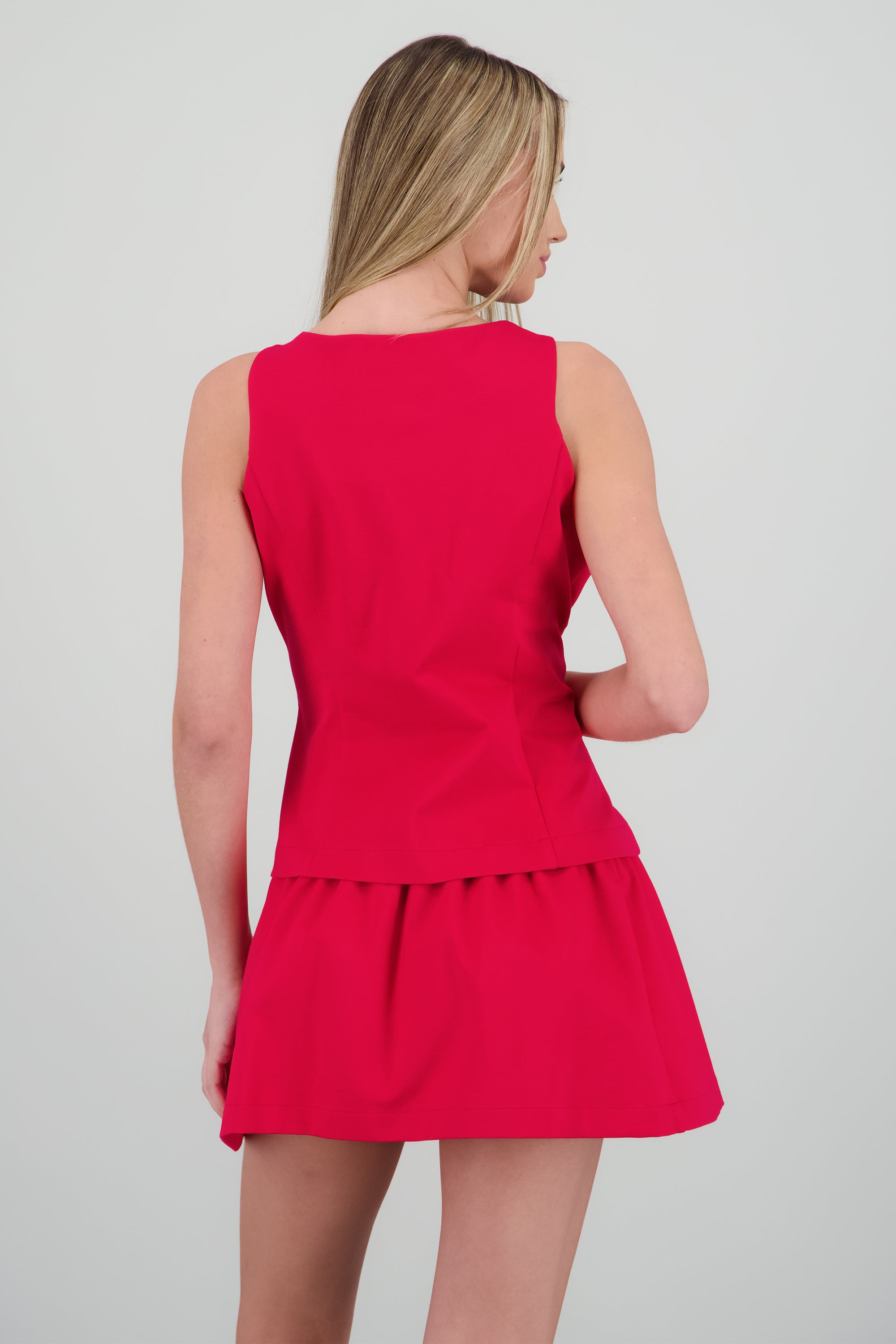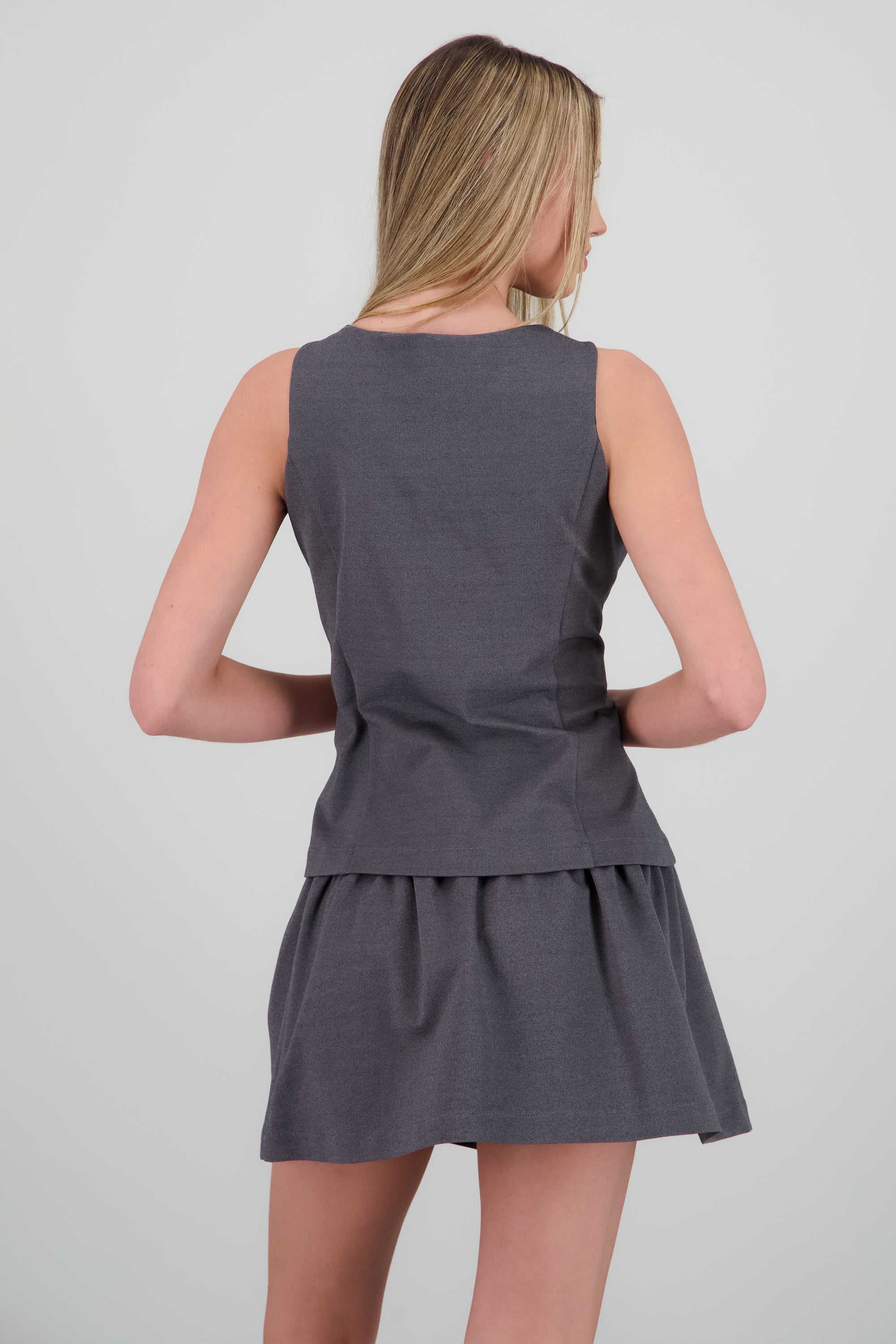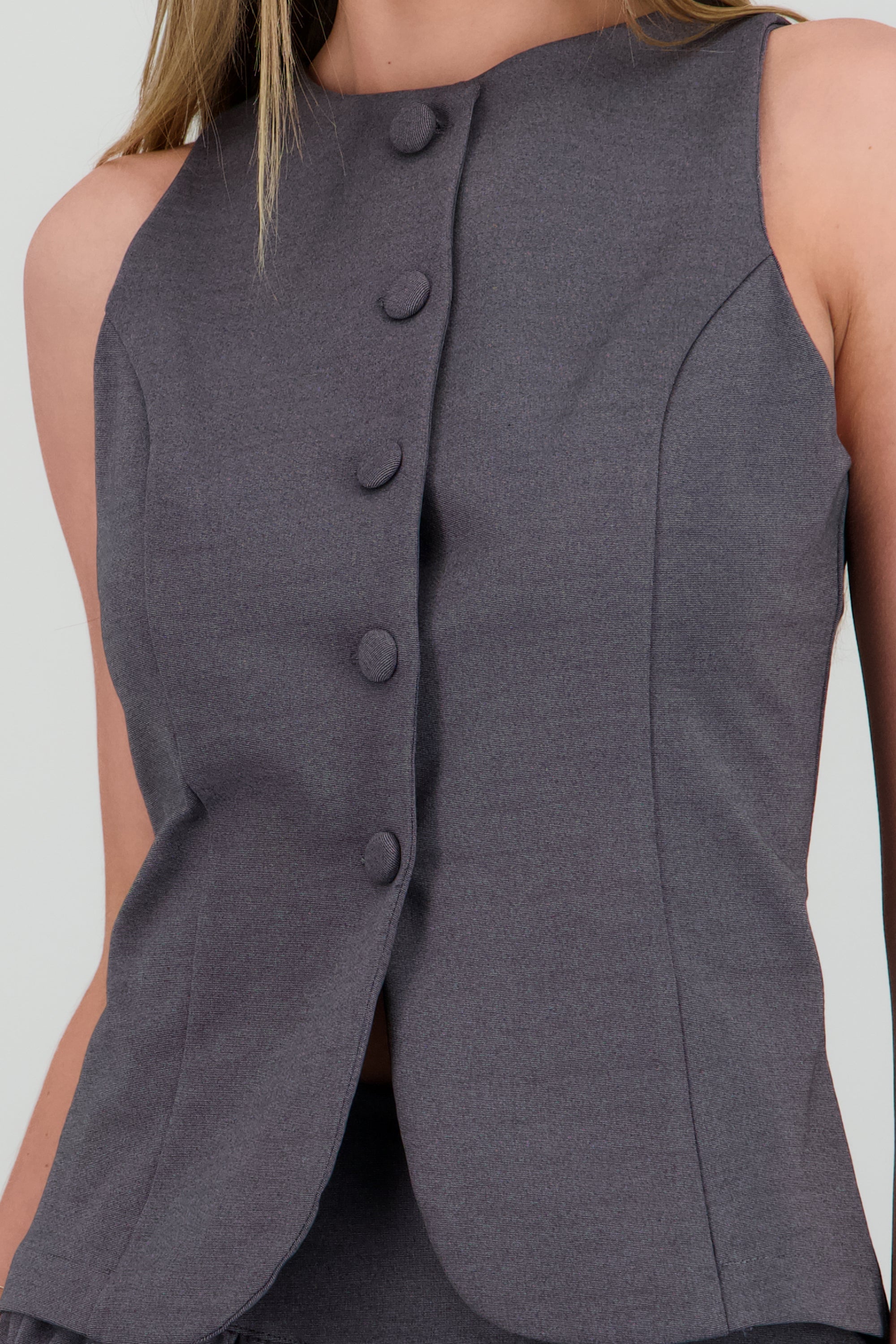 Chaleco largo de tacto suave, corte recto, abertura frontal y cierre de botones.