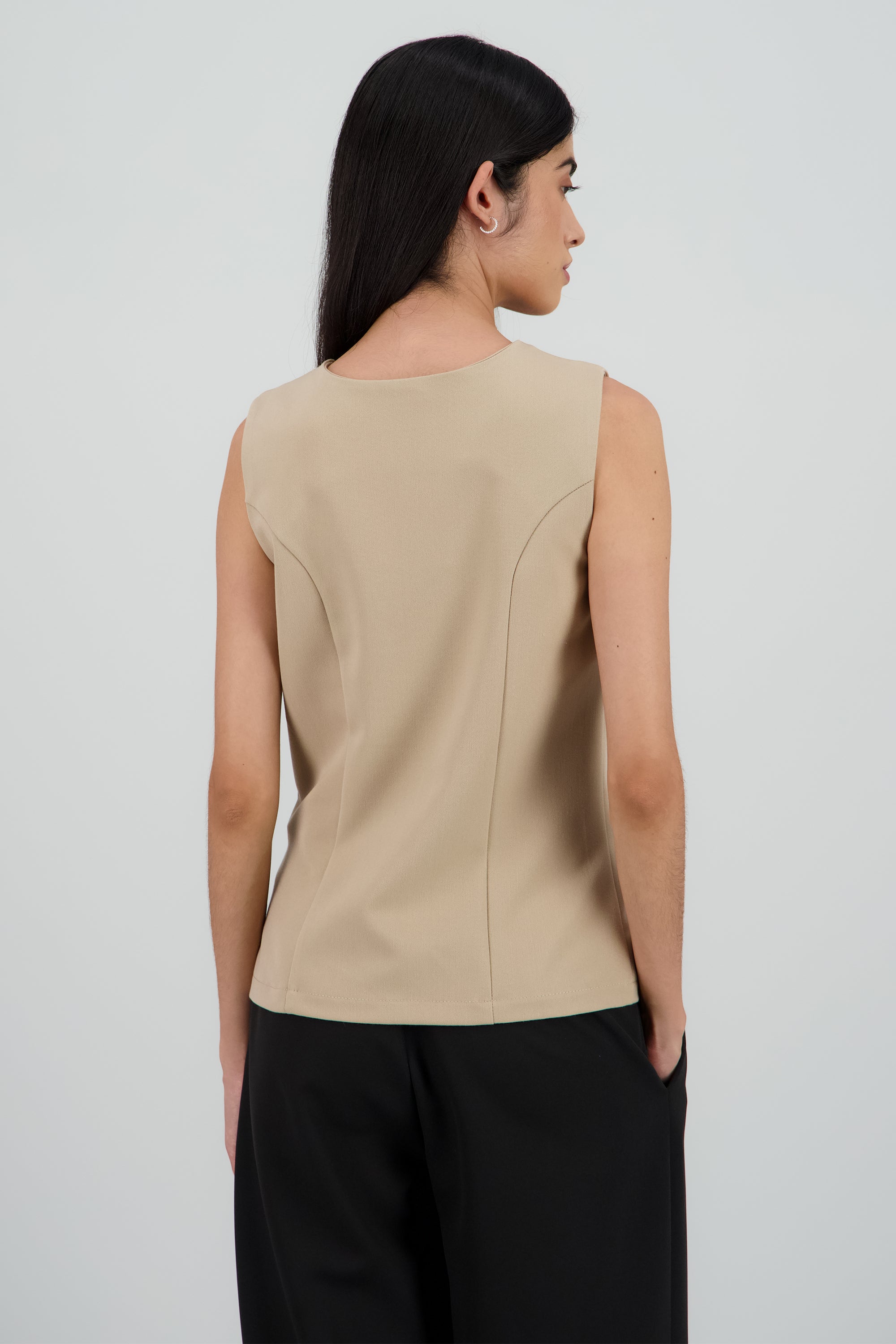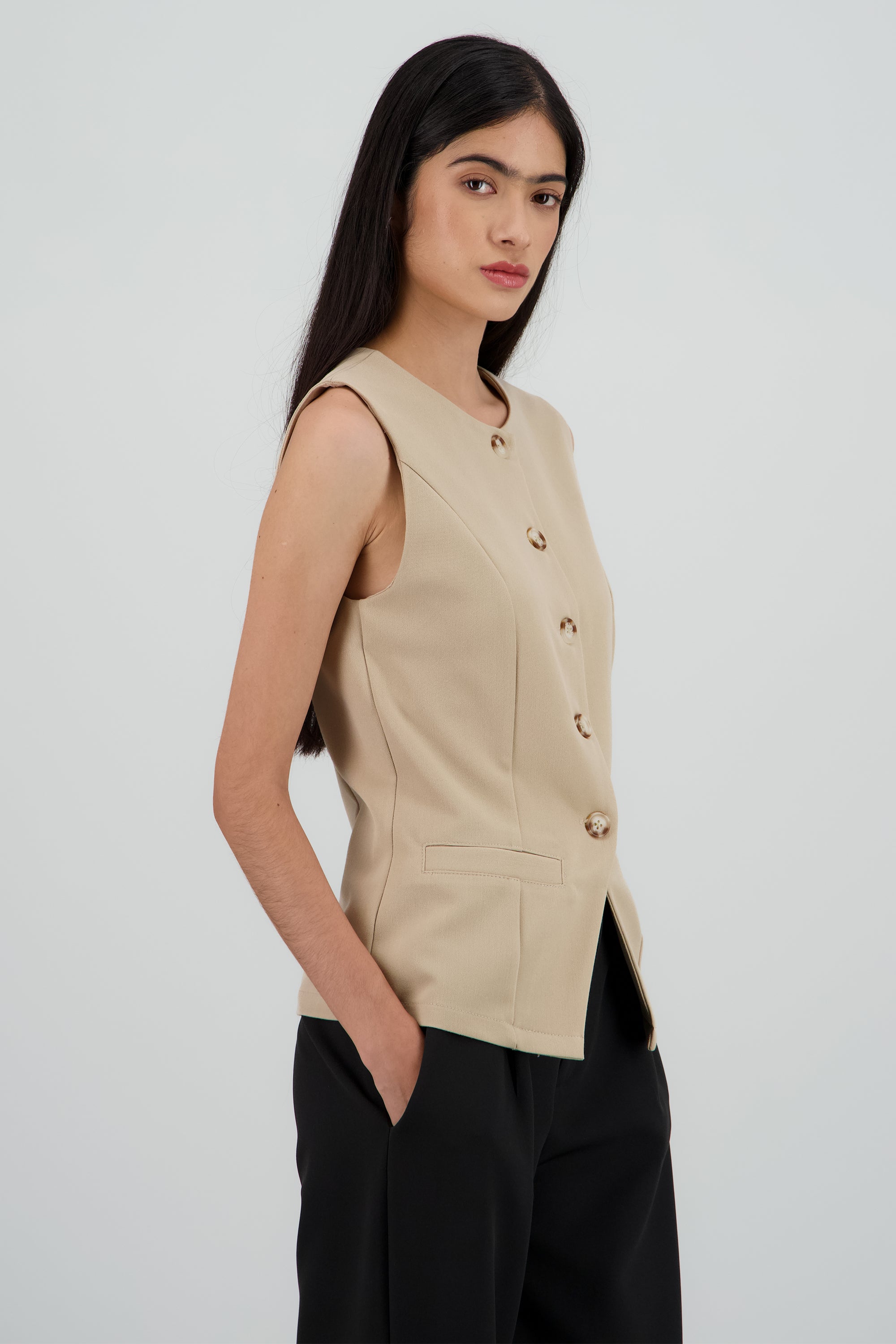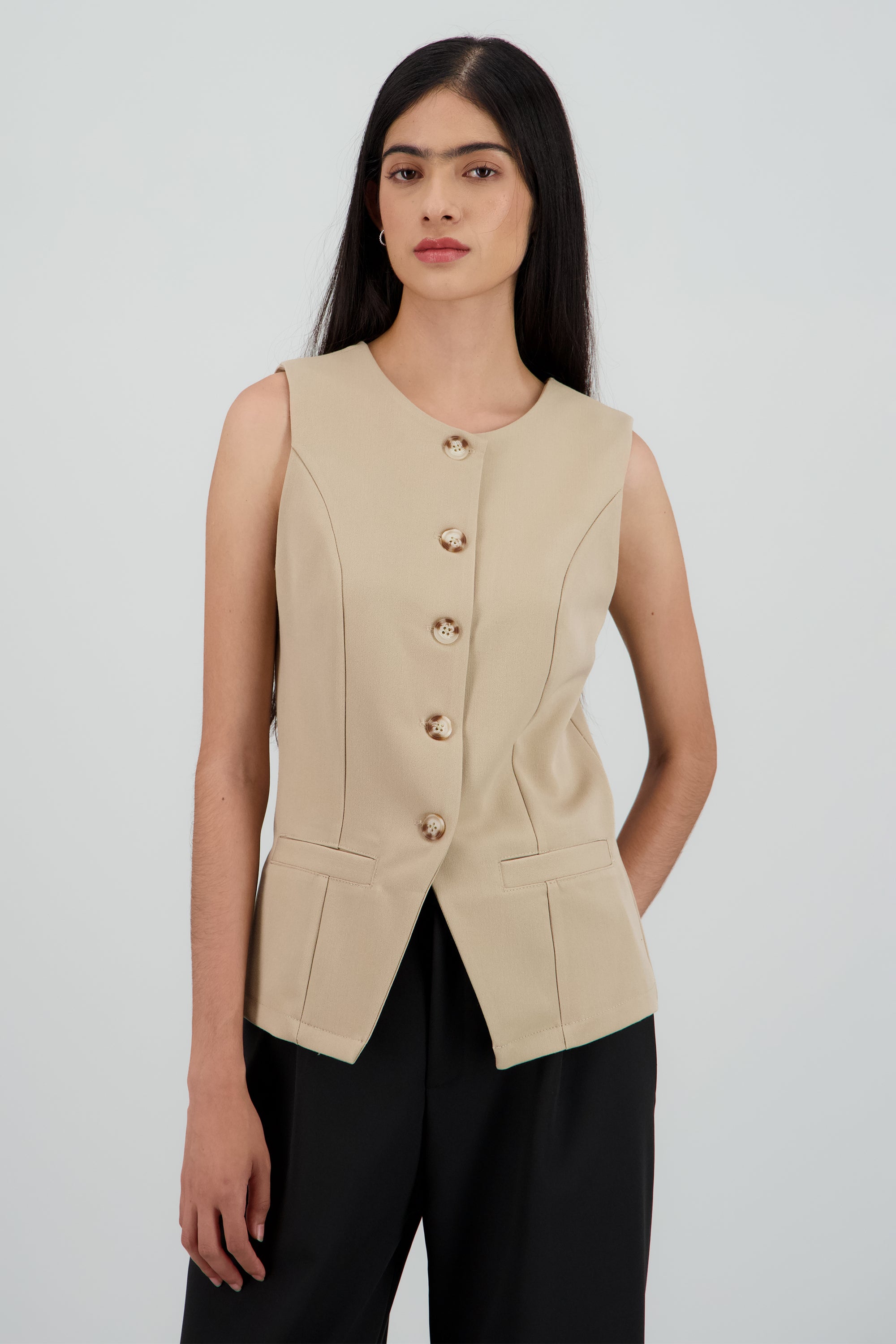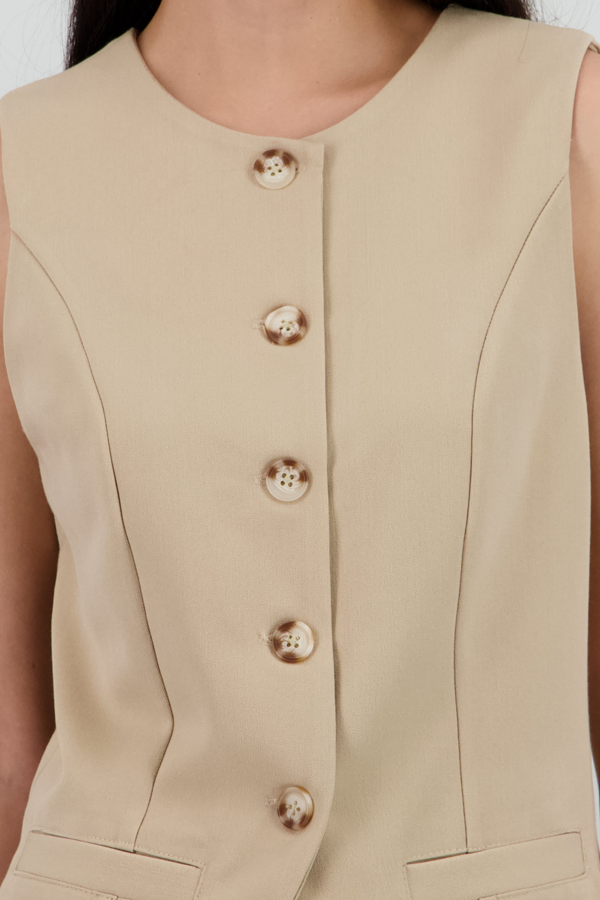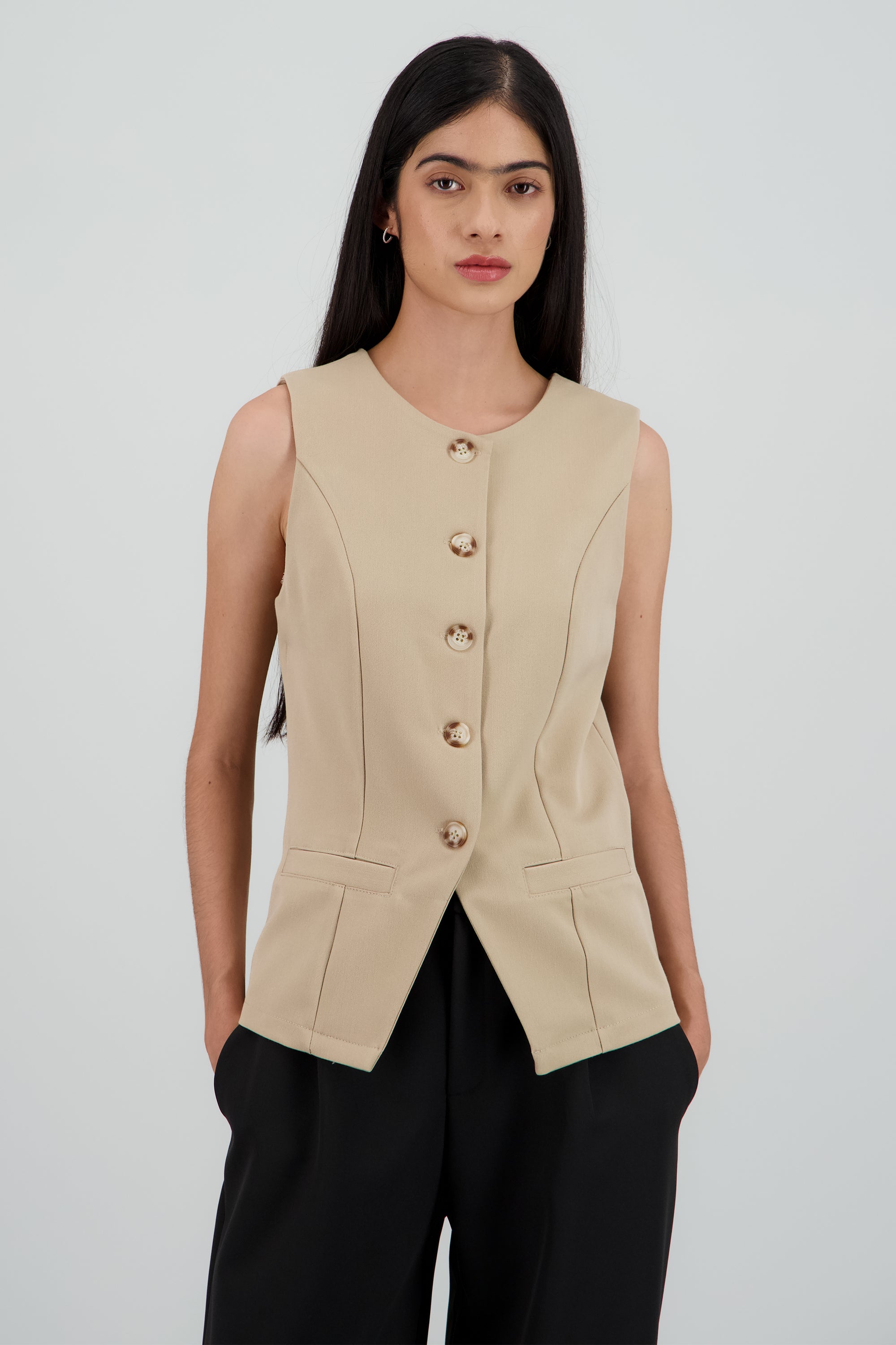 Chaleco largo de corte ajustado con cuello redondo, abertura frontal en V y cierre frontal de botones.
