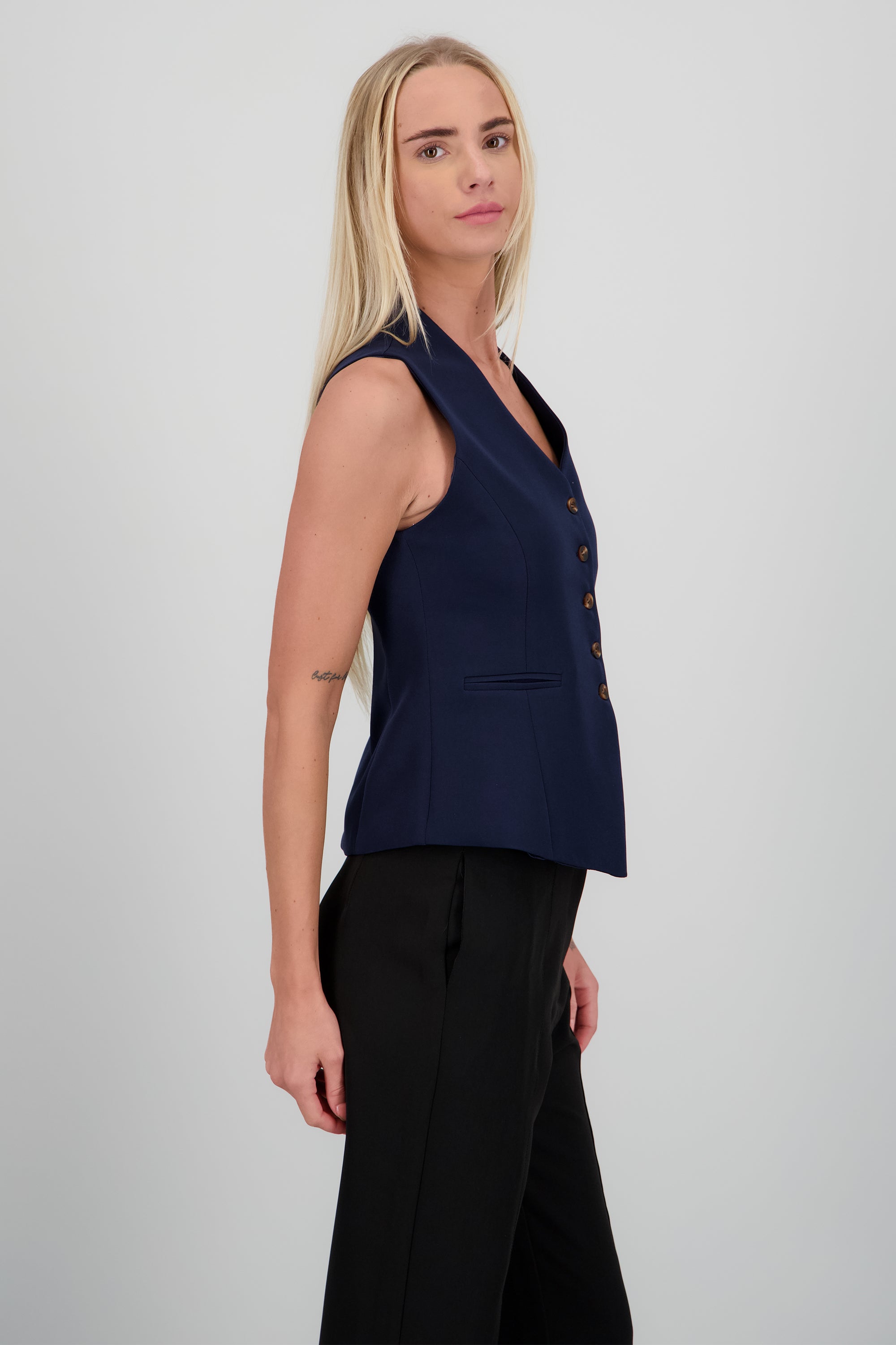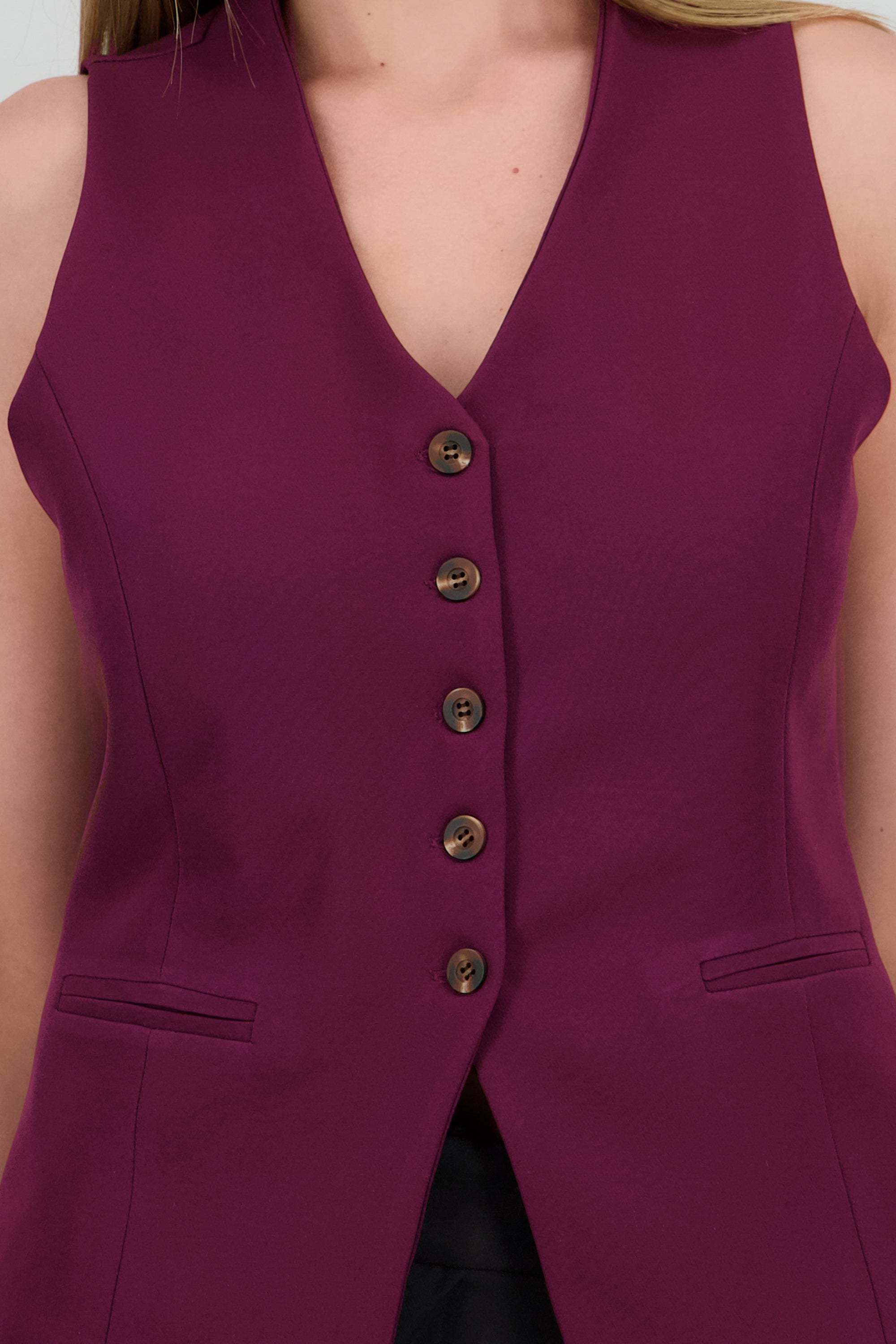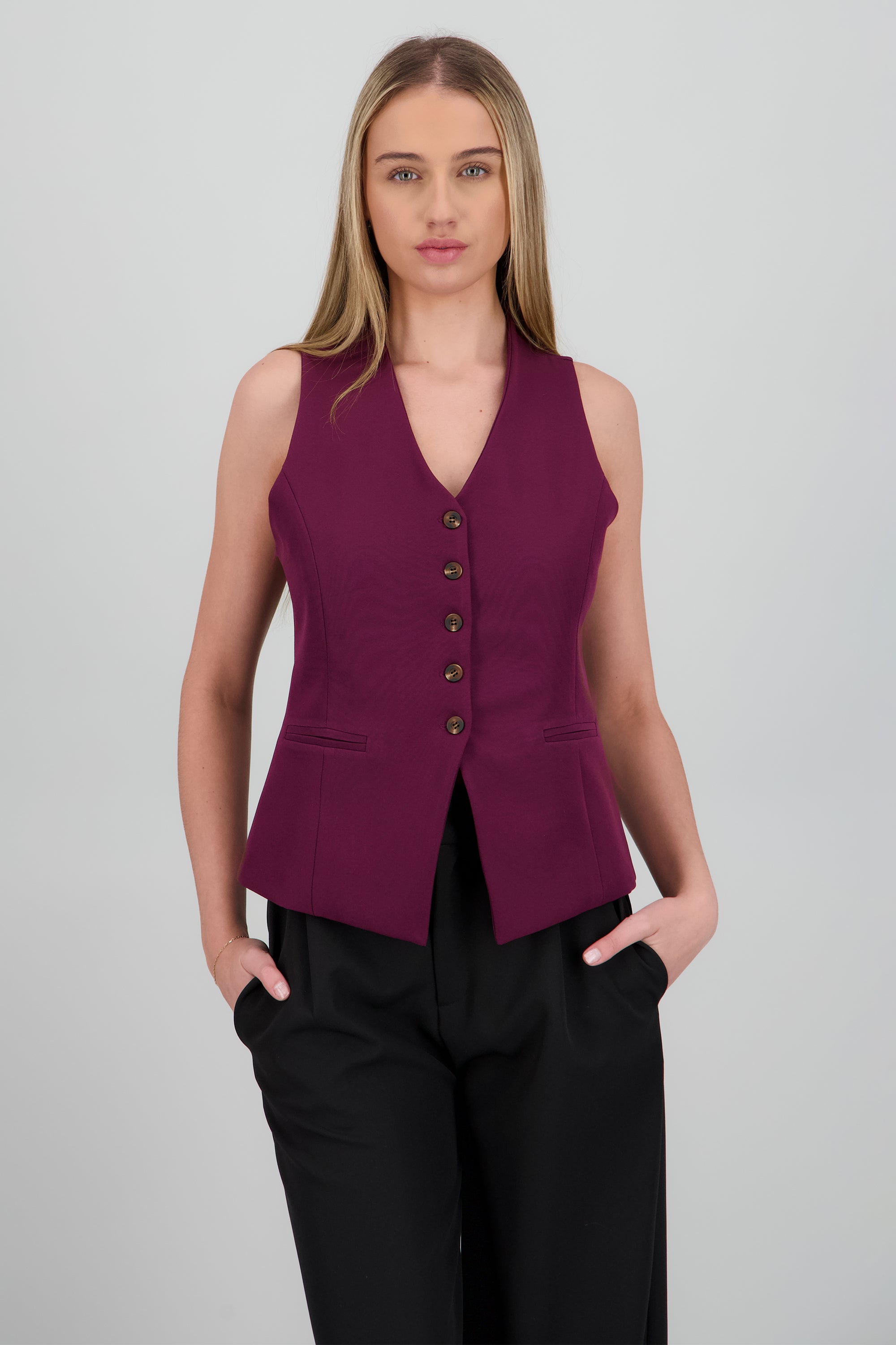 Chaleco sastre de corte ajustado, cierre de botones y bolsillos laterales discretos.
