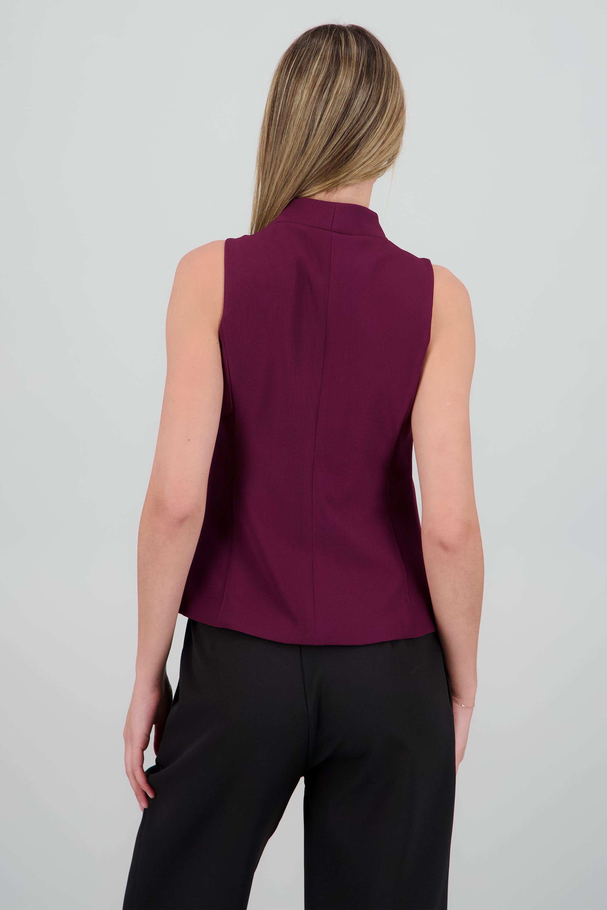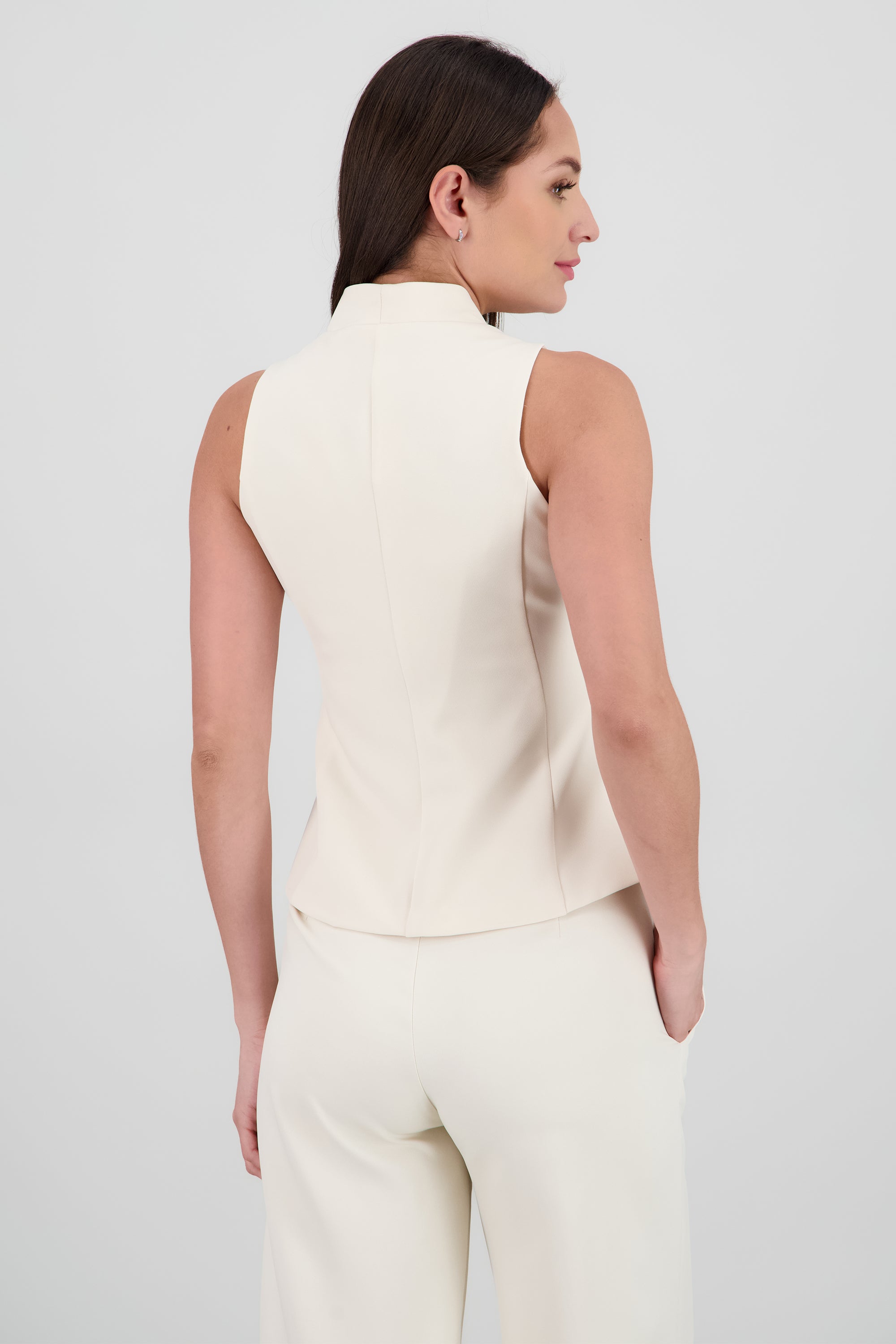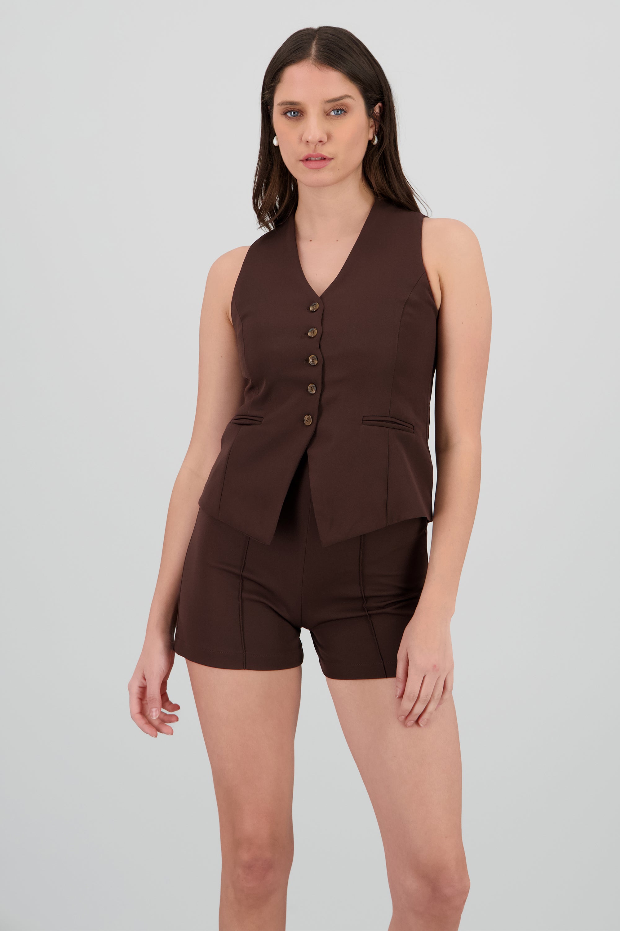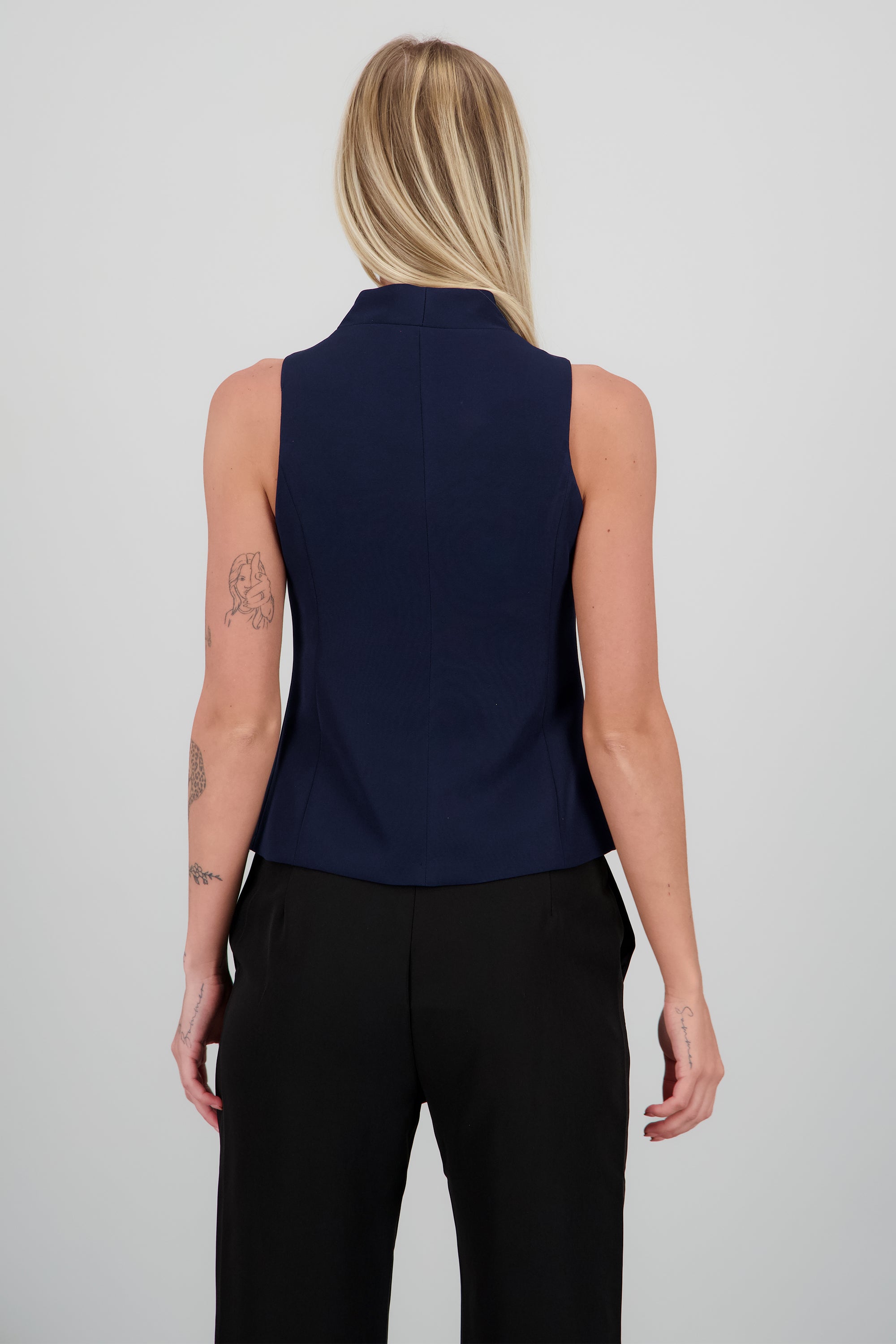 Chaleco sastre de corte ajustado, cierre de botones y bolsillos laterales discretos.