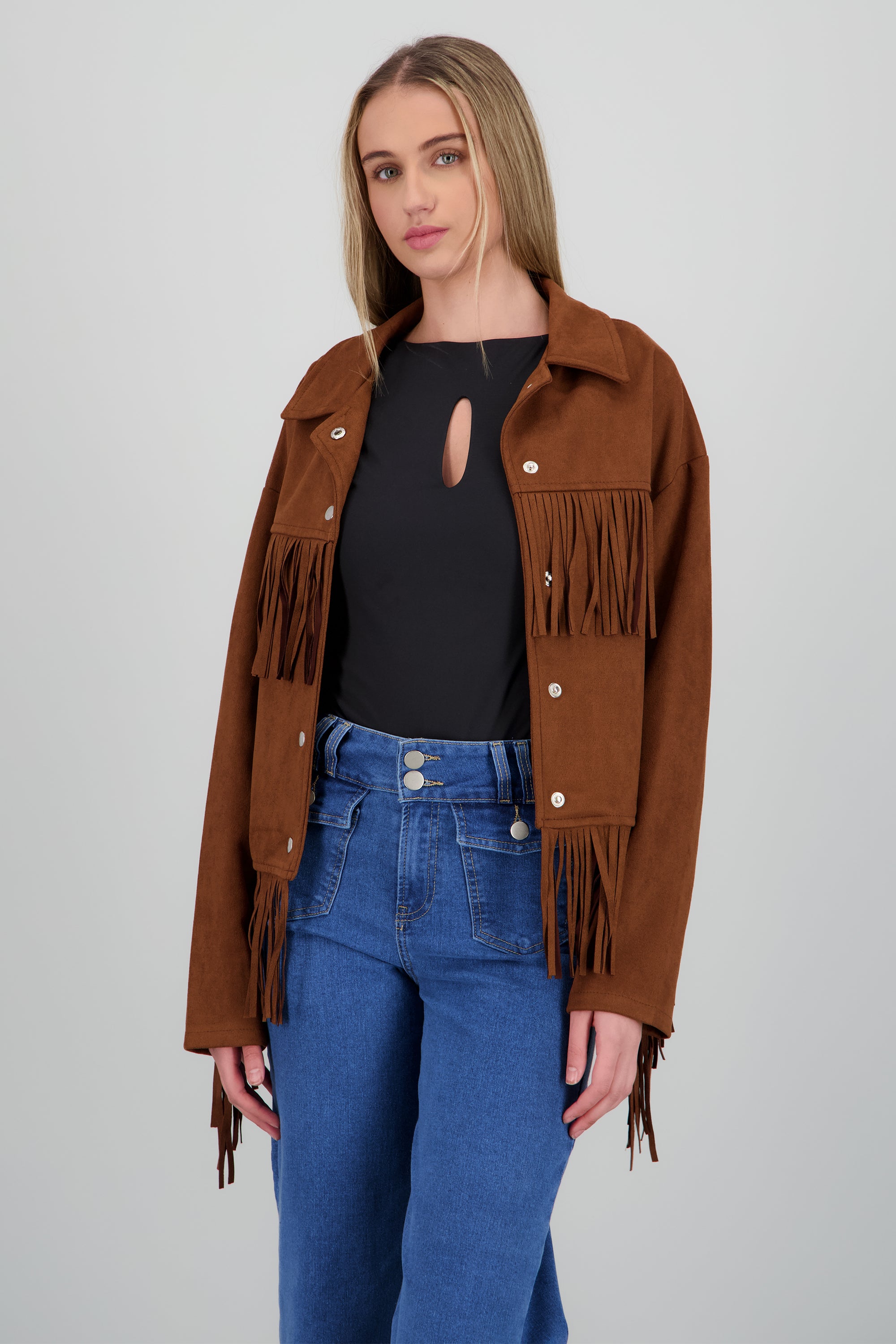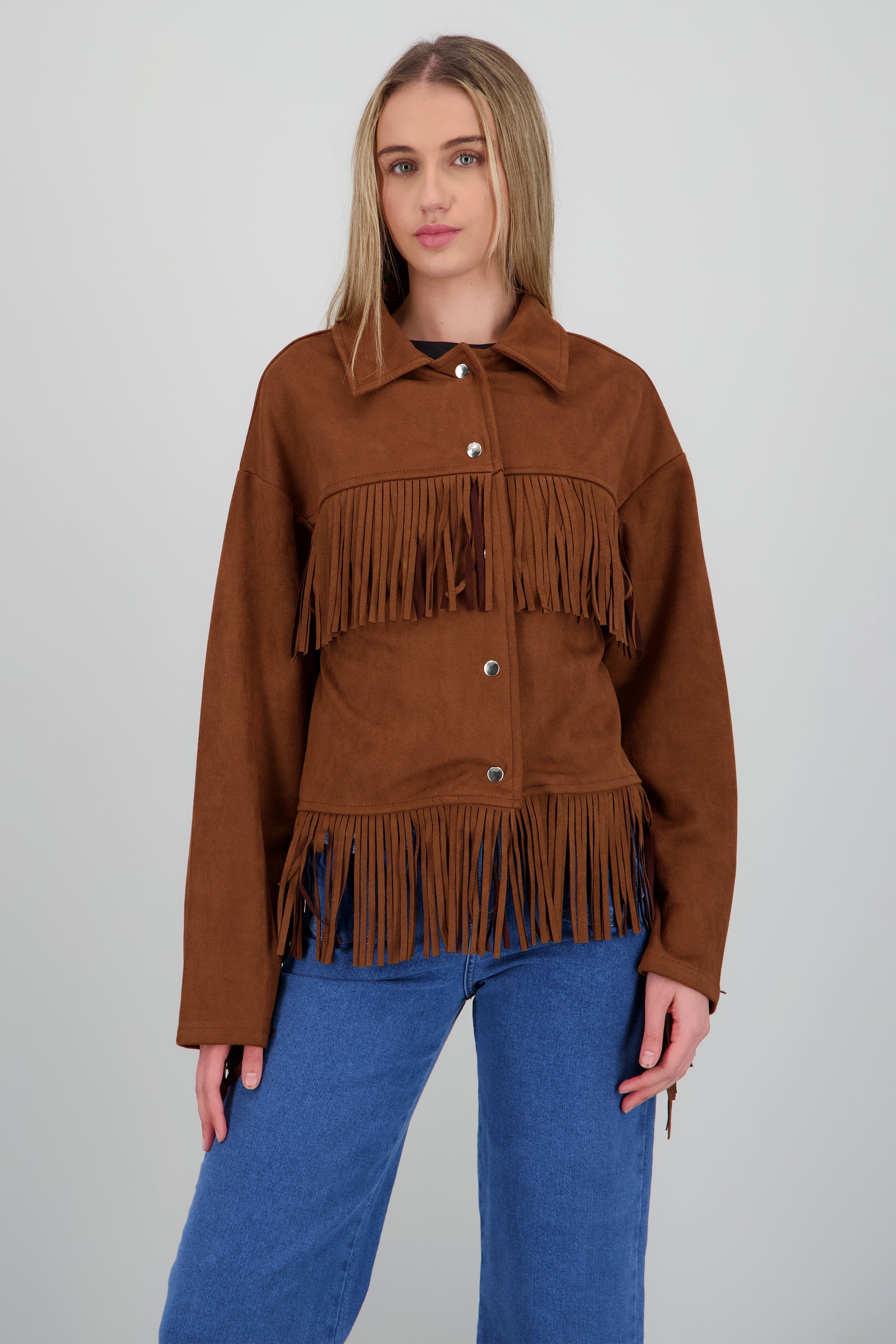 Esta chamarra es perfecta para esos días en que quieres sentirte cómoda pero a la vez con estilo, es el complemento ideal para cualquier look casual. Su diseño con flecos aporta un toque de movimiento que no pasa desapercibido.