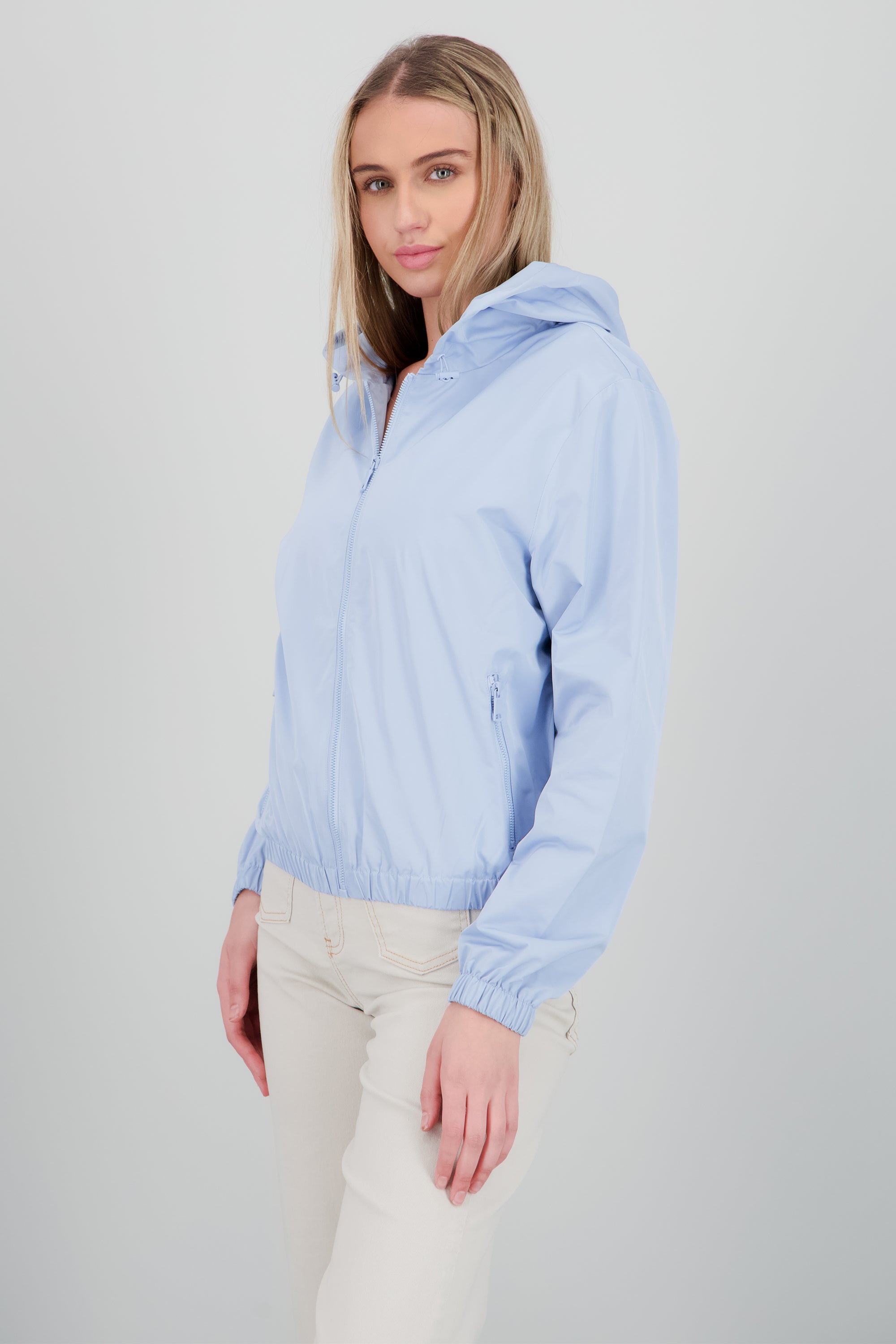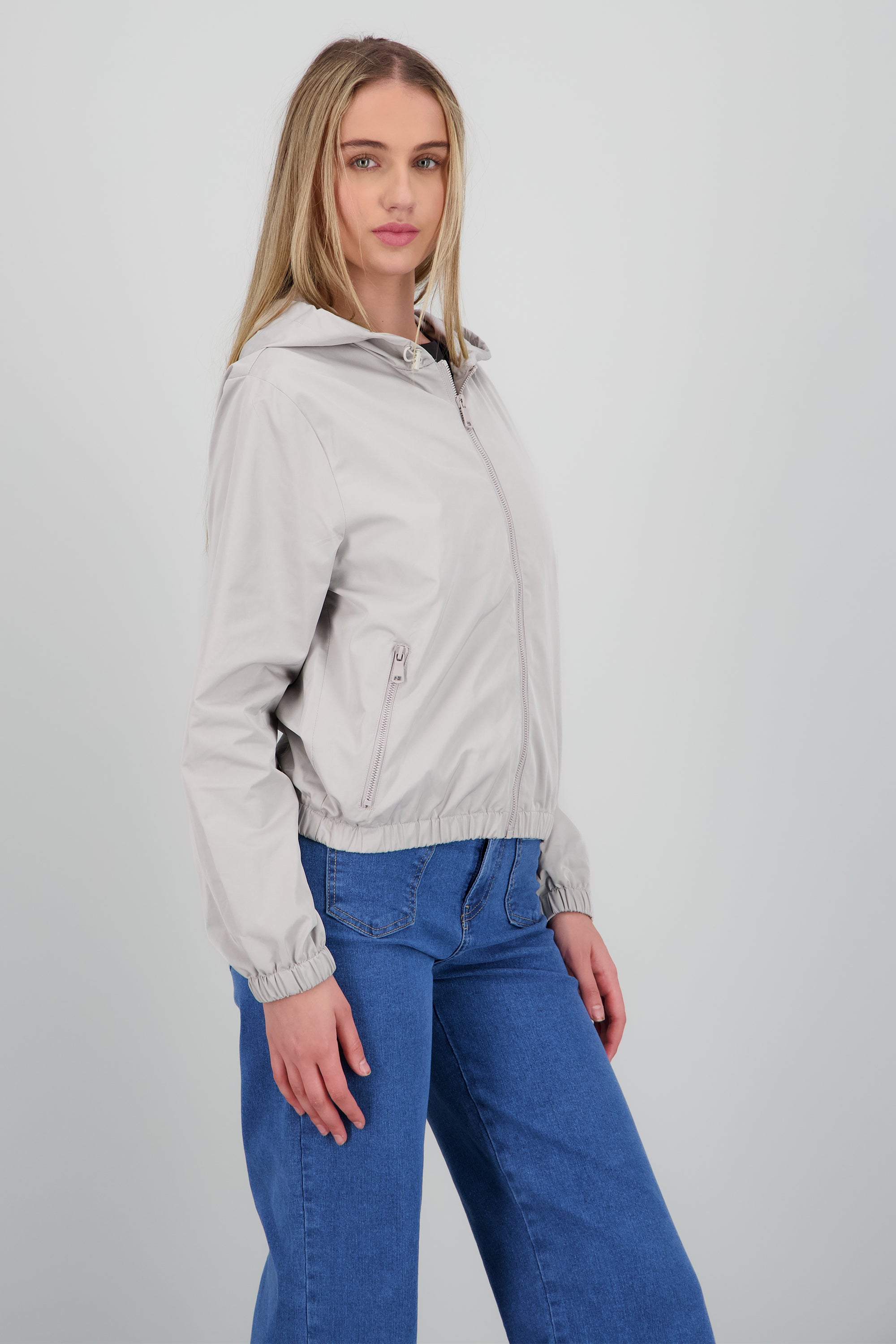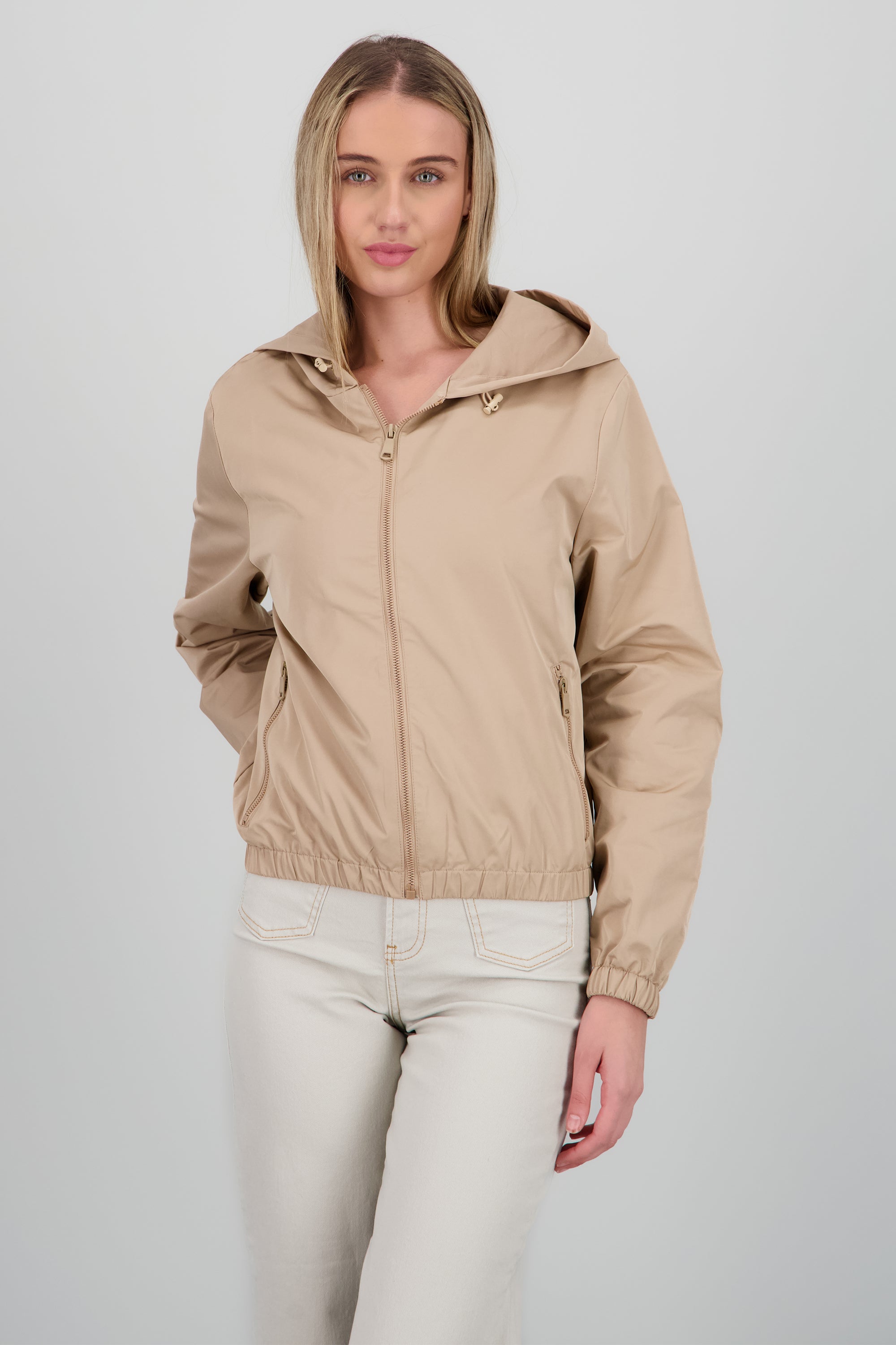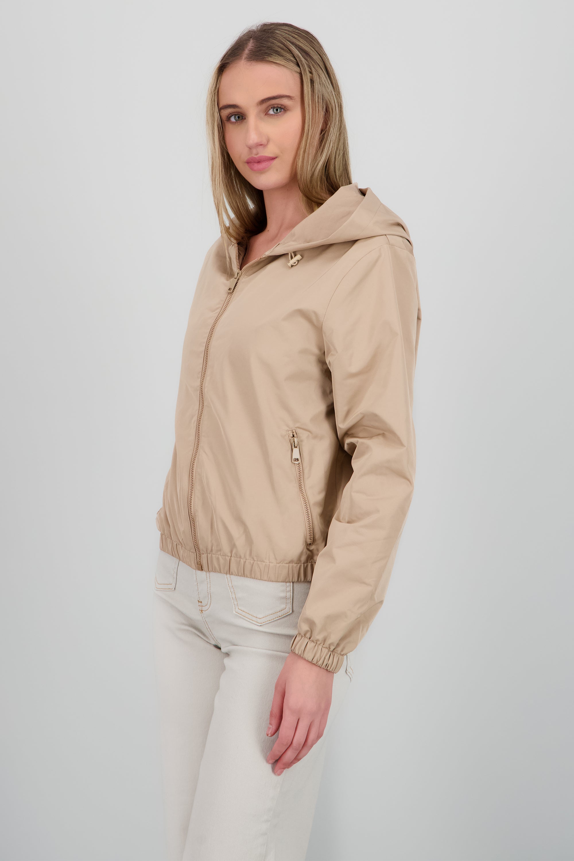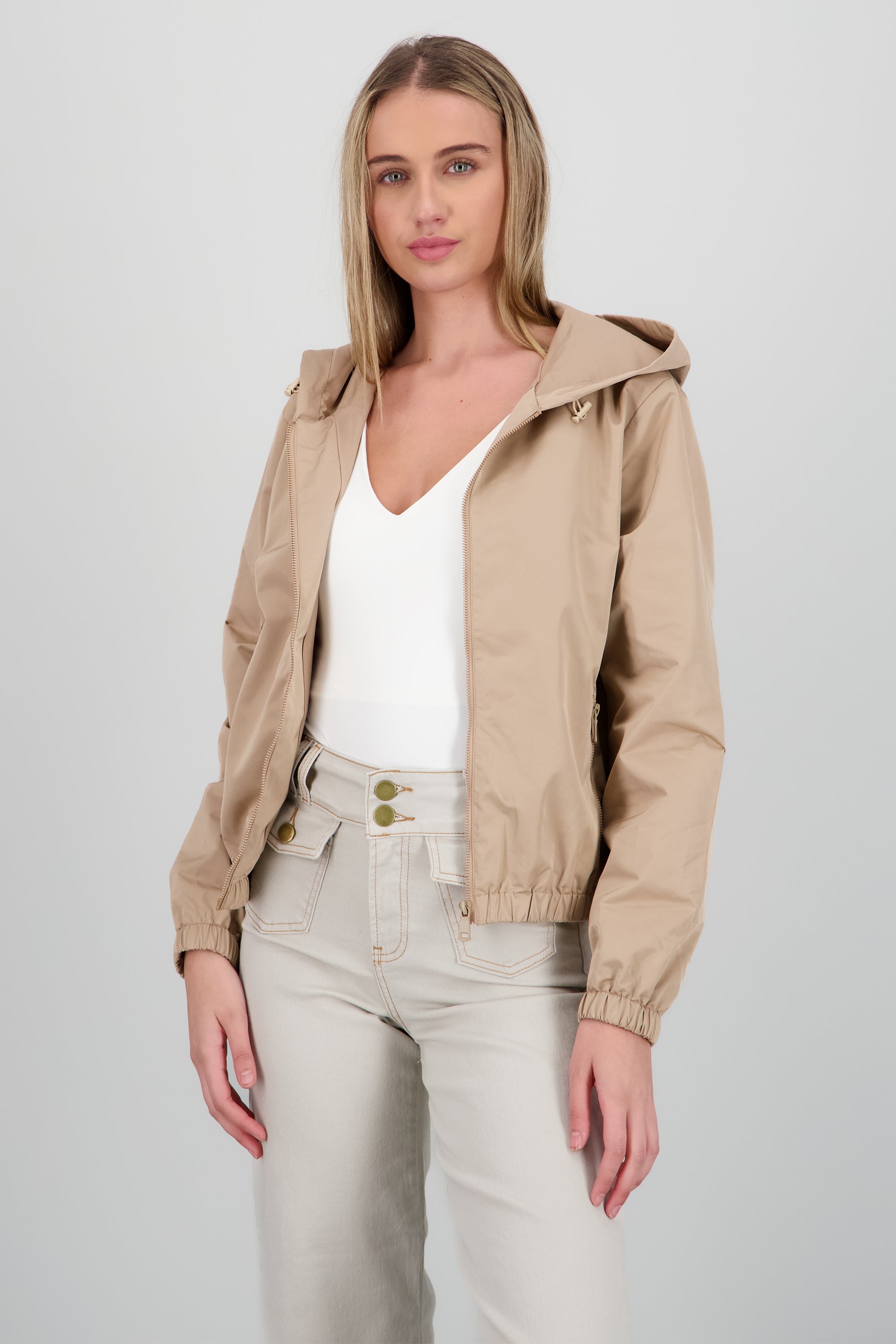 Chamarra ligera con gorro, corte ajustado, cierre frontal y bolsas laterales.