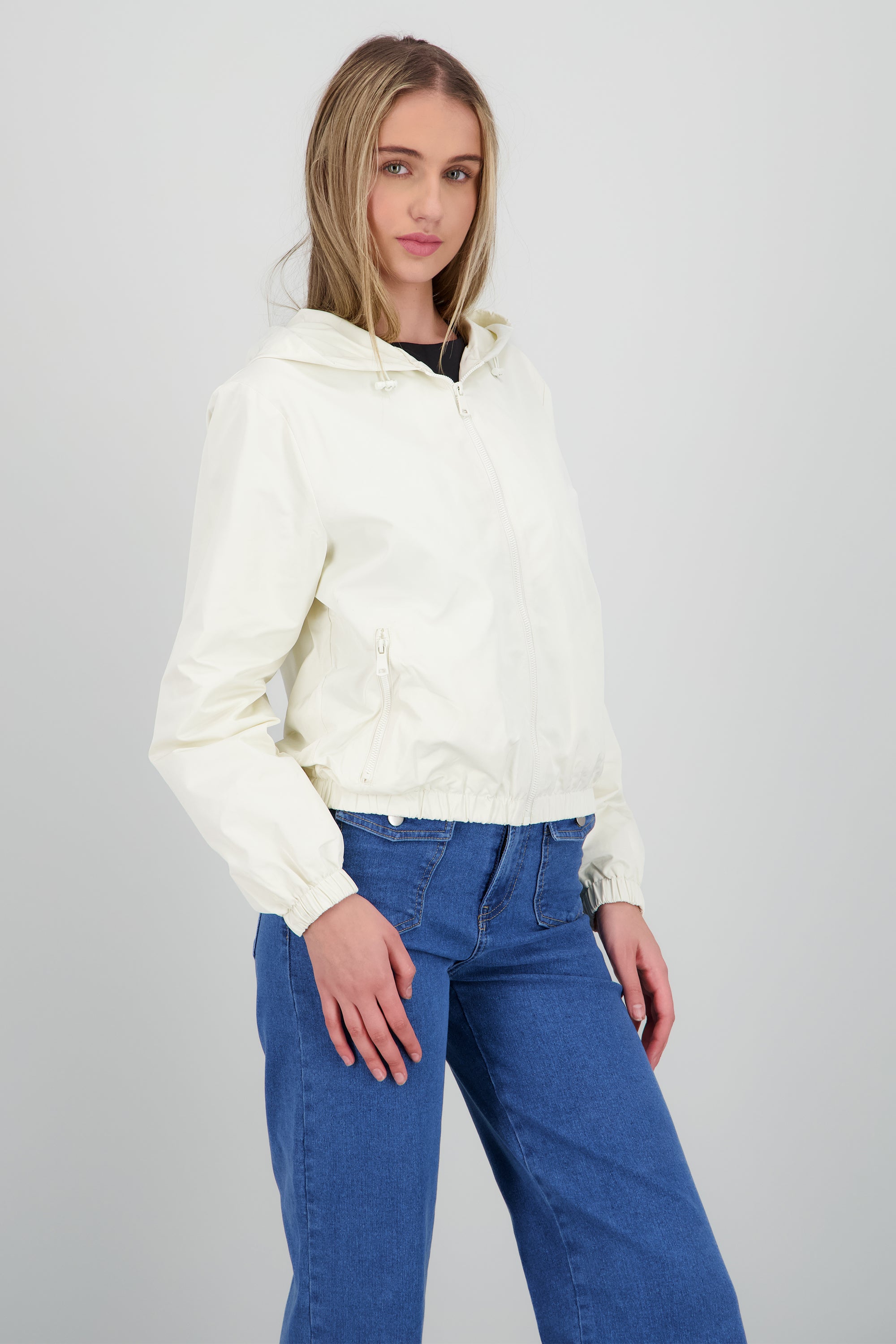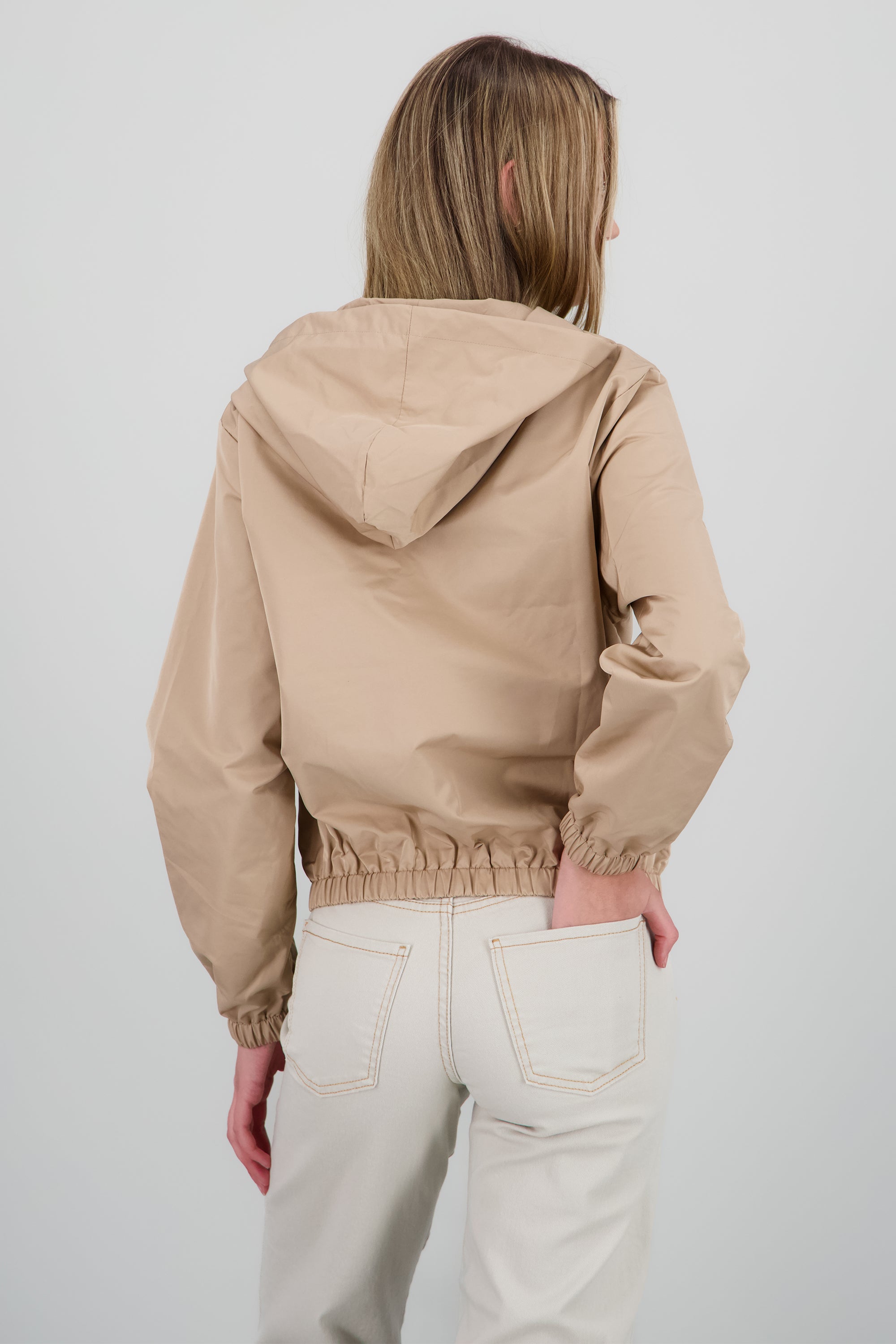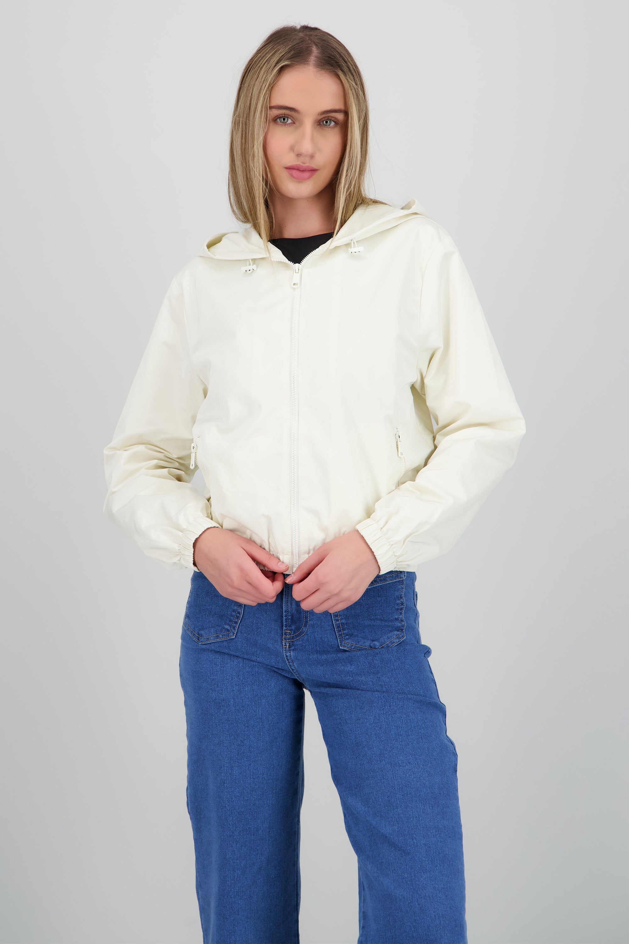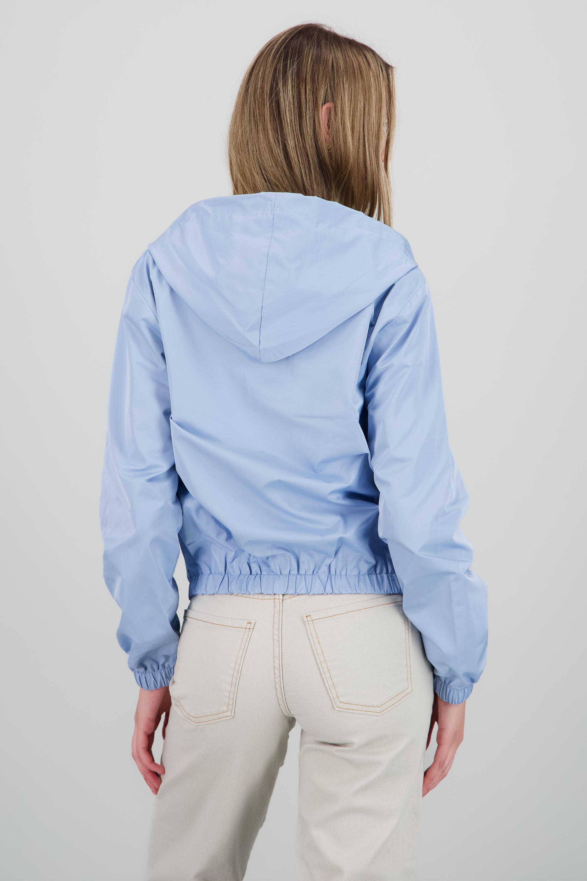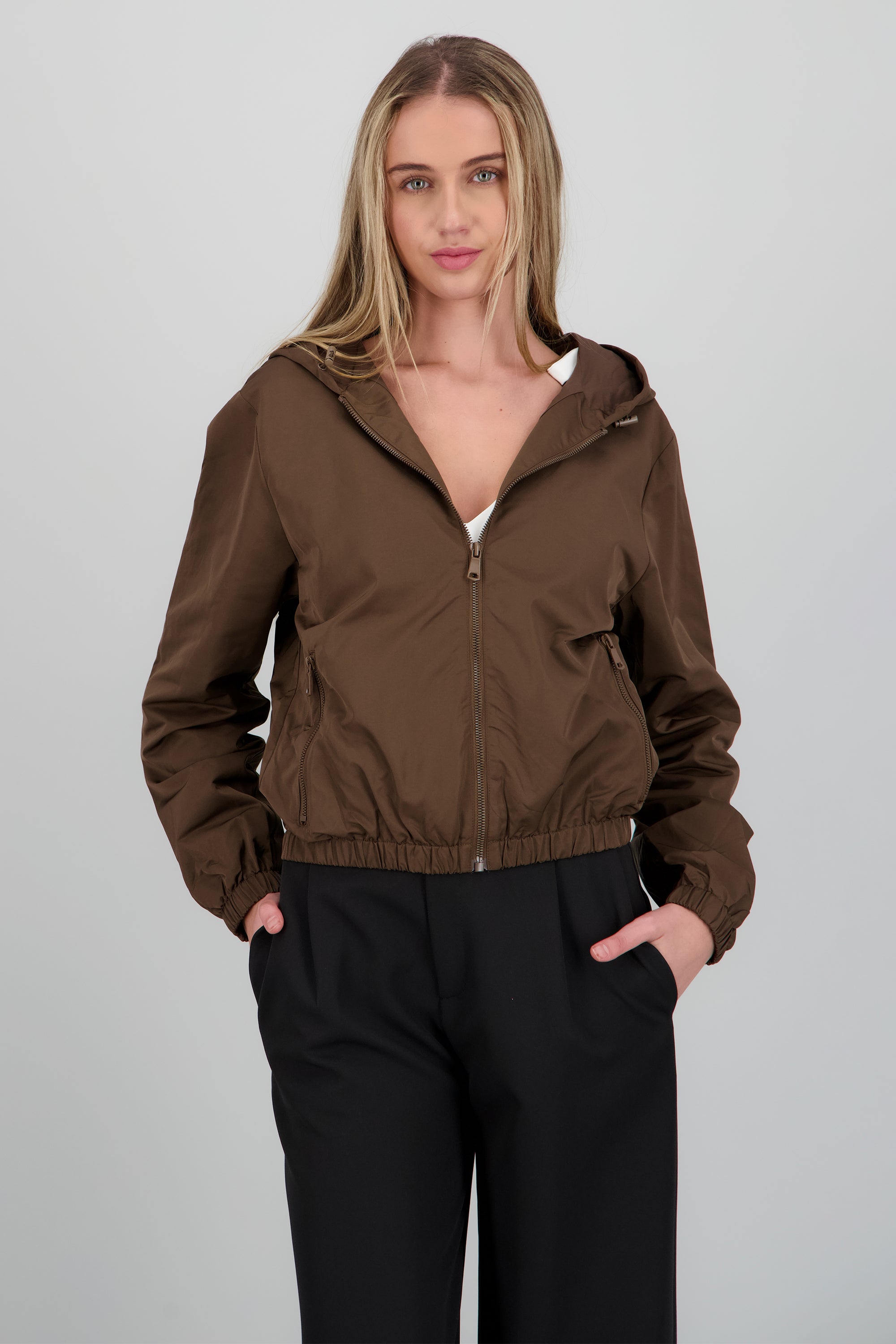 Chamarra ligera con gorro, corte ajustado, cierre frontal y bolsas laterales.