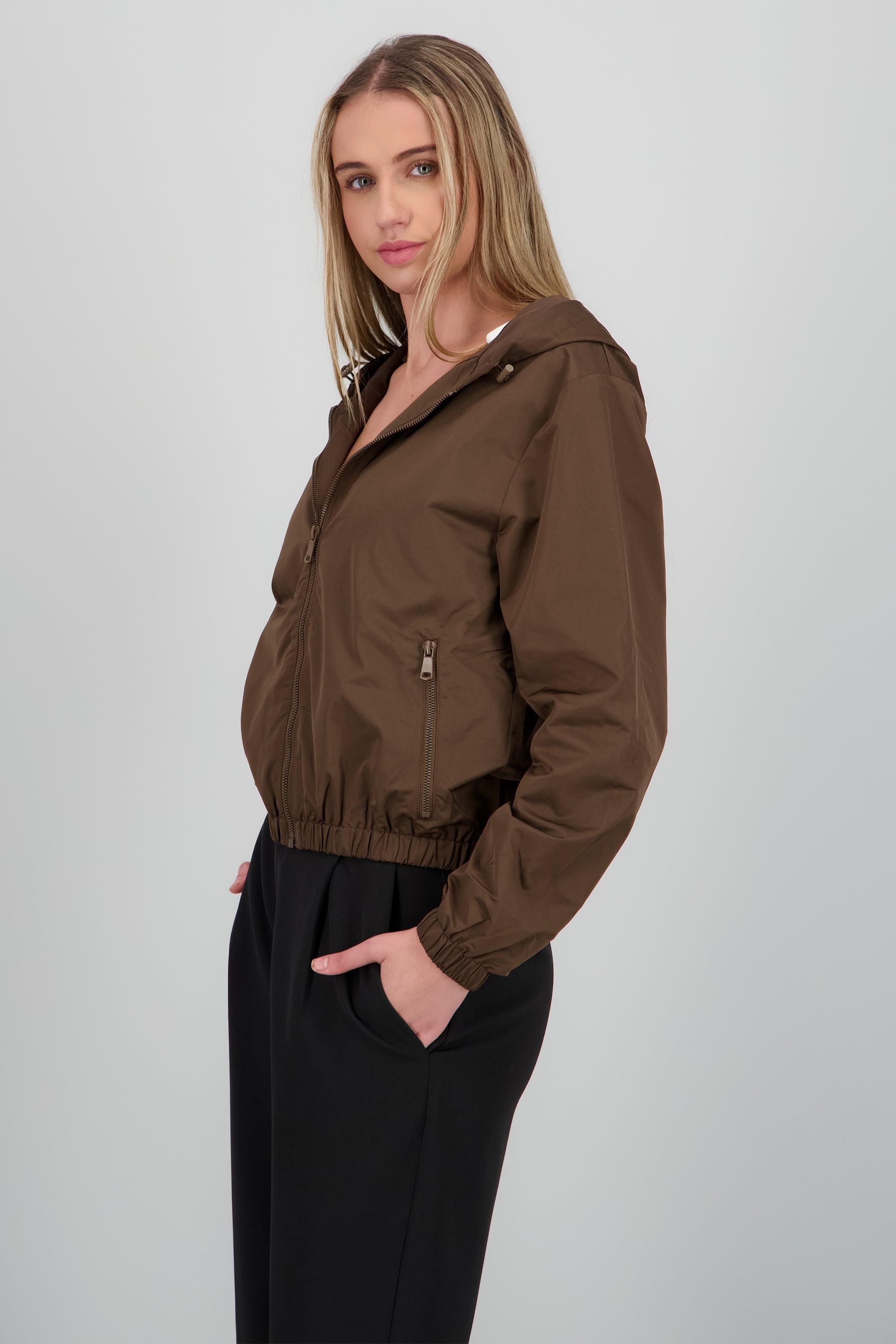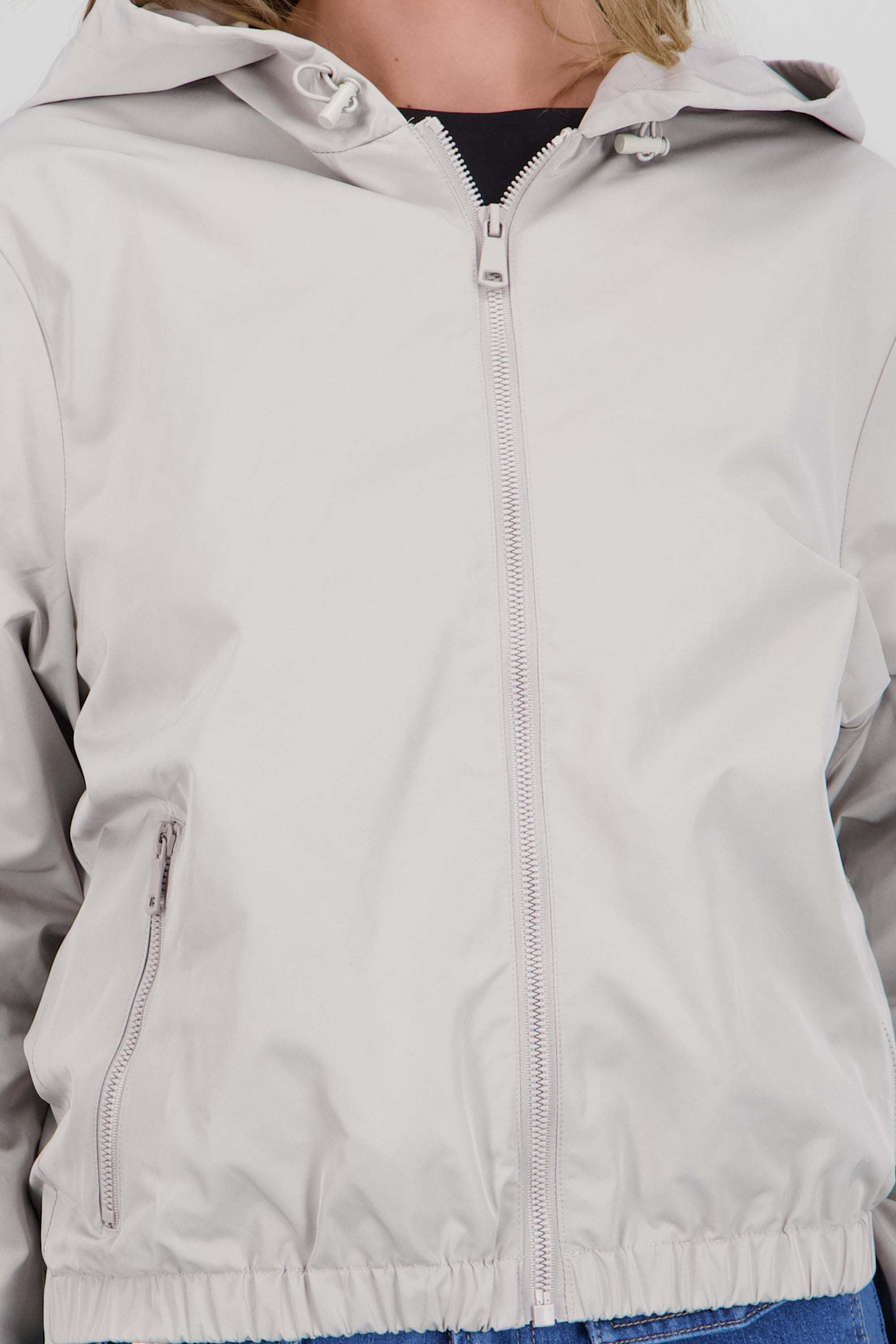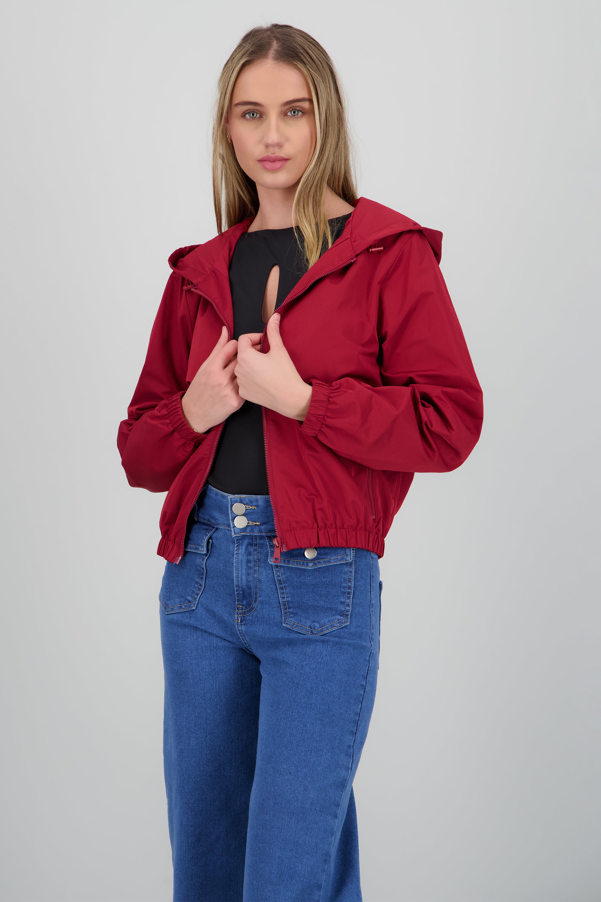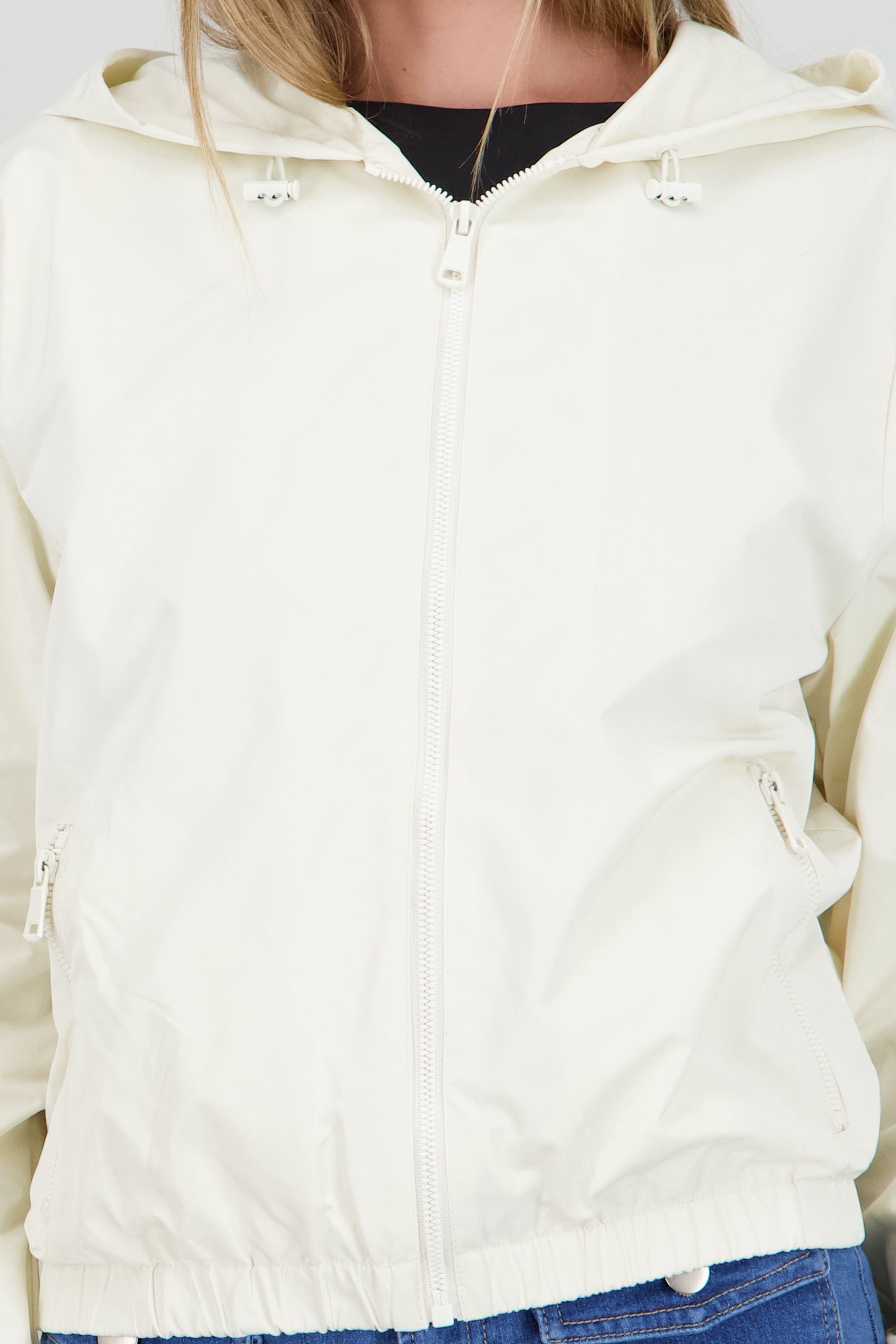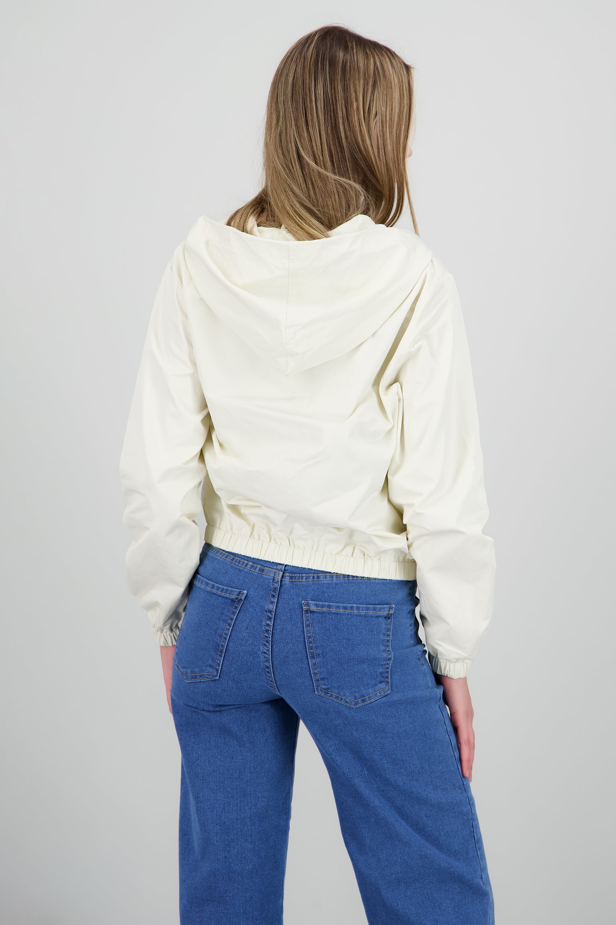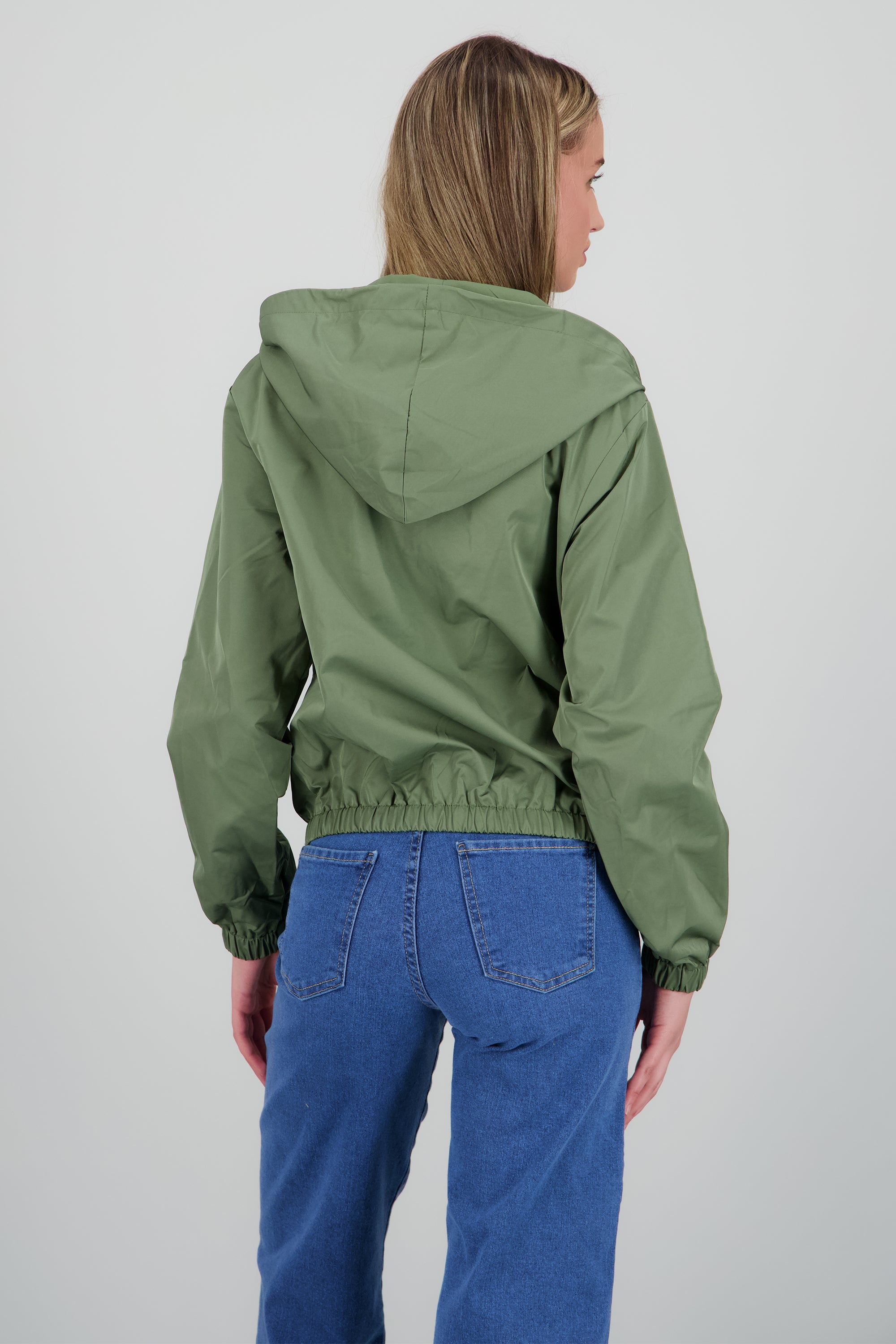 Chamarra ligera con gorro, corte ajustado, cierre frontal y bolsas laterales.