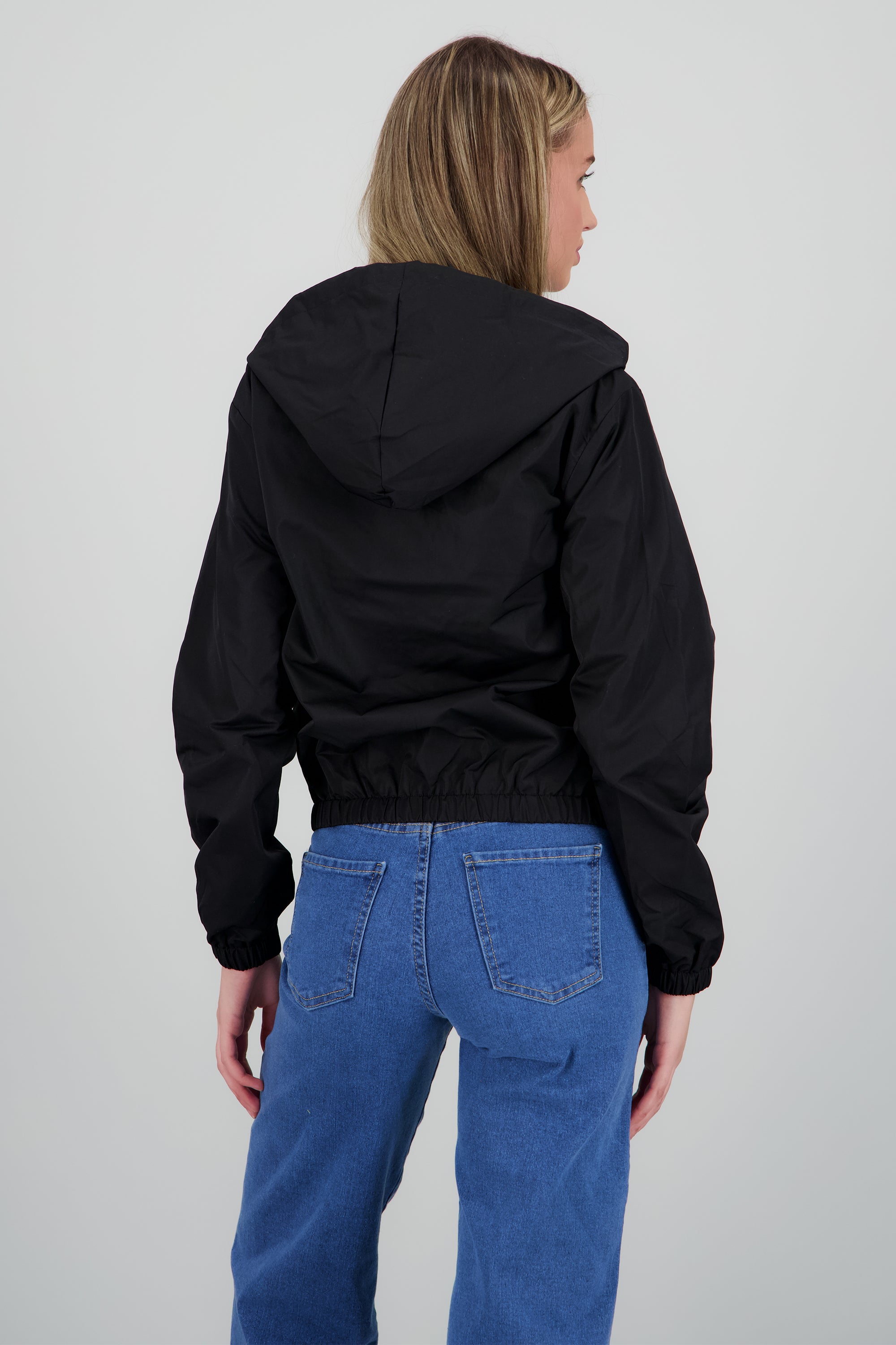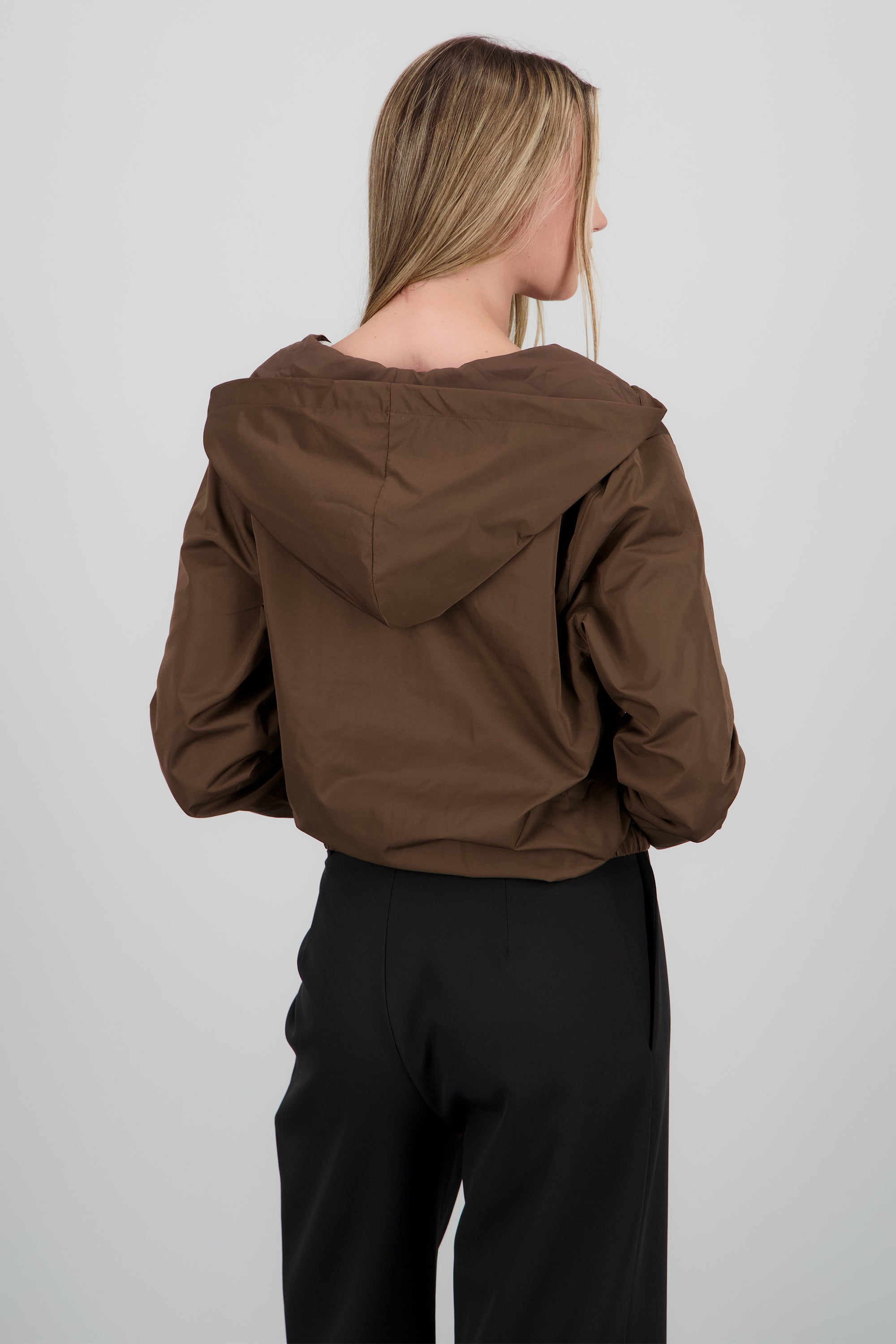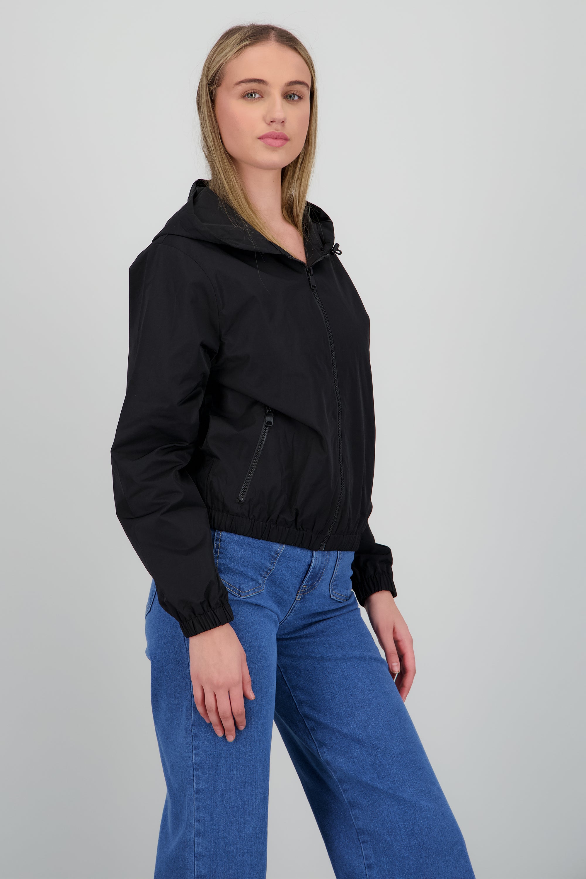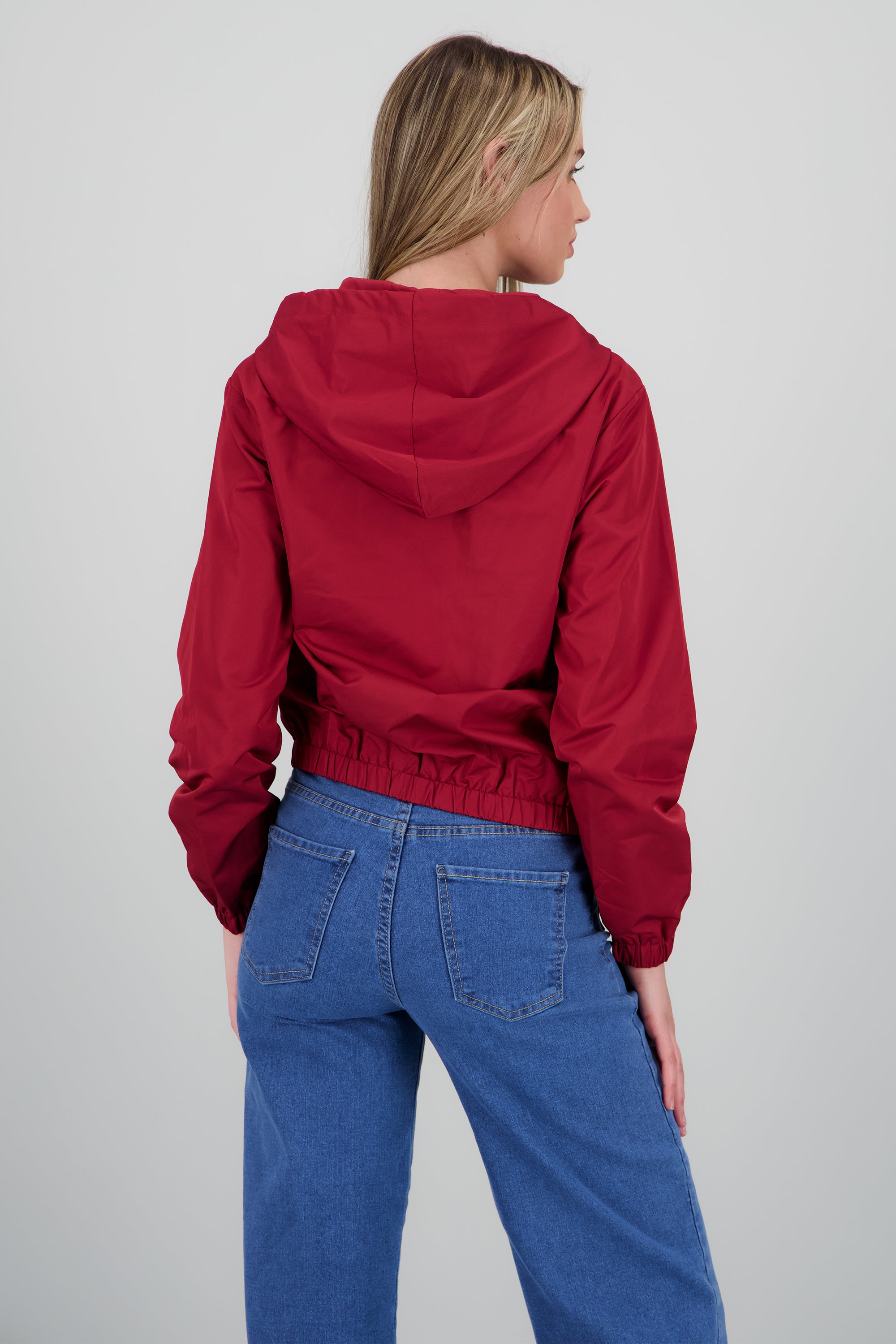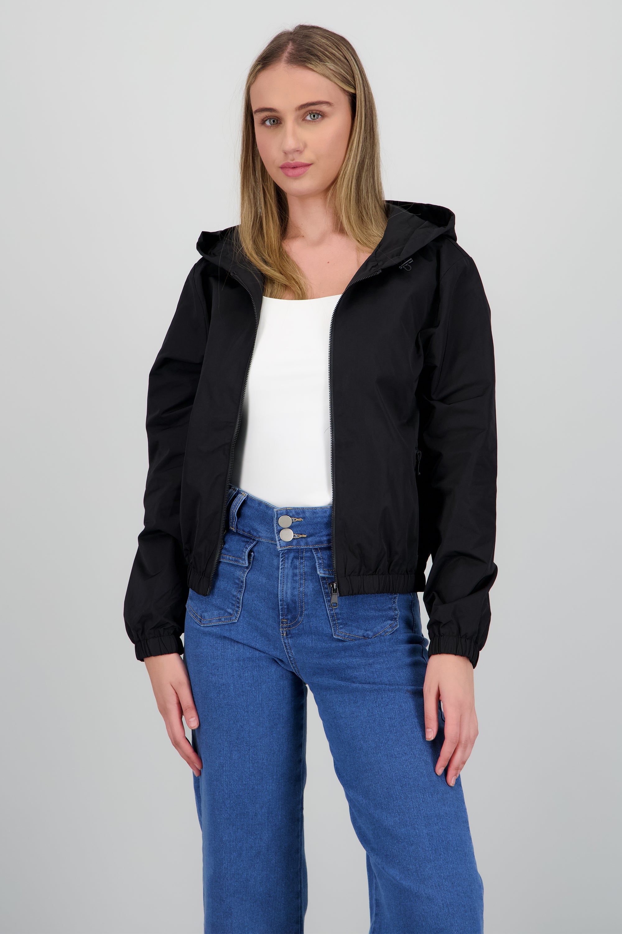 Chamarra ligera con gorro, corte ajustado, cierre frontal y bolsas laterales.