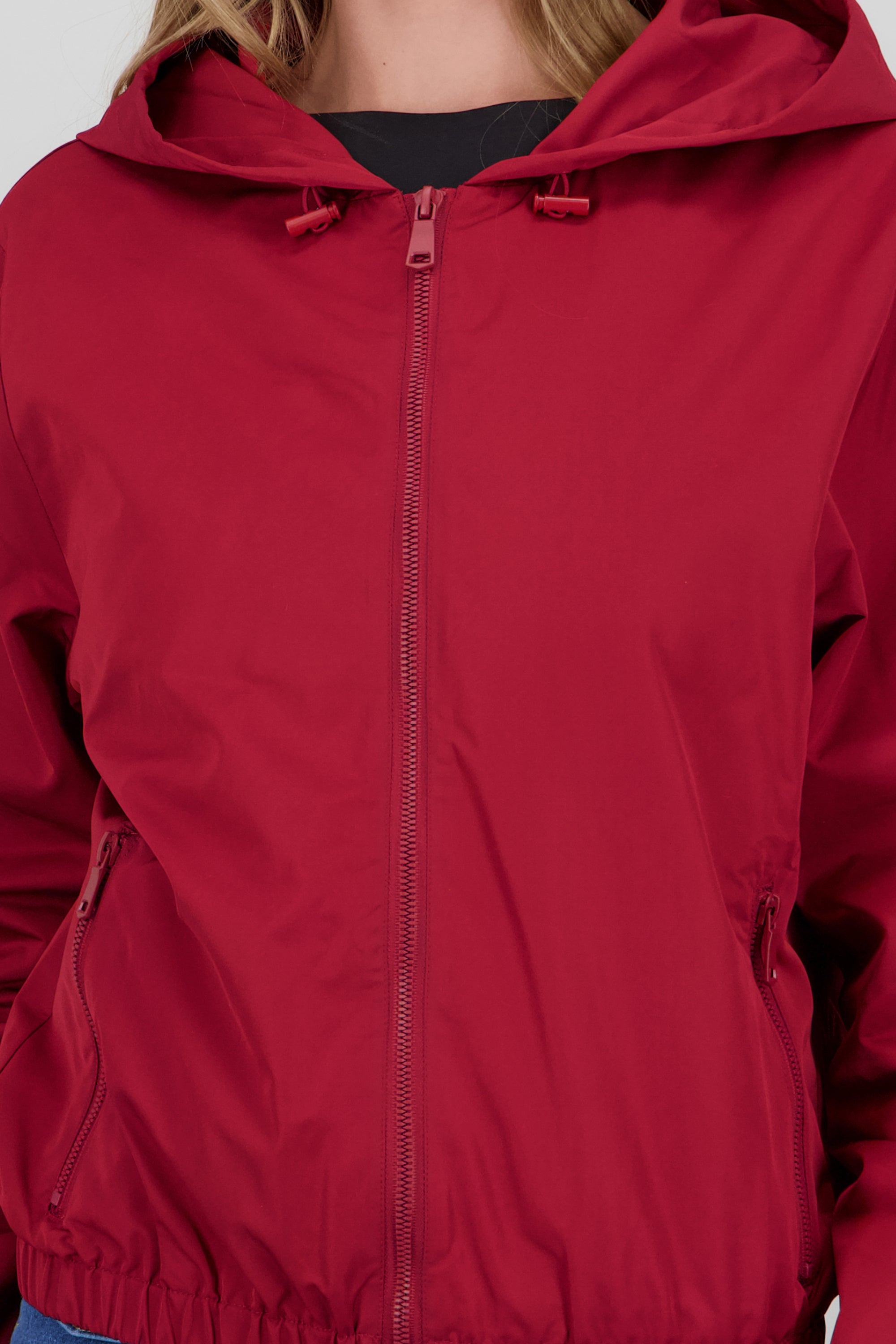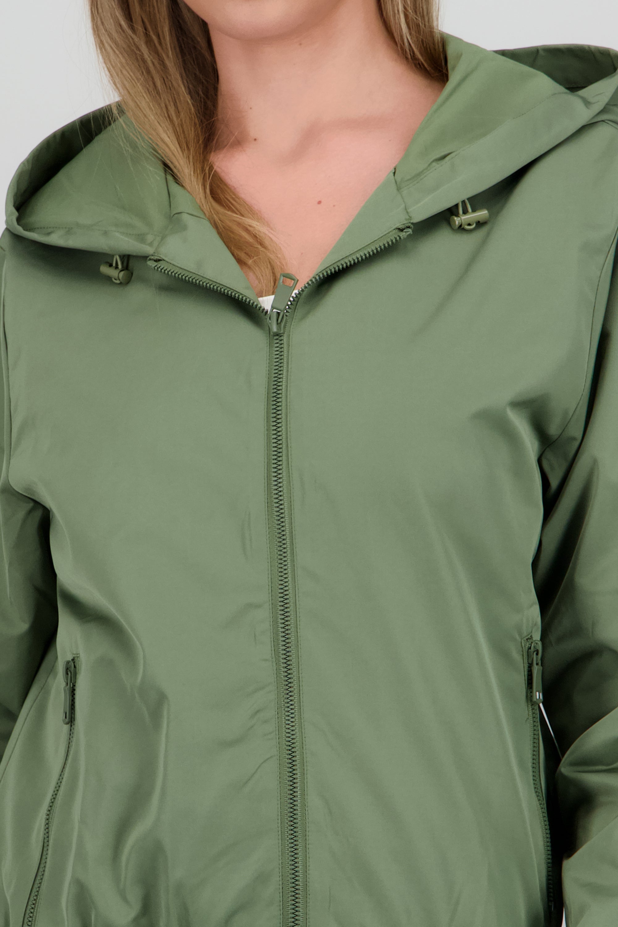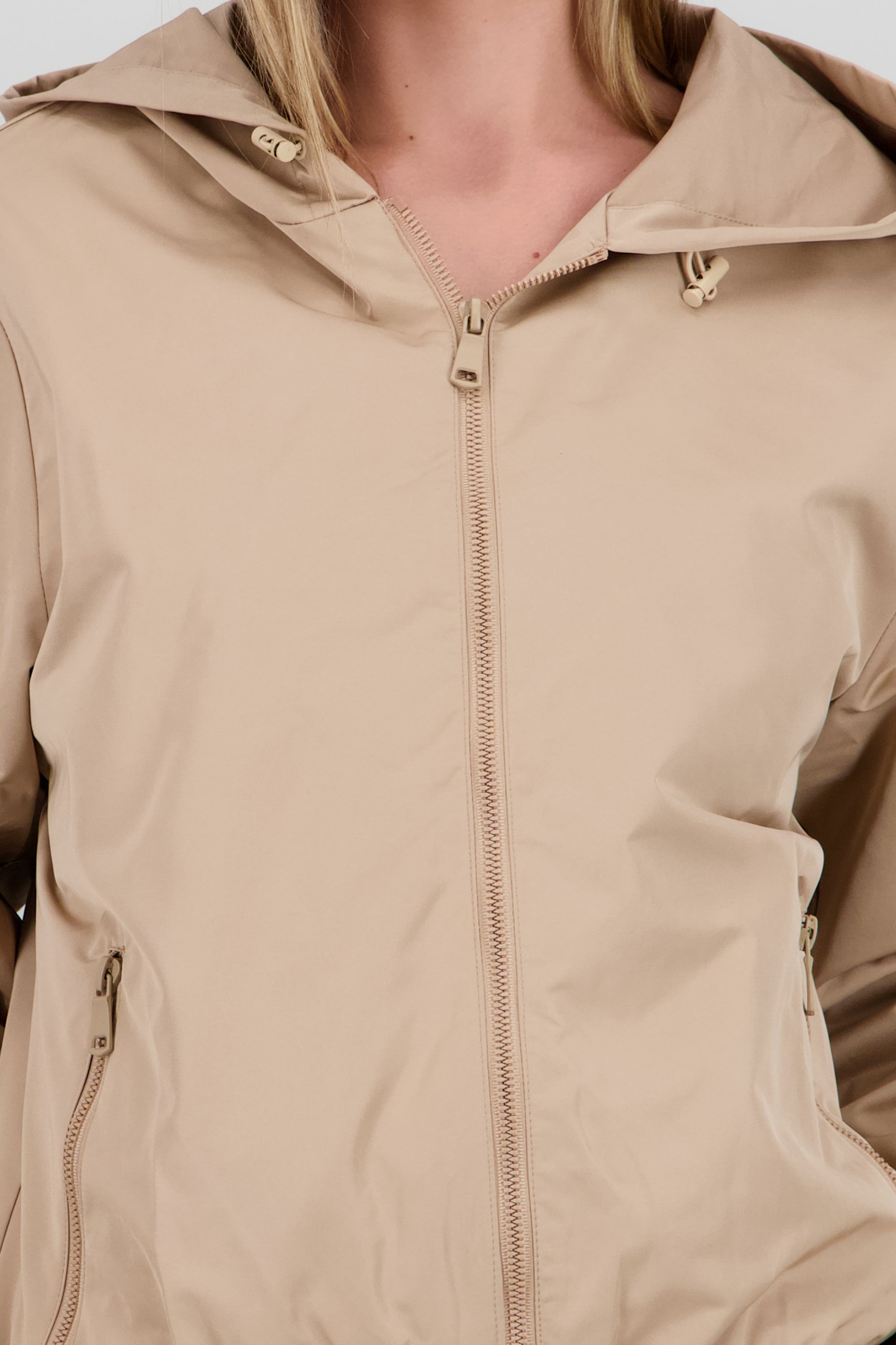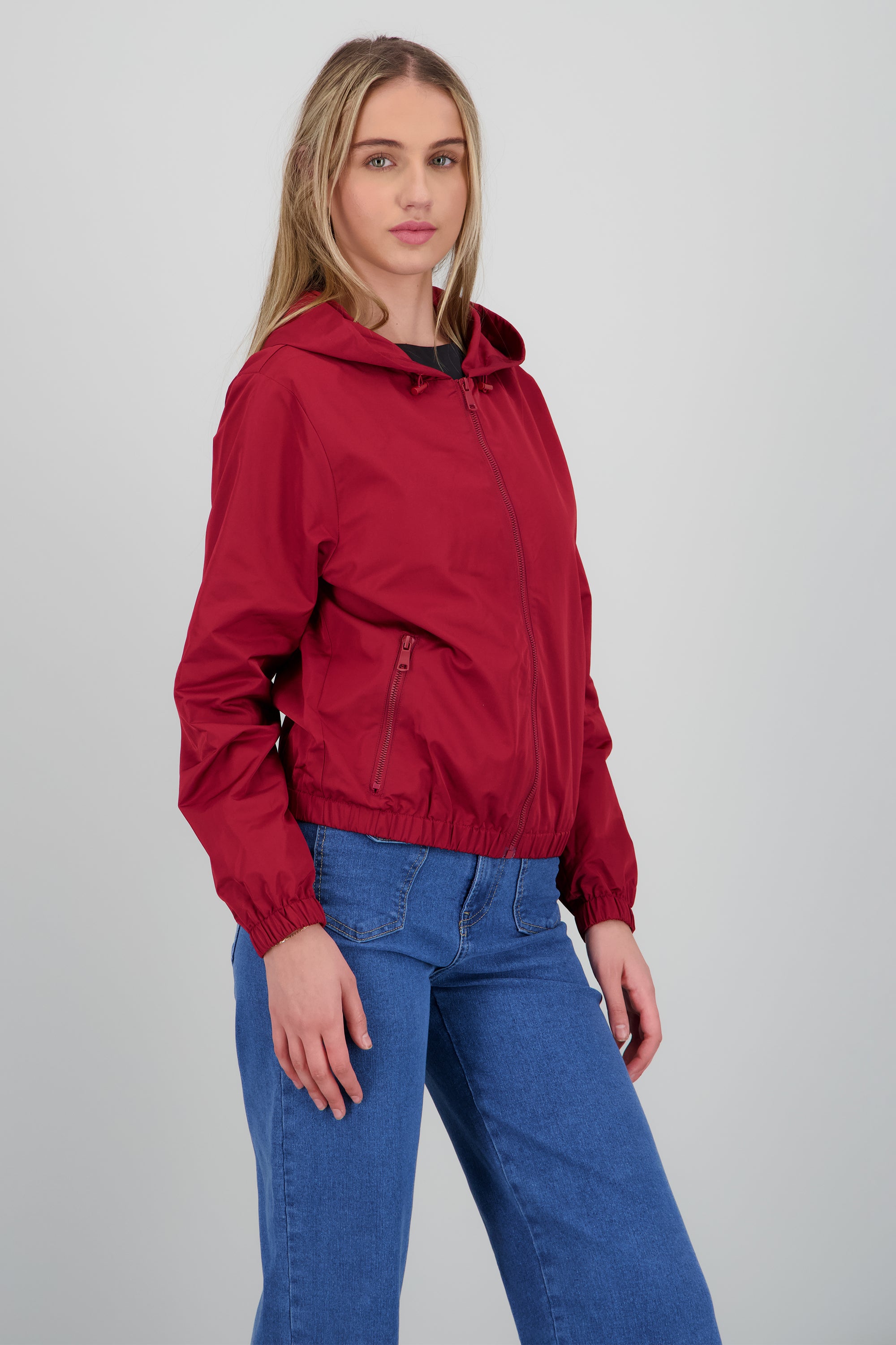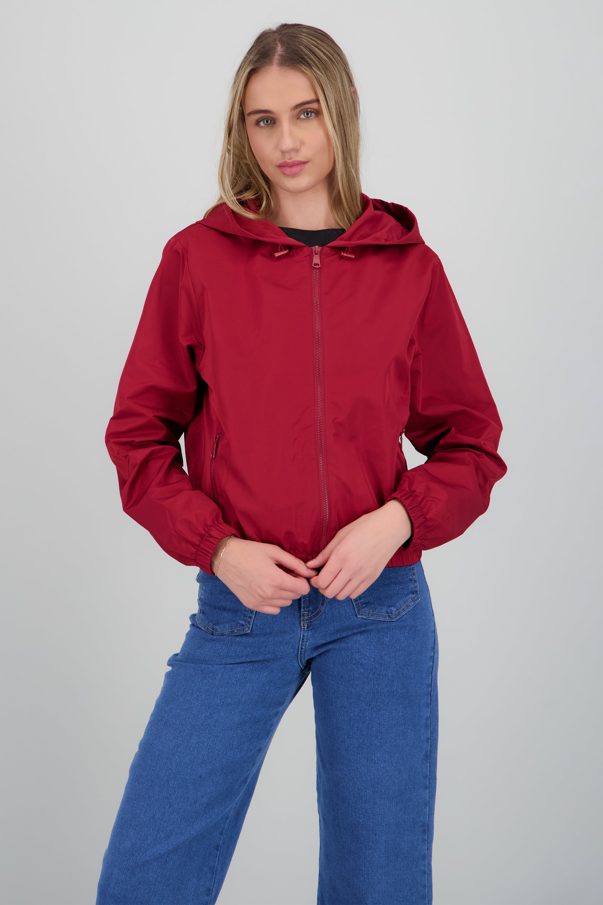 Chamarra ligera con gorro, corte ajustado, cierre frontal y bolsas laterales.