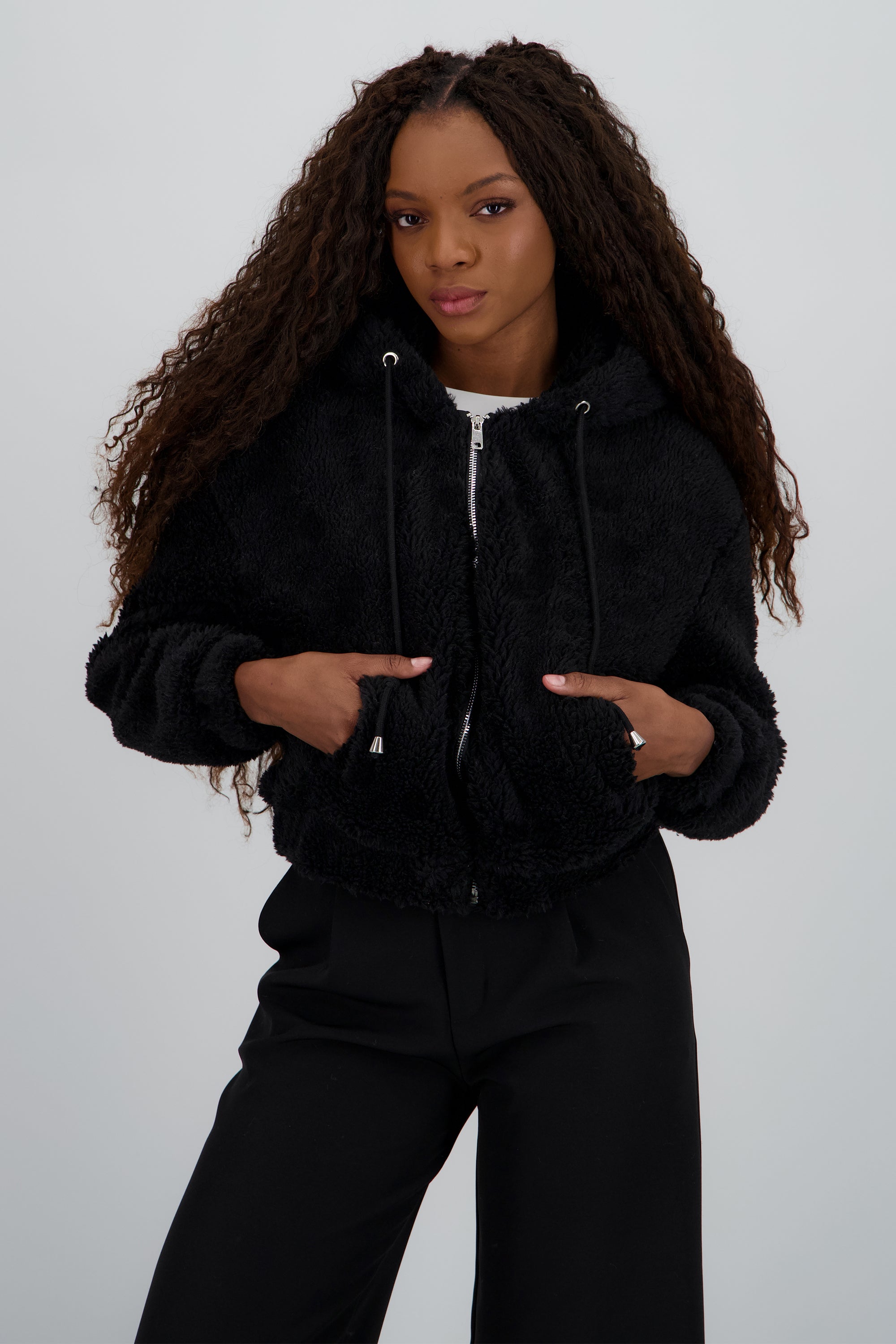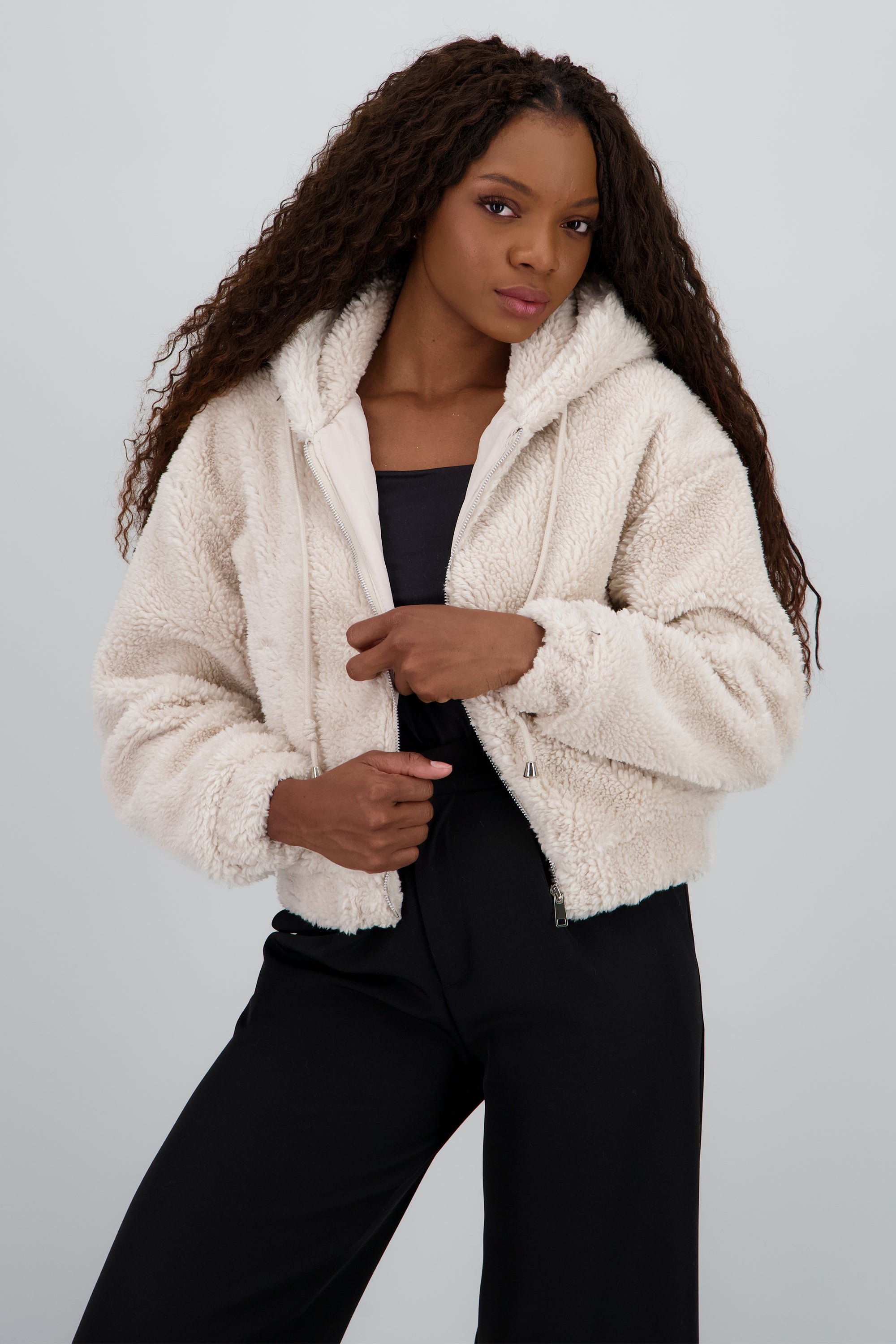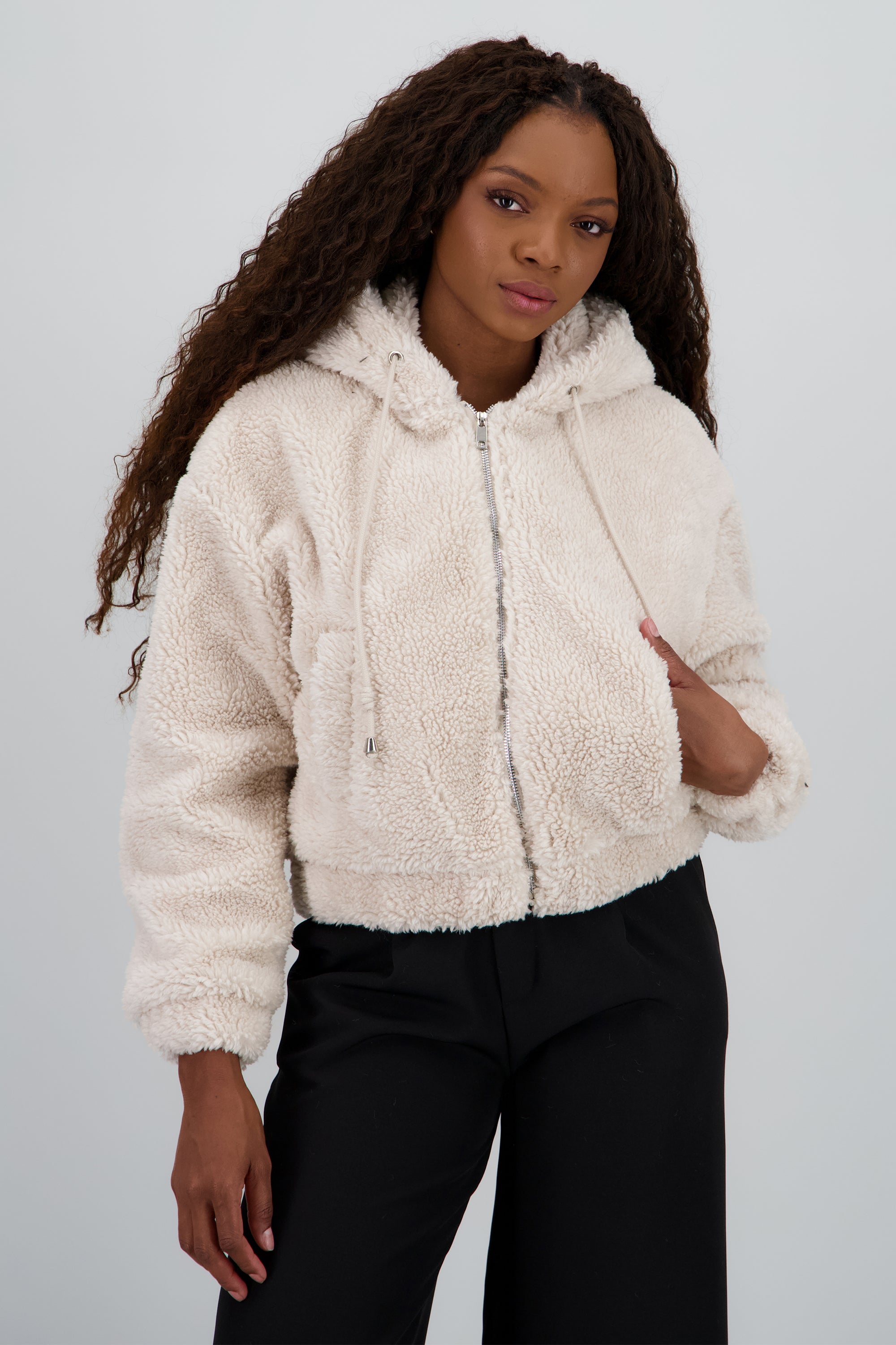 Chamarra de peluche suave con gorro integrado. Diseño acogedor, corte ajustado y bolsas laterales.
