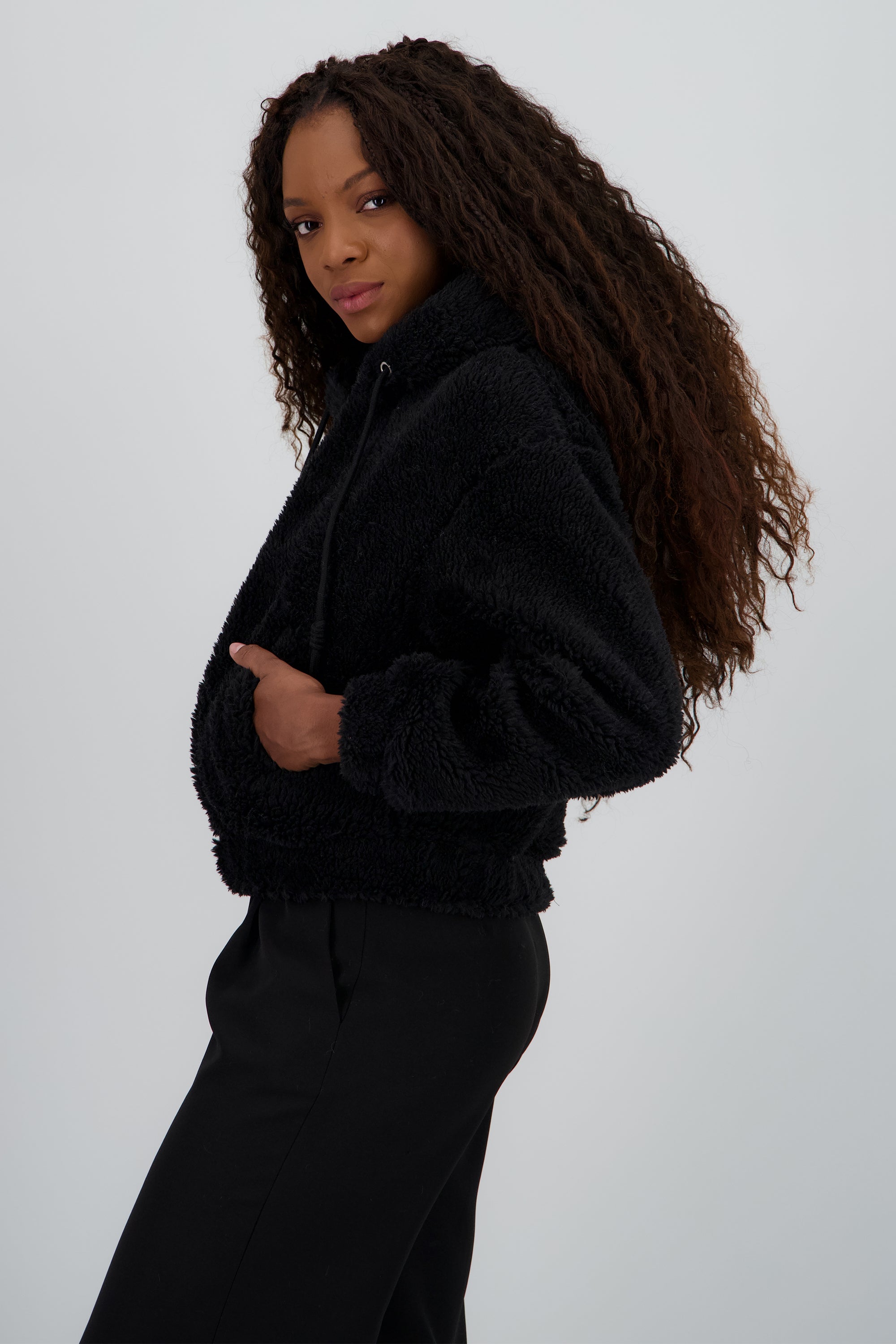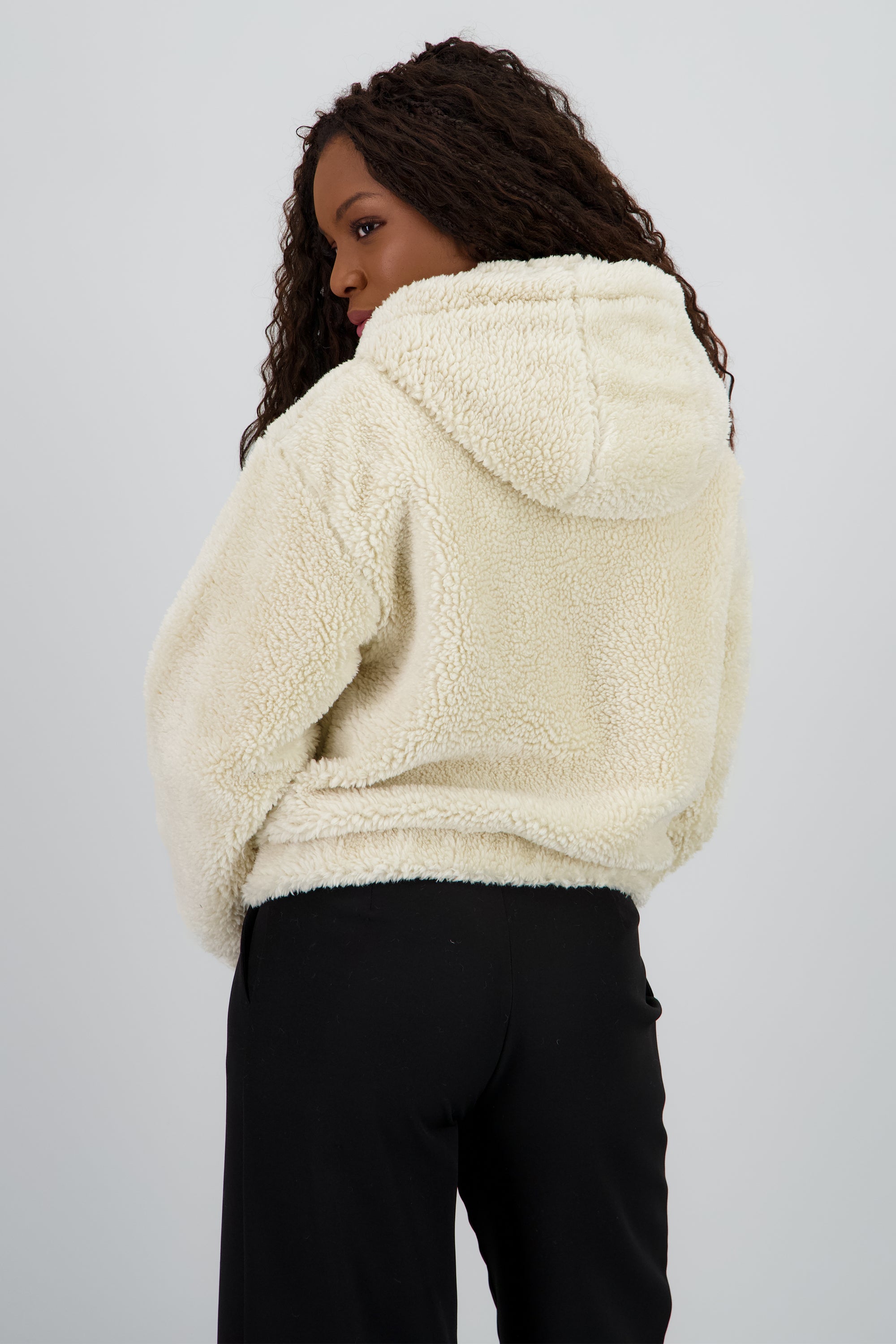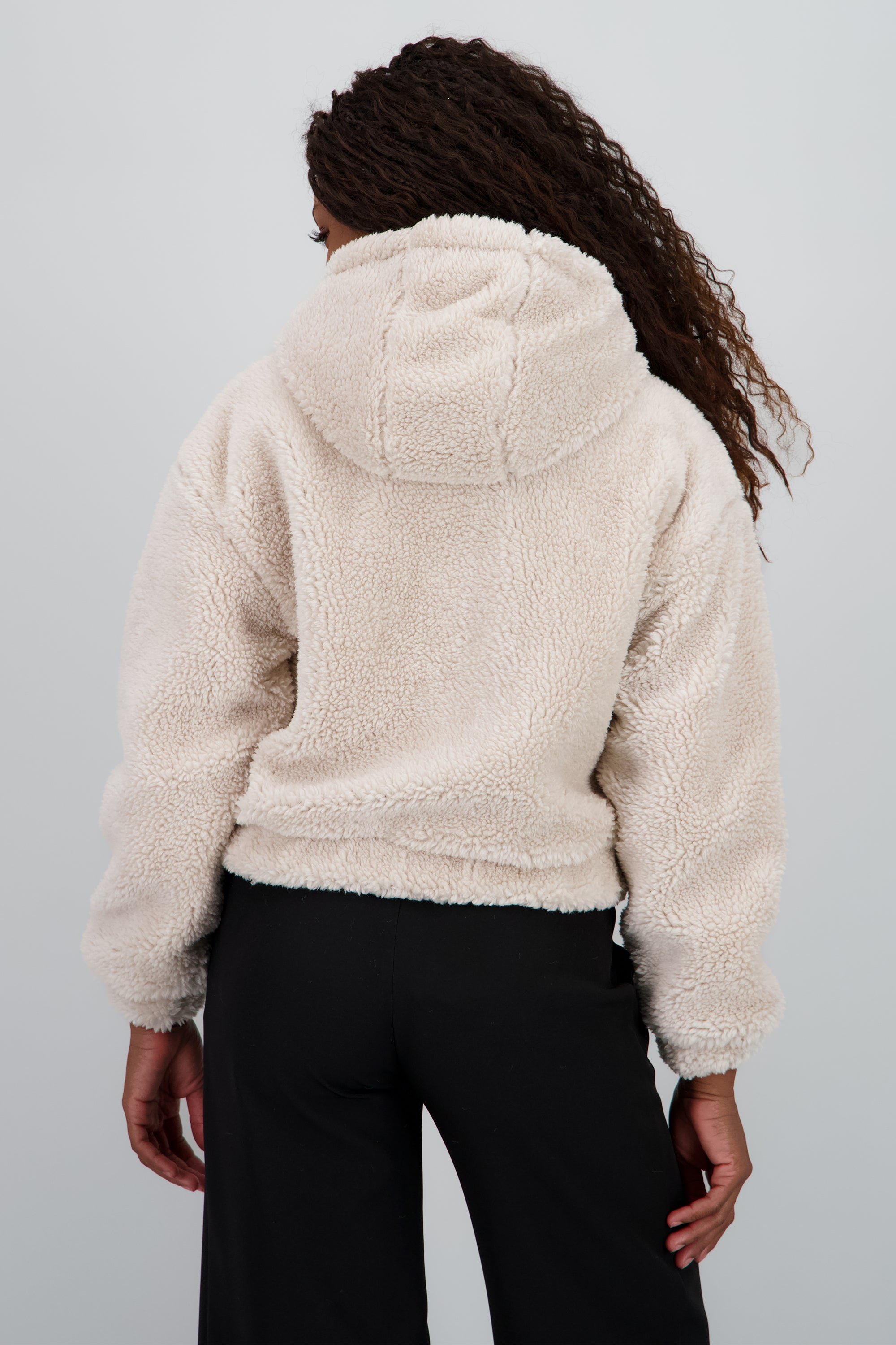 Chamarra de peluche suave con gorro integrado. Diseño acogedor, corte ajustado y bolsas laterales.