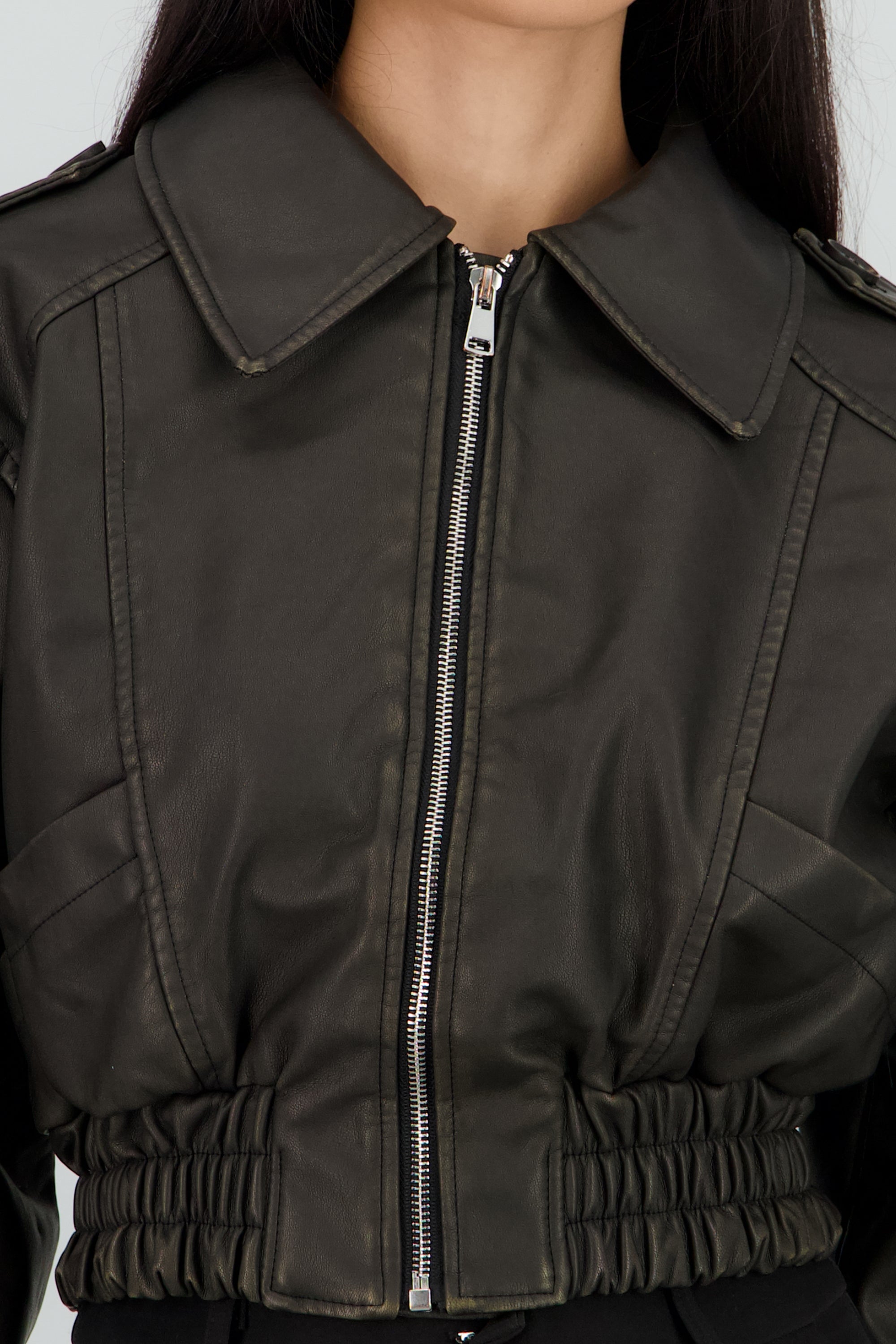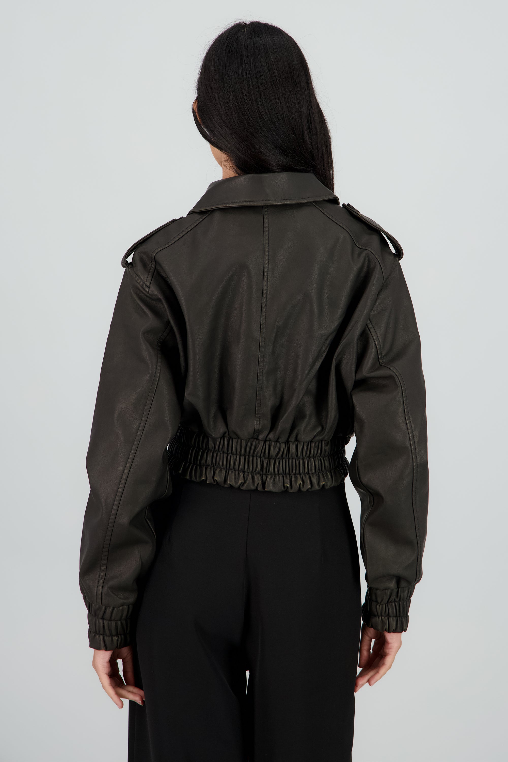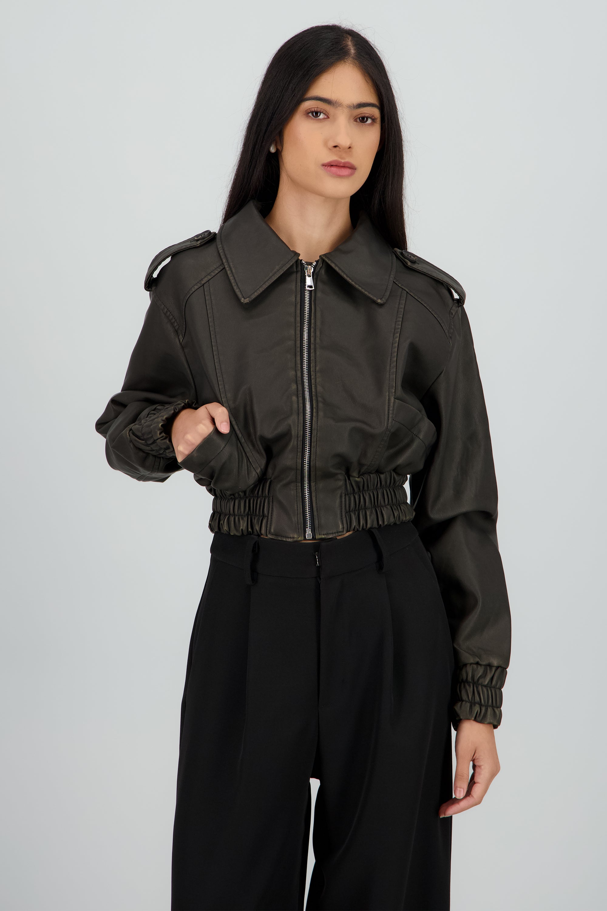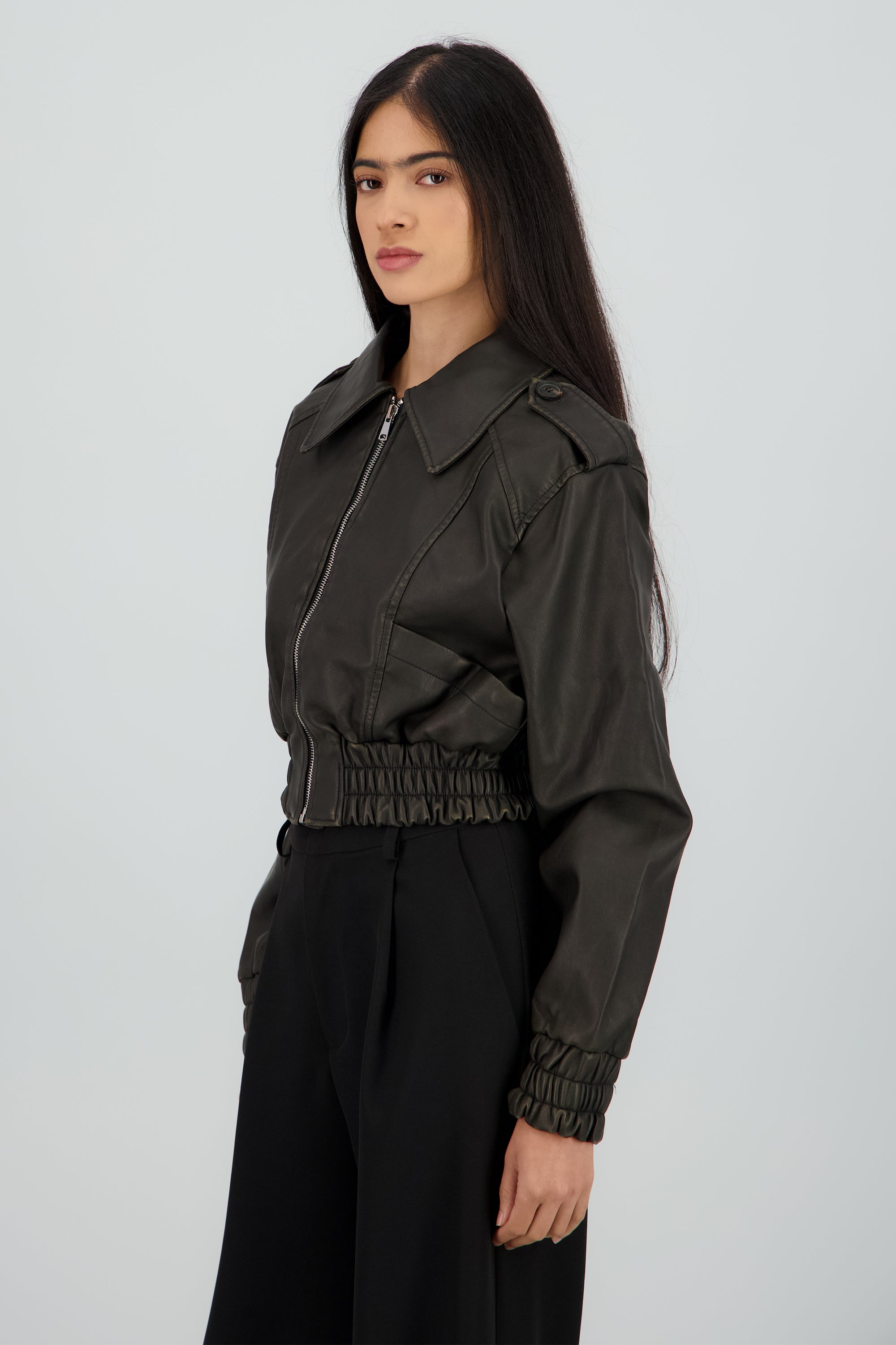 Chamarra de pu de corte ajustado, detalles en costuras visibles y cierre frontal. Puños y cintura con resorte.