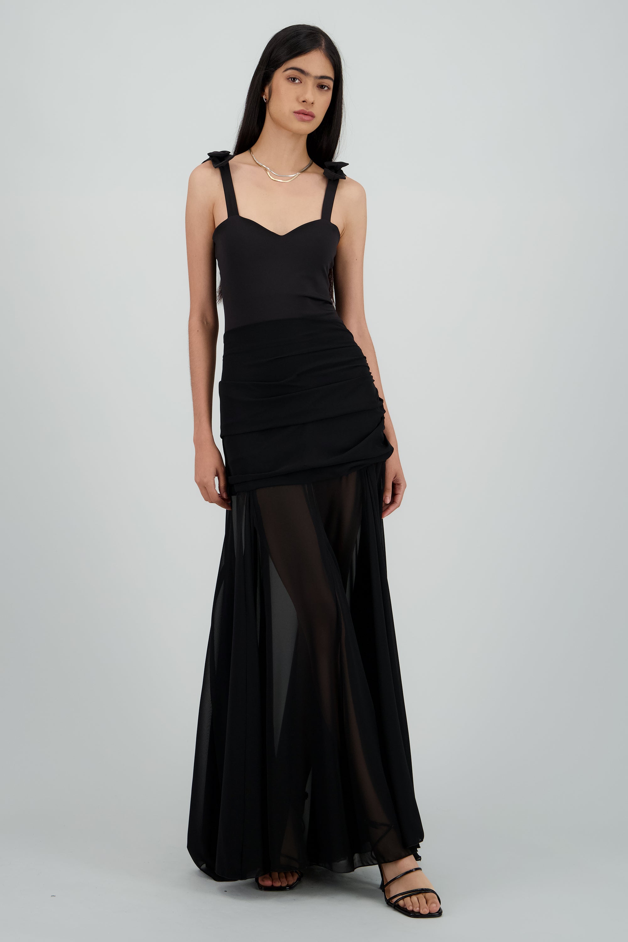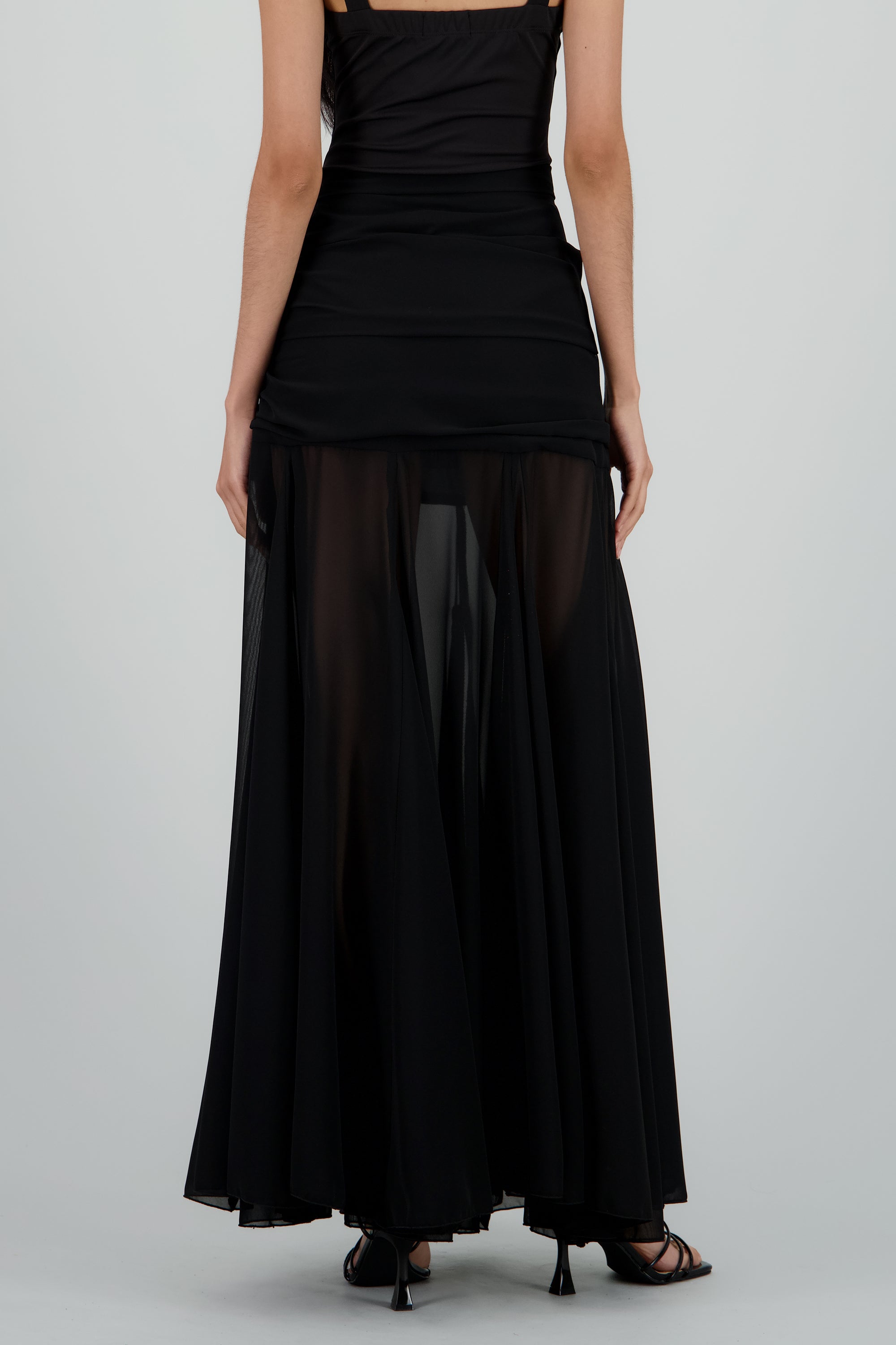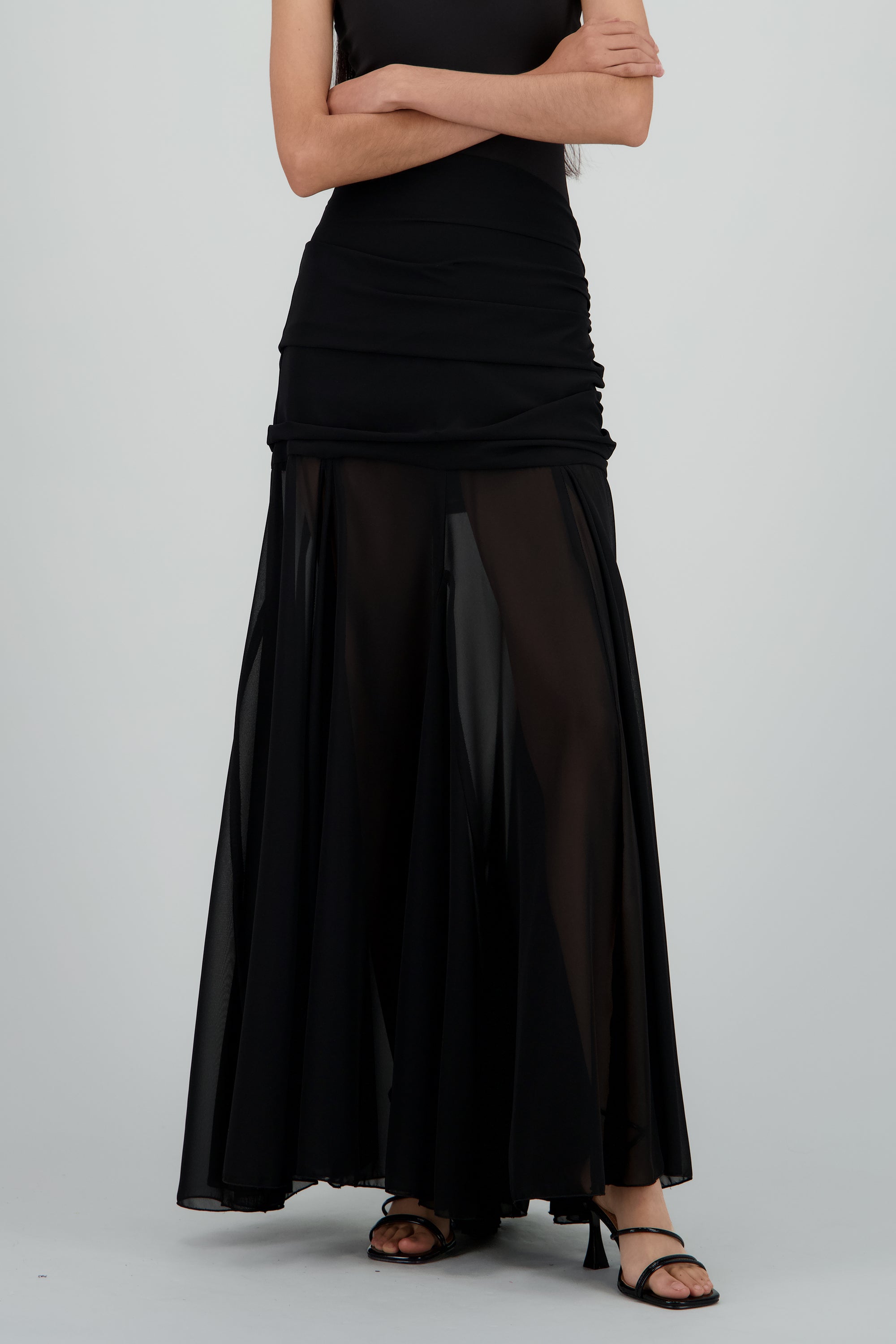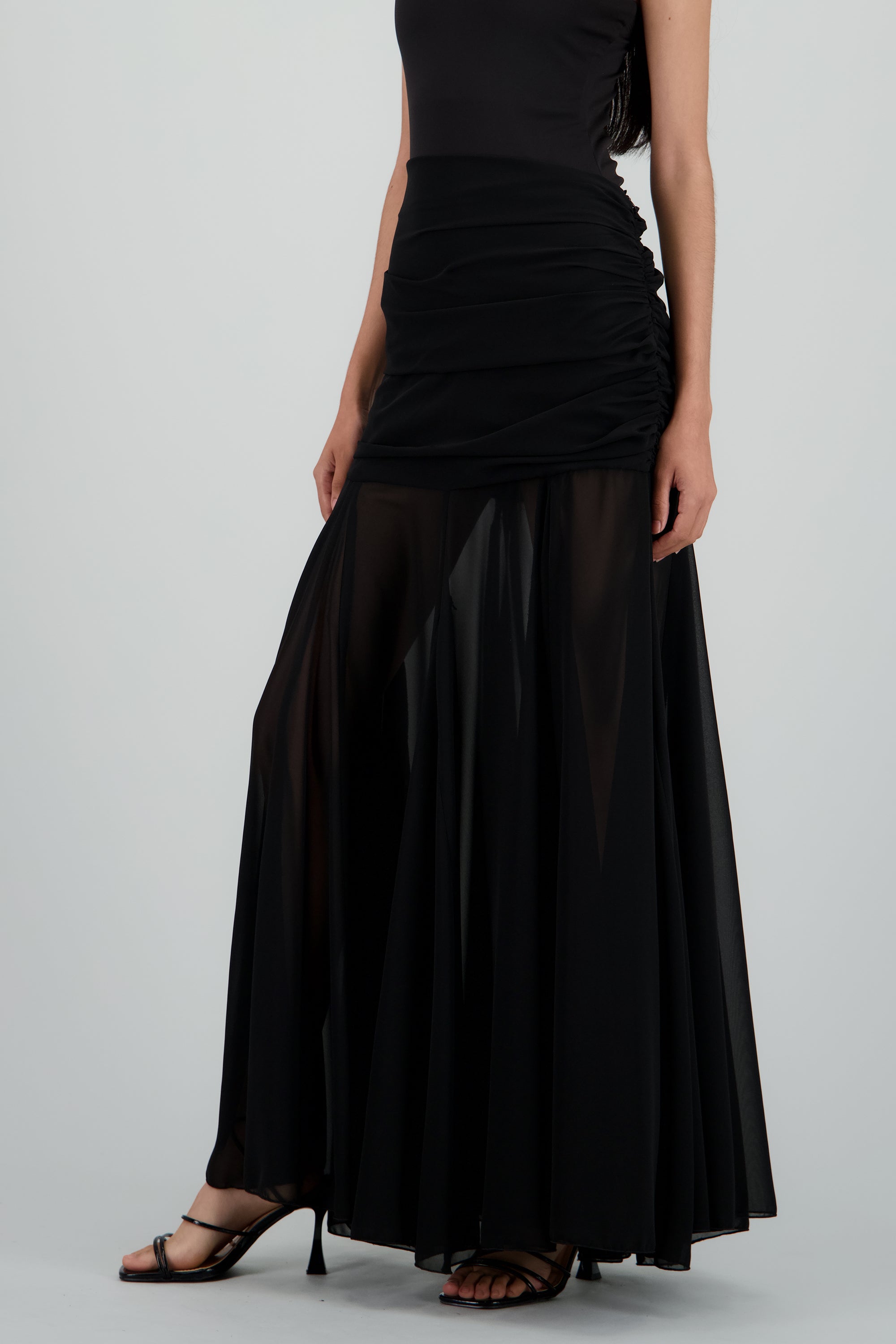 Falda maxi con detalle drapeado en la cintura. Con corte amplio, cintura alta, detalle en chiffon y diseño fluido.