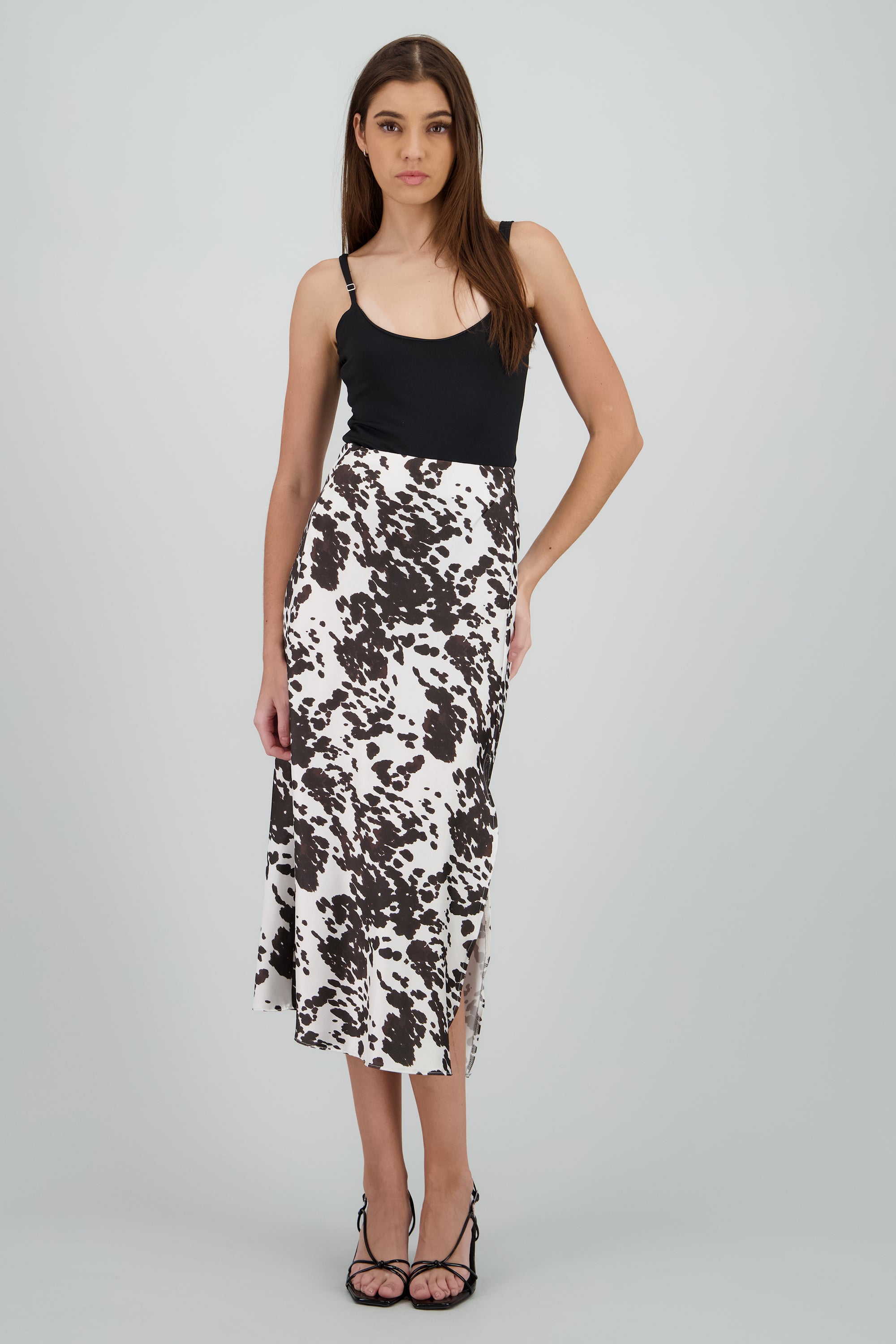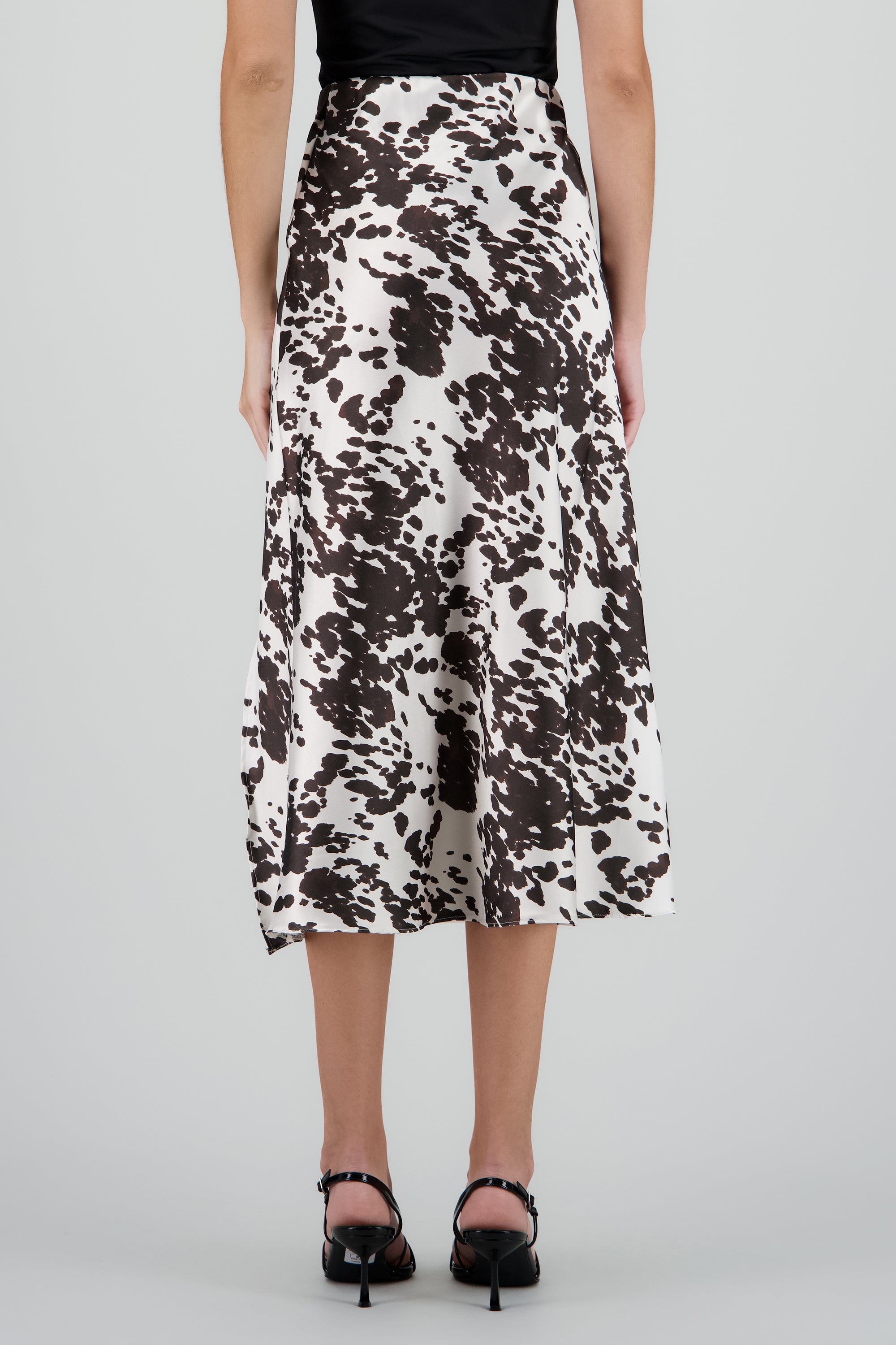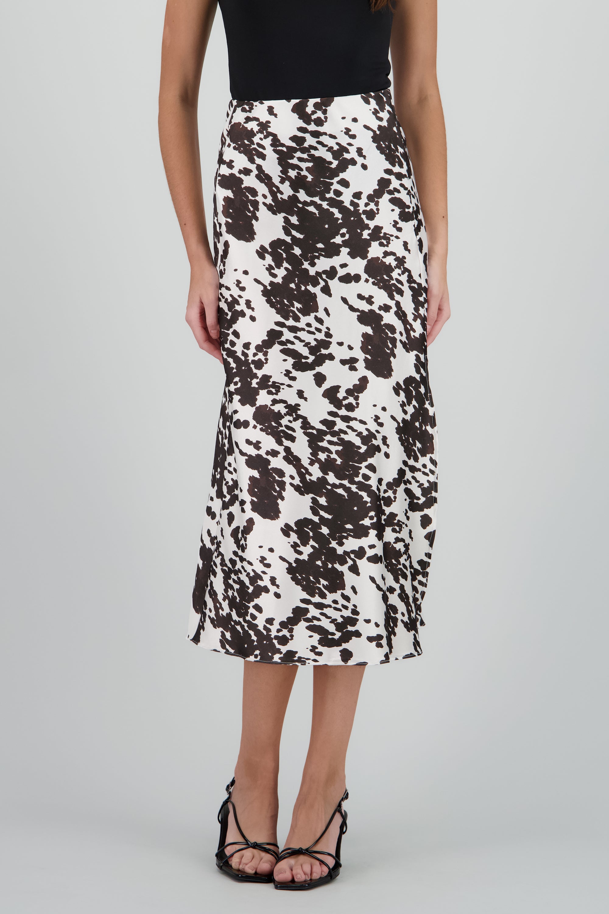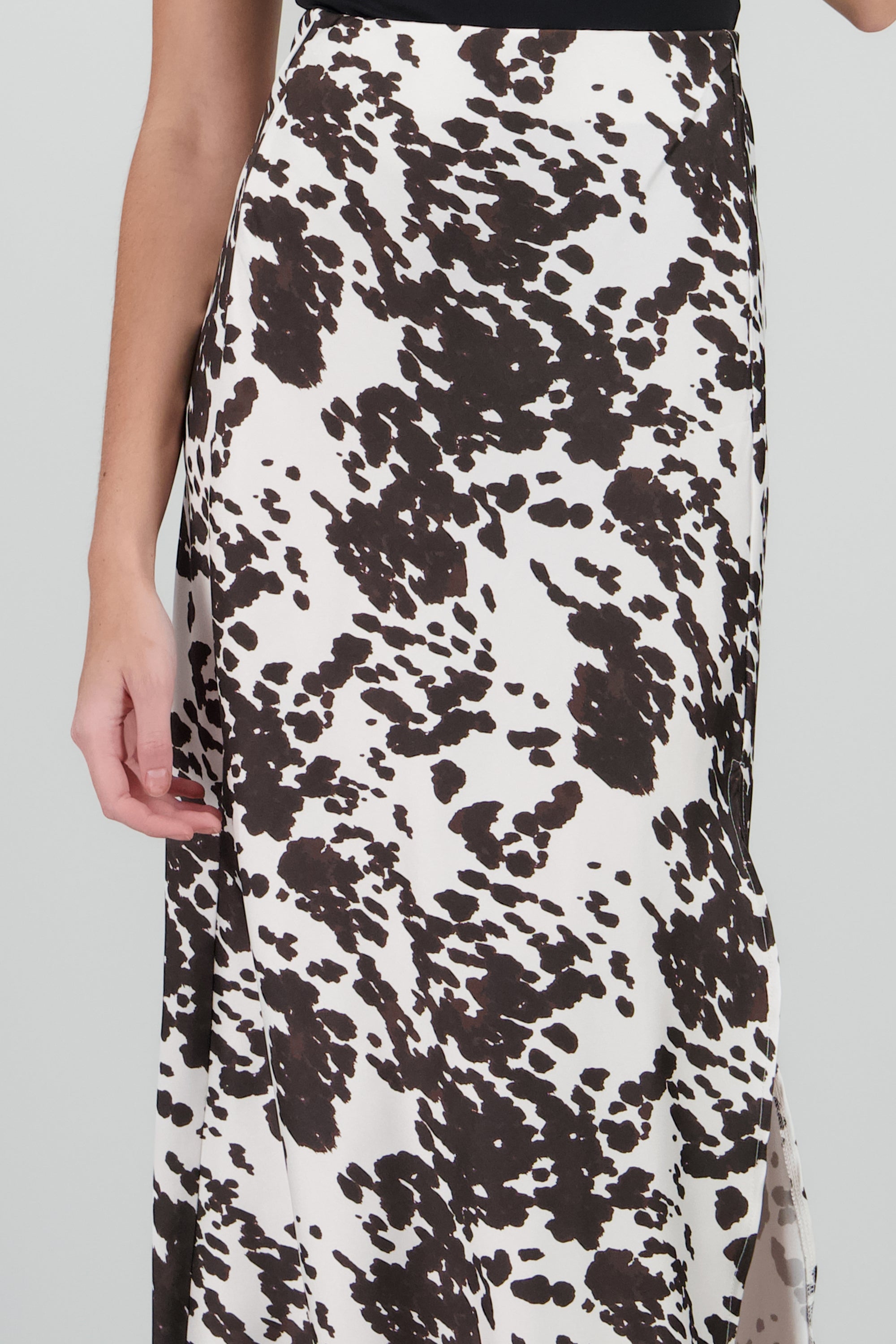 Falda maxi satinada con estampado de vaca. Corte ajustado y cintura alta.