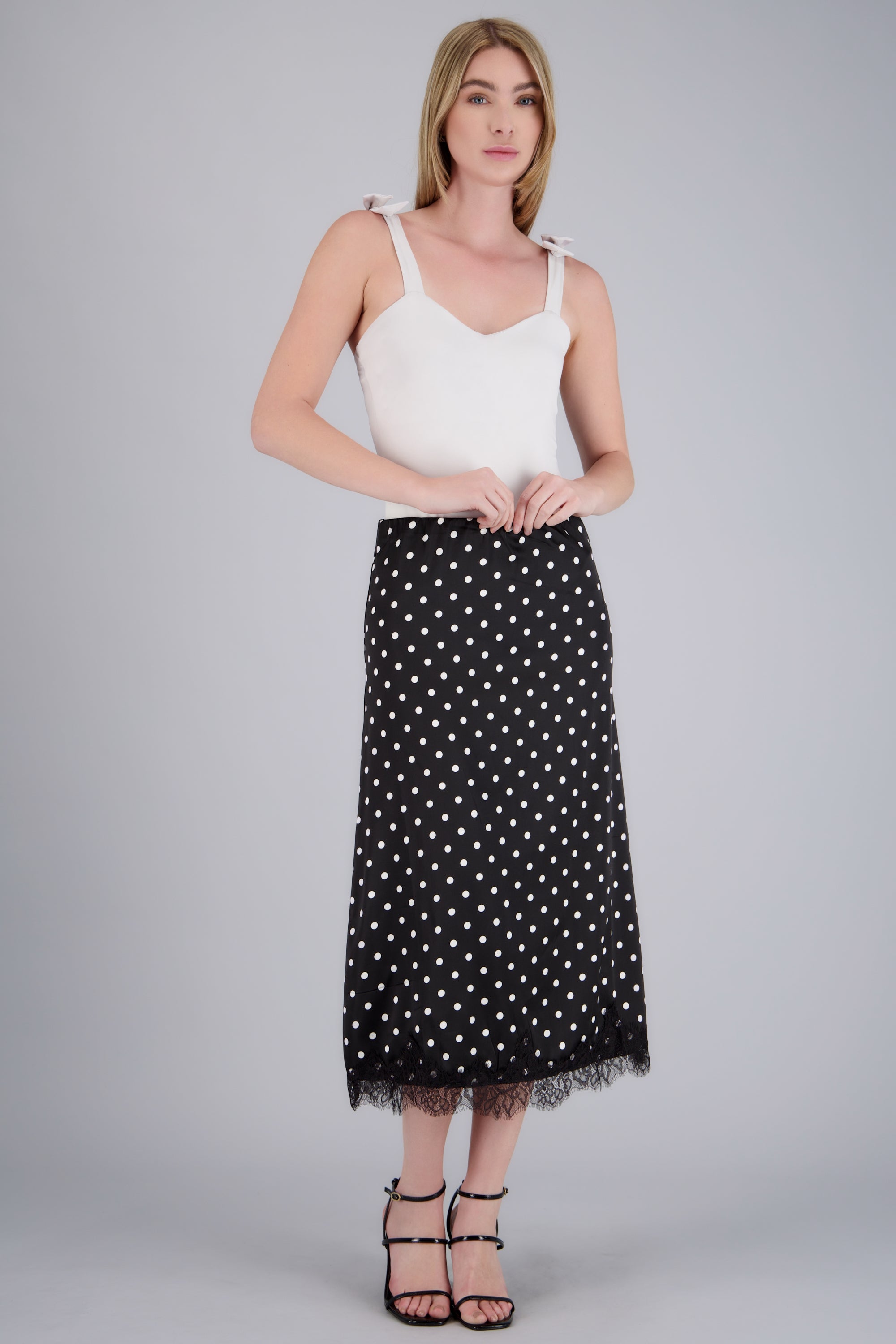 Falda midi con detalle de encaje y estampado de polka dots. Corte recto y cintura elástica.