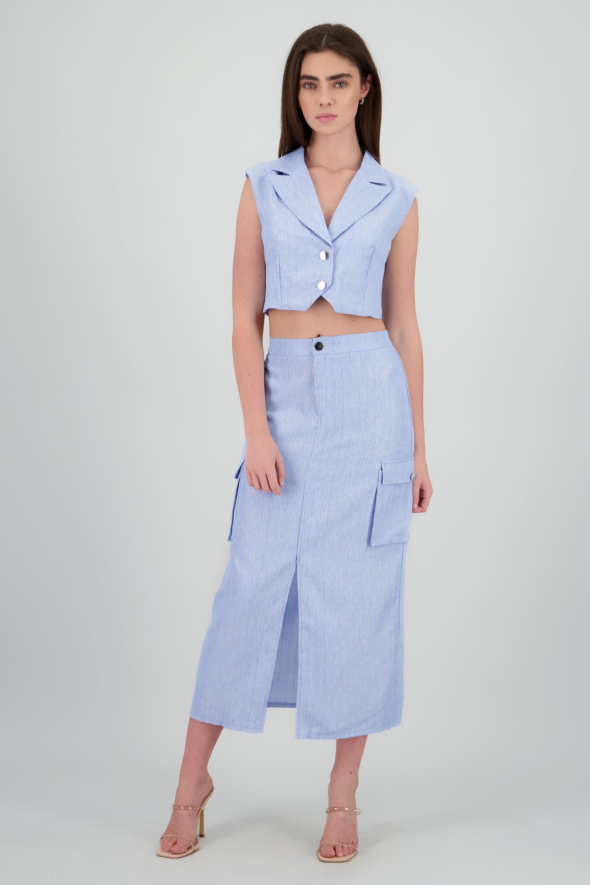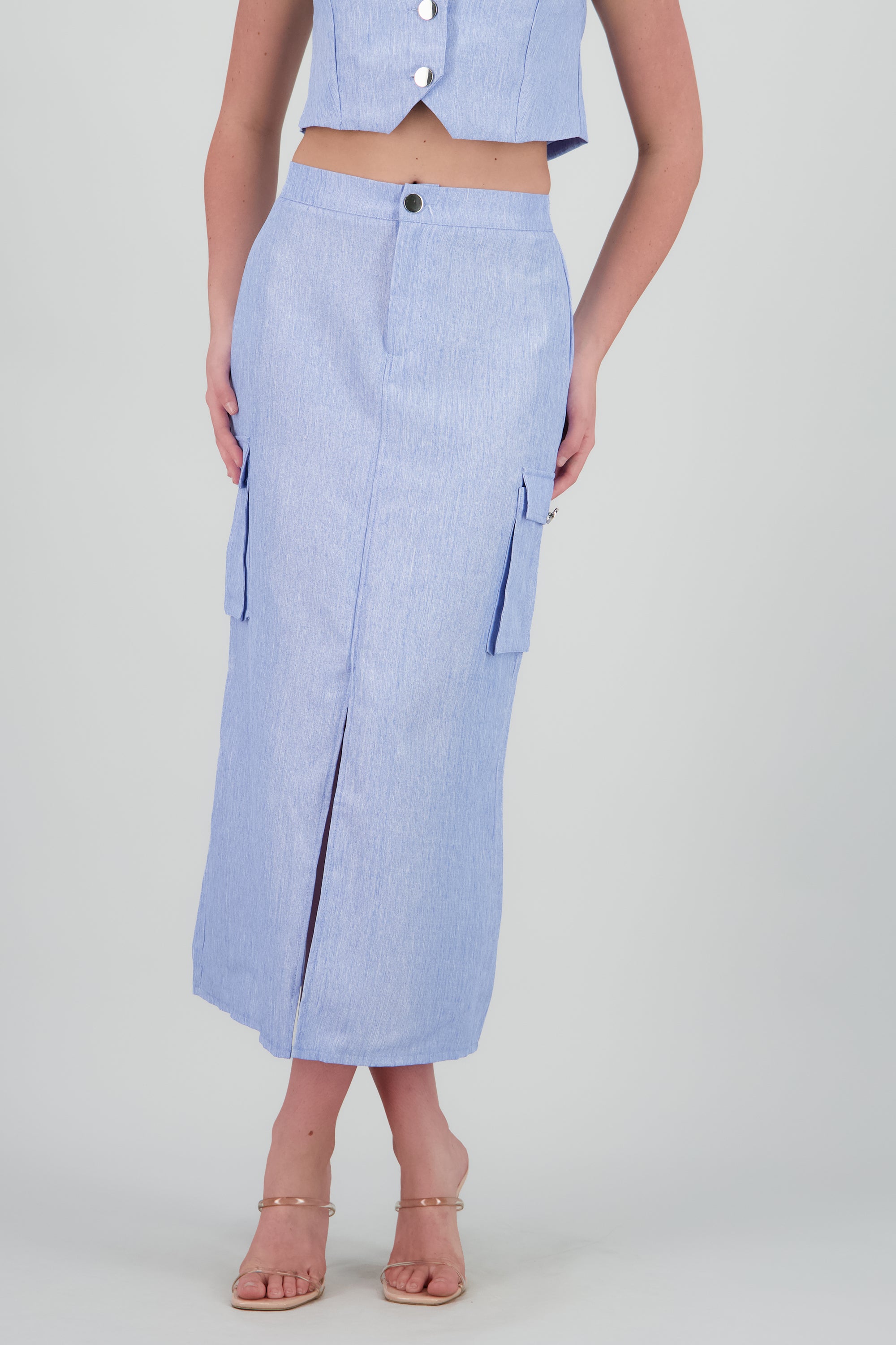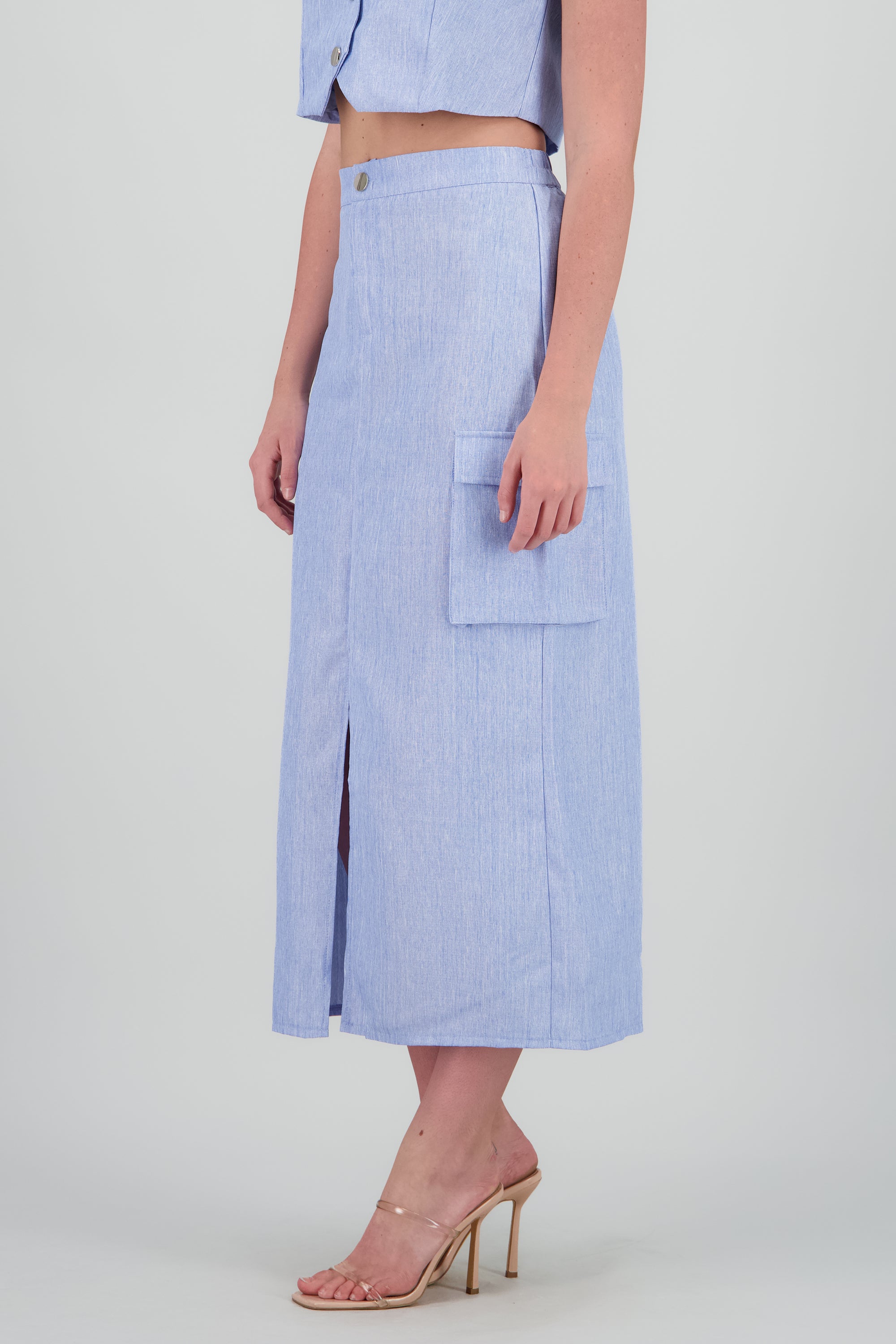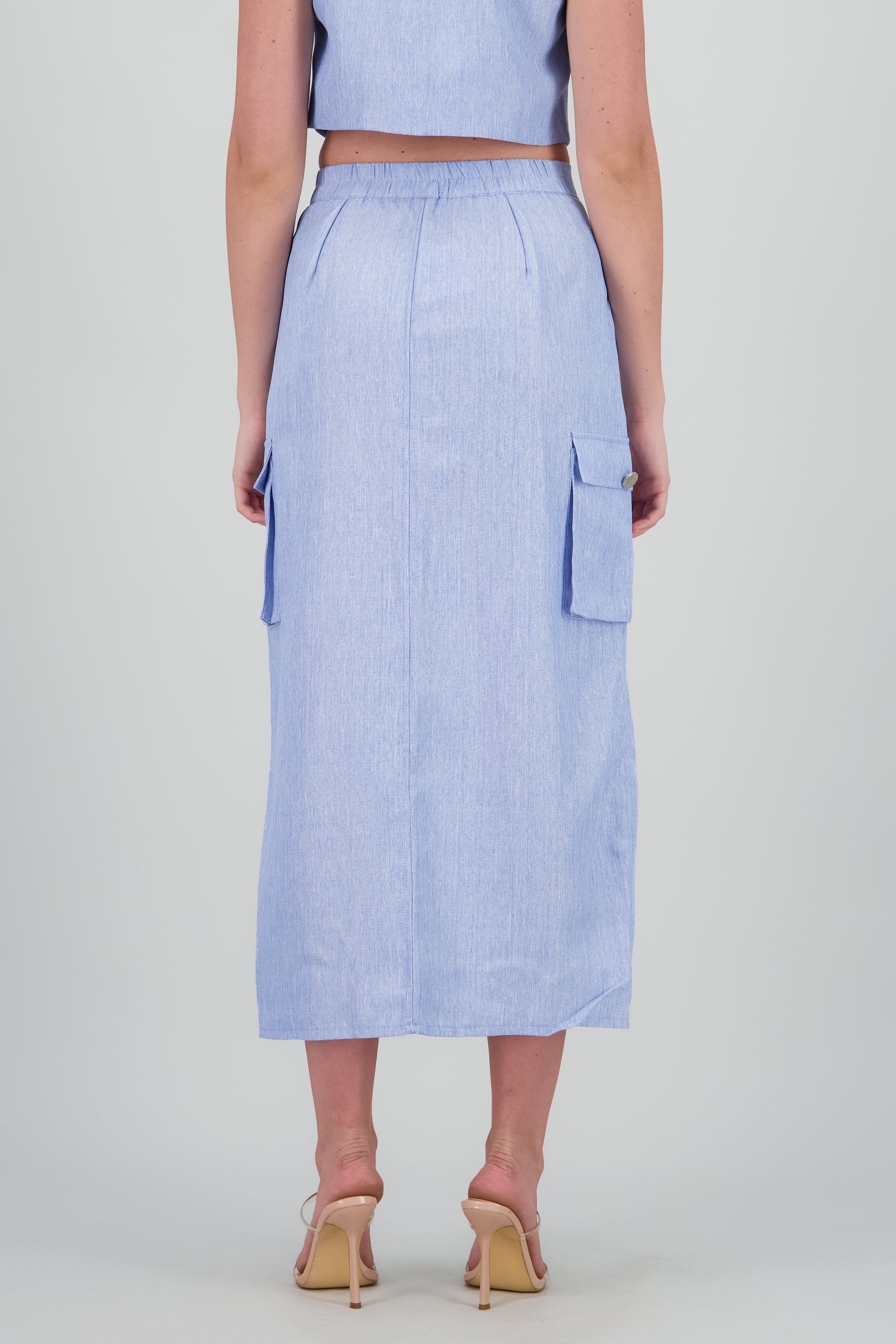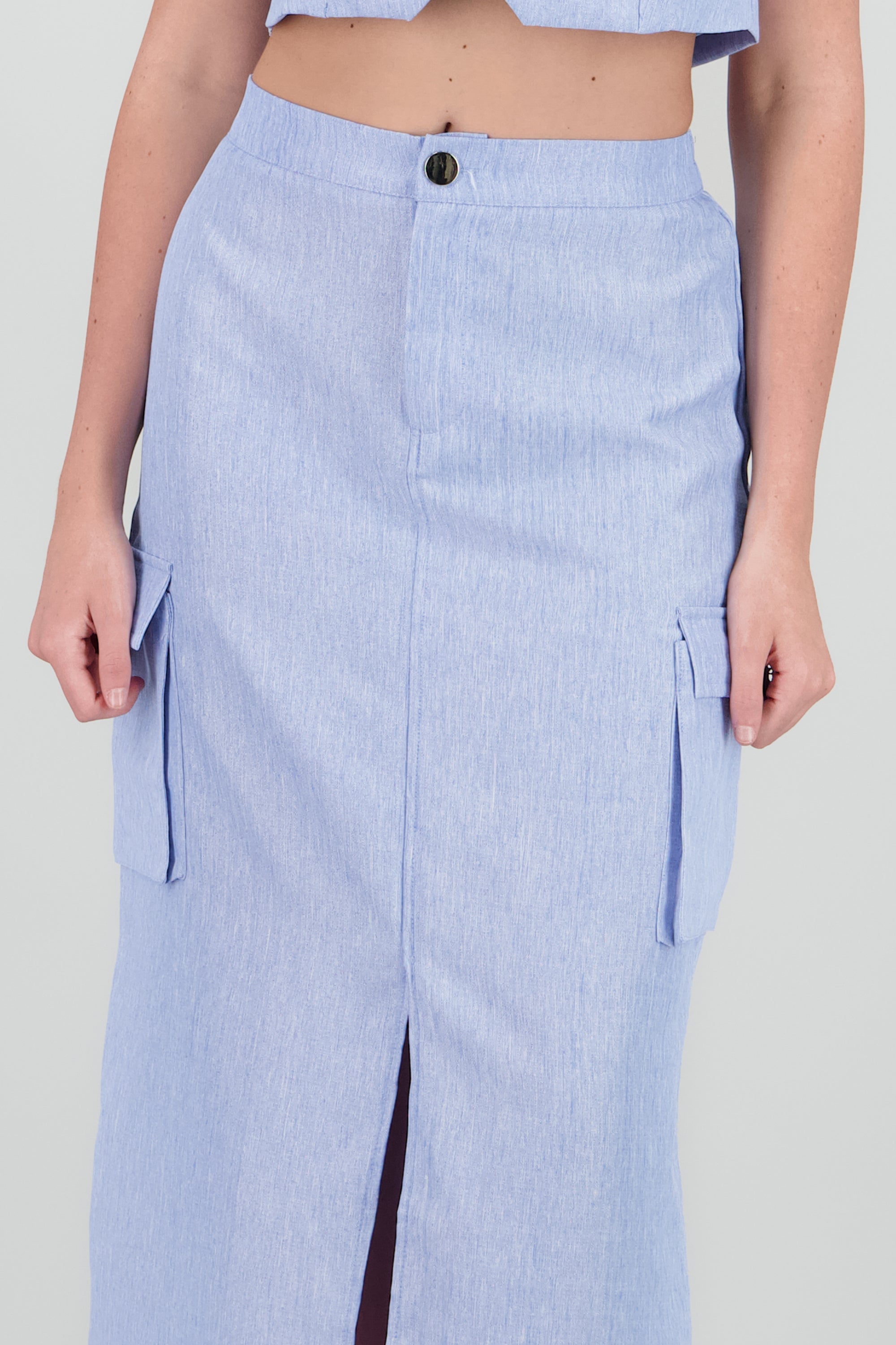 Falda midi con abertura frontaly bolsas cargo. Corte recto, cierre frontal con cremallera y botón.