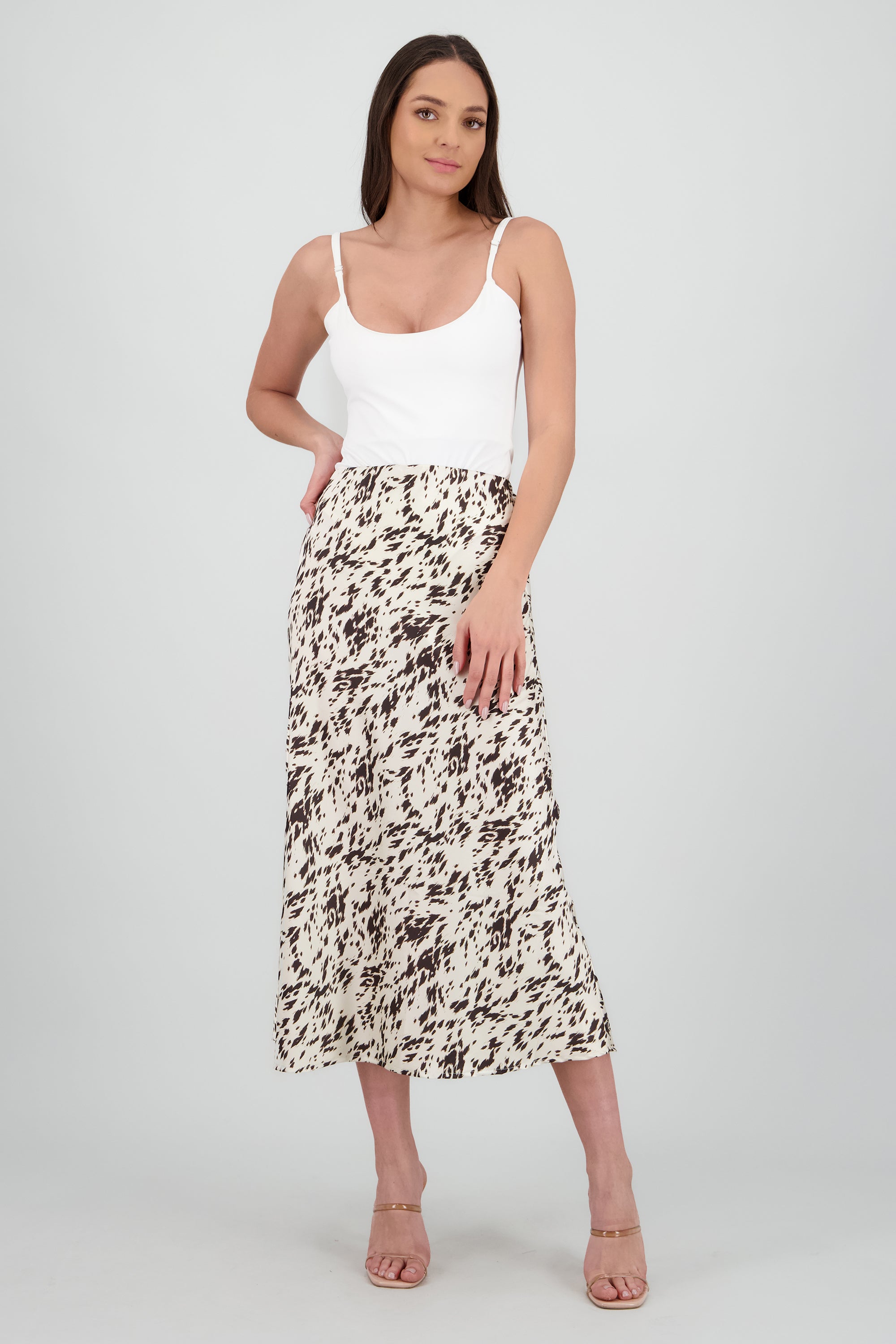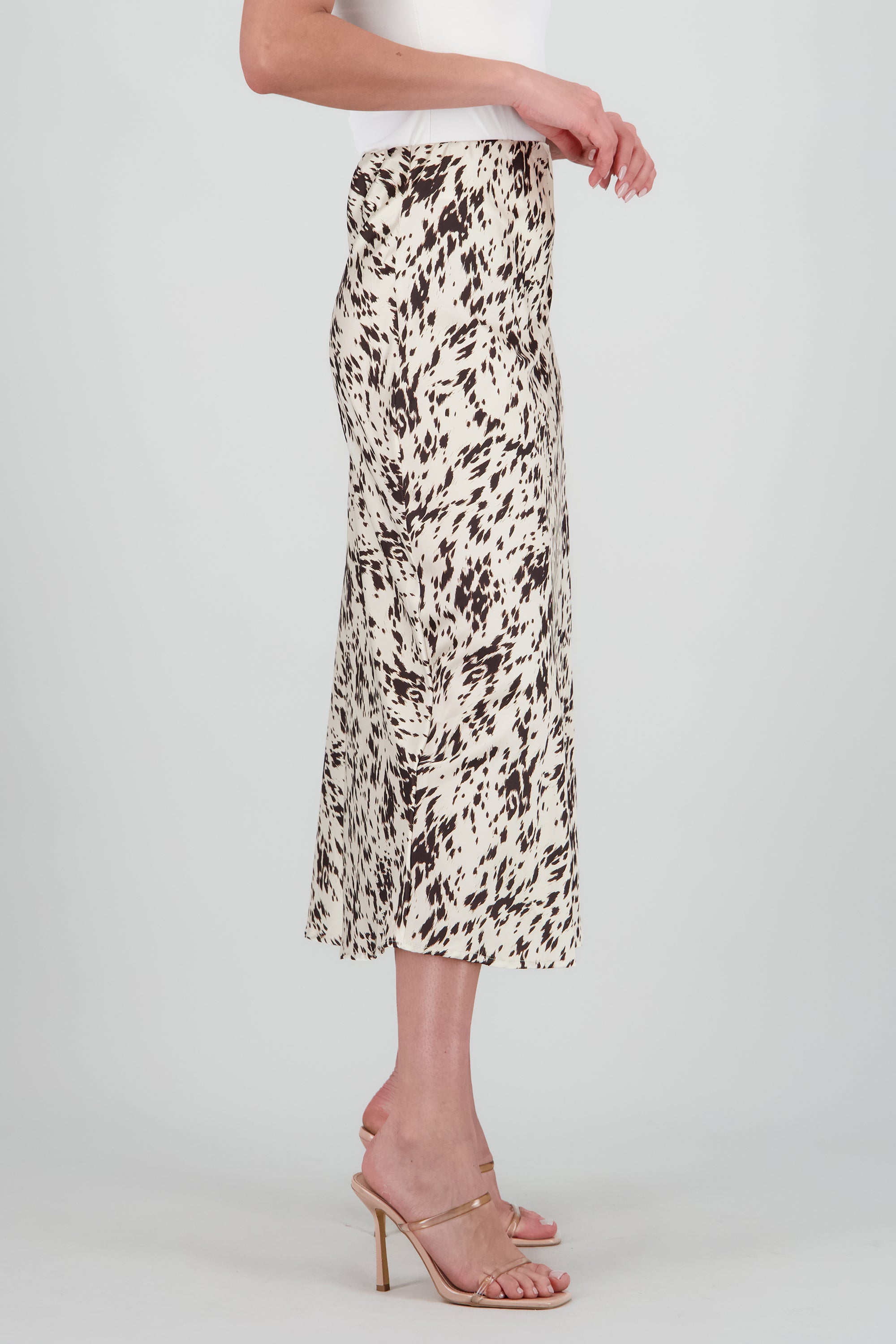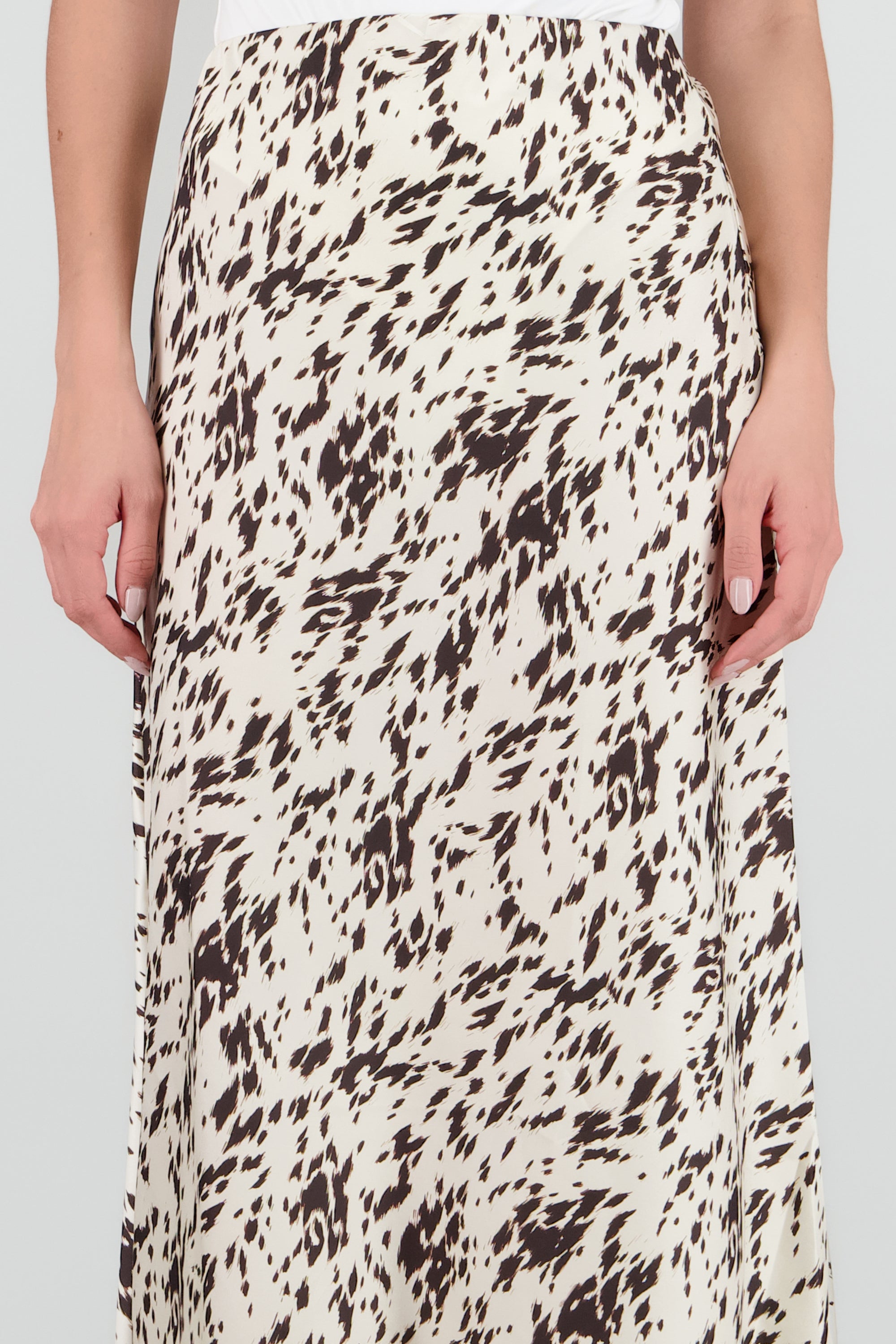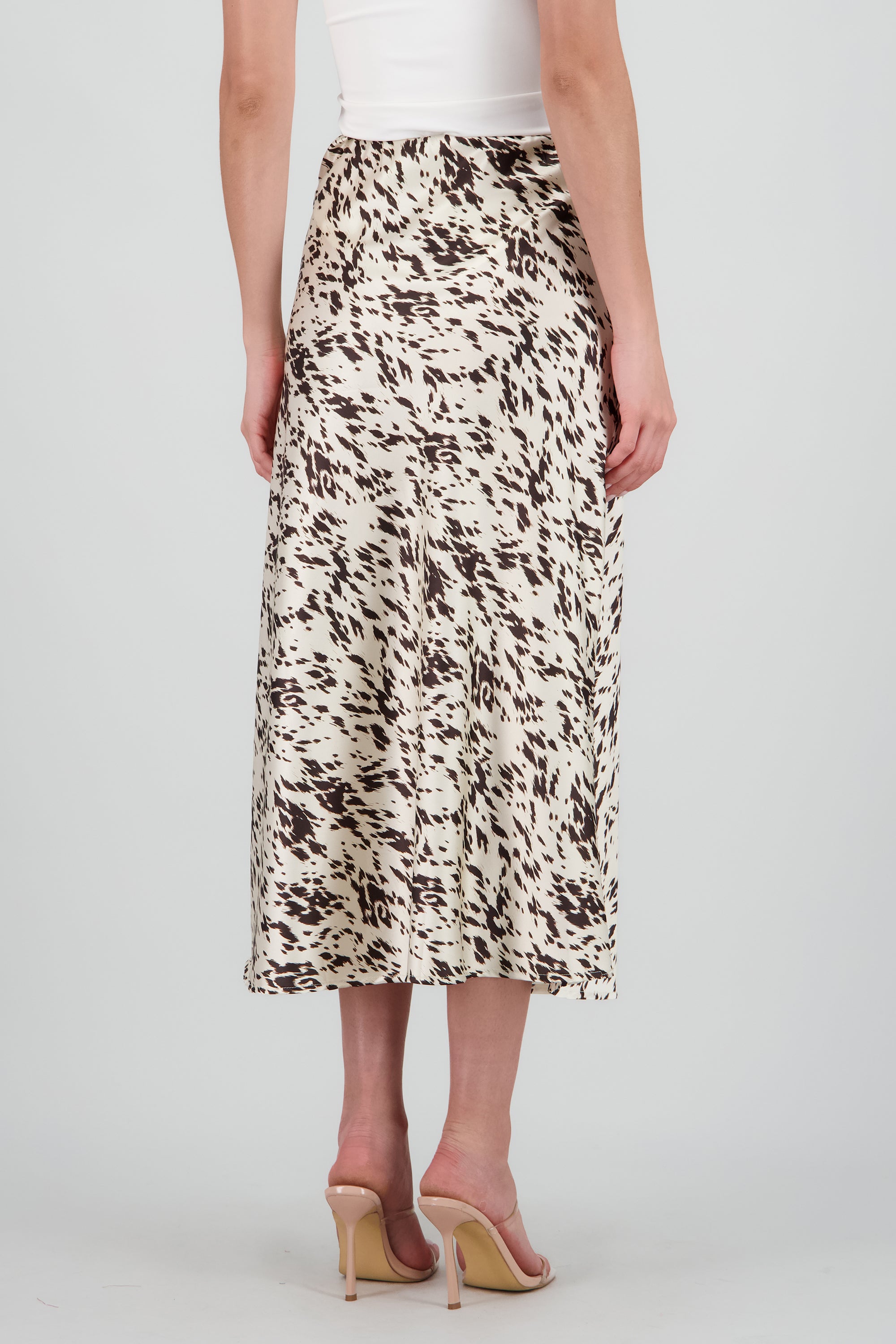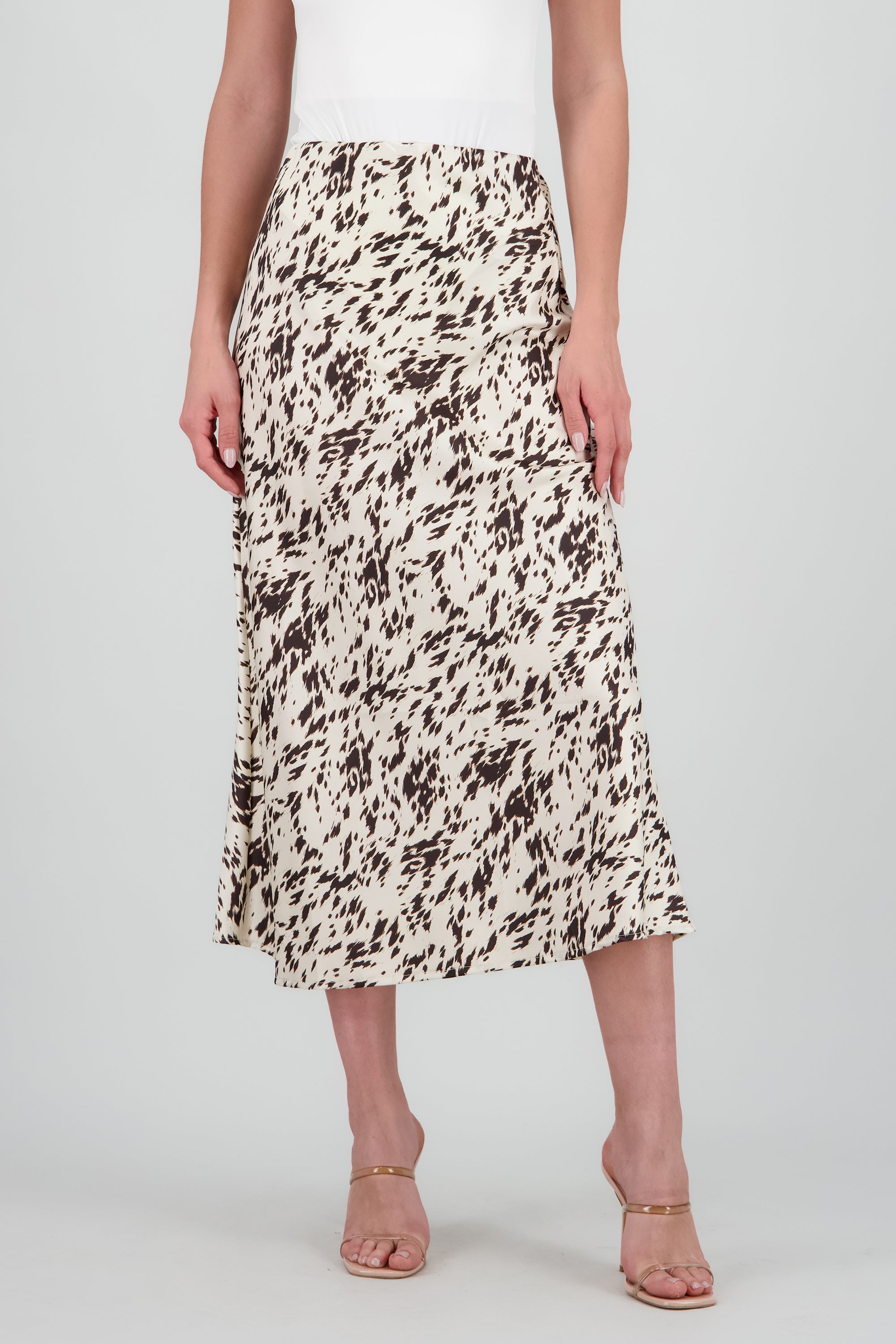 Falda midi de satén con estampado de manchas. Corte ajustado en la cintura y fluido.