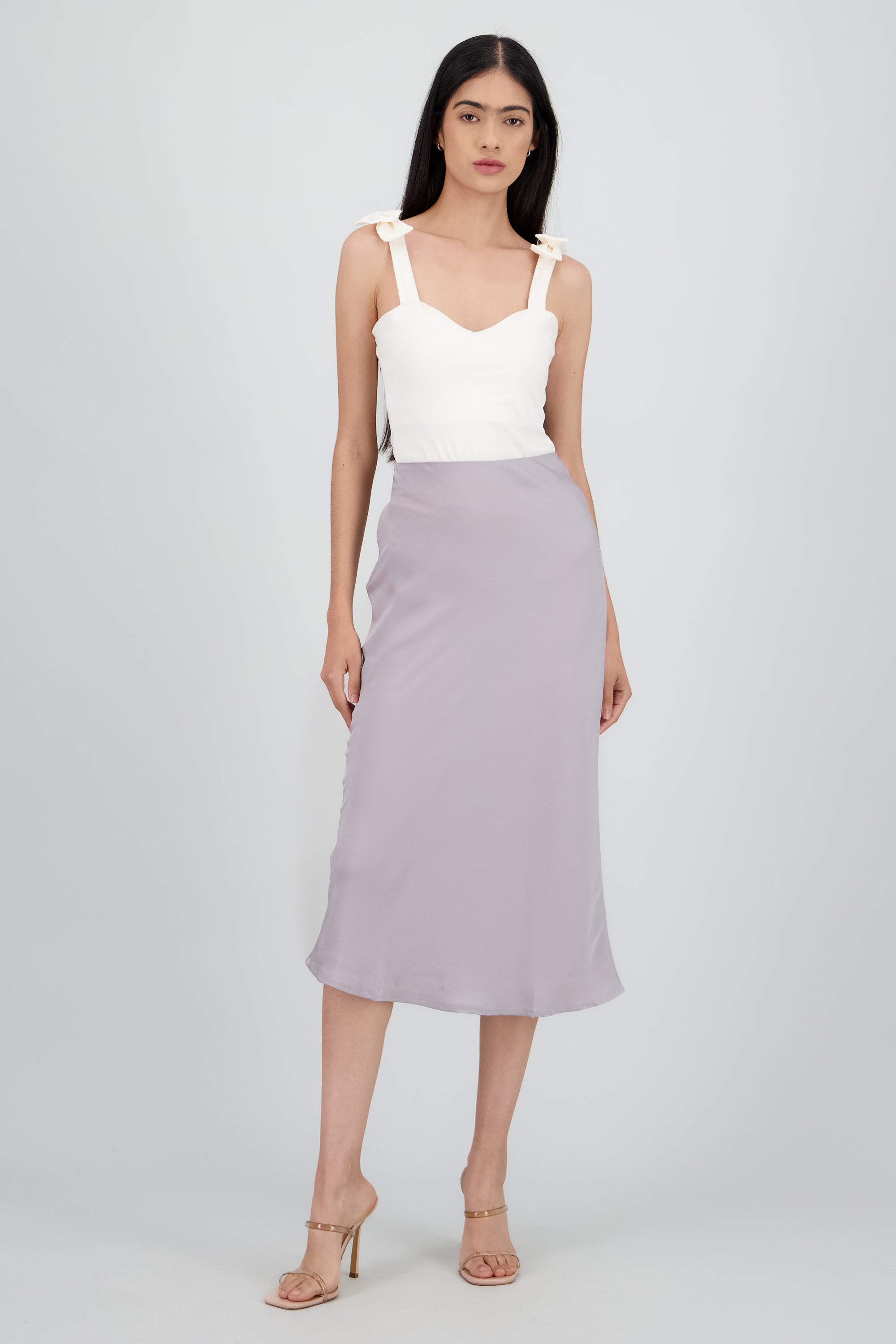 Falda midi satinada con corte recto, cintura ajustada y cierre lateral de cremallera.