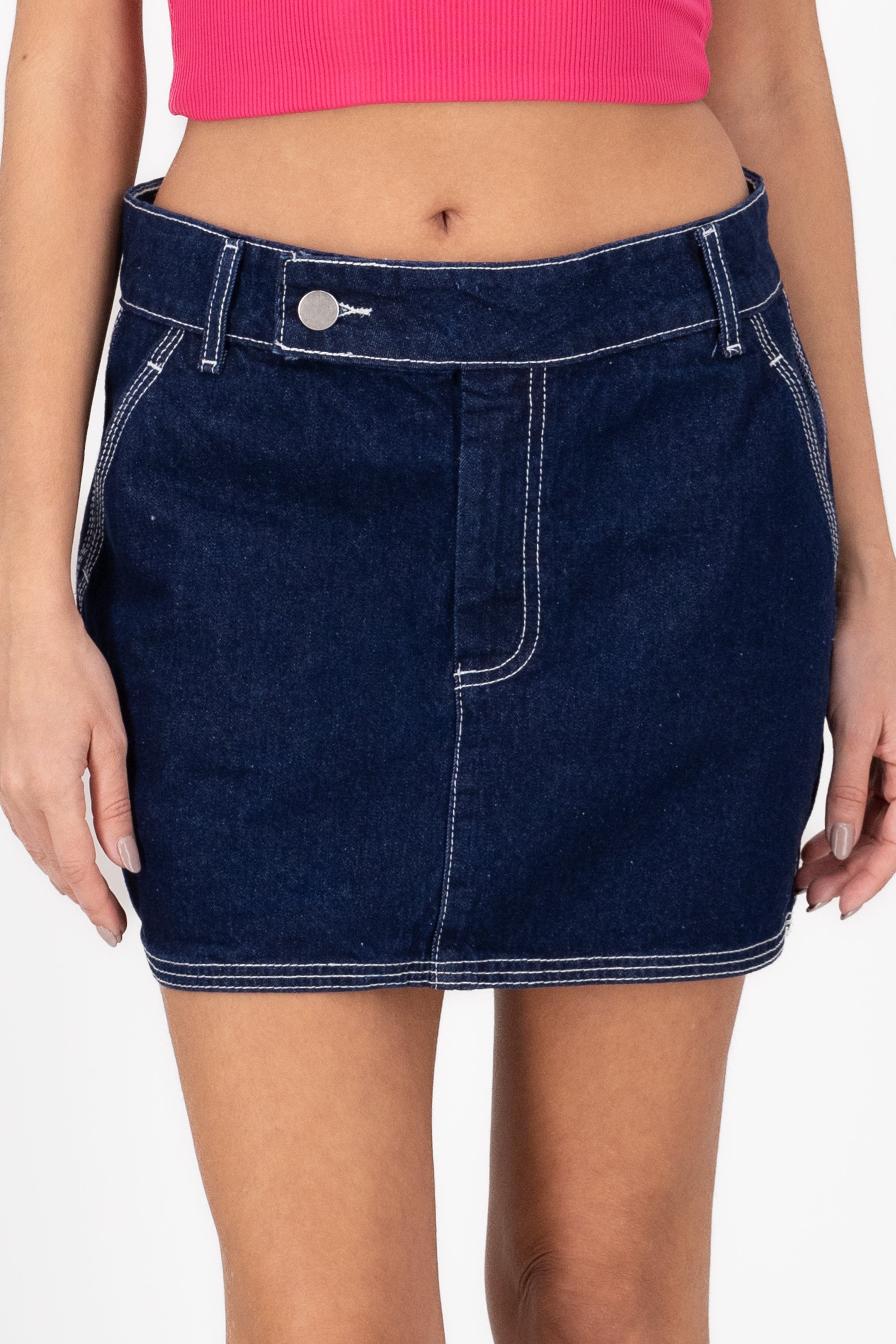 Falda mini de denim con costuras de color. Corte ceñido, cierre frontal y diseño clásico.