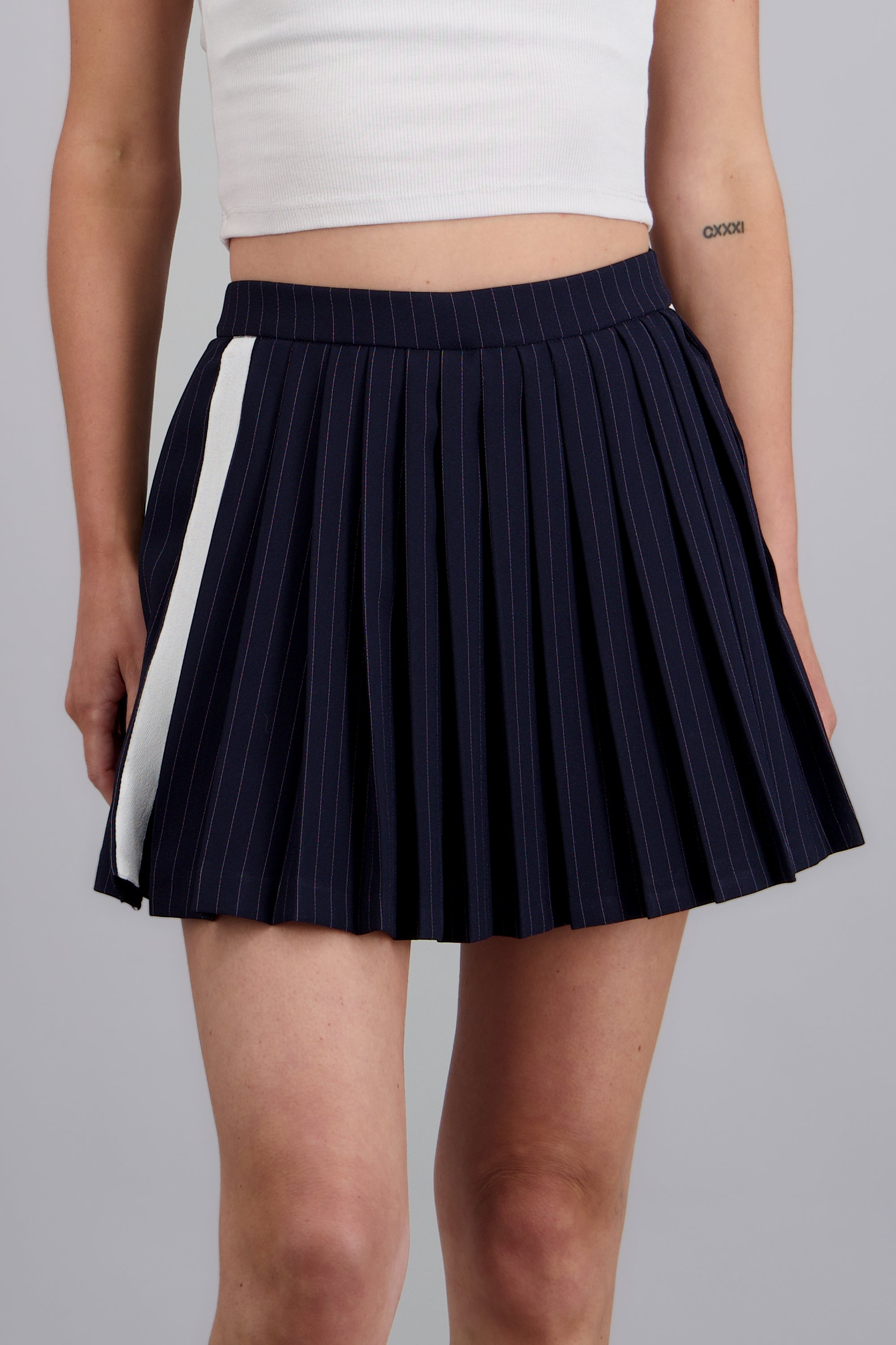 Falda tableada con estampado de rayas en contraste. Corte midi, diseño con pliegues y cintura elástica.